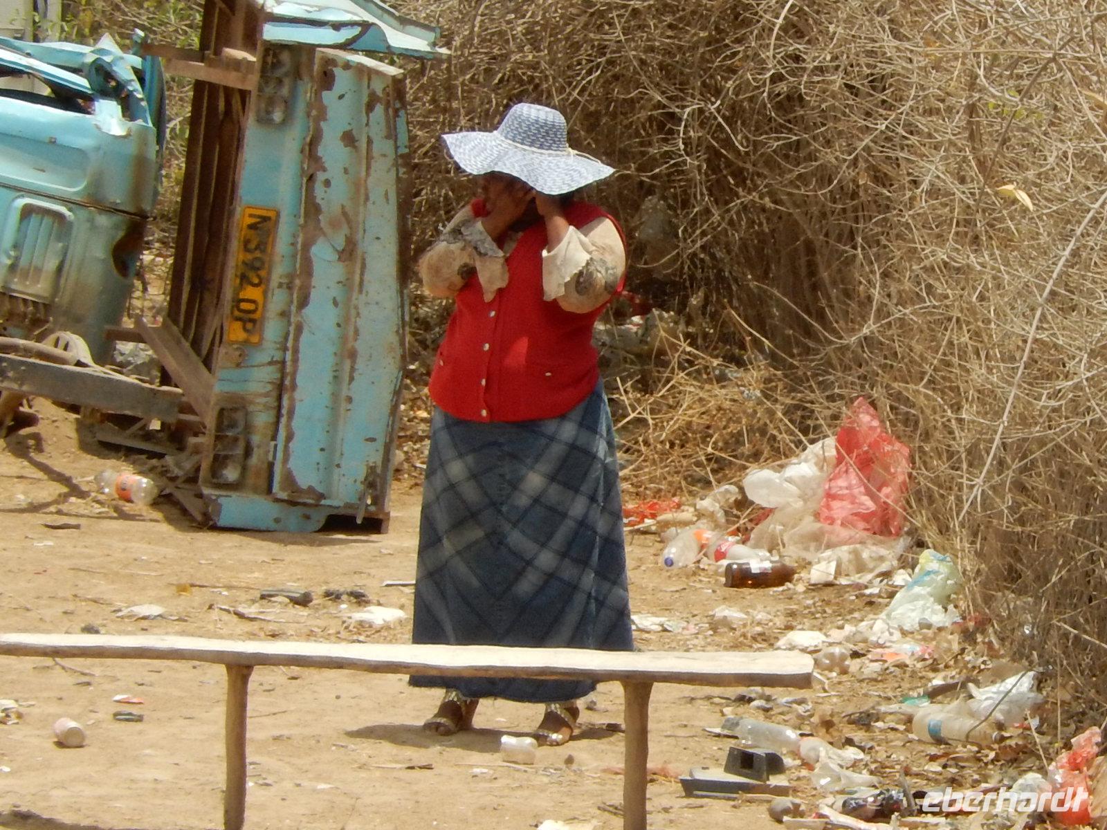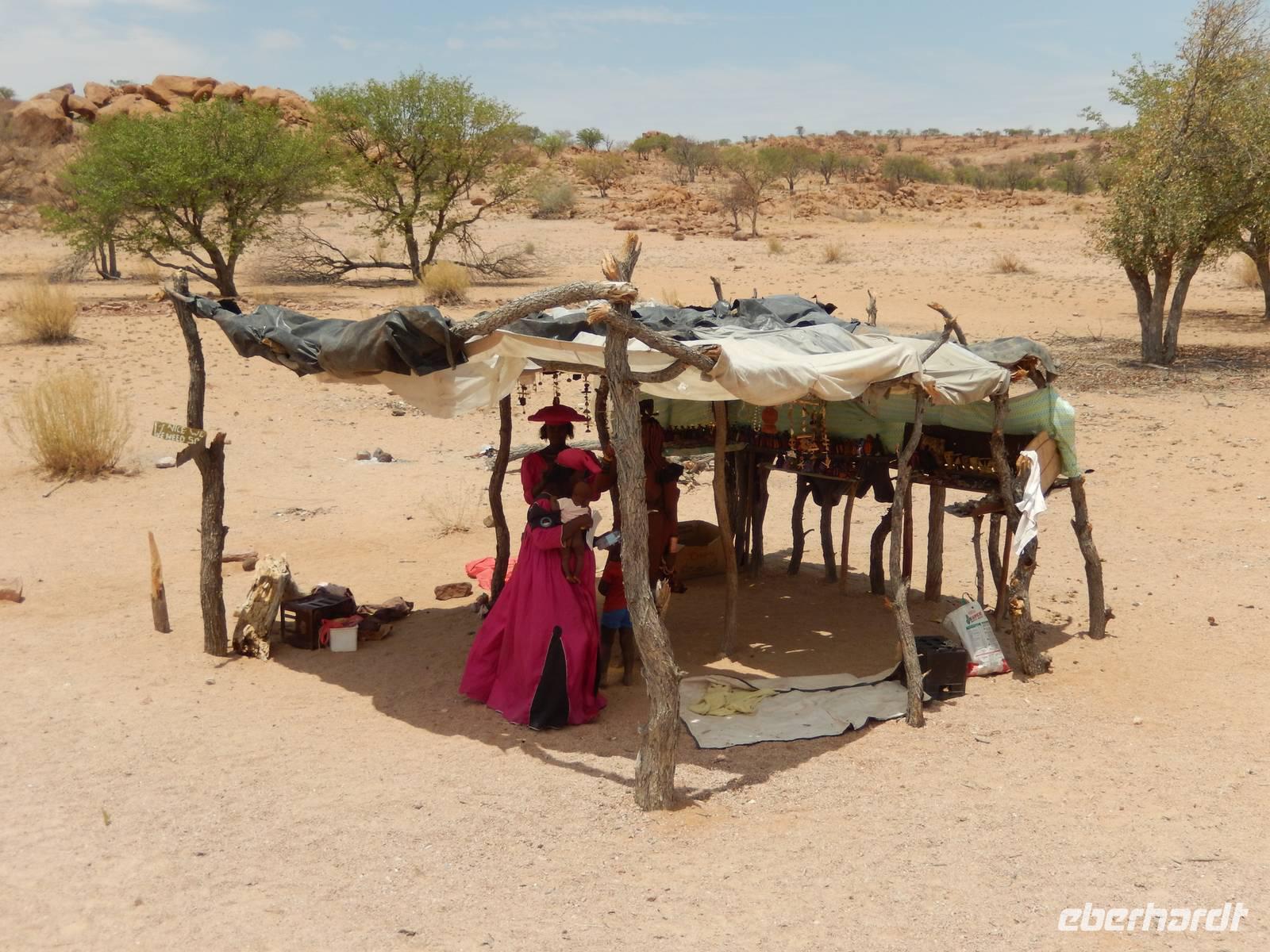 In Uis, der ehemals größten Zinnmine der Welt und heute ein kleiner Verkehrsknotenpunkt, hielten wir für einen Kaffee. Nun kamen wir auch endlich mal mit den Einheimischen in Kontakt, denn wir befanden uns schon im Damaraland. Das Damaraland wird - nach wie vor - überwiegend von den Damara bewohnt, die zusammen mit den San (Buschmänner), zu den ältesten Einwohnern Namibias gezählt werden. Da die Damara auch zur ärmsten Bevölkerungsgruppe in Namibia gehört, beschränkt sich ihre wirtschaftliche Basis auf die Ziegenhaltung. Bei einem kleinen Verkaufsstand an der Straße stoppten wir und wurden von einer Herero- und Himbafrau herzlich begrüßt.