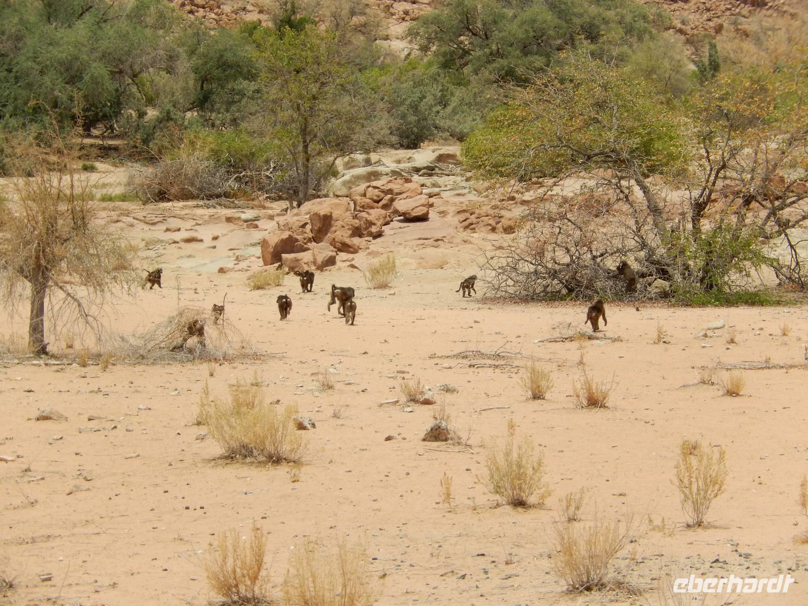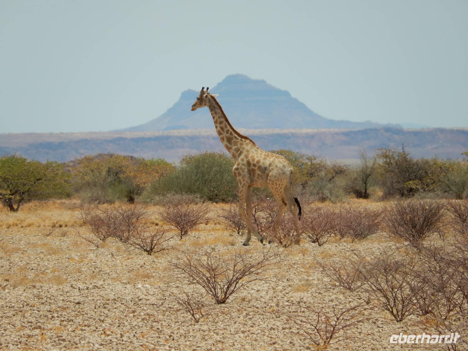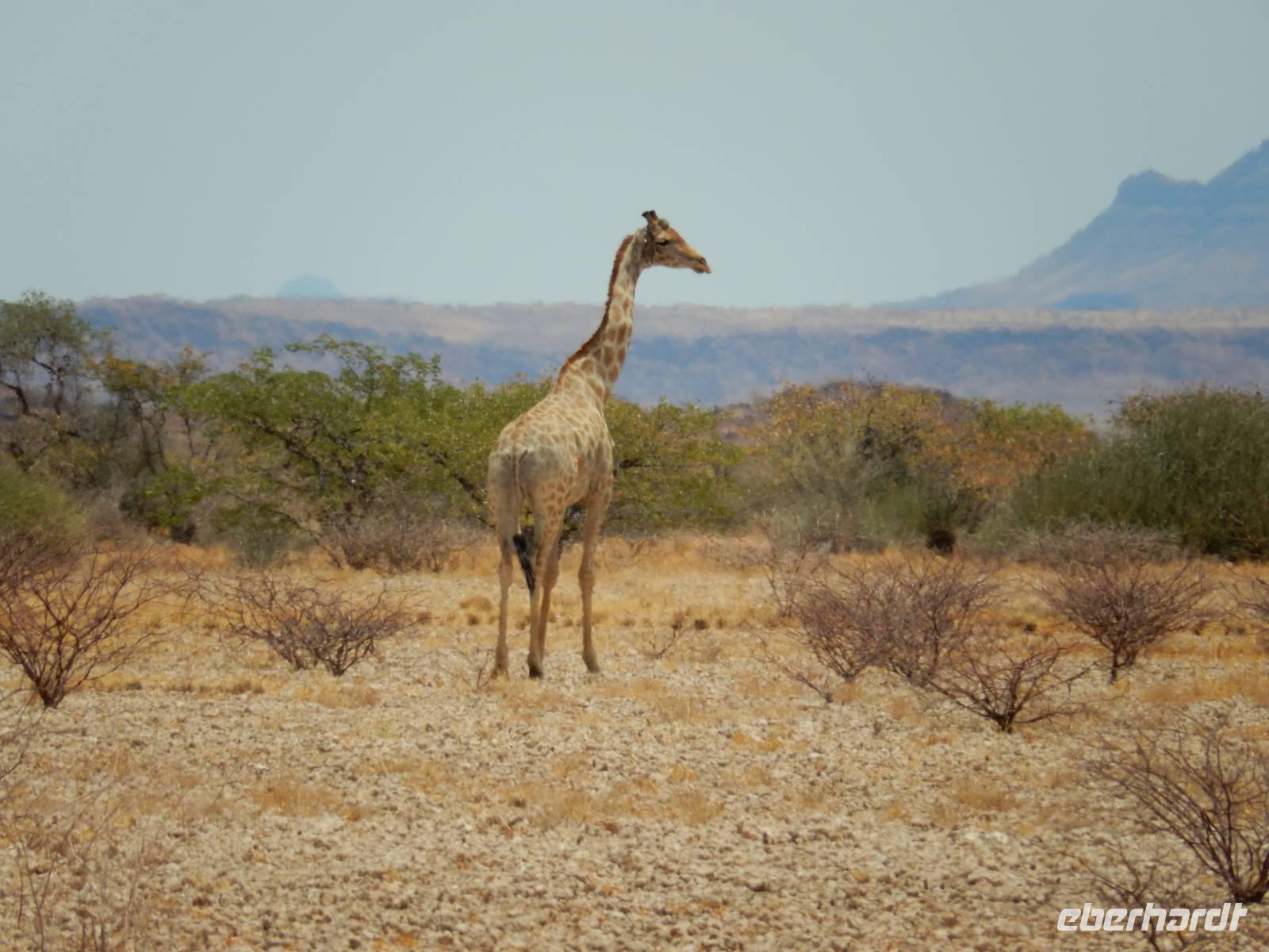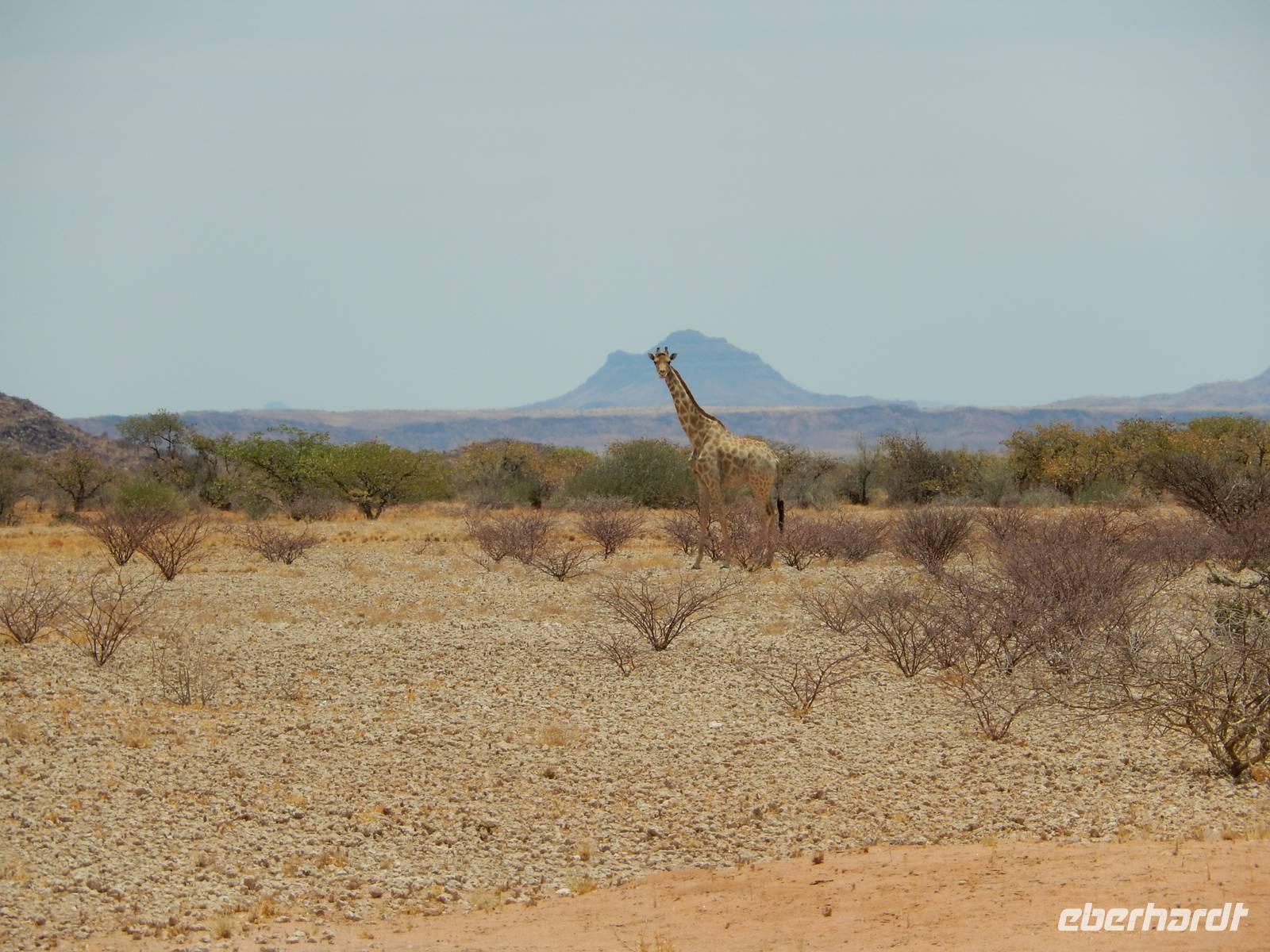 Das Damaraland ist insgesamt sehr spärlich besiedelt, karg, ausgedörrt und wild. Am Wegesrand erblickten wir eine große Gruppe Paviane, die sich aber nicht lang zeigten. Und dann, inmitten der kargen Fläche: eine Giraffe!