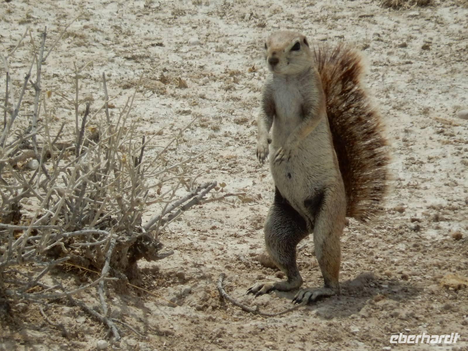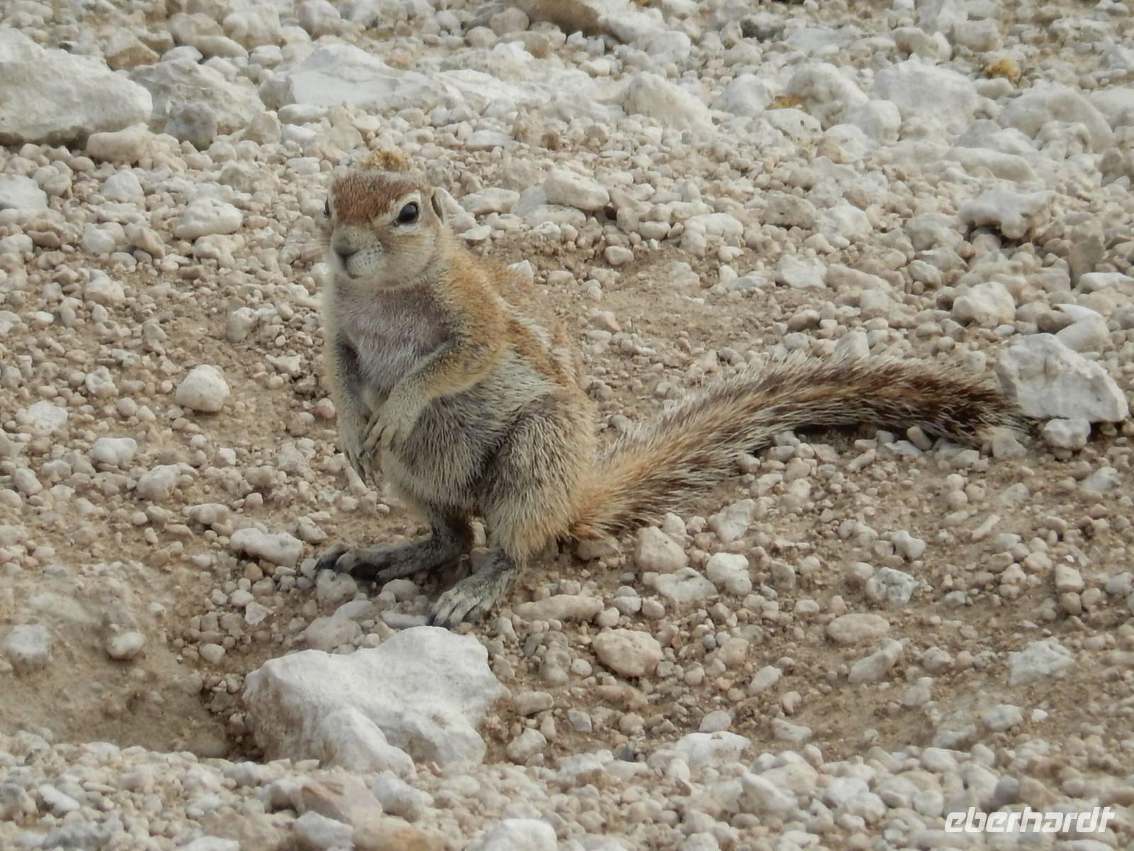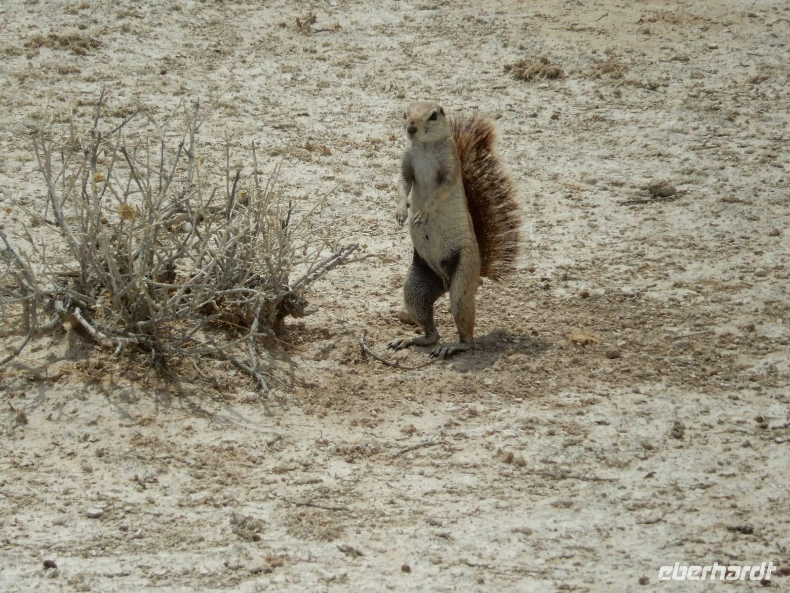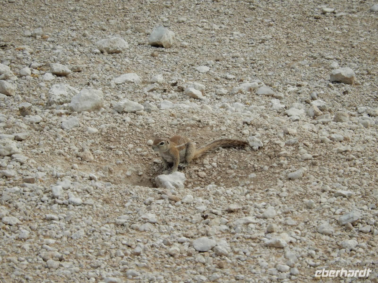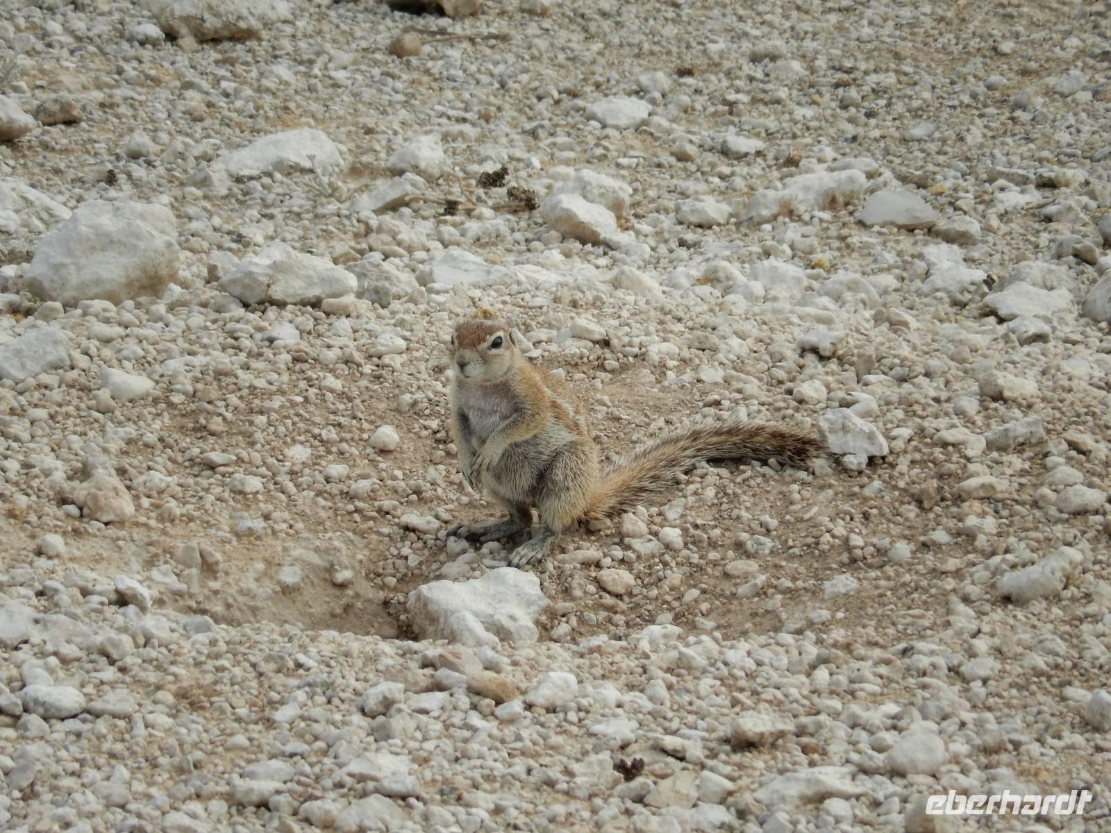 Heute hatten wir mehr Zeit, um die verschiedenen Wasserlöcher anzufahren. Und das Glück war wieder auf unserer Seite! Gleich am Eingang erblickten wir eine trächtige Löwin, die auf dem Weg zum Wasserloch Ombika war. Natürlich begleiteten uns auch wieder Gnuherden, die kleinen Springböcke, Steppenzebras und unzählige Giraffen. Ein tolles Bild, die gemächlichen Riesen der Steppe zu sehen. Wir statteten den Wasserlöchern Leeubron, Okondeka und Wolfsnes noch einen Besuch ab und machten uns dann auf den Weg zum Wasserloch Gemsbokvlakte. Auf dem Weg dorthin machten wir noch Bekanntschaft mit den niedlichen kleinen Erdhörnchen.