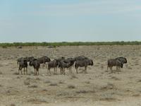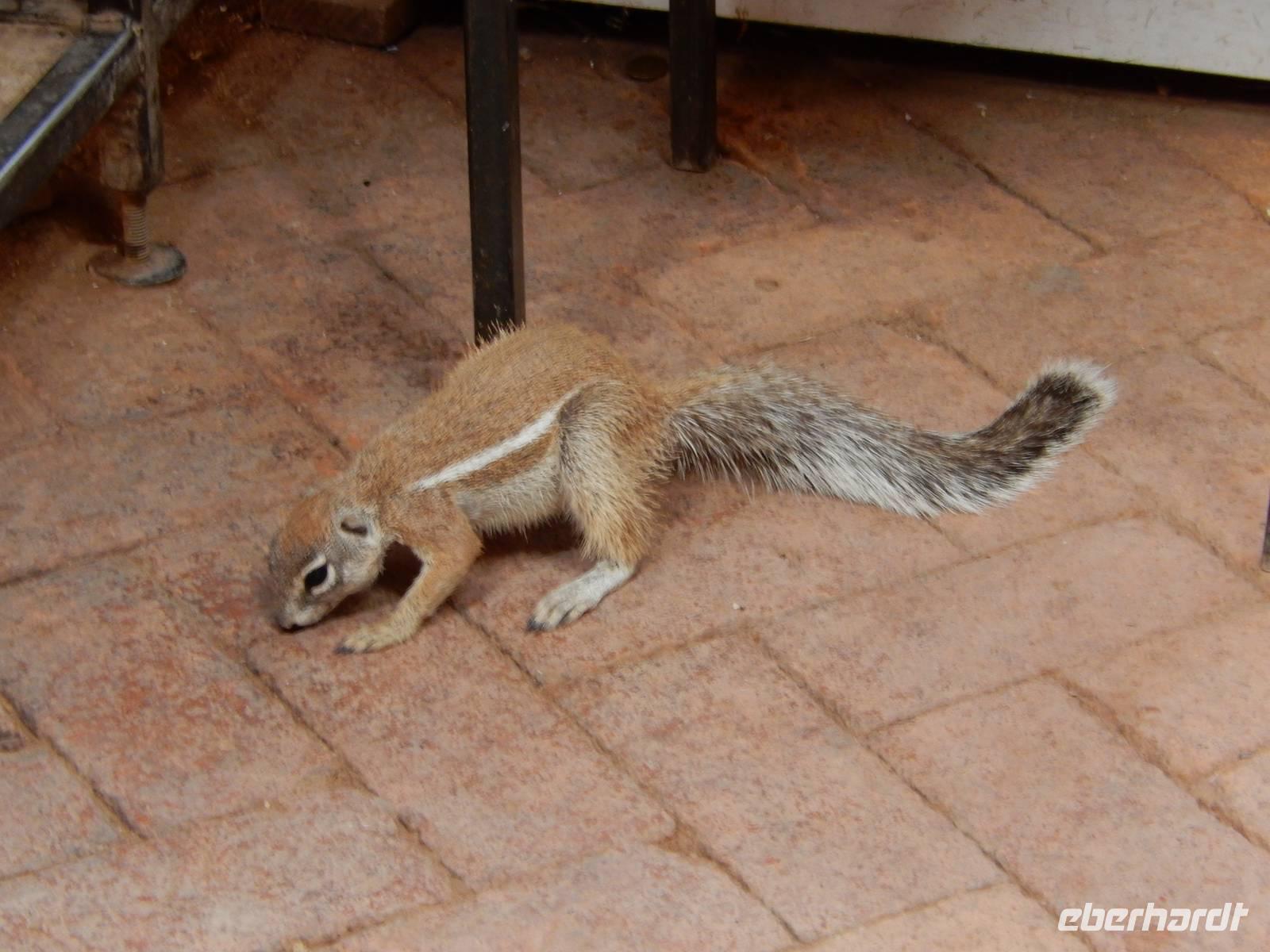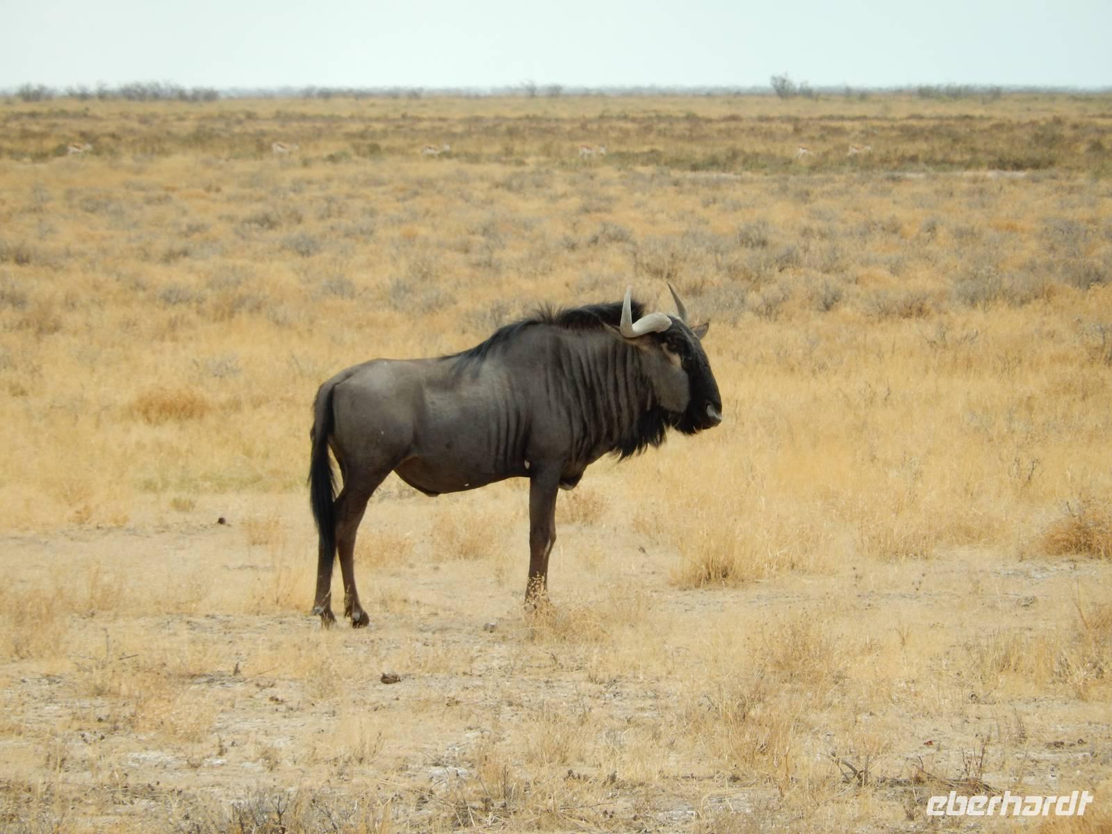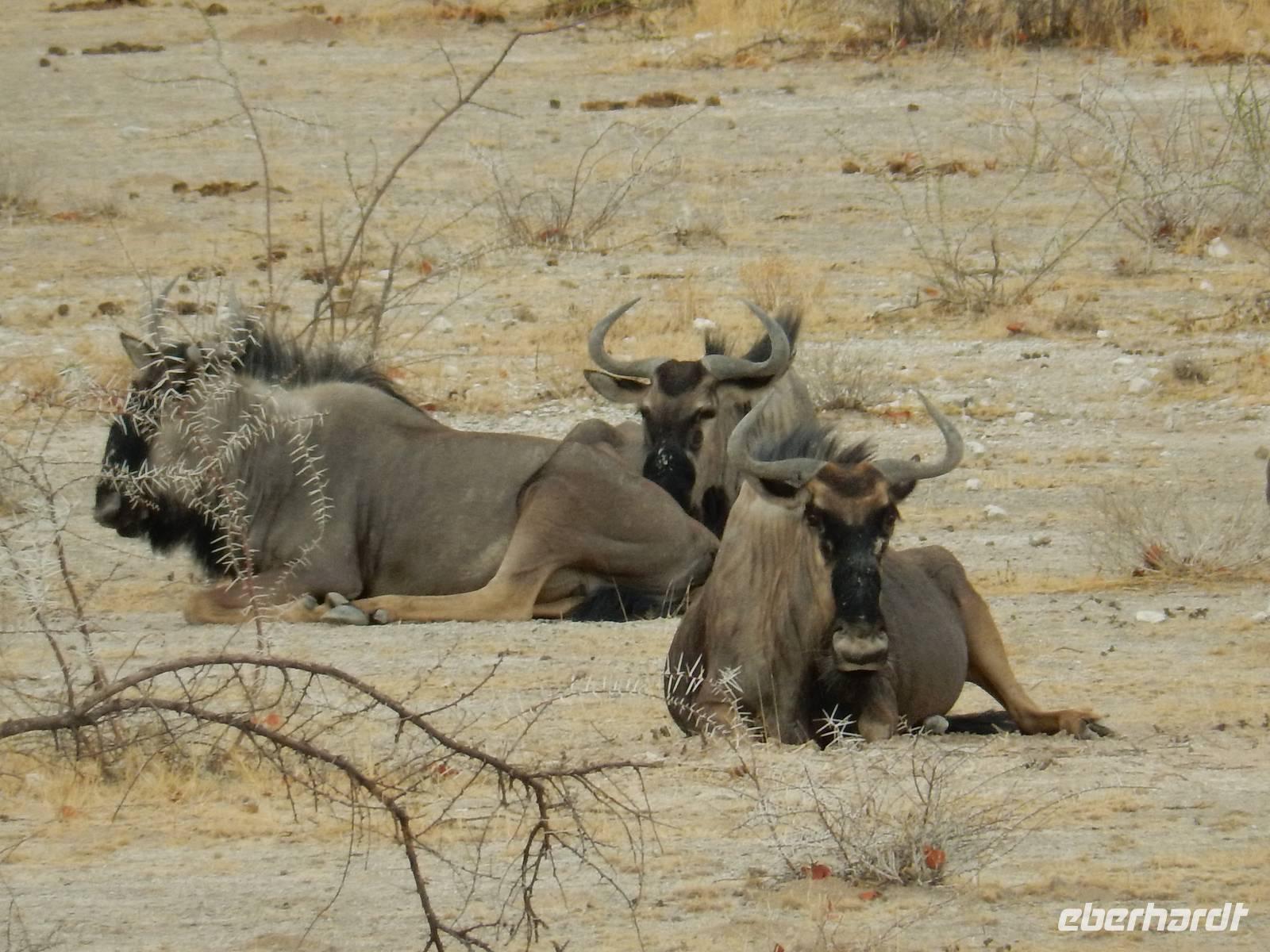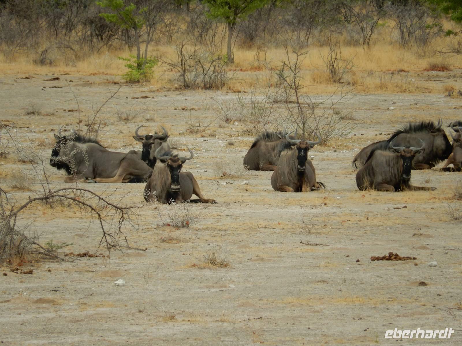 Heute hatten wir mehr Zeit, um die verschiedenen Wasserlöcher anzufahren. Und das Glück war wieder auf unserer Seite! Gleich am Eingang erblickten wir eine trächtige Löwin, die auf dem Weg zum Wasserloch Ombika war. Natürlich begleiteten uns auch wieder Gnuherden, die kleinen Springböcke, Steppenzebras und unzählige Giraffen. Ein tolles Bild, die gemächlichen Riesen der Steppe zu sehen. Wir statteten den Wasserlöchern Leeubron, Okondeka und Wolfsnes noch einen Besuch ab und machten uns dann auf den Weg zum Wasserloch Gemsbokvlakte. Auf dem Weg dorthin machten wir noch Bekanntschaft mit den niedlichen kleinen Erdhörnchen.