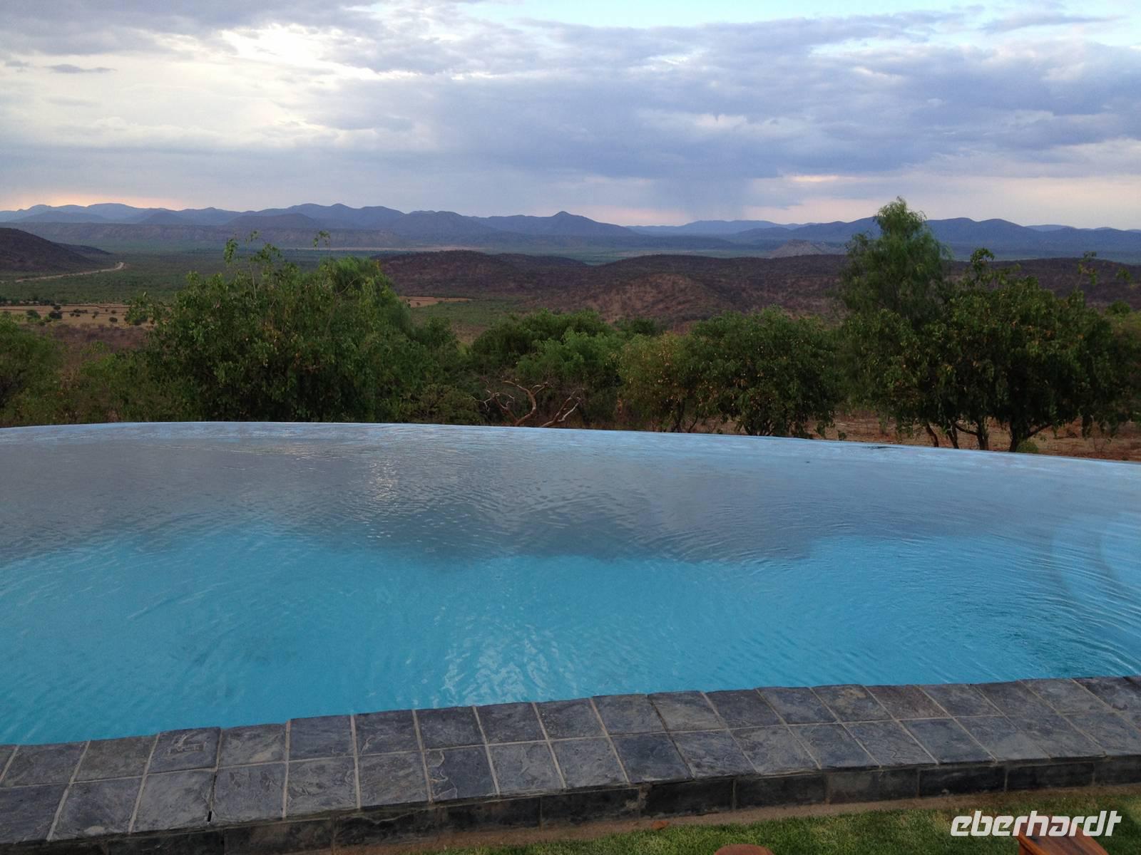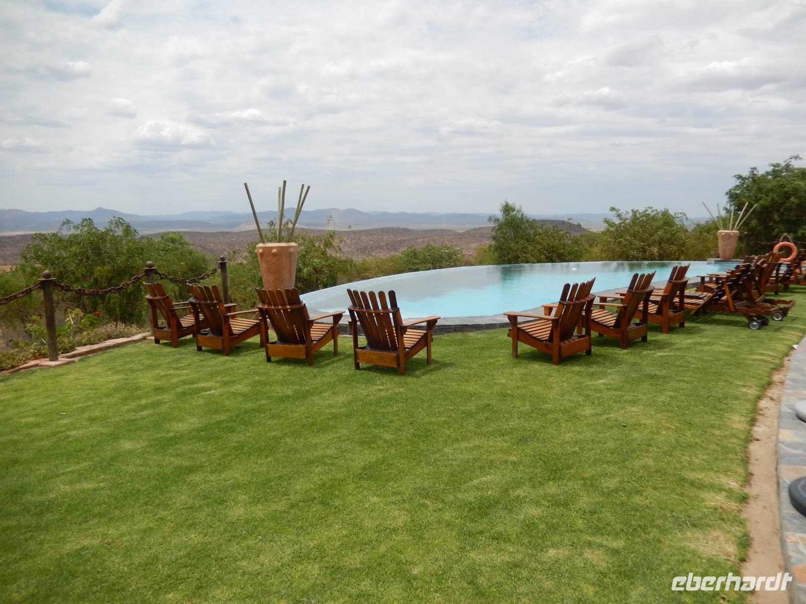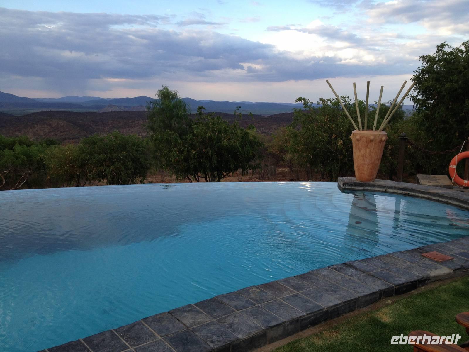 Ab jetzt fuhren wir auf einer gut ausgebauten Asphaltstraße immer weiter in Richtung Norden, kamen schon am westlichen Ende des Etosha-Nationalparks entlang und erreichten Opuwo im Kaokoveld. Die Stadt Opuwo hat ca. 5.000 Einwohner. Opuwo bedeutet in der Stammessprache der Himba so viel wie "das Ende", weil wohl die Infrastruktur ab hier etwas zu wünschen übrig lässt. Die Ortschaft ist geprägt vom Aufeinanderprallen der Tradition und Neuzeit, die hier sehr unvermittelt aufeinanderprallen - mit allen Problemen eines derartigen Zeitsprungs: Alkoholmissbrauch, Kriminalität, Verwahrlosung, Prostitution. Doch wir haben das nur teilweise beim Durchfahren mitbekommen. Unsere traumhafte Lodge befand sich außerhalb der Stadt auf einem Hügel, von dem wir einen traumhaften Blick auf die Region hatten. Im schönen Überlaufpool genossen wir unseren Aufenthalt und hatten Zeit, das bisher erlebte erst einmal sacken zu lassen.