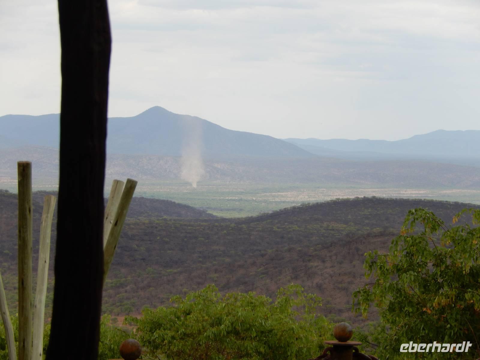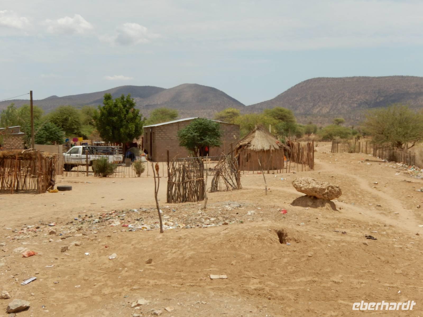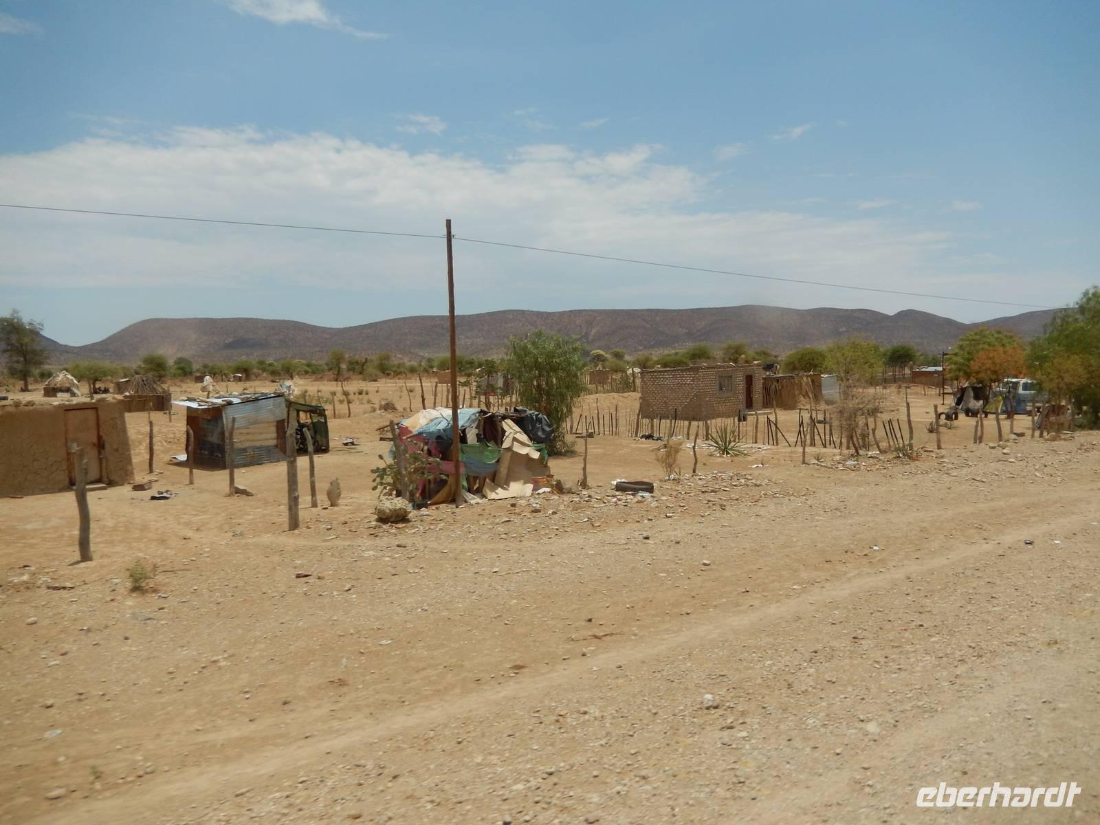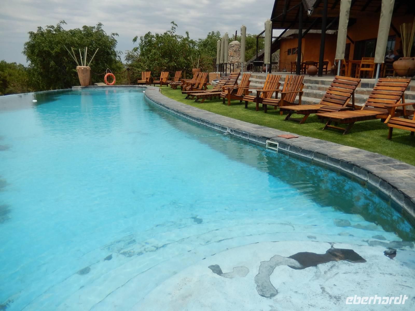 Ab jetzt fuhren wir auf einer gut ausgebauten Asphaltstraße immer weiter in Richtung Norden, kamen schon am westlichen Ende des Etosha-Nationalparks entlang und erreichten Opuwo im Kaokoveld. Die Stadt Opuwo hat ca. 5.000 Einwohner. Opuwo bedeutet in der Stammessprache der Himba so viel wie "das Ende", weil wohl die Infrastruktur ab hier etwas zu wünschen übrig lässt. Die Ortschaft ist geprägt vom Aufeinanderprallen der Tradition und Neuzeit, die hier sehr unvermittelt aufeinanderprallen - mit allen Problemen eines derartigen Zeitsprungs: Alkoholmissbrauch, Kriminalität, Verwahrlosung, Prostitution. Doch wir haben das nur teilweise beim Durchfahren mitbekommen. Unsere traumhafte Lodge befand sich außerhalb der Stadt auf einem Hügel, von dem wir einen traumhaften Blick auf die Region hatten. Im schönen Überlaufpool genossen wir unseren Aufenthalt und hatten Zeit, das bisher erlebte erst einmal sacken zu lassen.