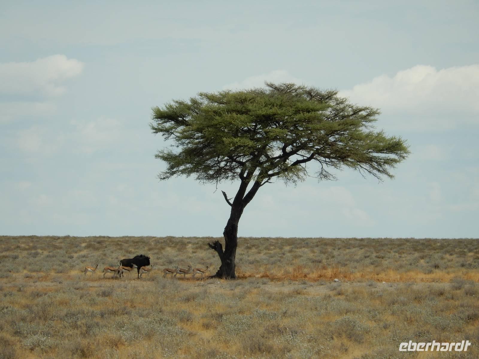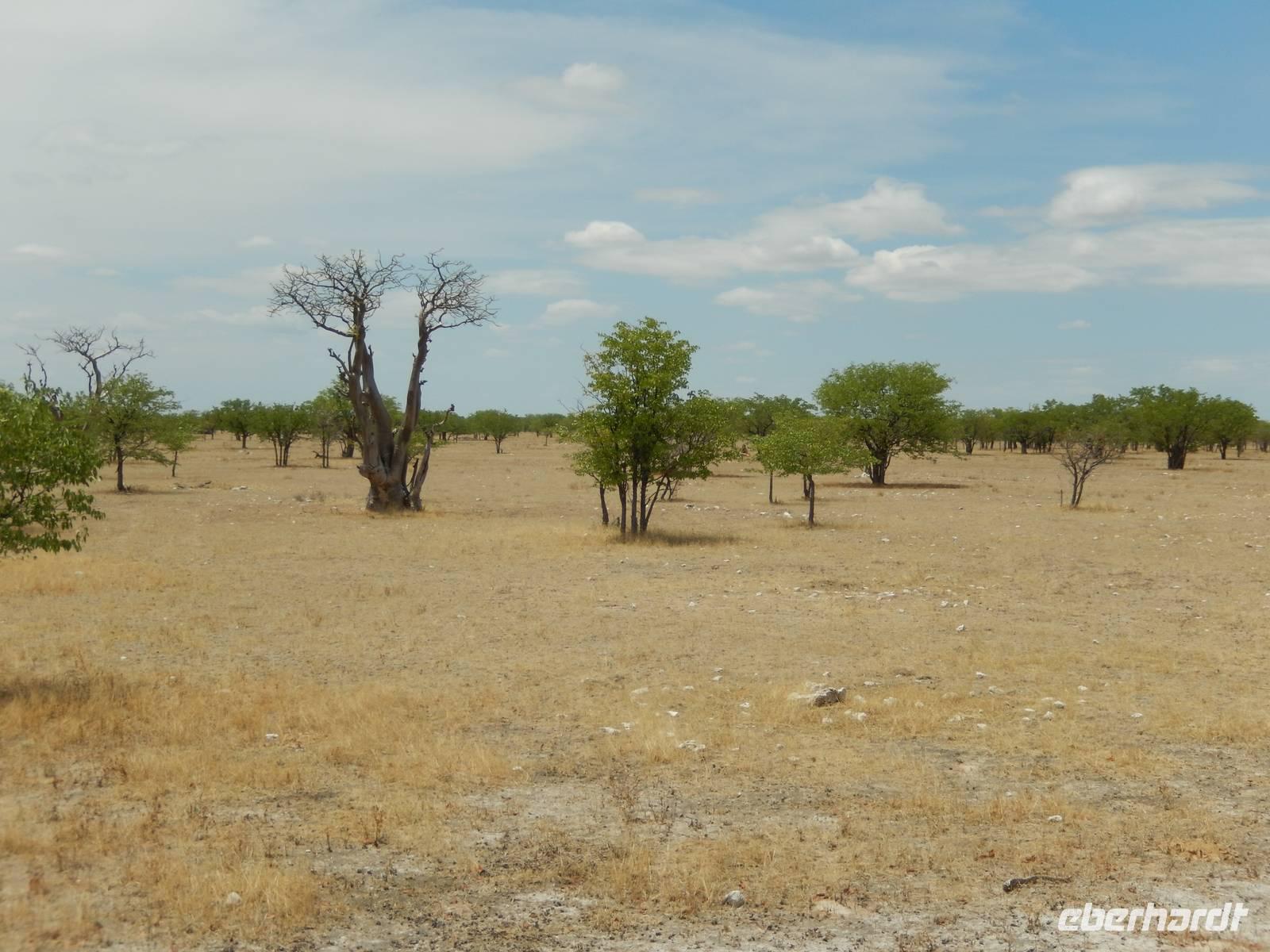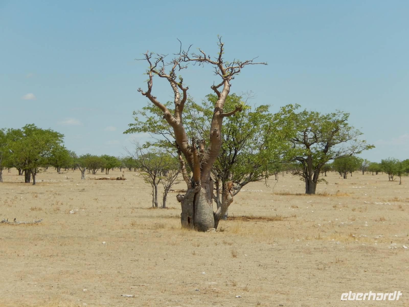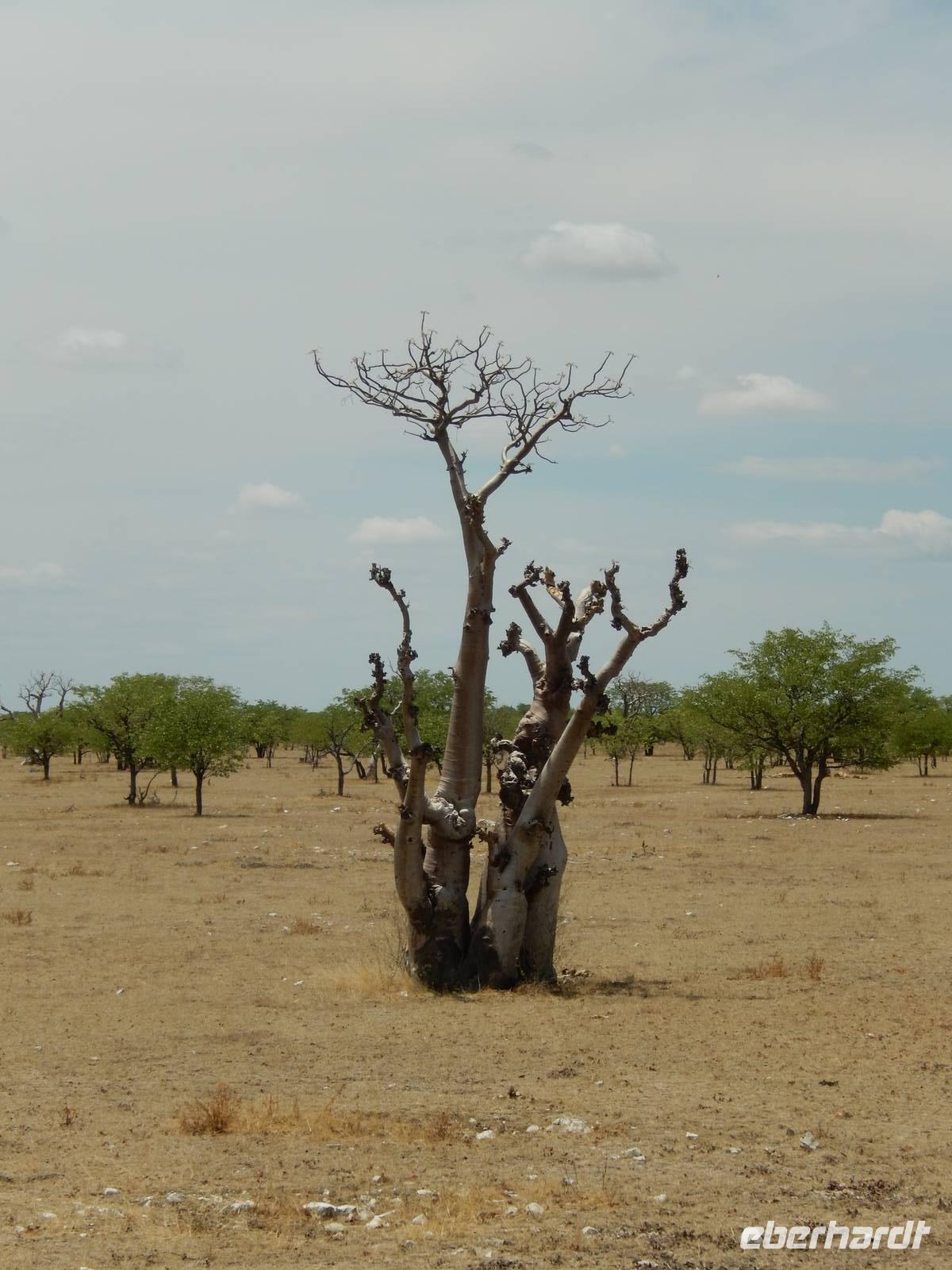 Wir erkundeten heute den westlichen Teil des Parks und kamen durch die Trockenbuschsavanne zum Märchenwald. Hier wachsen die nur in Namibia vorkommenden Moringabäume. Der Name rührt daher, dass die Bäume normalerweise ganz gerade wachsen, hier jedoch völlig verwachsene Stämme aufweisen. Dies kommt daher, dass die Jungpflanzen von Elefanten und Giraffen immer wieder angefressen wurden und so nicht natürlich wachsen konnten.