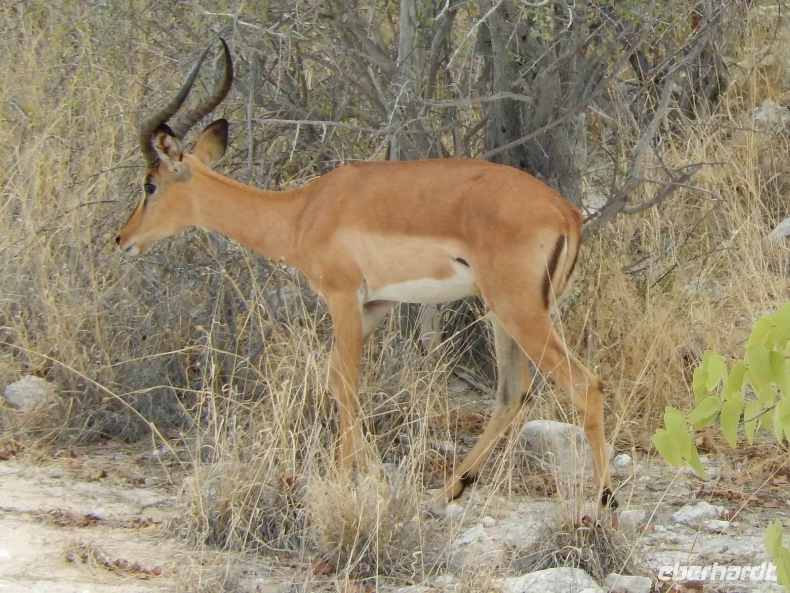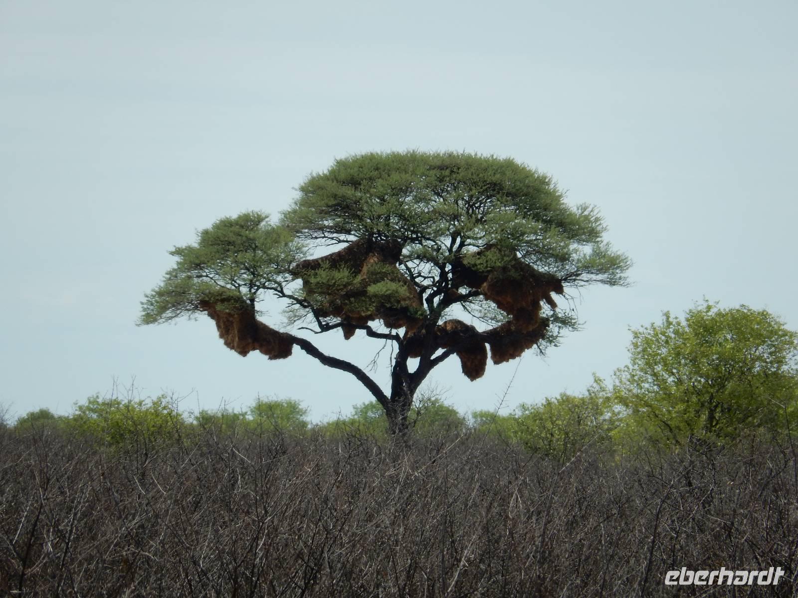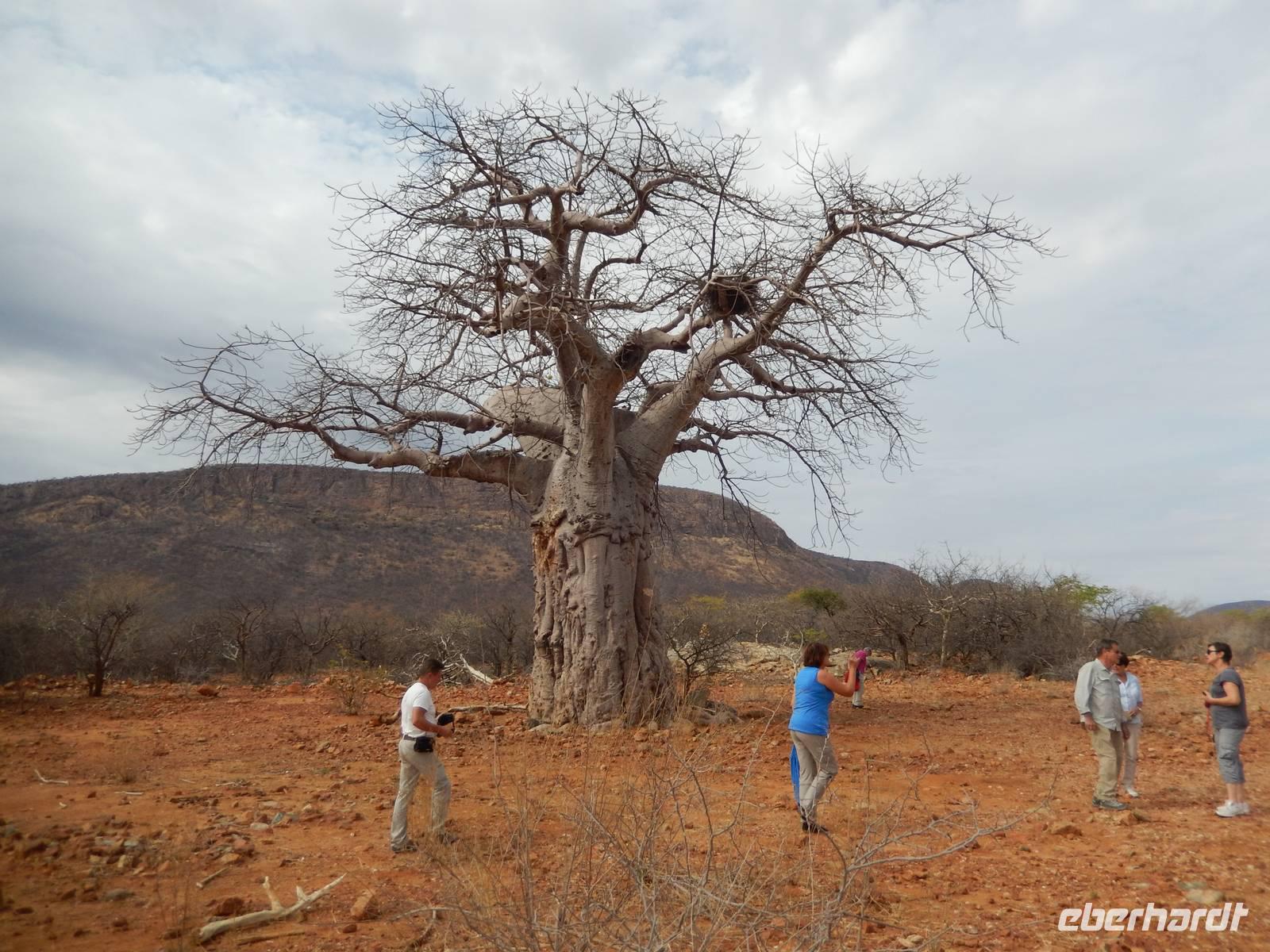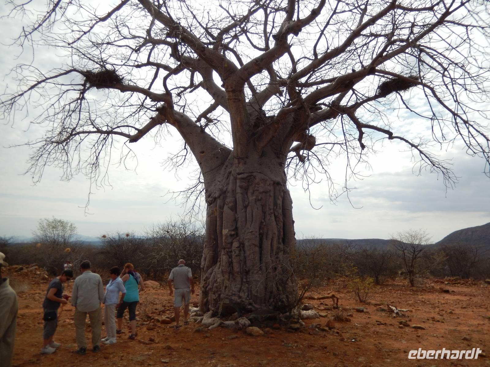 Wir erkundeten heute den westlichen Teil des Parks und kamen durch die Trockenbuschsavanne zum Märchenwald. Hier wachsen die nur in Namibia vorkommenden Moringabäume. Der Name rührt daher, dass die Bäume normalerweise ganz gerade wachsen, hier jedoch völlig verwachsene Stämme aufweisen. Dies kommt daher, dass die Jungpflanzen von Elefanten und Giraffen immer wieder angefressen wurden und so nicht natürlich wachsen konnten.
