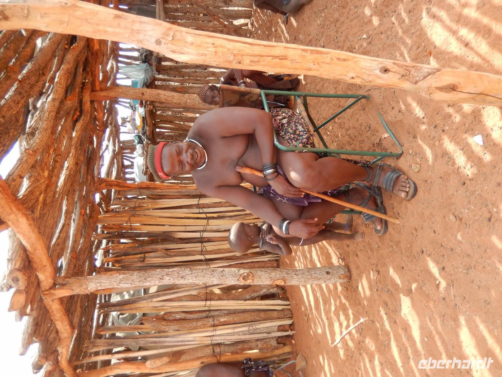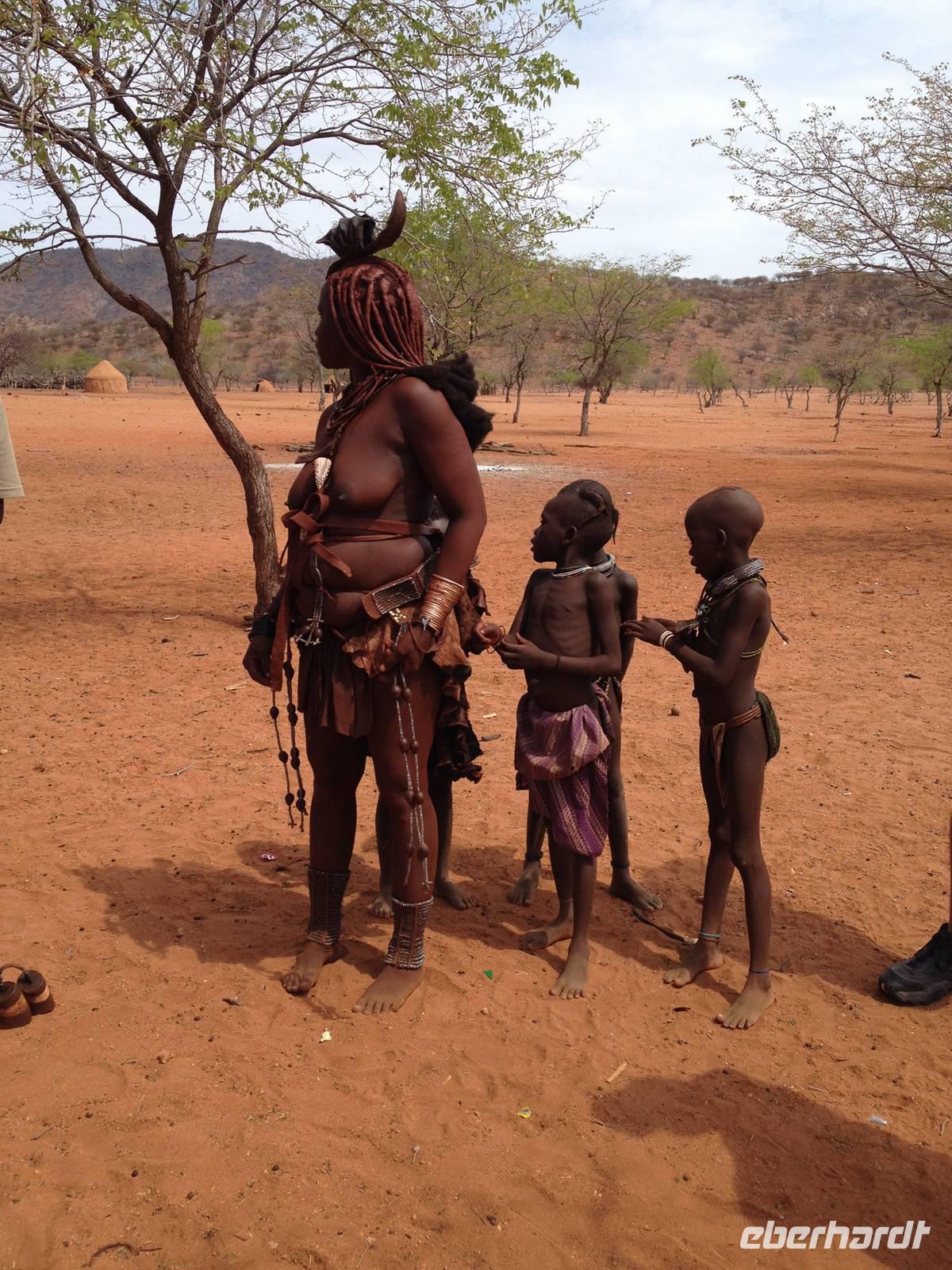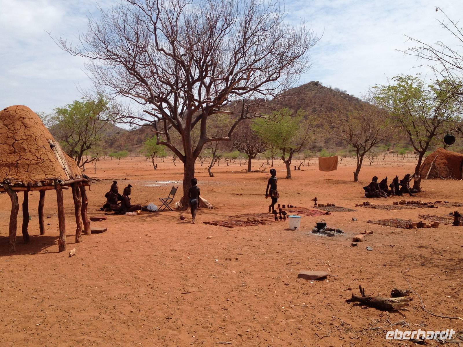 Während der Fahrt sahen wir schon einige Dörfer der rund 15.000 Ovahimba, die hier noch leben. Nach Ankunft bei einem Kral fragte Guide Hendrik beim Dorfältesten nach, ob wir als Besucher willkommen sind. Er gab uns nur noch ein "Moro Moro" (Hallo) mit auf den Weg und dann konnten wir uns der Tradition und der Lebensweise der Ovahimbas widmen. Es waren sehr viele Frauen und Kinder anwesend, Männer waren kaum zu sehen, sie verbringen die meiste Zeit mit den Rinderherden, ihrem wichtigsten Besitz. Wir durften alles fotografieren, was uns anfangs noch etwas ungewohnt erschien, denn die meisten waren ja halbnackt. Hendrik wurde mit vielen Fragen gelöchert, wir wollten so viel wie nur möglich über die Menschen erfahren. Wir erfuhren mehr über das Rauchbad der Ovahimbafrauen, die sich tatsächlich nie mit Wasser waschen, sondern mit einer rötlichen Sonnenschutz-Creme, die sie aus einer Mischung aus Ockerstein und Tierfett gewinnen. Hierdurch entsteht die rote Färbung der Ovahimbafrauen. Wir lernten weiterhin viel über das kulturell enorm wichtige heilige Feuer und den Ahnenglauben der Ovahimba, über traditionelle Medizin, Schmuckherstellung, Kostümierung und die komplexen Bedeutungen der verschiedenen Haartrachten.