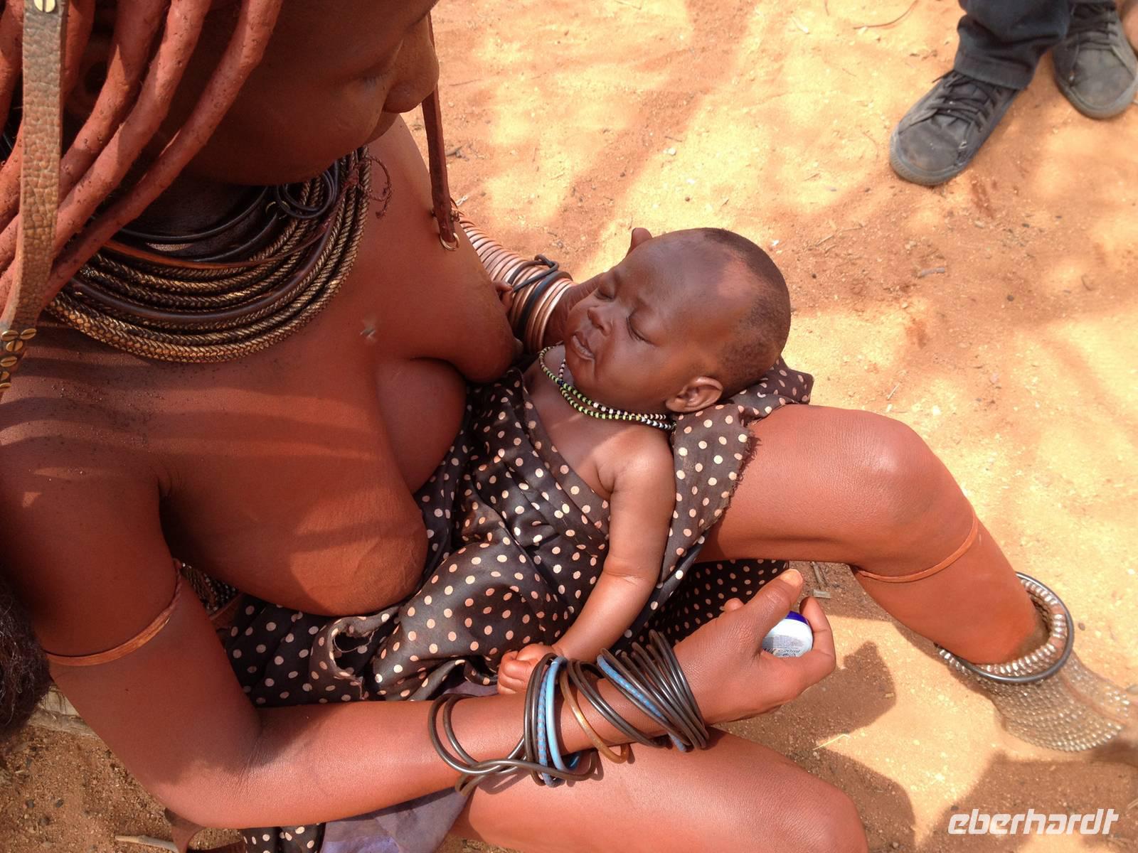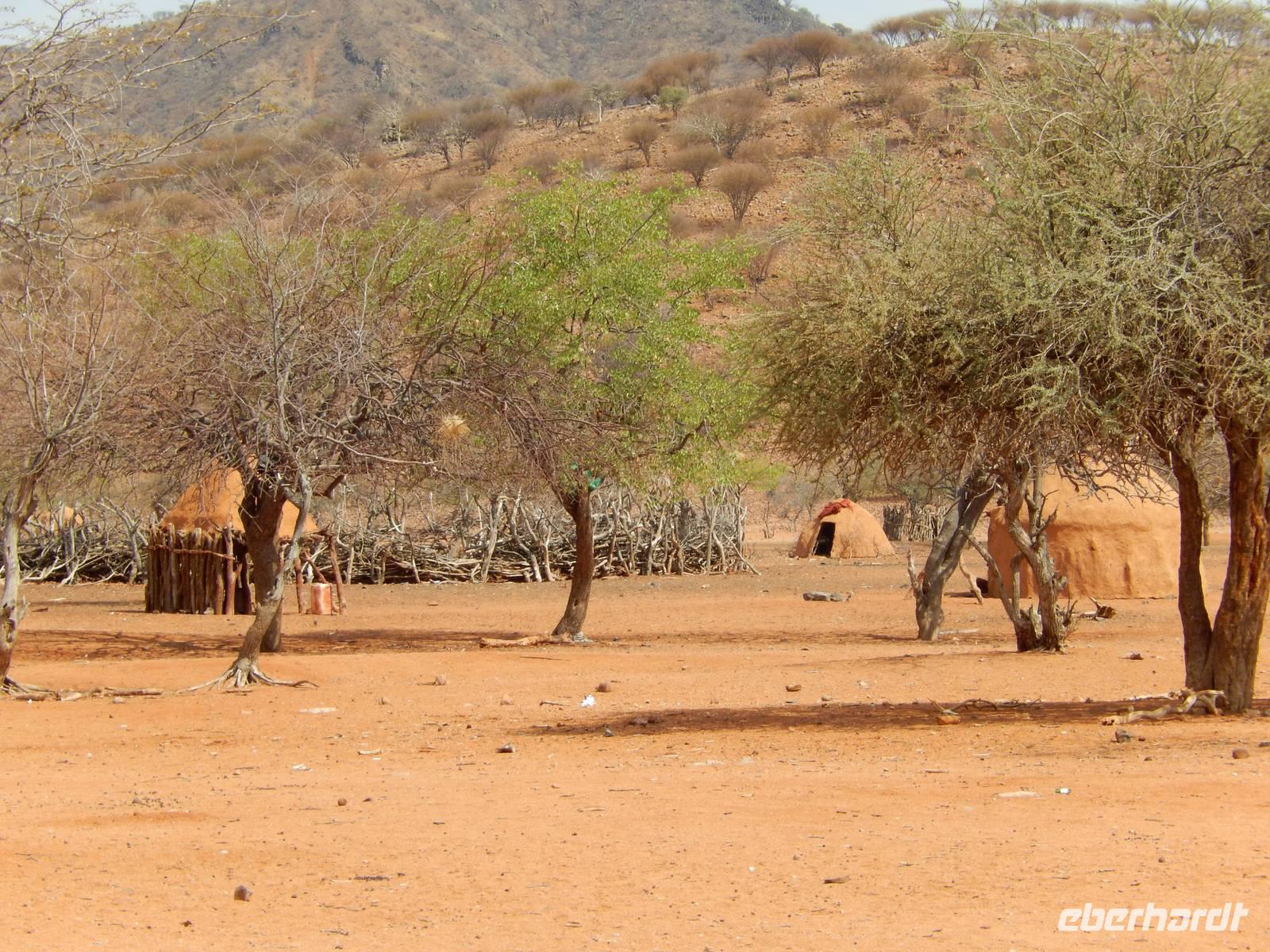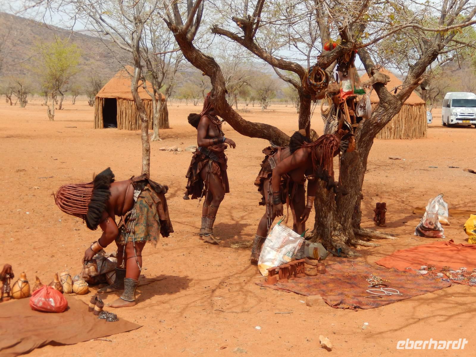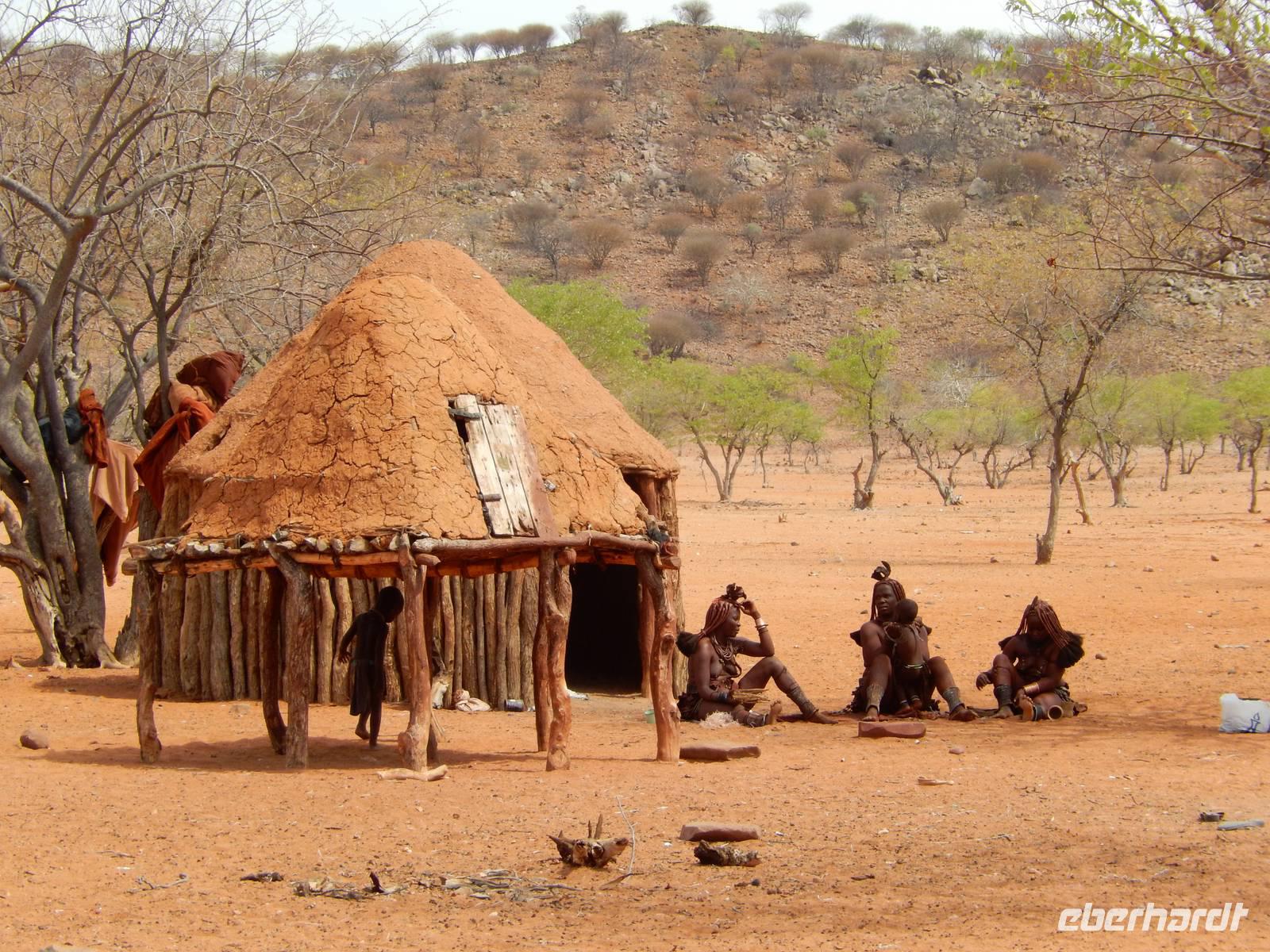 Während der Fahrt sahen wir schon einige Dörfer der rund 15.000 Ovahimba, die hier noch leben. Nach Ankunft bei einem Kral fragte Guide Hendrik beim Dorfältesten nach, ob wir als Besucher willkommen sind. Er gab uns nur noch ein "Moro Moro" (Hallo) mit auf den Weg und dann konnten wir uns der Tradition und der Lebensweise der Ovahimbas widmen. Es waren sehr viele Frauen und Kinder anwesend, Männer waren kaum zu sehen, sie verbringen die meiste Zeit mit den Rinderherden, ihrem wichtigsten Besitz. Wir durften alles fotografieren, was uns anfangs noch etwas ungewohnt erschien, denn die meisten waren ja halbnackt. Hendrik wurde mit vielen Fragen gelöchert, wir wollten so viel wie nur möglich über die Menschen erfahren. Wir erfuhren mehr über das Rauchbad der Ovahimbafrauen, die sich tatsächlich nie mit Wasser waschen, sondern mit einer rötlichen Sonnenschutz-Creme, die sie aus einer Mischung aus Ockerstein und Tierfett gewinnen. Hierdurch entsteht die rote Färbung der Ovahimbafrauen. Wir lernten weiterhin viel über das kulturell enorm wichtige heilige Feuer und den Ahnenglauben der Ovahimba, über traditionelle Medizin, Schmuckherstellung, Kostümierung und die komplexen Bedeutungen der verschiedenen Haartrachten.