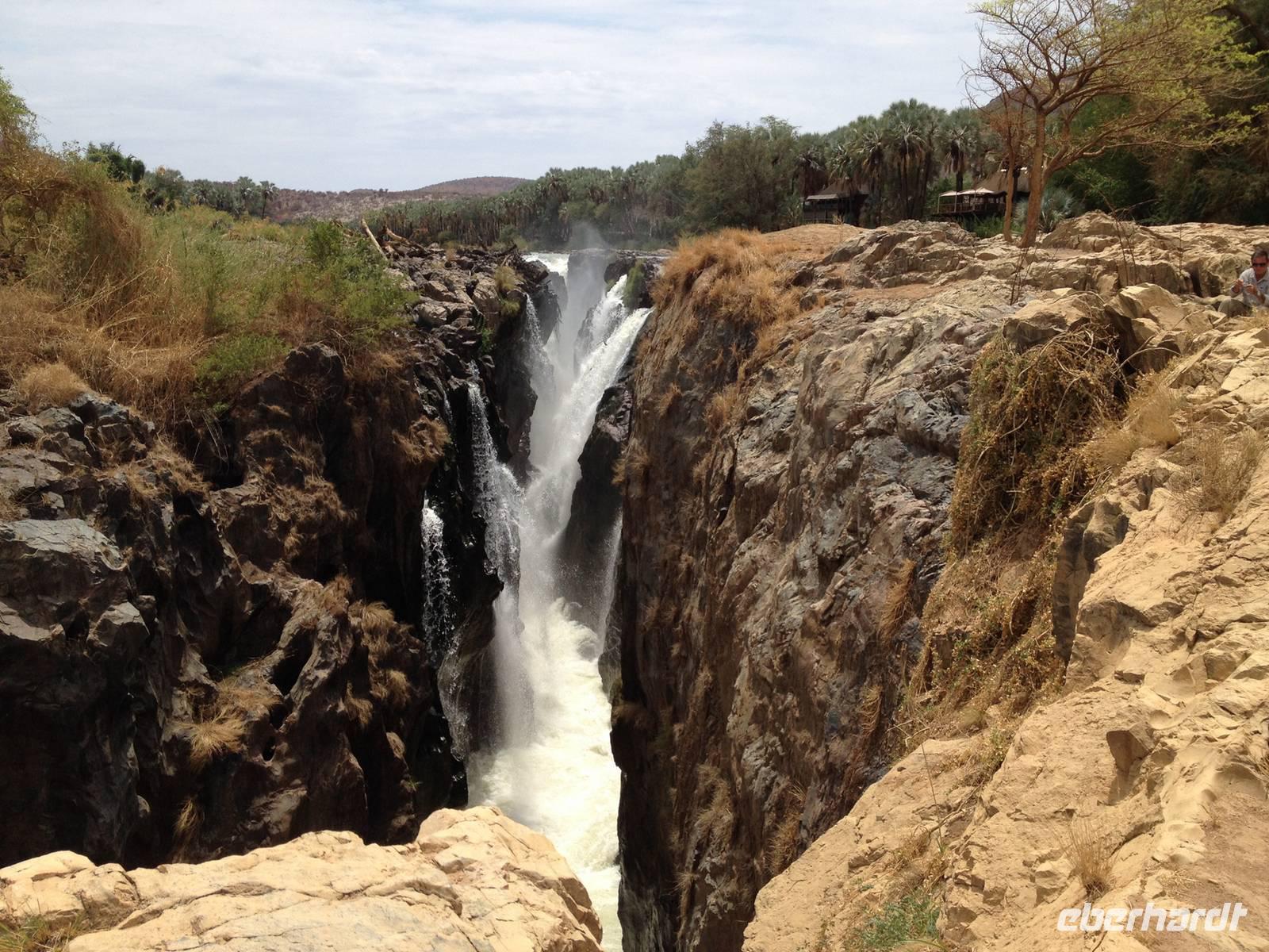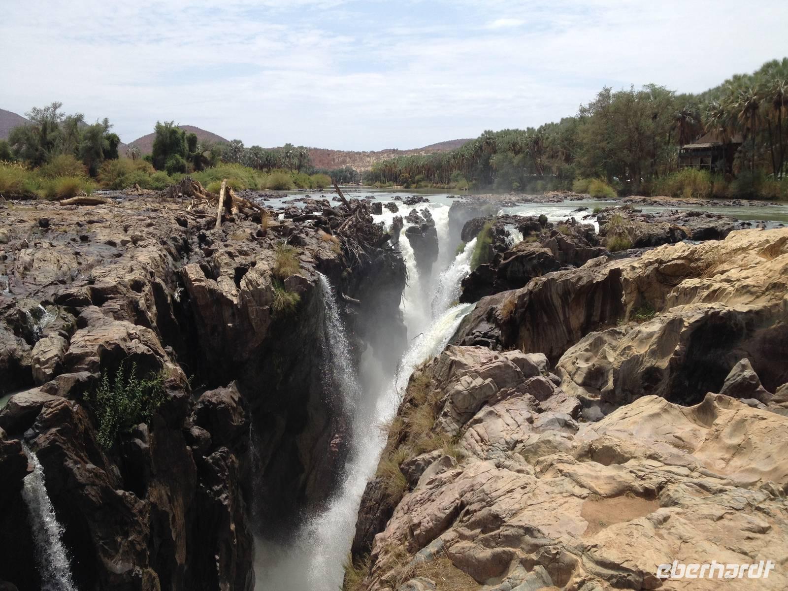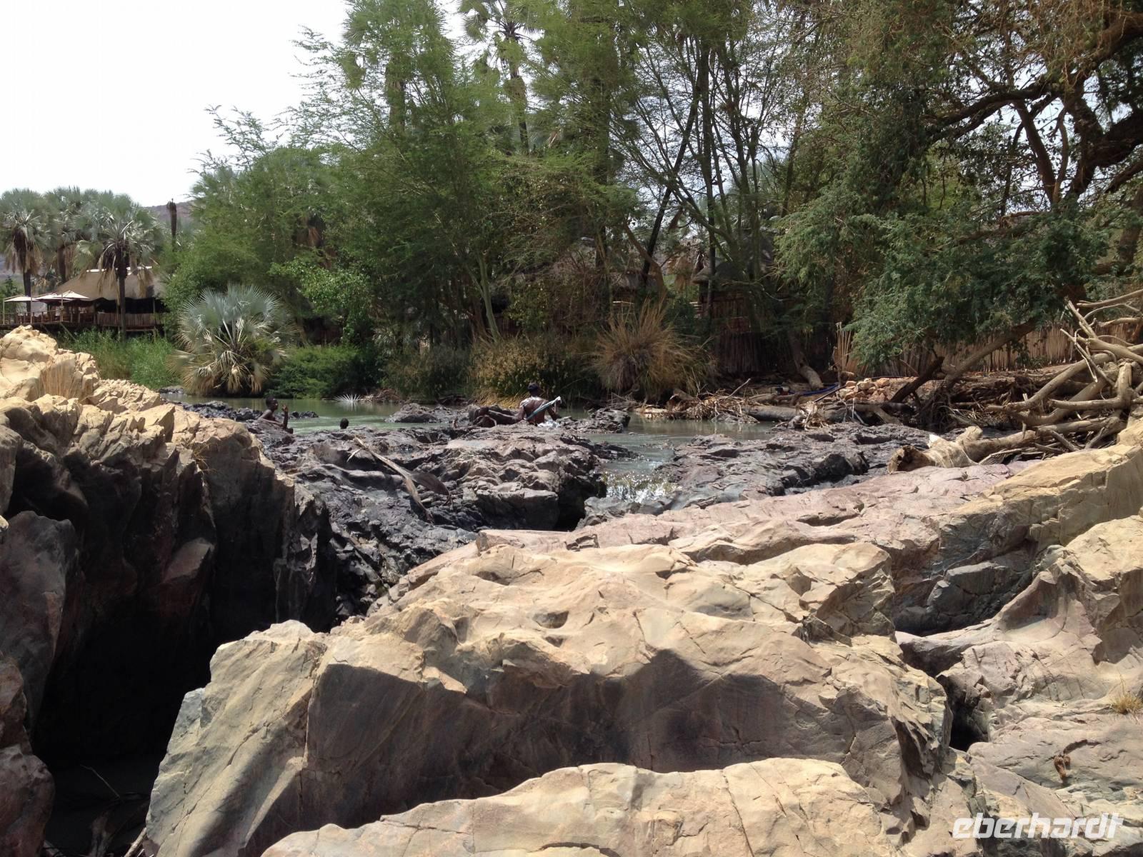 Unser Weg führte uns dann weiter bis zur Grenze nach Angola, an den Kunene-Fluss, der die natürliche Grenze bildet. An den Wasserfällen, die etwa 40 Meter hoch sind, machten wir unsere Mittagsrast im angenehmen Schatten der Palmen.
