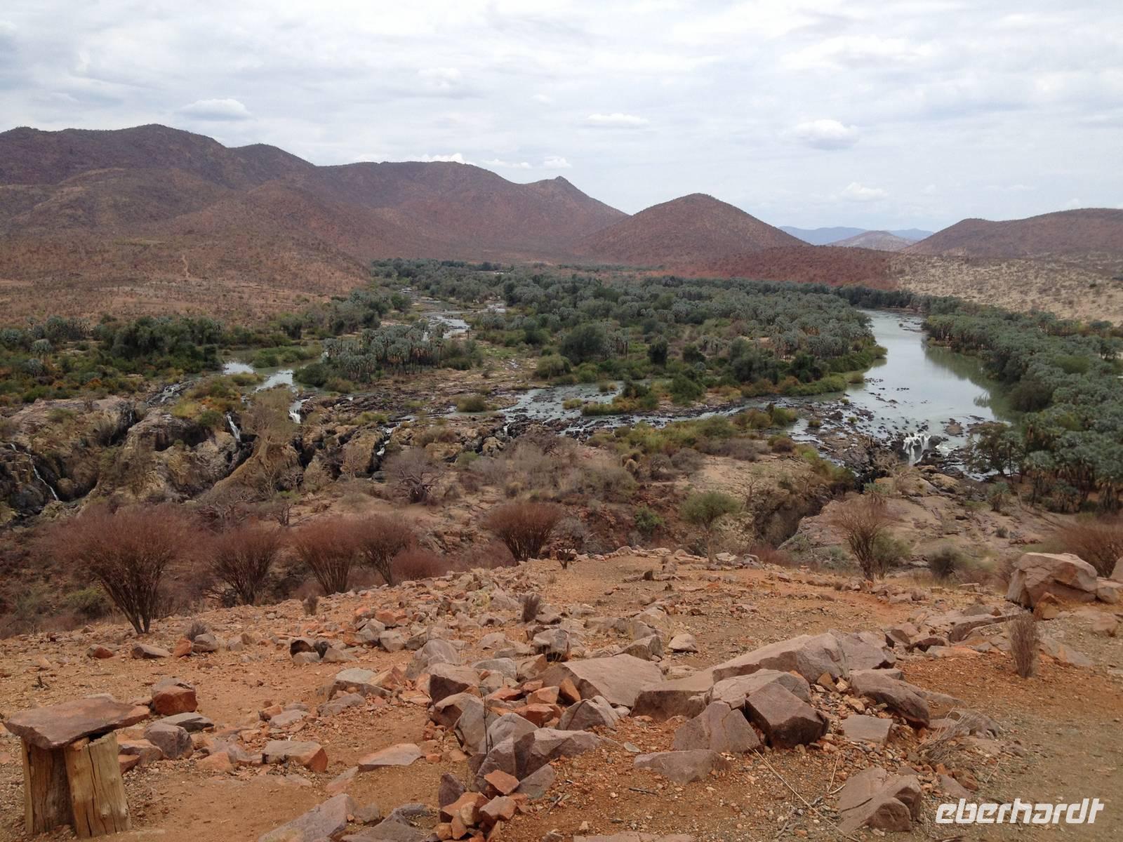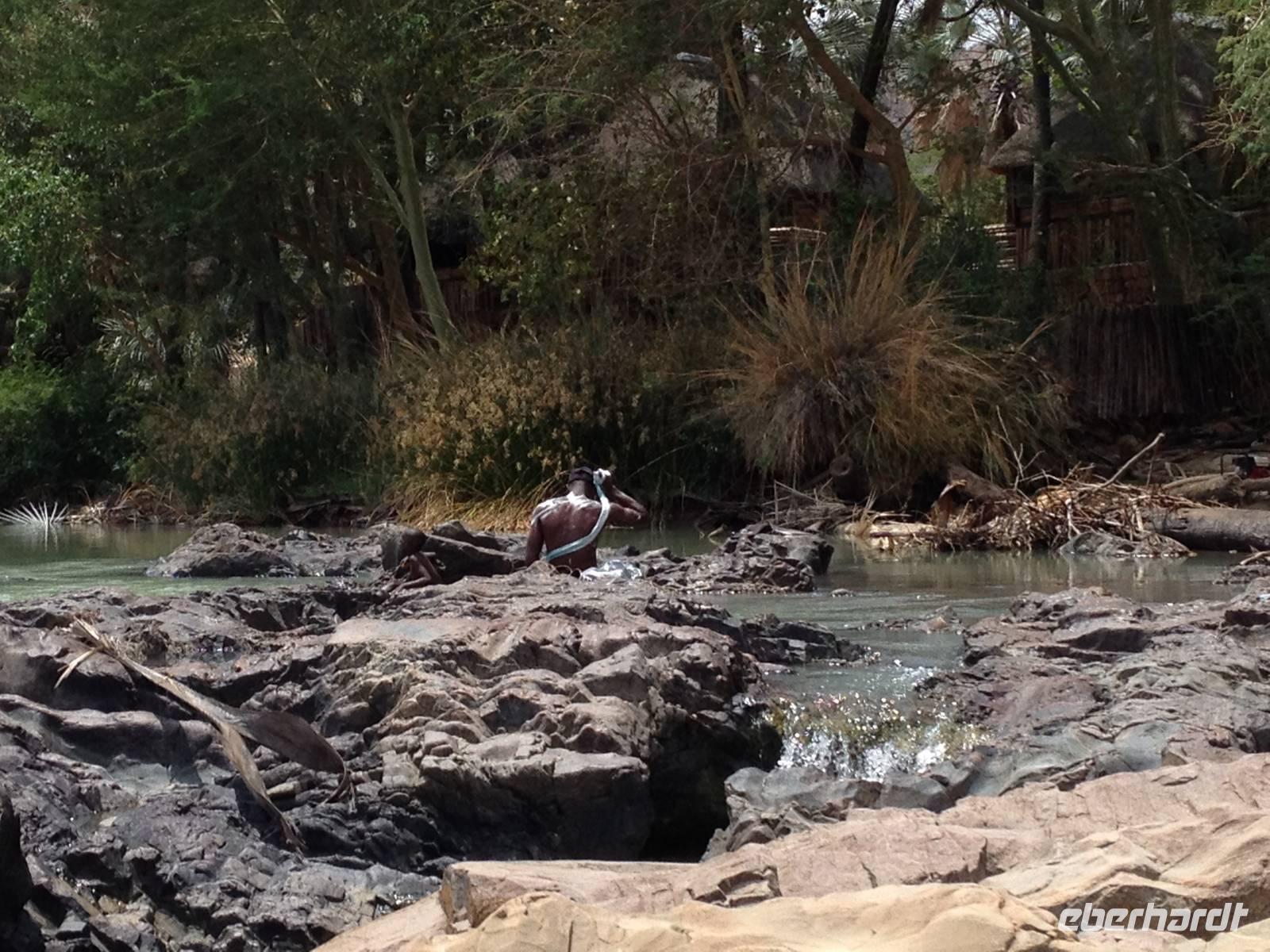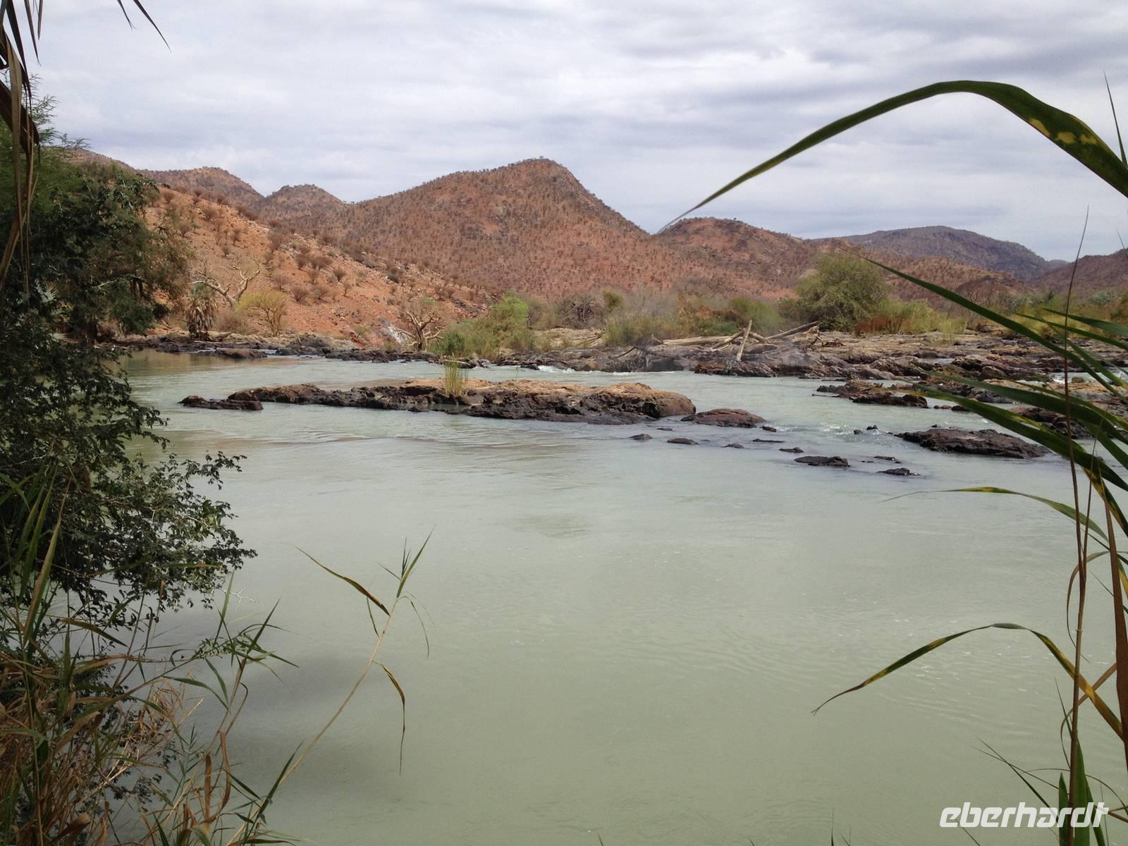 Unser Weg führte uns dann weiter bis zur Grenze nach Angola, an den Kunene-Fluss, der die natürliche Grenze bildet. An den Wasserfällen, die etwa 40 Meter hoch sind, machten wir unsere Mittagsrast im angenehmen Schatten der Palmen.