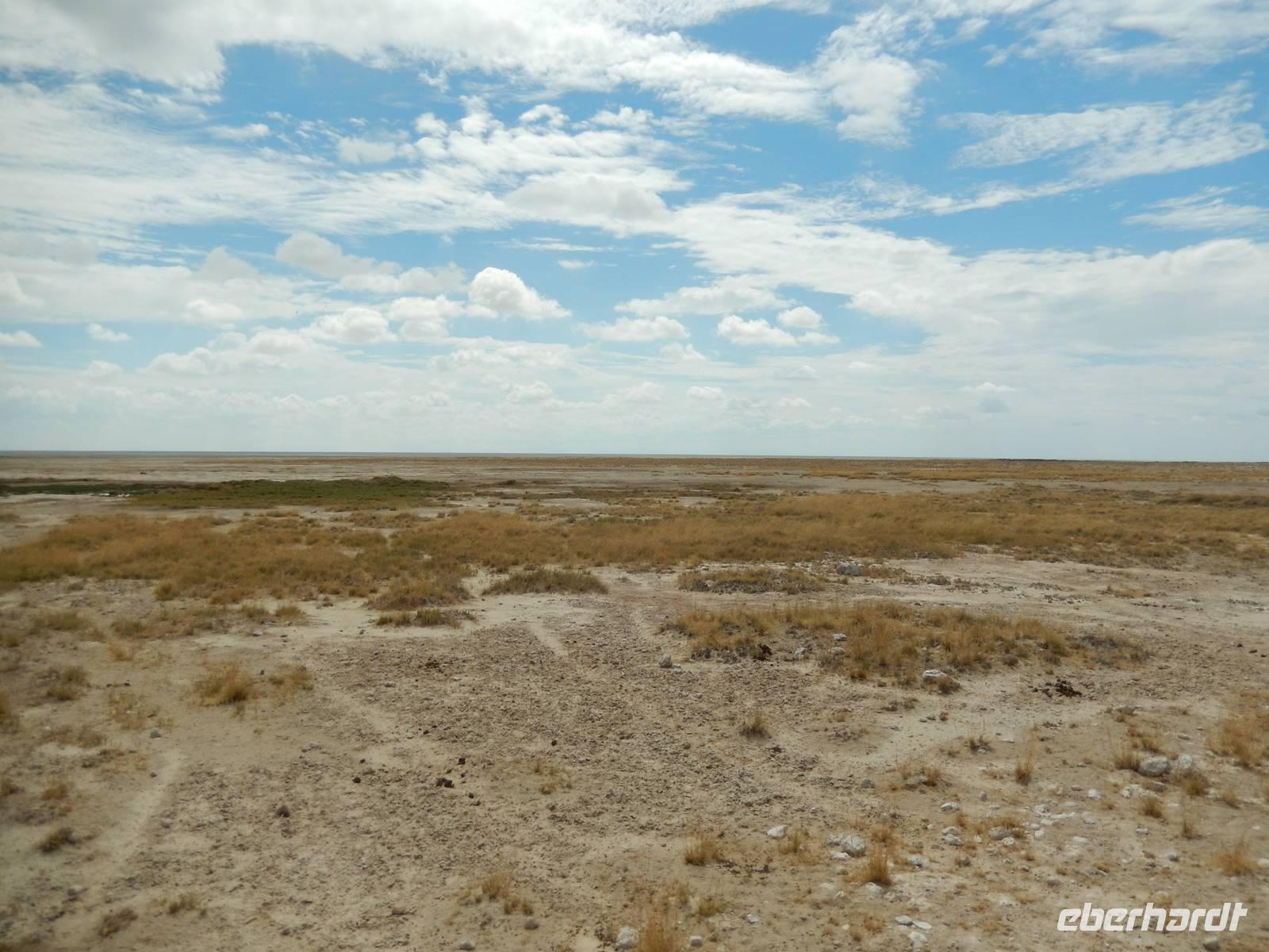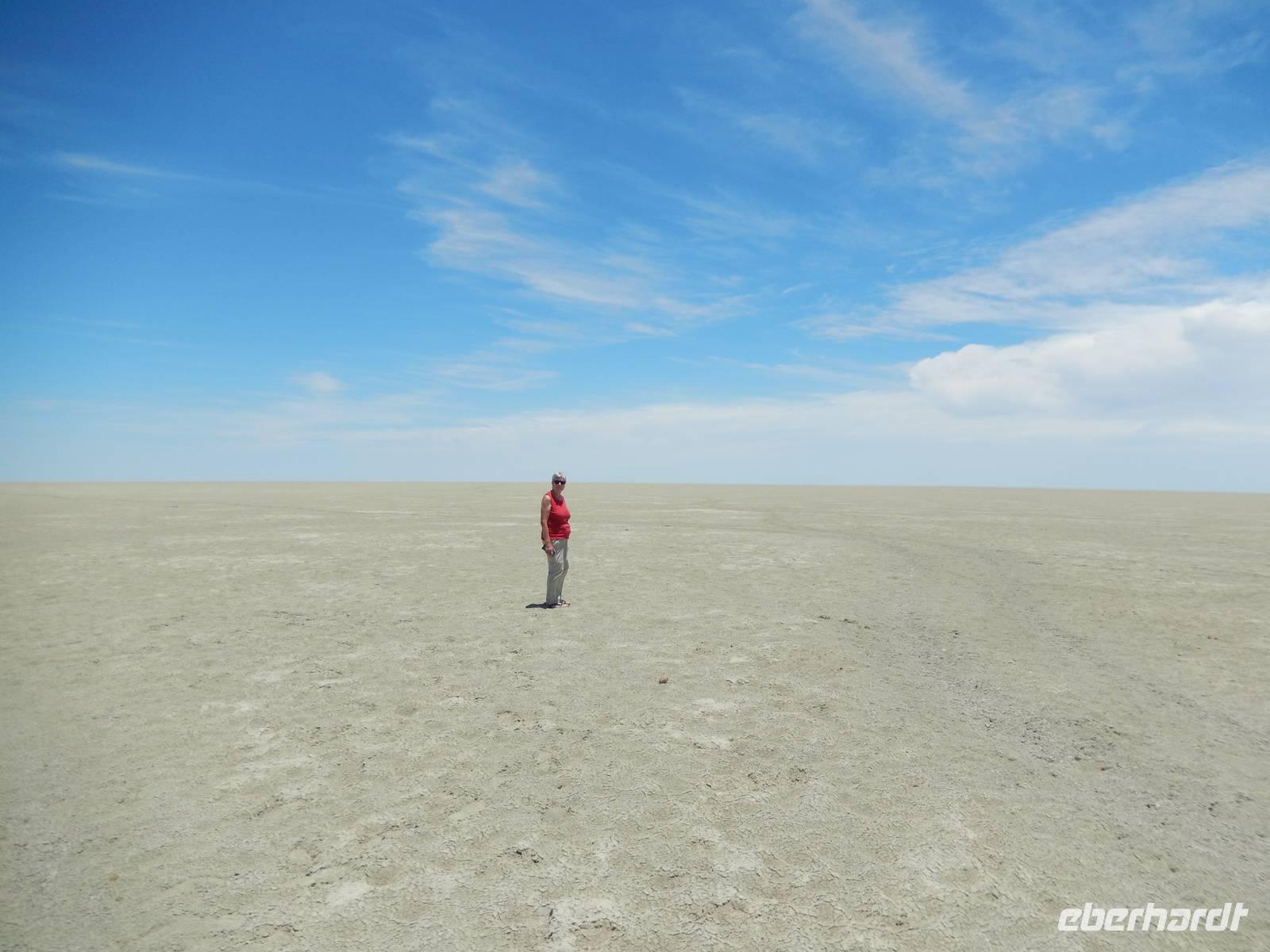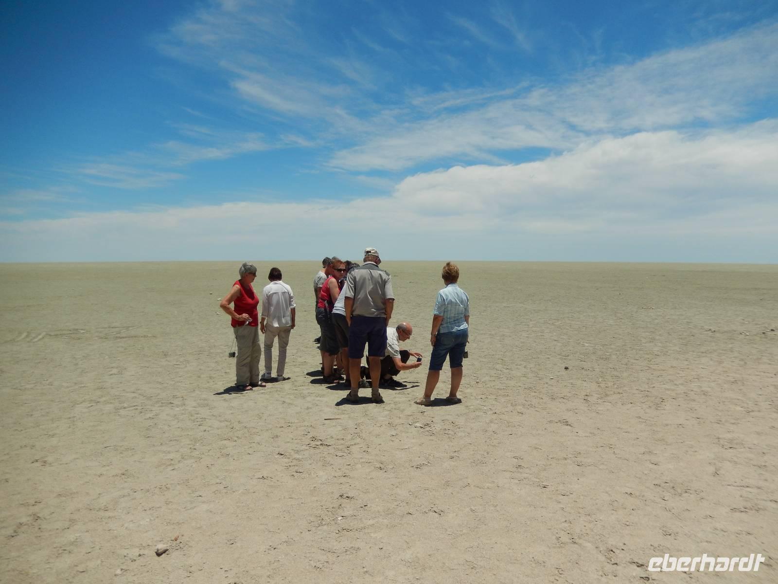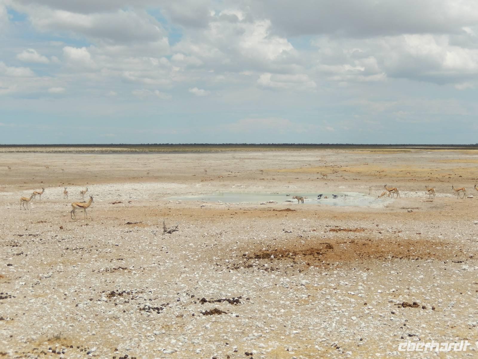 Am Wasserloch Salvadora mussten wir uns dann dem Anblick eines toten Elefanten hingeben - aber das ist nun mal die Natur! Als wir gerade wieder auf die Hauptstraße in Richtung Aussichtspunkt der Pfanne fahren wollten, überquerte vor uns eine Zebramangustenfamilie die Straße. An der Strecke erblickten wir dann noch Kuhantilopen, die uns noch gefehlt hatten. Nach der Pause im Camp Halali machten wir uns von der unendlichen Weite der Etosha-Pfanne ein Bild. Mit einer Länge von 130 km und einer Breite von 50 km ist sie die bei weitem größte in Afrika und zudem das markanteste Merkmal des Parks. Die Gesamtfläche beträgt ca. 4.800 Quadratkilometer, was etwa einem Viertel der Gesamtfläche des Etosha-Nationalparks entspricht. In der Sprache des Ovambo Stammes heißt Etosha "großer weißer Ort", dem wir nur zustimmen konnten!