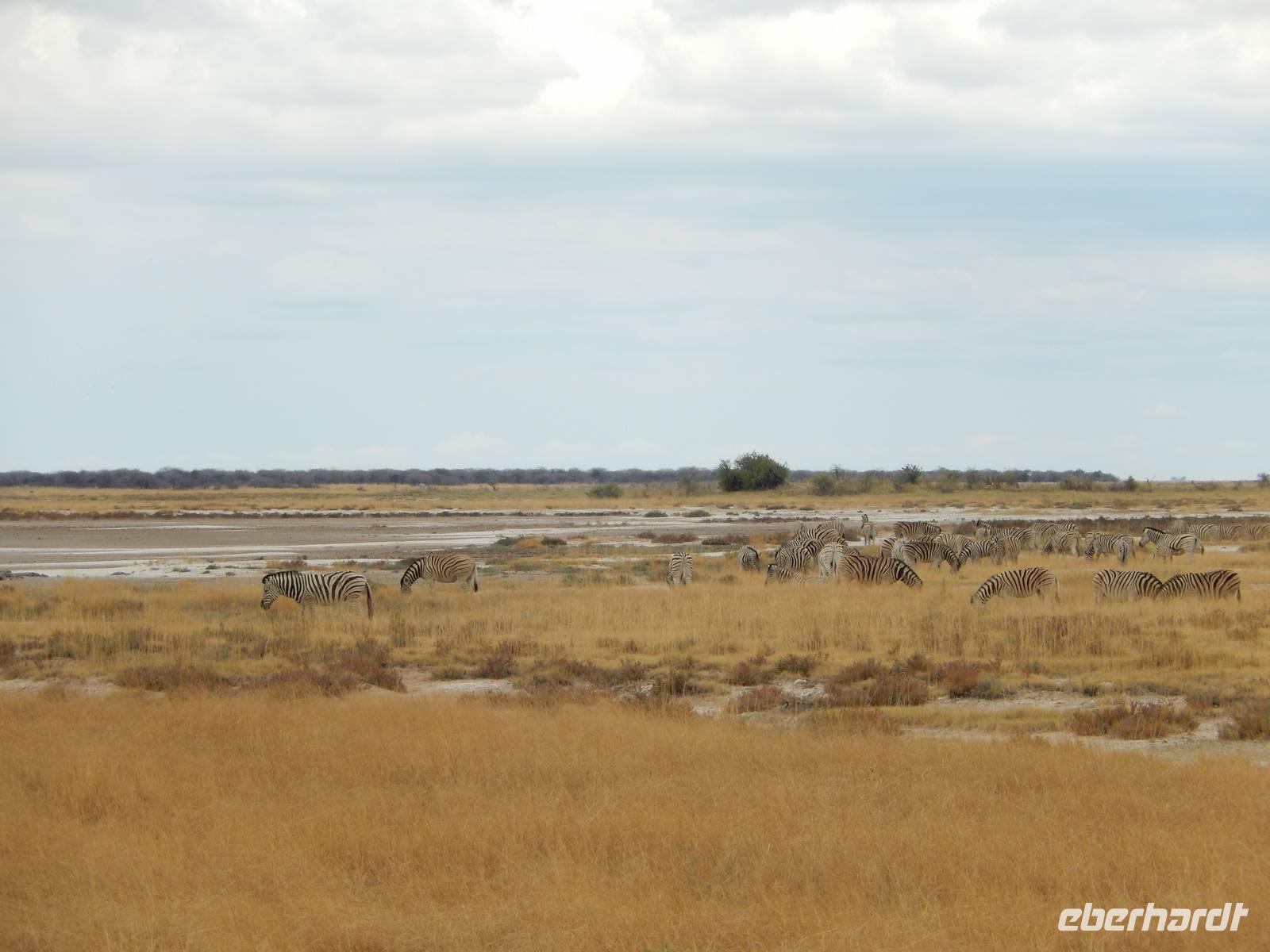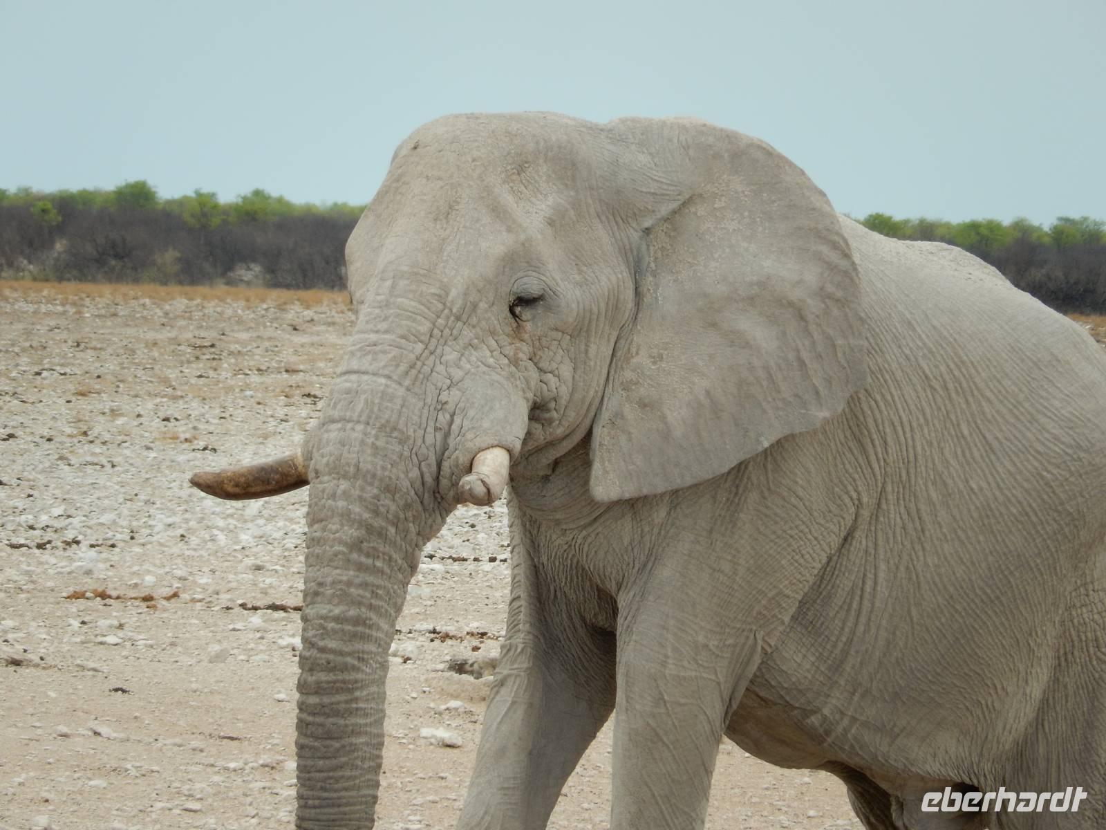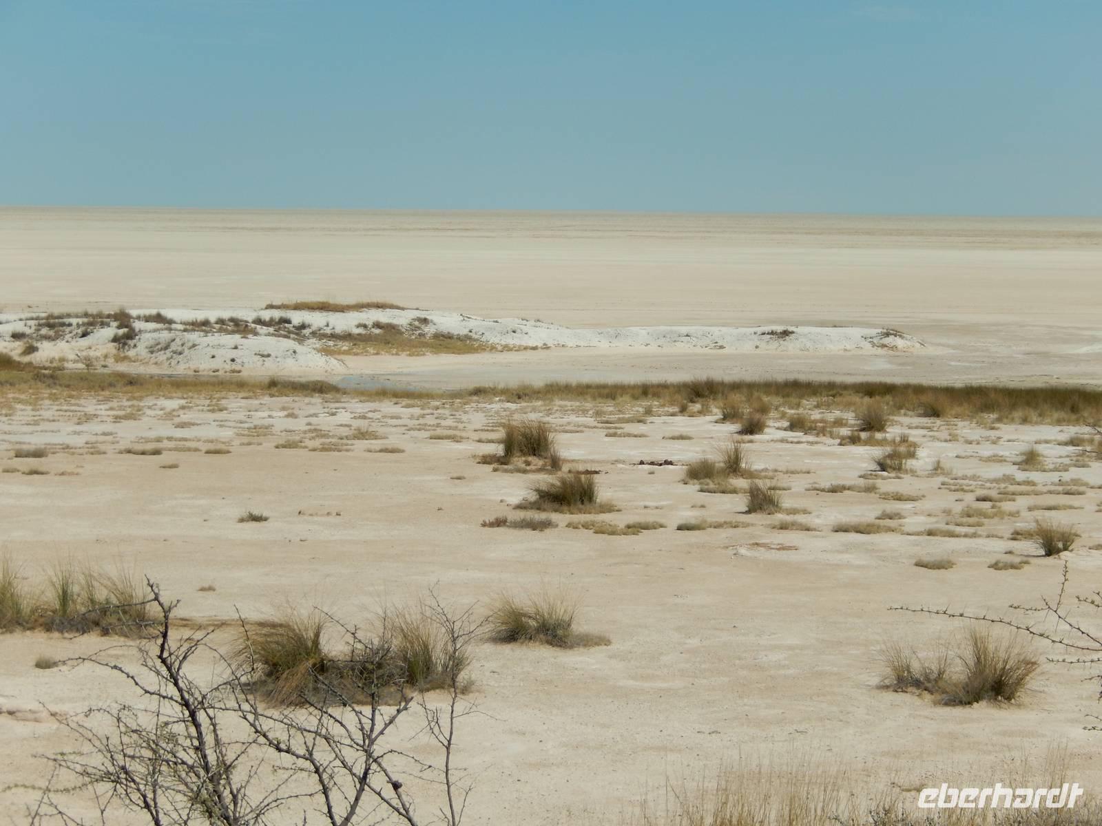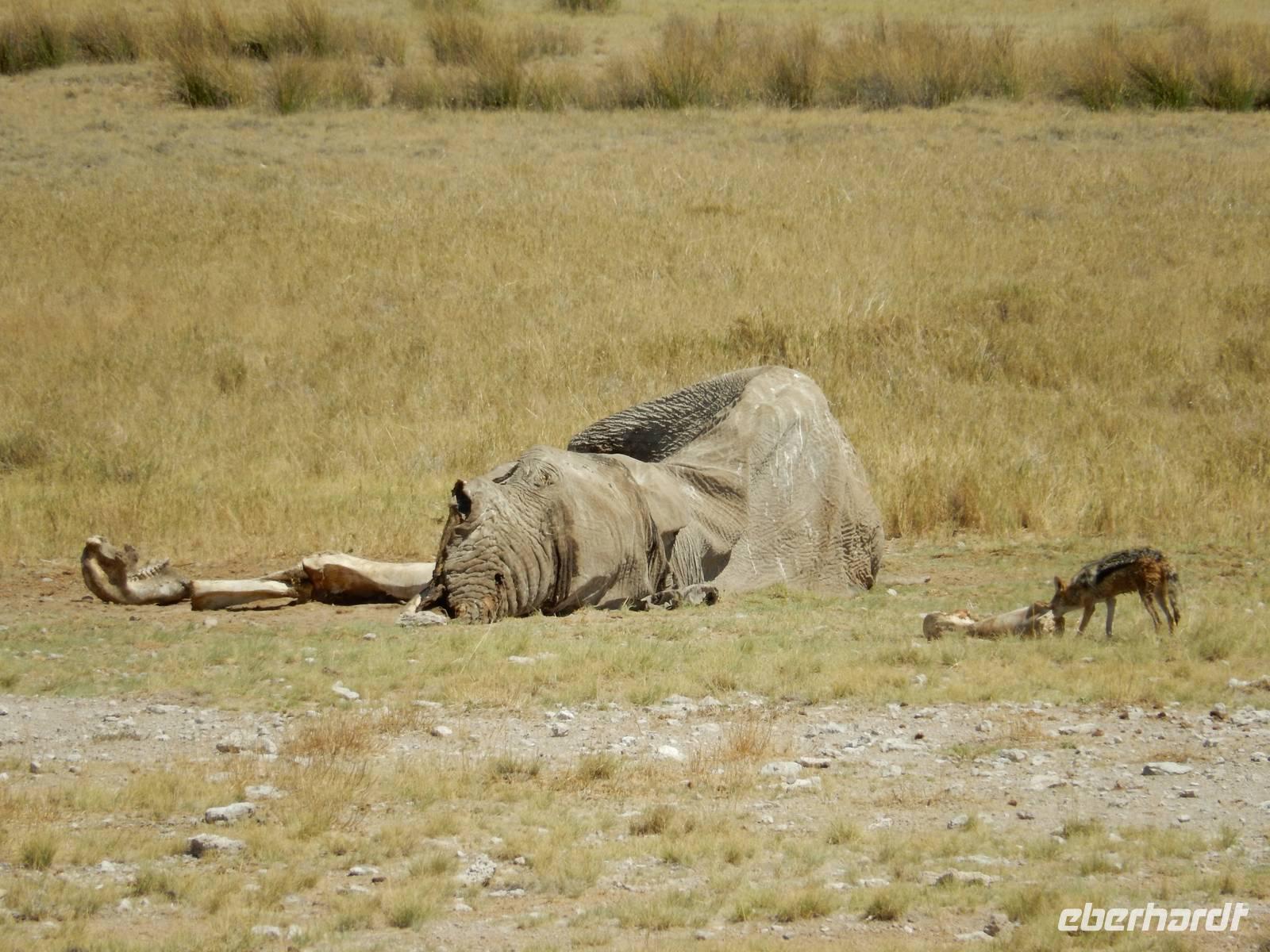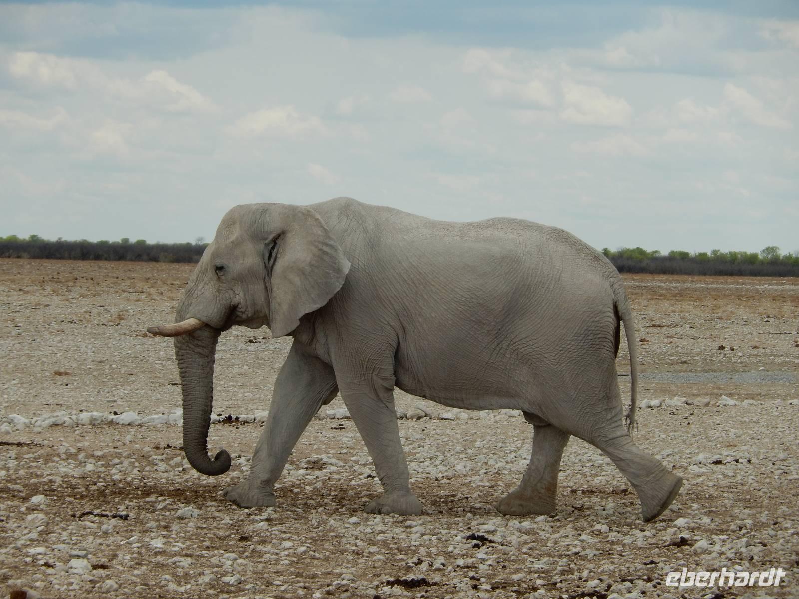 Am Wasserloch Salvadora mussten wir uns dann dem Anblick eines toten Elefanten hingeben - aber das ist nun mal die Natur! Als wir gerade wieder auf die Hauptstraße in Richtung Aussichtspunkt der Pfanne fahren wollten, überquerte vor uns eine Zebramangustenfamilie die Straße. An der Strecke erblickten wir dann noch Kuhantilopen, die uns noch gefehlt hatten. Nach der Pause im Camp Halali machten wir uns von der unendlichen Weite der Etosha-Pfanne ein Bild. Mit einer Länge von 130 km und einer Breite von 50 km ist sie die bei weitem größte in Afrika und zudem das markanteste Merkmal des Parks. Die Gesamtfläche beträgt ca. 4.800 Quadratkilometer, was etwa einem Viertel der Gesamtfläche des Etosha-Nationalparks entspricht. In der Sprache des Ovambo Stammes heißt Etosha "großer weißer Ort", dem wir nur zustimmen konnten!