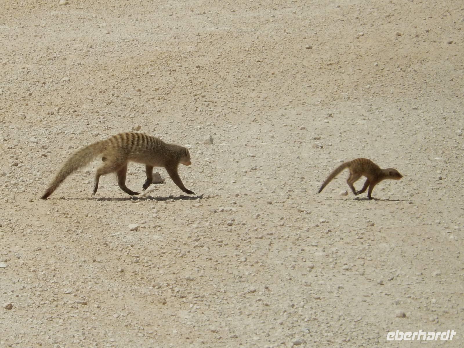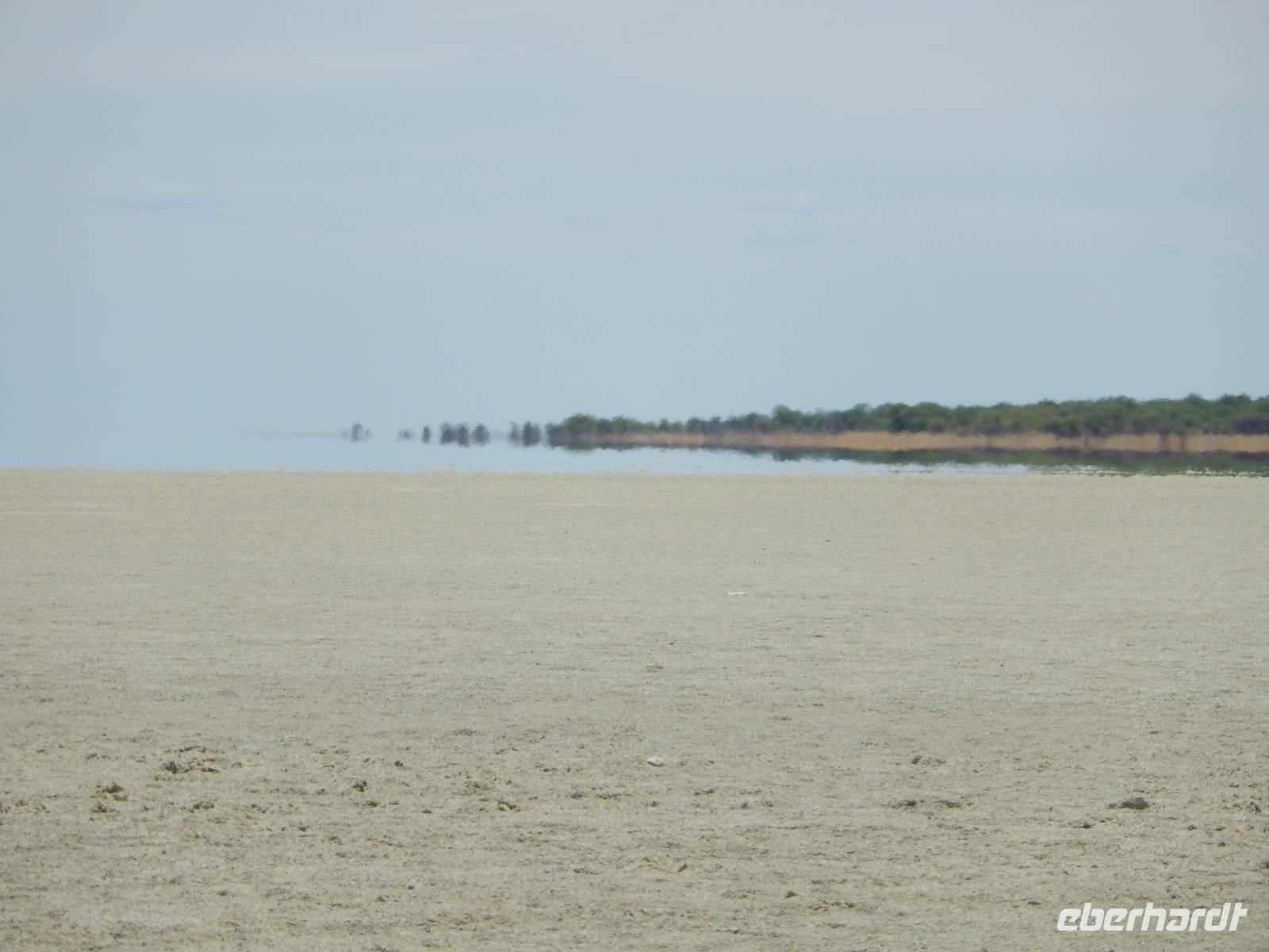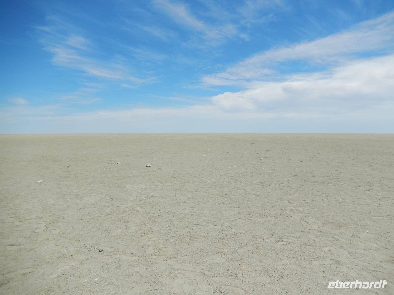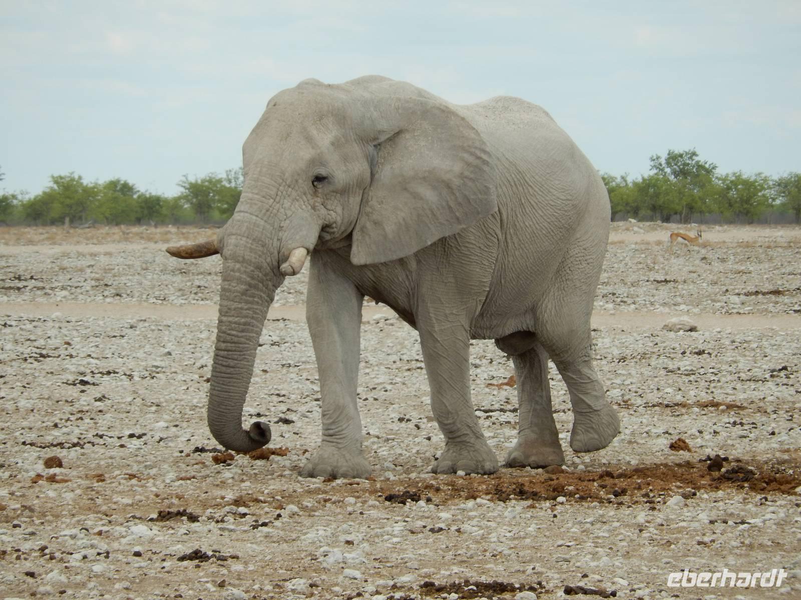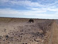 Am Wasserloch Salvadora mussten wir uns dann dem Anblick eines toten Elefanten hingeben - aber das ist nun mal die Natur! Als wir gerade wieder auf die Hauptstraße in Richtung Aussichtspunkt der Pfanne fahren wollten, überquerte vor uns eine Zebramangustenfamilie die Straße. An der Strecke erblickten wir dann noch Kuhantilopen, die uns noch gefehlt hatten. Nach der Pause im Camp Halali machten wir uns von der unendlichen Weite der Etosha-Pfanne ein Bild. Mit einer Länge von 130 km und einer Breite von 50 km ist sie die bei weitem größte in Afrika und zudem das markanteste Merkmal des Parks. Die Gesamtfläche beträgt ca. 4.800 Quadratkilometer, was etwa einem Viertel der Gesamtfläche des Etosha-Nationalparks entspricht. In der Sprache des Ovambo Stammes heißt Etosha "großer weißer Ort", dem wir nur zustimmen konnten!