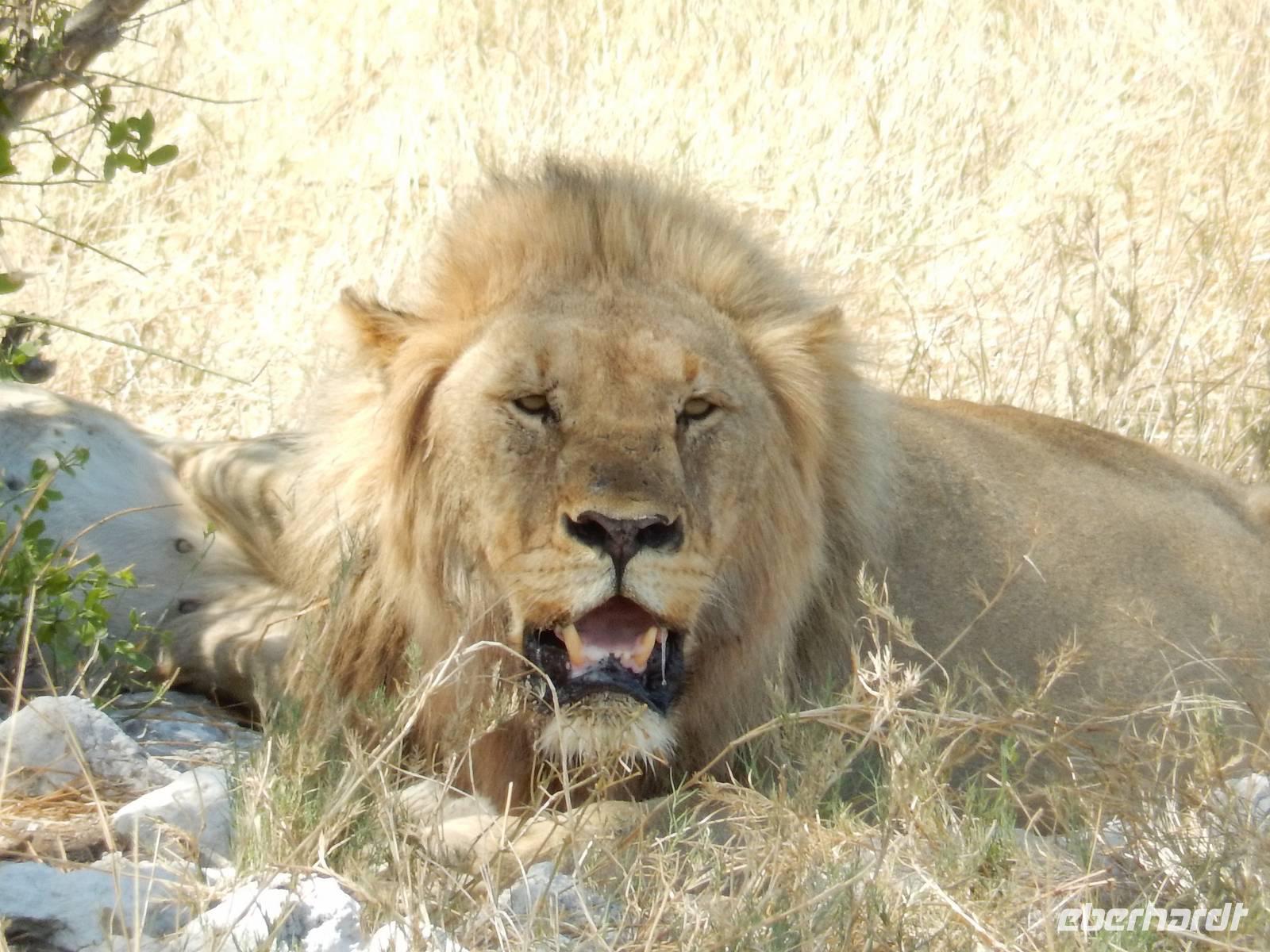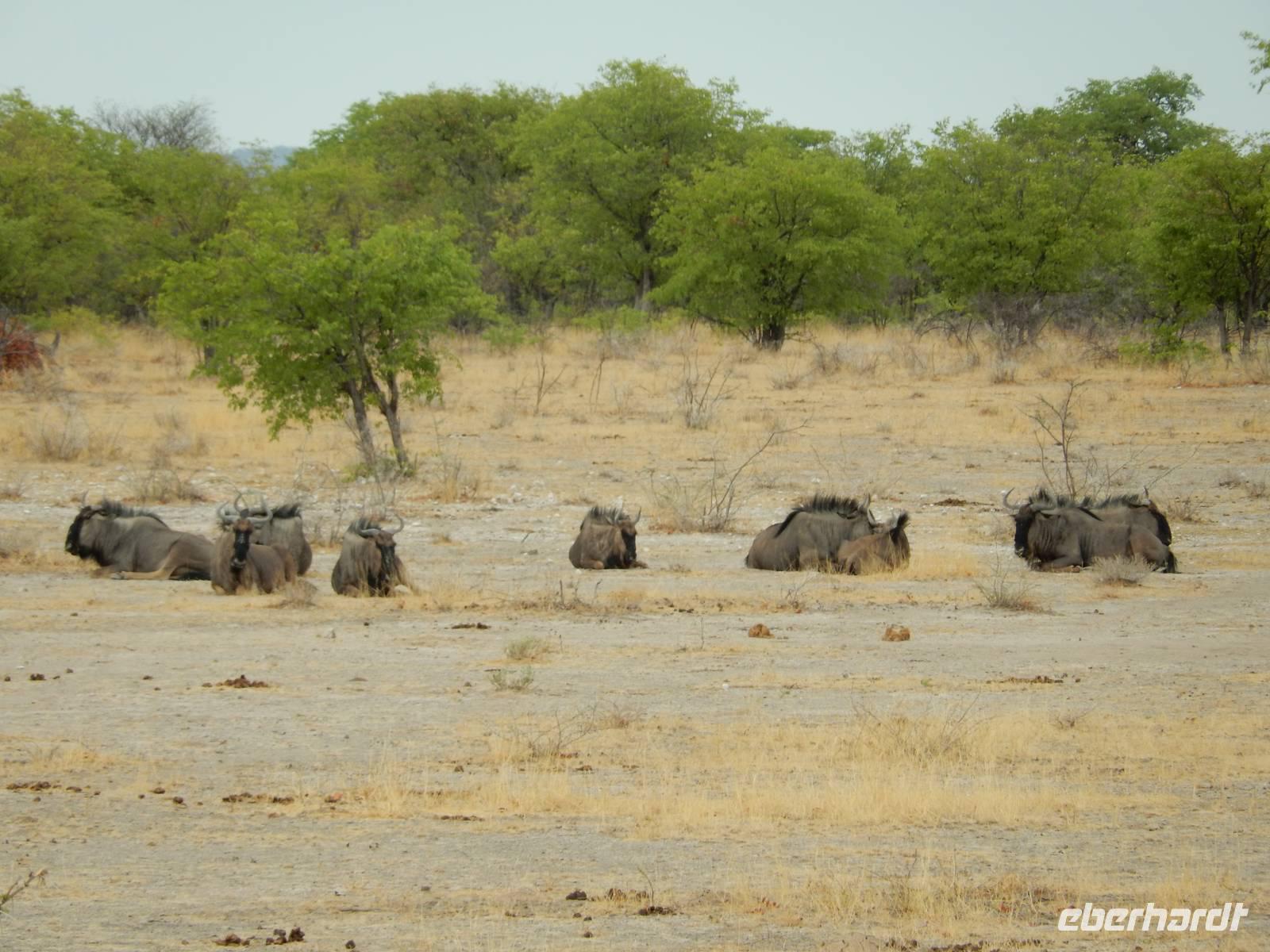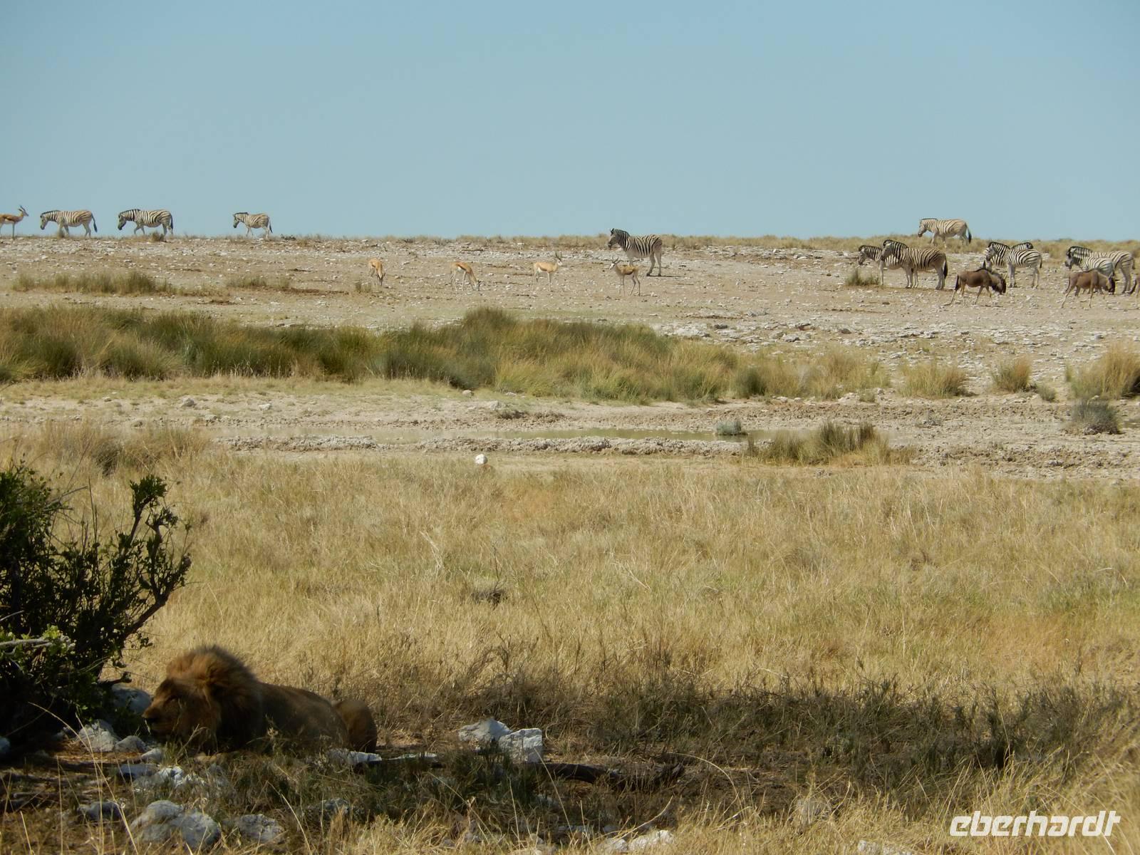 Nur wenige Meter waren wir mit unserem Bus unterwegs, als ein Spitzmaulnashorn gemütlich vor uns über die Straße spazierte. Dann waren wir wieder nicht lange unterwegs und ein stattlicher Löwe mit seiner Löwin hinderte uns am Weiterfahren. Am Wasserloch Sueda bekamen wir wieder ein buntes Potpourri mit Strauße, Zebras, Gnus, Wasservögeln, Springböcken & Co. In sicherem Abstand haben sie sich versammelt, um dem Löwenpärchen, das sich unter einem Baum Schatten gesucht hatte, nicht zu nahe zu kommen.
