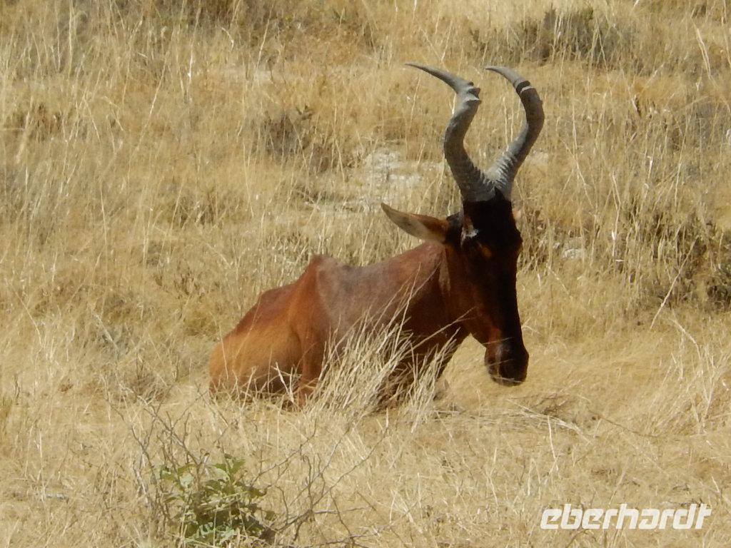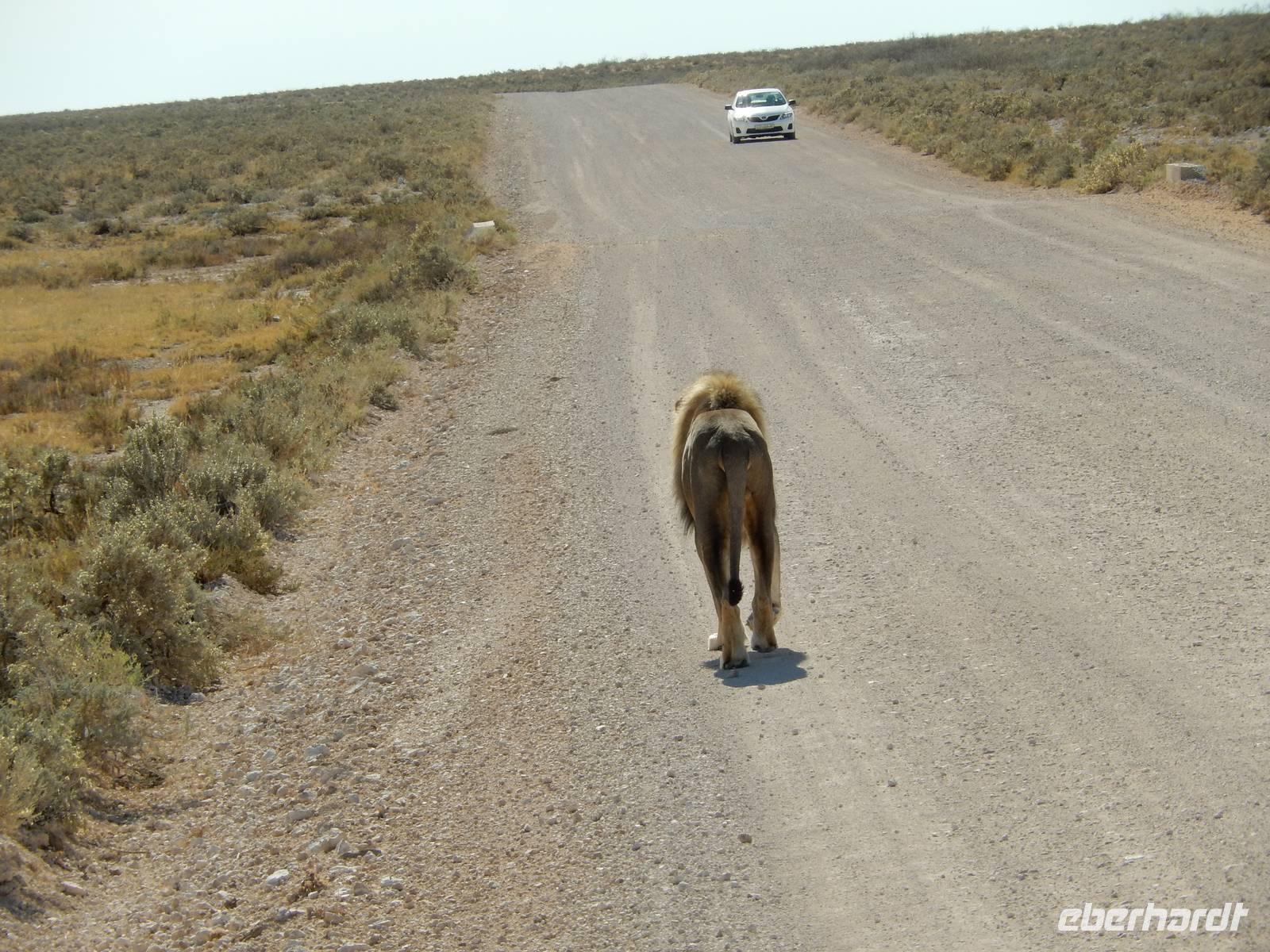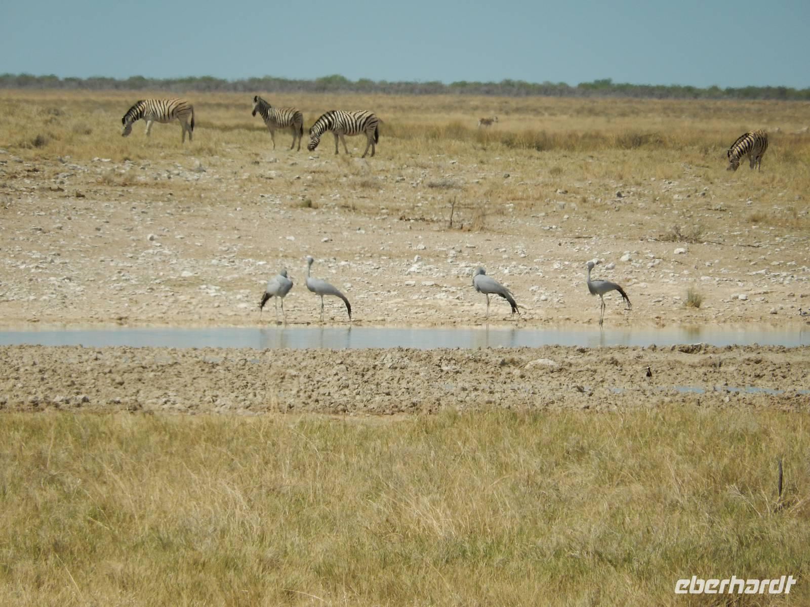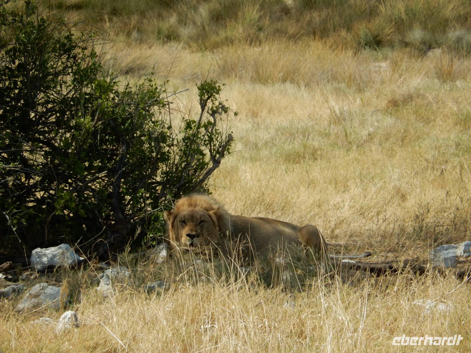 Nur wenige Meter waren wir mit unserem Bus unterwegs, als ein Spitzmaulnashorn gemütlich vor uns über die Straße spazierte. Dann waren wir wieder nicht lange unterwegs und ein stattlicher Löwe mit seiner Löwin hinderte uns am Weiterfahren. Am Wasserloch Sueda bekamen wir wieder ein buntes Potpourri mit Strauße, Zebras, Gnus, Wasservögeln, Springböcken & Co. In sicherem Abstand haben sie sich versammelt, um dem Löwenpärchen, das sich unter einem Baum Schatten gesucht hatte, nicht zu nahe zu kommen.