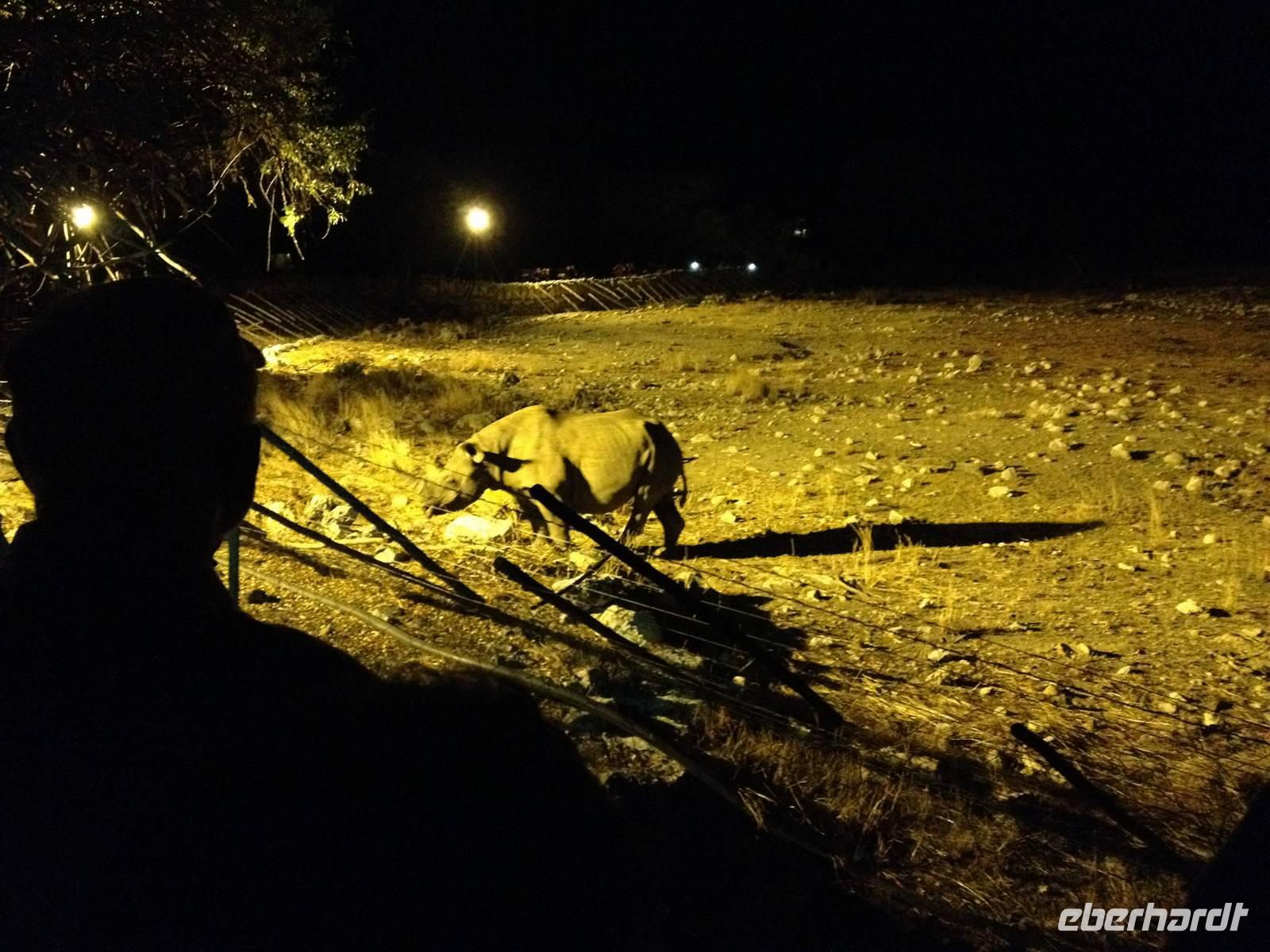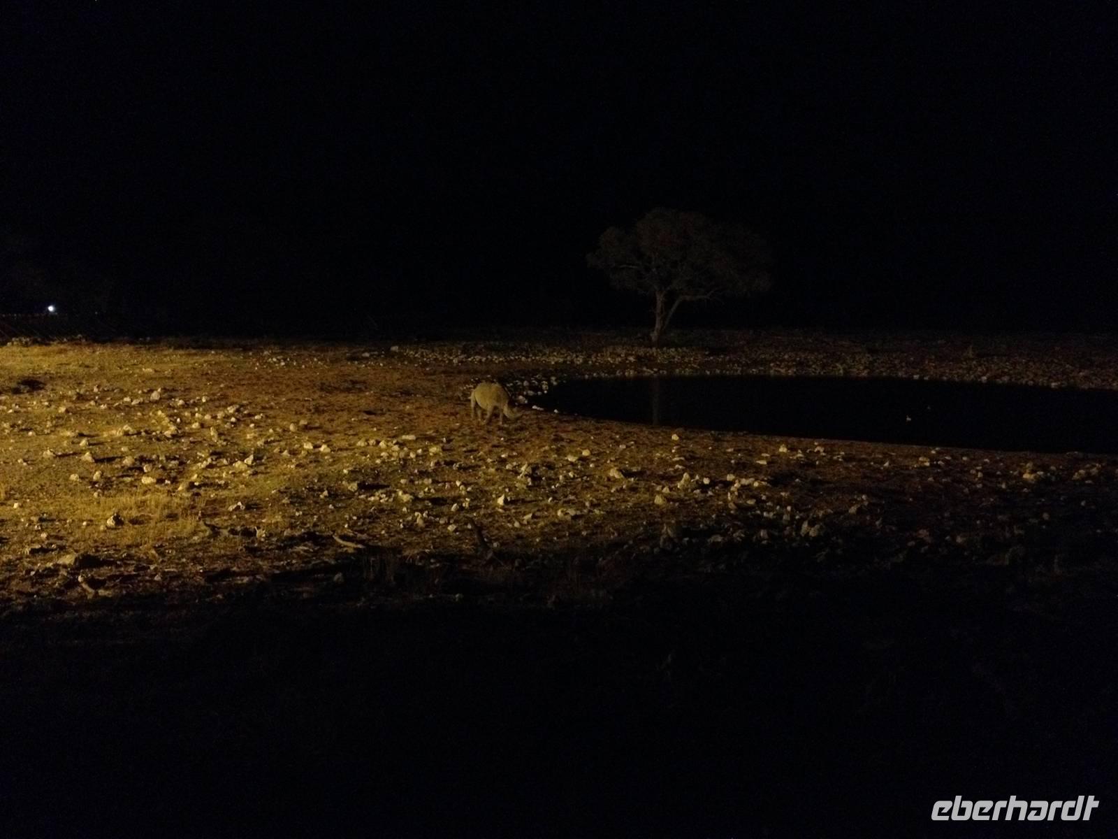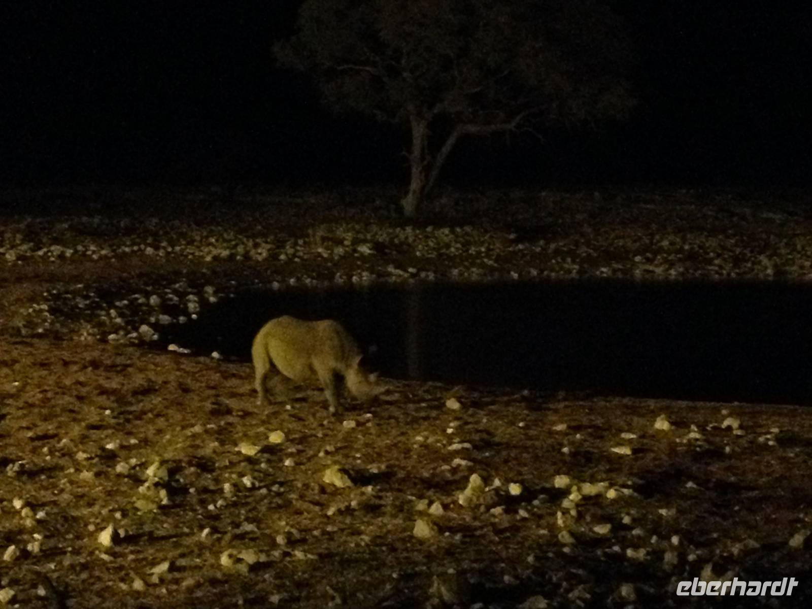 Auf dem Turm des Camps genossen wir vor dem Abendessen einen Sundowner und nach dem Abendessen trafen wir uns am beleuchteten Wasserloch, für das das Camp so berühmt ist. Es ist einer der besten Orte um das vom Aussterben bedrohte Spitzmaulnashorn zu sichten. Dieses archaische Tier kann oft zusammen mit Löwen und Elefanten beim Trinken beobachtet werden. Doch es ließ lange auf sich warten. Erst als die ersten Gäste schon das Wasserloch verlassen haben, kam immer wieder eines zum Vorschein, um seinen Durst zu stillen.