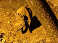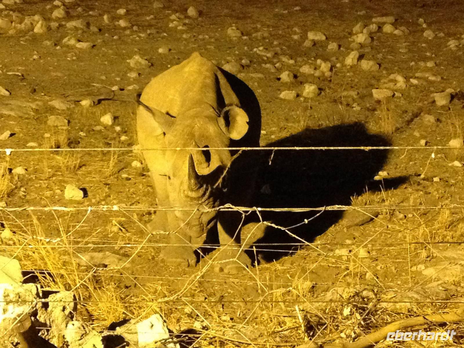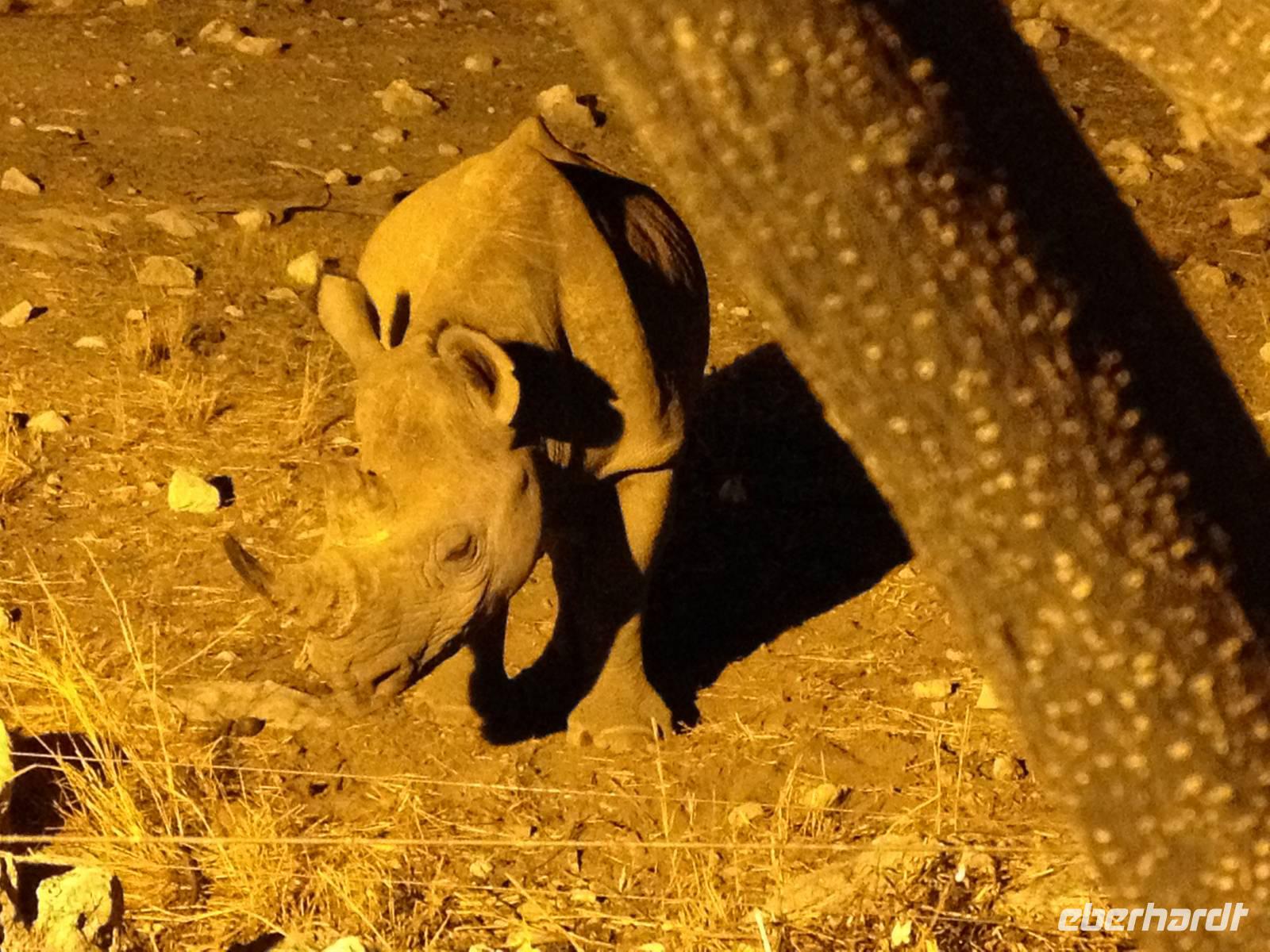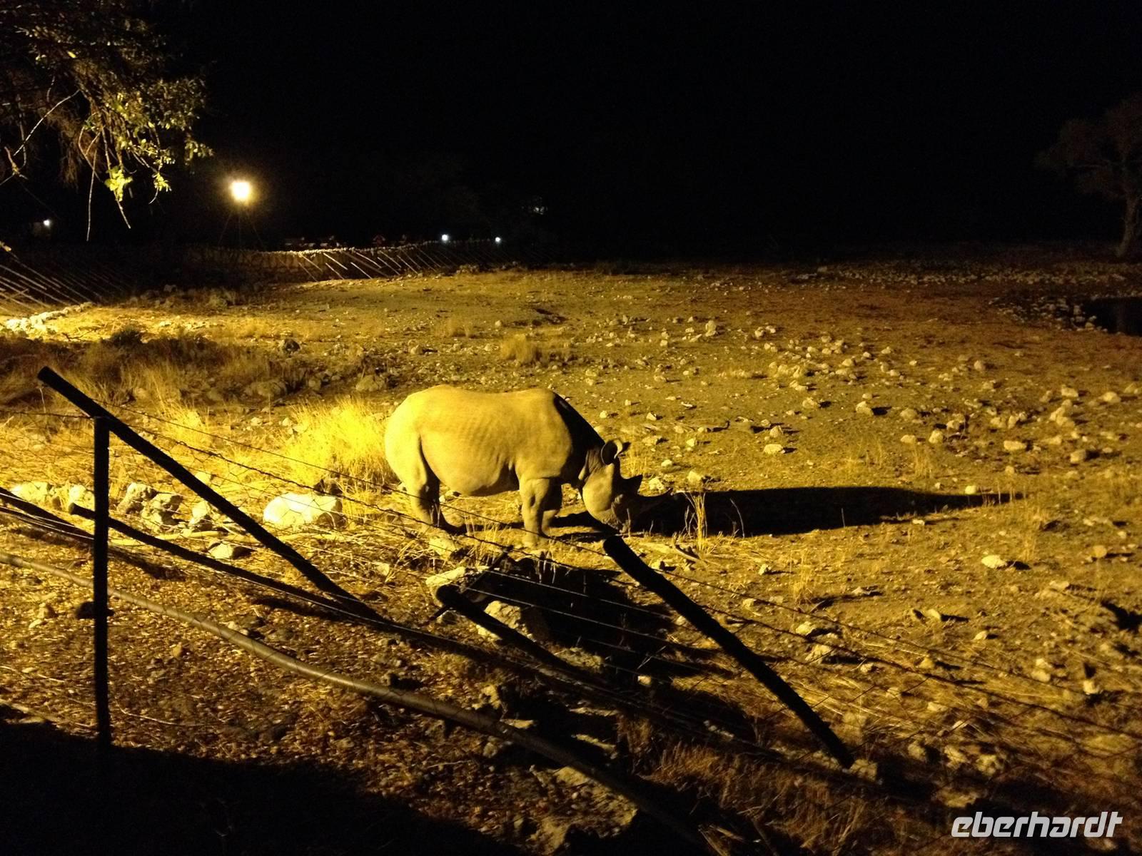 Auf dem Turm des Camps genossen wir vor dem Abendessen einen Sundowner und nach dem Abendessen trafen wir uns am beleuchteten Wasserloch, für das das Camp so berühmt ist. Es ist einer der besten Orte um das vom Aussterben bedrohte Spitzmaulnashorn zu sichten. Dieses archaische Tier kann oft zusammen mit Löwen und Elefanten beim Trinken beobachtet werden. Doch es ließ lange auf sich warten. Erst als die ersten Gäste schon das Wasserloch verlassen haben, kam immer wieder eines zum Vorschein, um seinen Durst zu stillen.