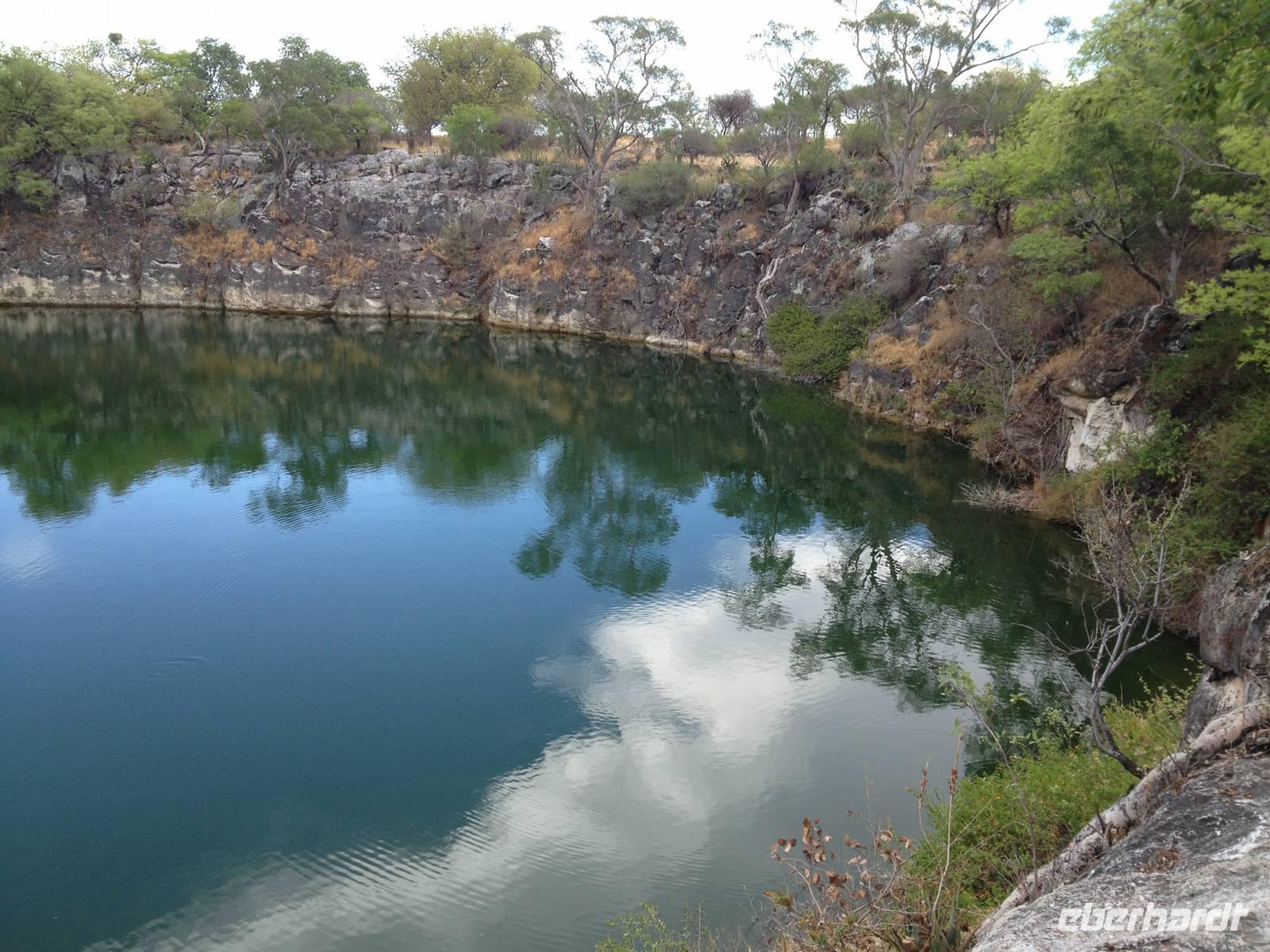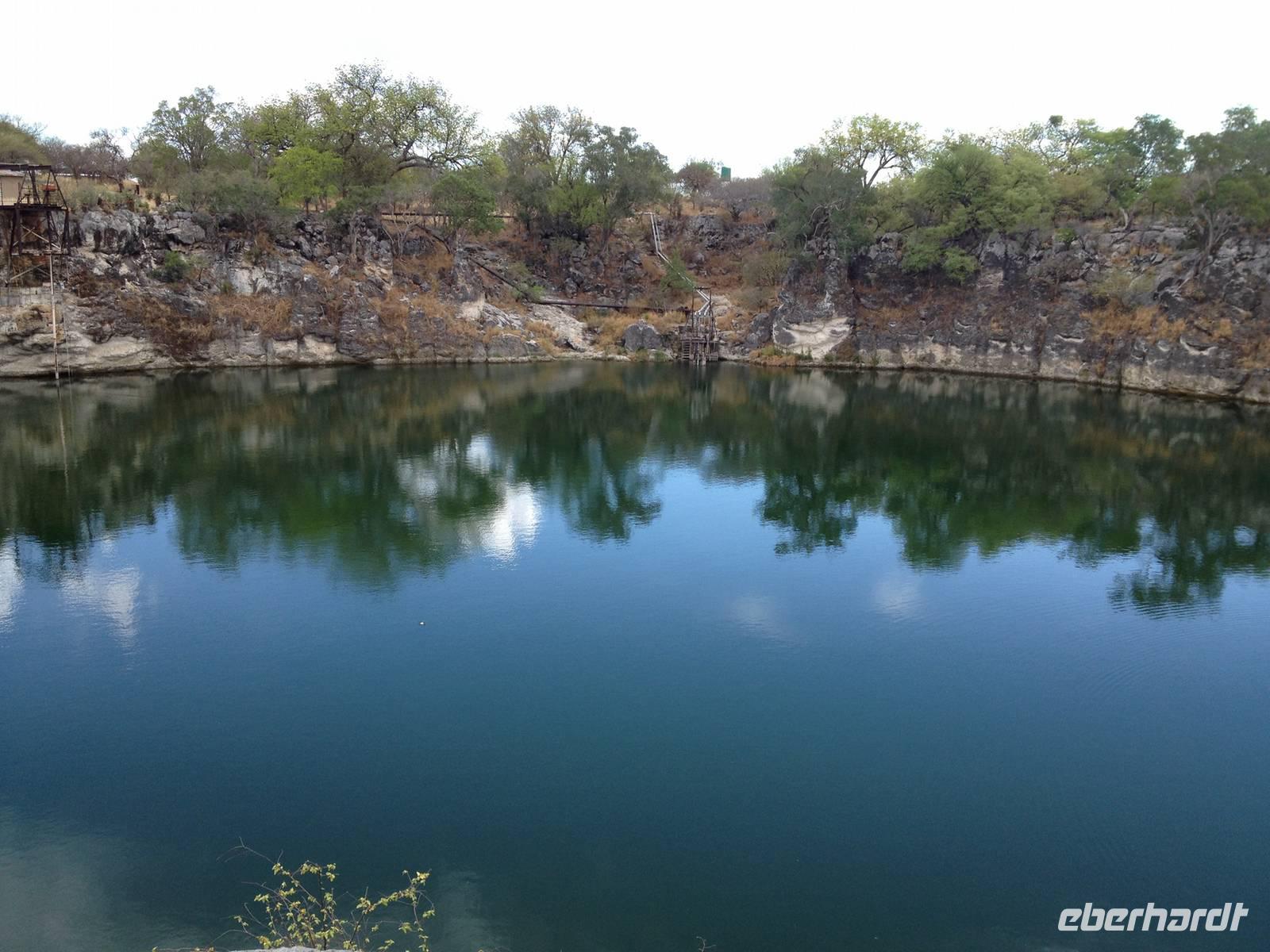 Unser heutiges Ziel heute war die !Uris Safari Lodge auf einem ehemaligen Minengelände in der Nähe von Tsumeb. Auf dem Weg dorthin stoppten wir noch am Otjikoto-See. Mit seinen ca. 15.000 Quadratmeter ist er der größte See Namibias, der das ganze Jahr mit Wasser gefüllt ist, und befindet sich in einer trichterförmigen Senke, einer sogenannten Doline. Passenderweise bedeutet Otjikoto in der Herero-Sprache "tiefes Loch". Bezüglich der Tiefe schwanken die Angaben zwischen 120 und 150 Meter. Der See an sich ist nicht das interessanteste, aber die Dinge, die in ihm schlummern. Während des 1. Weltkriegs nämlich, als Deutschland auch in Namibia gegen Großbritannien und dessen Verbündeten Südafrika kämpfte, versenkte die Deutsche Schutztruppe kurz vor der Kapitulation im Juli 1915 hier ihre modernen Waffen und Munition, damit sie nicht dem Gegner in die Hände fielen und vielleicht wiederum in Europa gegen die Deutschen genutzt werden konnten.