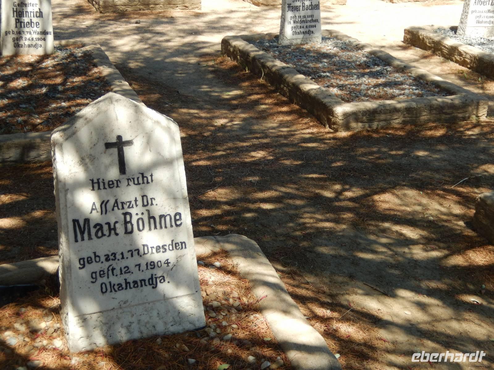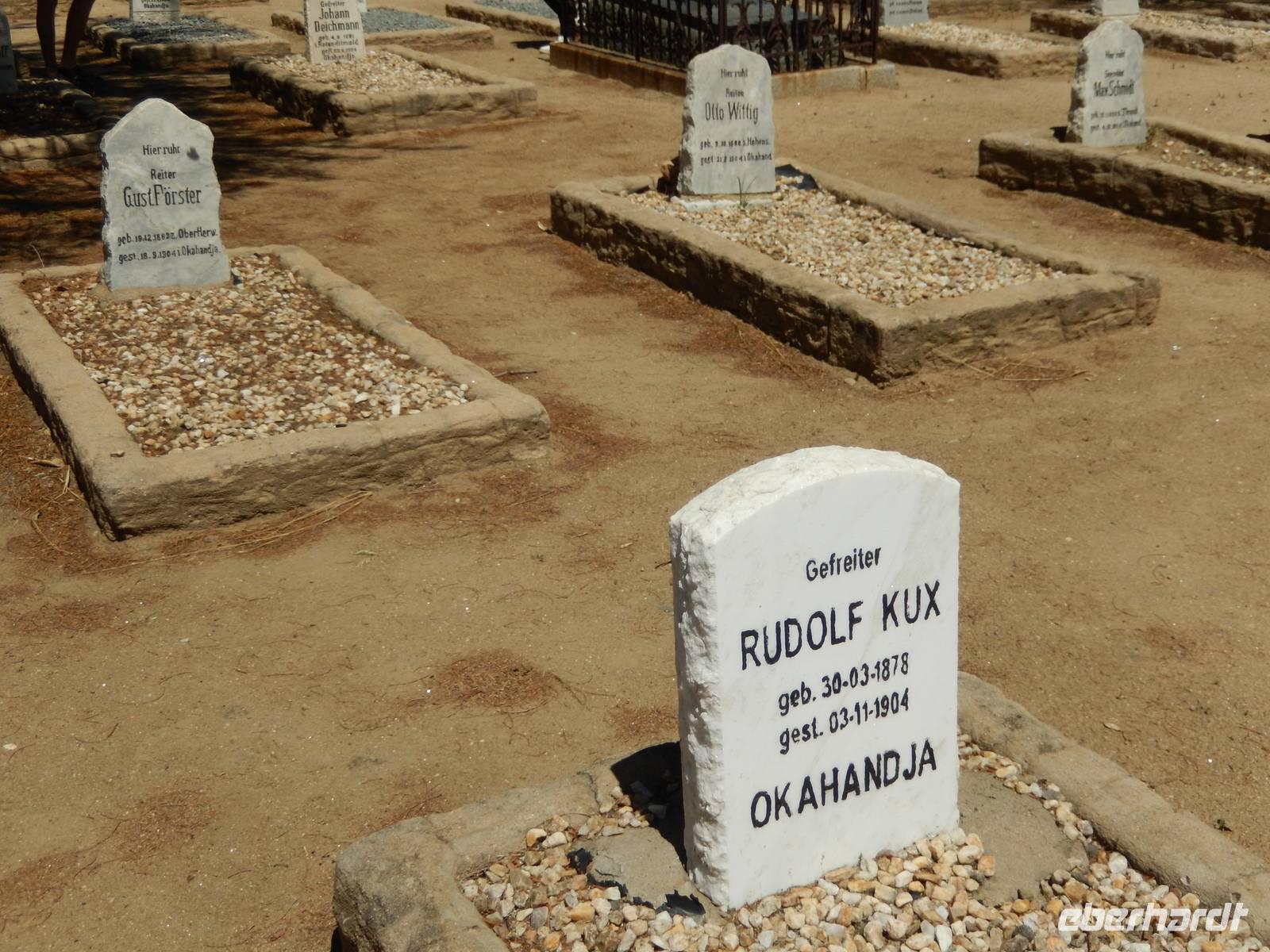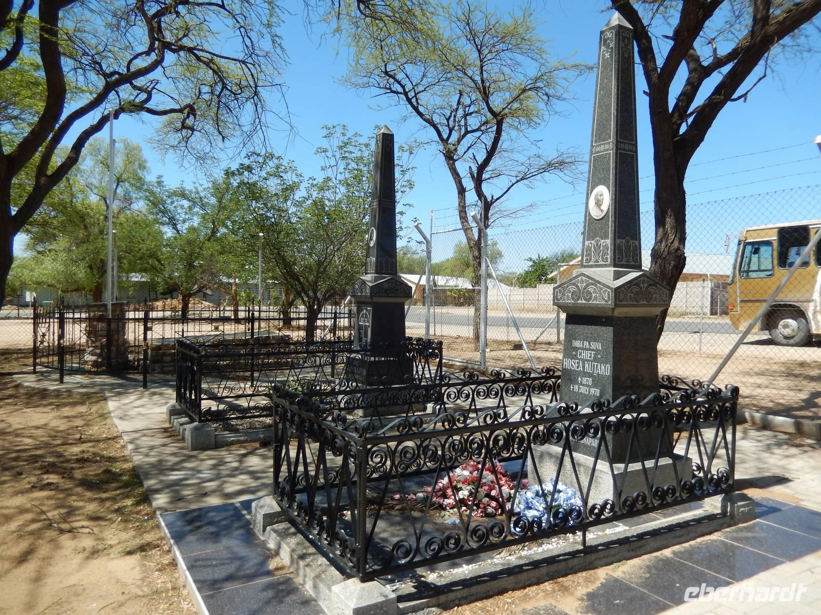 Der Weg führte uns nun wieder langsam aber sicher in Richtung Flughafen. Vorbei am mächtigen Waterberg-Plateau, welches von herrlichem Grün umgeben ist, erreichten wir die kleine Stadt Okahandja. Zunächst besuchten wir einen Friedhof, auf dem Stammesführer und frühere Missionare beerdigt wurden. Gleich nebenan besuchten wir einen weiteren Friedhof, auf dem viele deutschstämmige Bürger der Stadt ihre letzte Ruhe fanden. Dabei erblickten wir viele Wurzeln im sächsischen Raum.