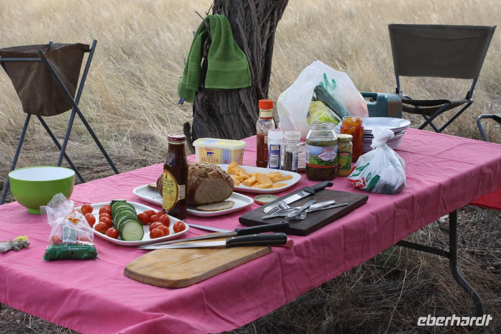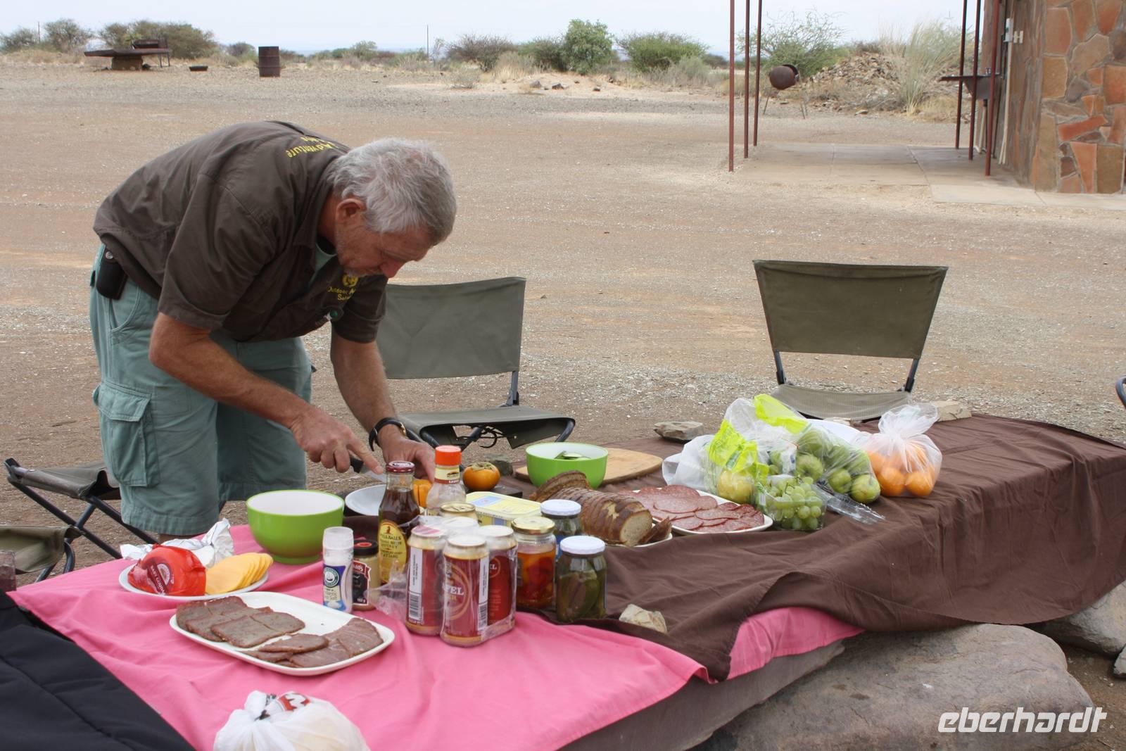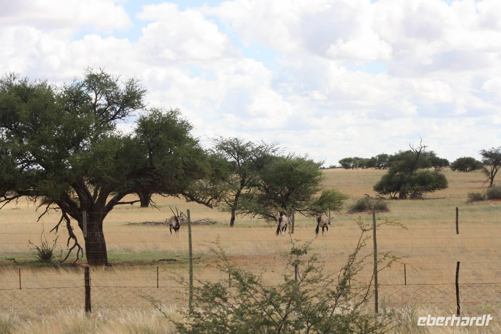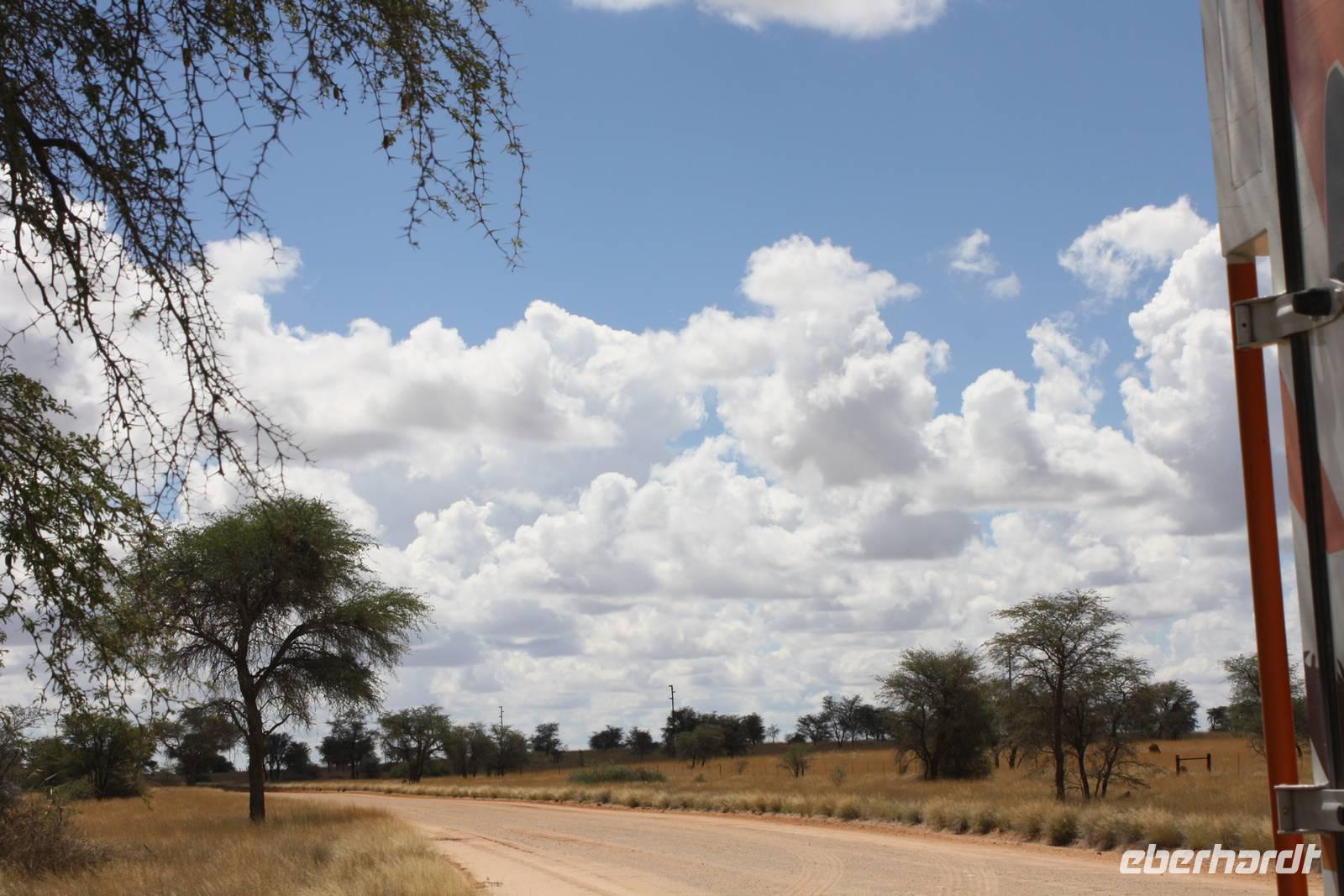 Ausgeschlafen treffen wir uns am nächsten Morgen wieder zum Frühstück. Mit wunderbarem Blick auf das vor uns liegende Windhoek genießen wir das leckere Buffet mit Schwarzbrot, Käse, Wurst, Obst und vielem mehr. Danach ziehen wir weiter. Mit gepacktem Bus halten wir noch einmal im Zentrum von Windhoek um Kleinigkeiten zu besorgen. Jonas fährt uns stadtauswärts, vorbei am mehr als imposanten Präsidenenpalast...einfach verrückt, wofür Geld ausgegeben wird, wo es an anderen Stellen dringender benötigt wird. Wir verlassen die Region von Windhoek auf der B1 und an uns vorbei zieht die unendliche Weite Namibas. Grüne Büsche, vereinzelte Häuser und ein wolkentoller Himmel begleiten uns. Nach einer Pause in Rehoboth geht es weiter nach Kalkrand und dort verlassen wir die asphaltierte Straße um auf der Schotterpiste weiter zu fahren. Hier sehen wir nun auch die ersten, großen Webervögelnester in den Bäumen und endliiiicchhhhhh: wir sehen die ersten Tiere. Auf der Strecke begegnene wir nun immer wieder Oryxen, Sträuße, Zebras, Impalas und Gnus. Kurz nach eins stoppen wir dann an einem Schattenbaum, packen Campingtisch und Stühle aus und genießen ein kleines Mittagspicknick mitten in der Pampa. Gut gestärkt beobachten wir weiter die Tiere. Schönstes Motiv des Tages für mich persönlich: grüner Buschstreife, dahinter roter Kalahari-Sand und darüber riesige weiße Wolken. Einfach einmalig.