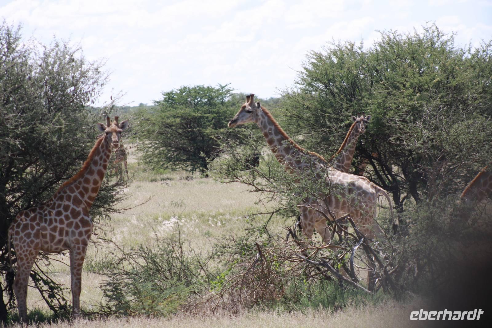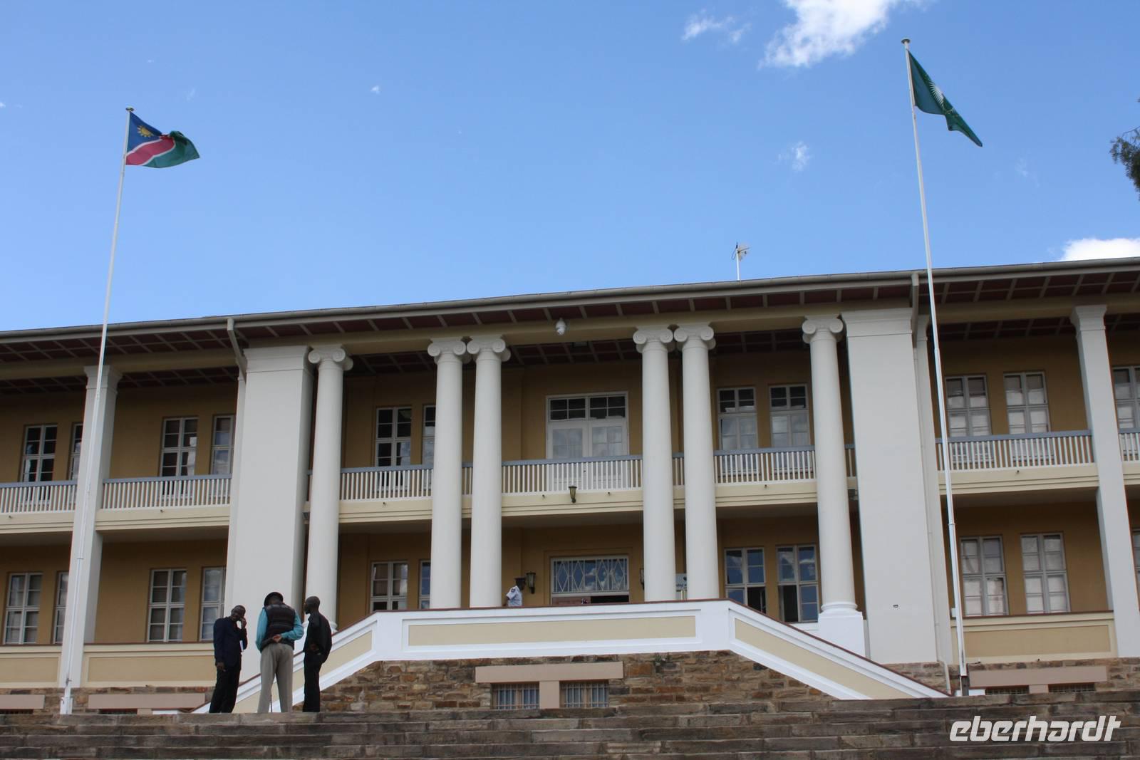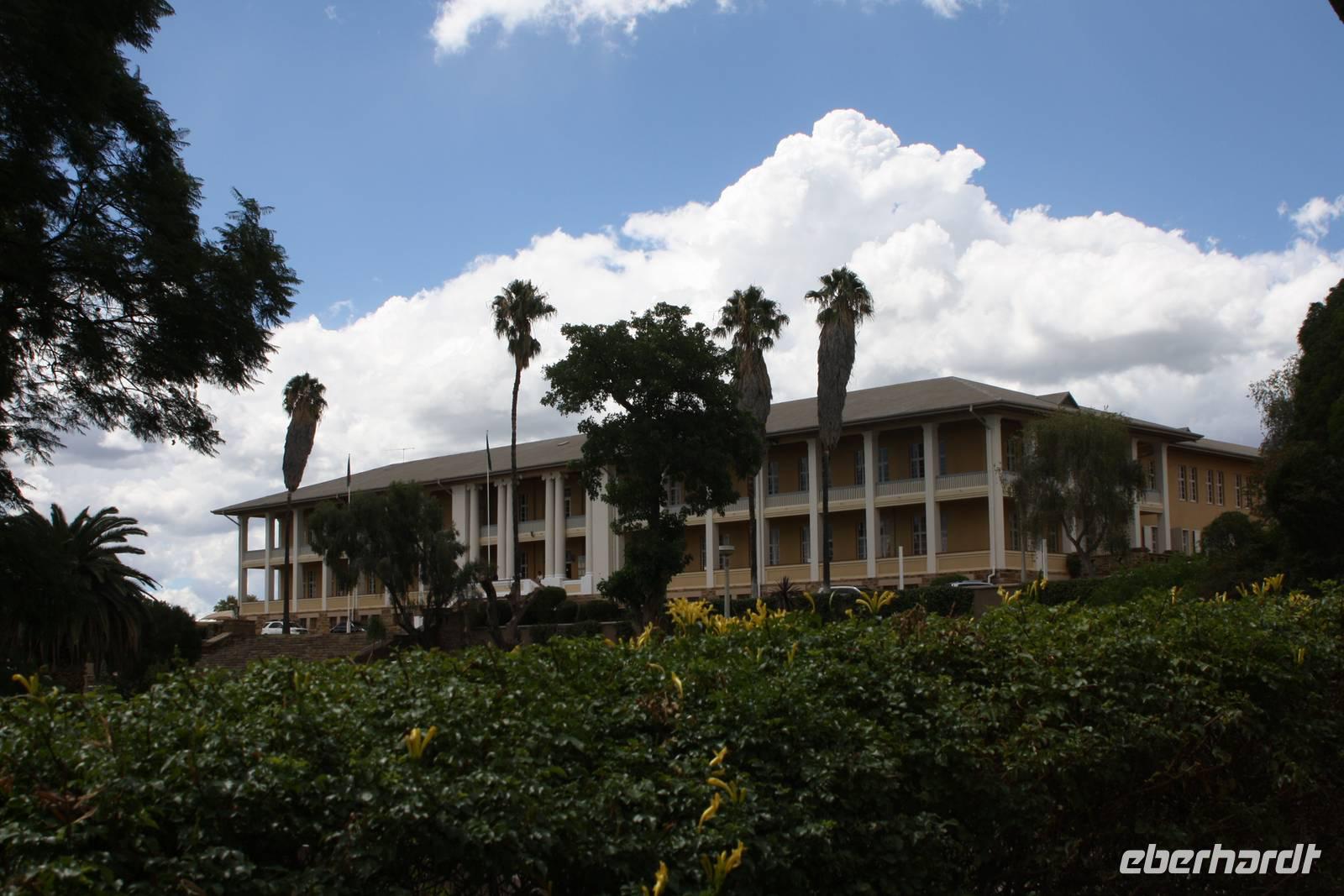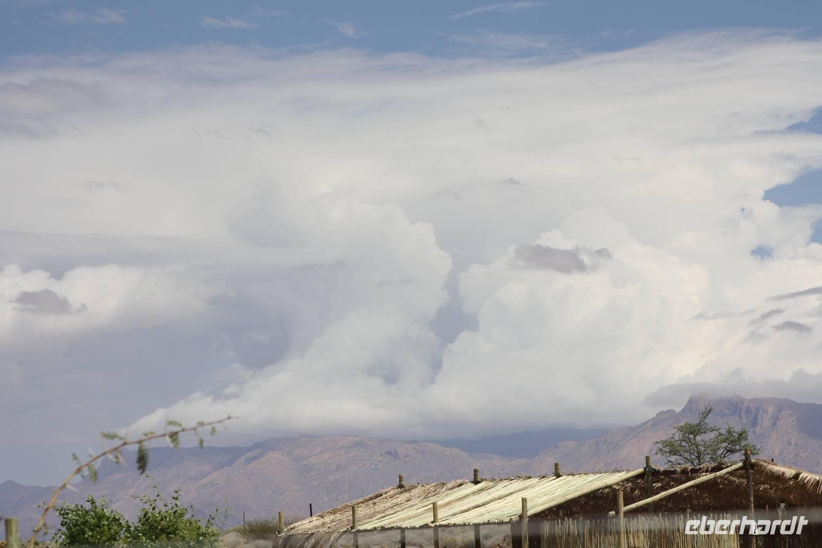 Ausgeschlafen treffen wir uns am nächsten Morgen wieder zum Frühstück. Mit wunderbarem Blick auf das vor uns liegende Windhoek genießen wir das leckere Buffet mit Schwarzbrot, Käse, Wurst, Obst und vielem mehr. Danach ziehen wir weiter. Mit gepacktem Bus halten wir noch einmal im Zentrum von Windhoek um Kleinigkeiten zu besorgen. Jonas fährt uns stadtauswärts, vorbei am mehr als imposanten Präsidenenpalast...einfach verrückt, wofür Geld ausgegeben wird, wo es an anderen Stellen dringender benötigt wird. Wir verlassen die Region von Windhoek auf der B1 und an uns vorbei zieht die unendliche Weite Namibas. Grüne Büsche, vereinzelte Häuser und ein wolkentoller Himmel begleiten uns. Nach einer Pause in Rehoboth geht es weiter nach Kalkrand und dort verlassen wir die asphaltierte Straße um auf der Schotterpiste weiter zu fahren. Hier sehen wir nun auch die ersten, großen Webervögelnester in den Bäumen und endliiiicchhhhhh: wir sehen die ersten Tiere. Auf der Strecke begegnene wir nun immer wieder Oryxen, Sträuße, Zebras, Impalas und Gnus. Kurz nach eins stoppen wir dann an einem Schattenbaum, packen Campingtisch und Stühle aus und genießen ein kleines Mittagspicknick mitten in der Pampa. Gut gestärkt beobachten wir weiter die Tiere. Schönstes Motiv des Tages für mich persönlich: grüner Buschstreife, dahinter roter Kalahari-Sand und darüber riesige weiße Wolken. Einfach einmalig.