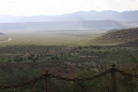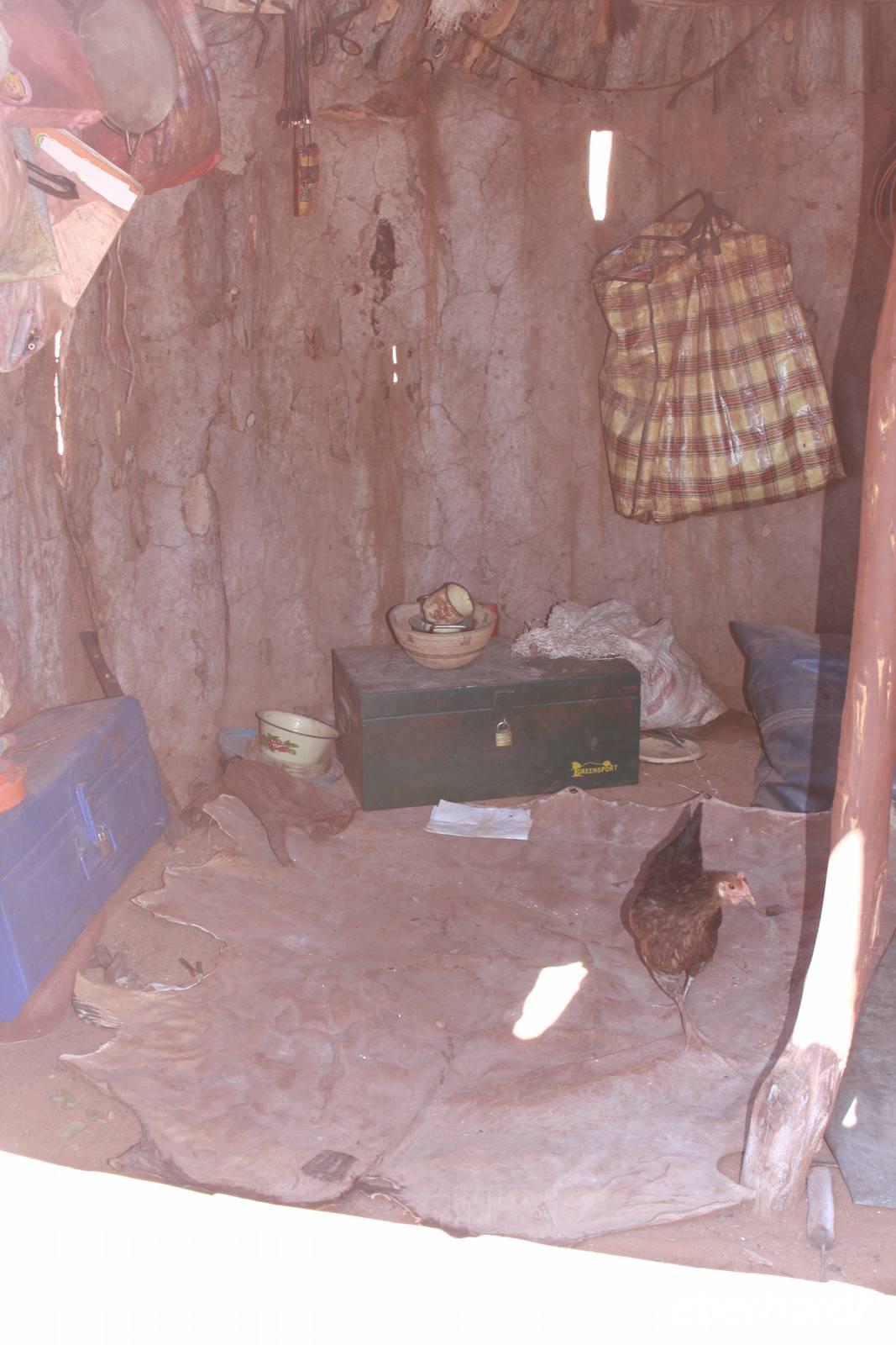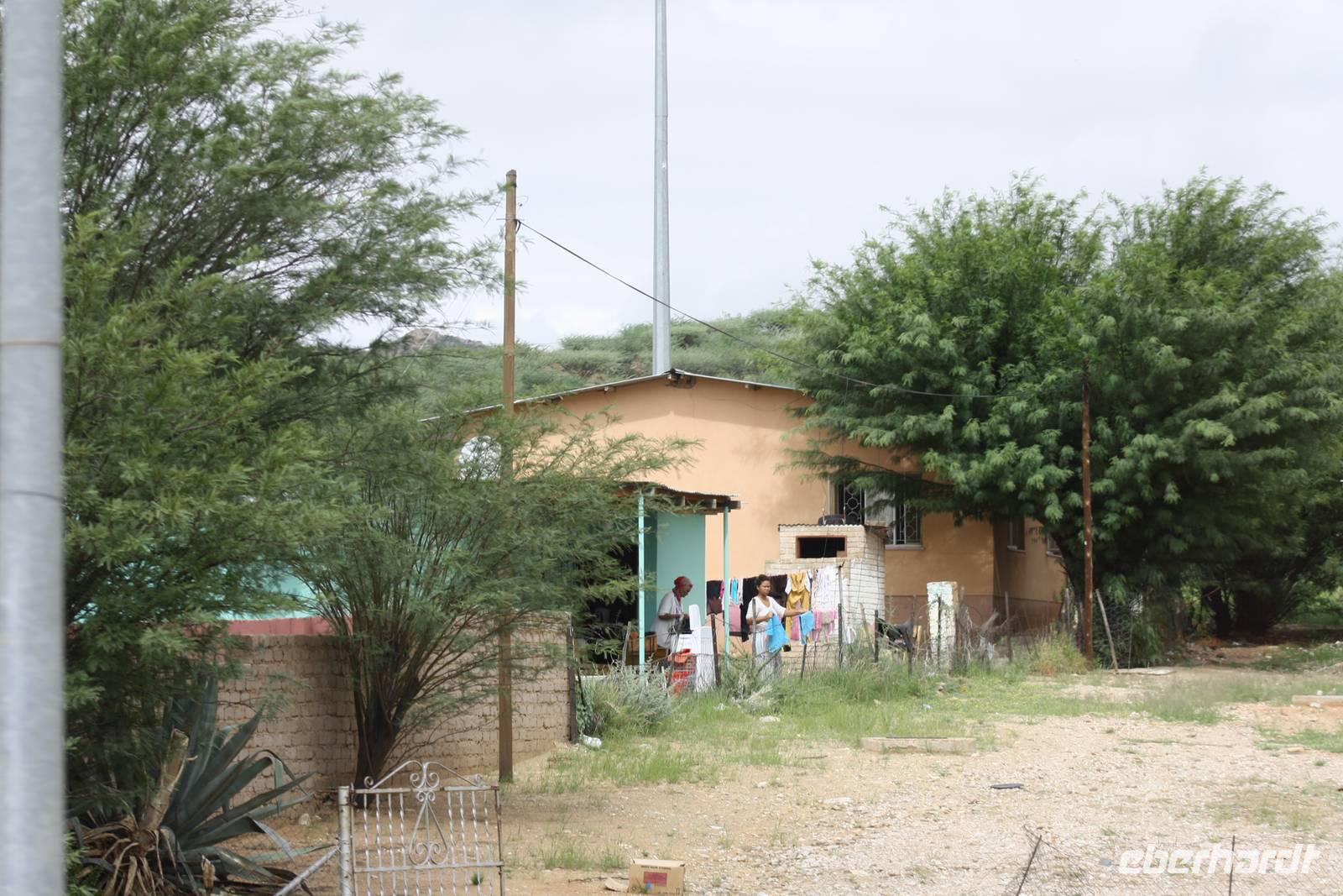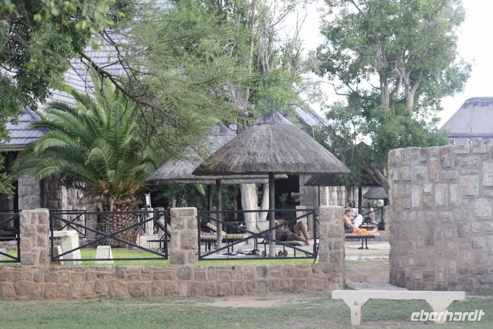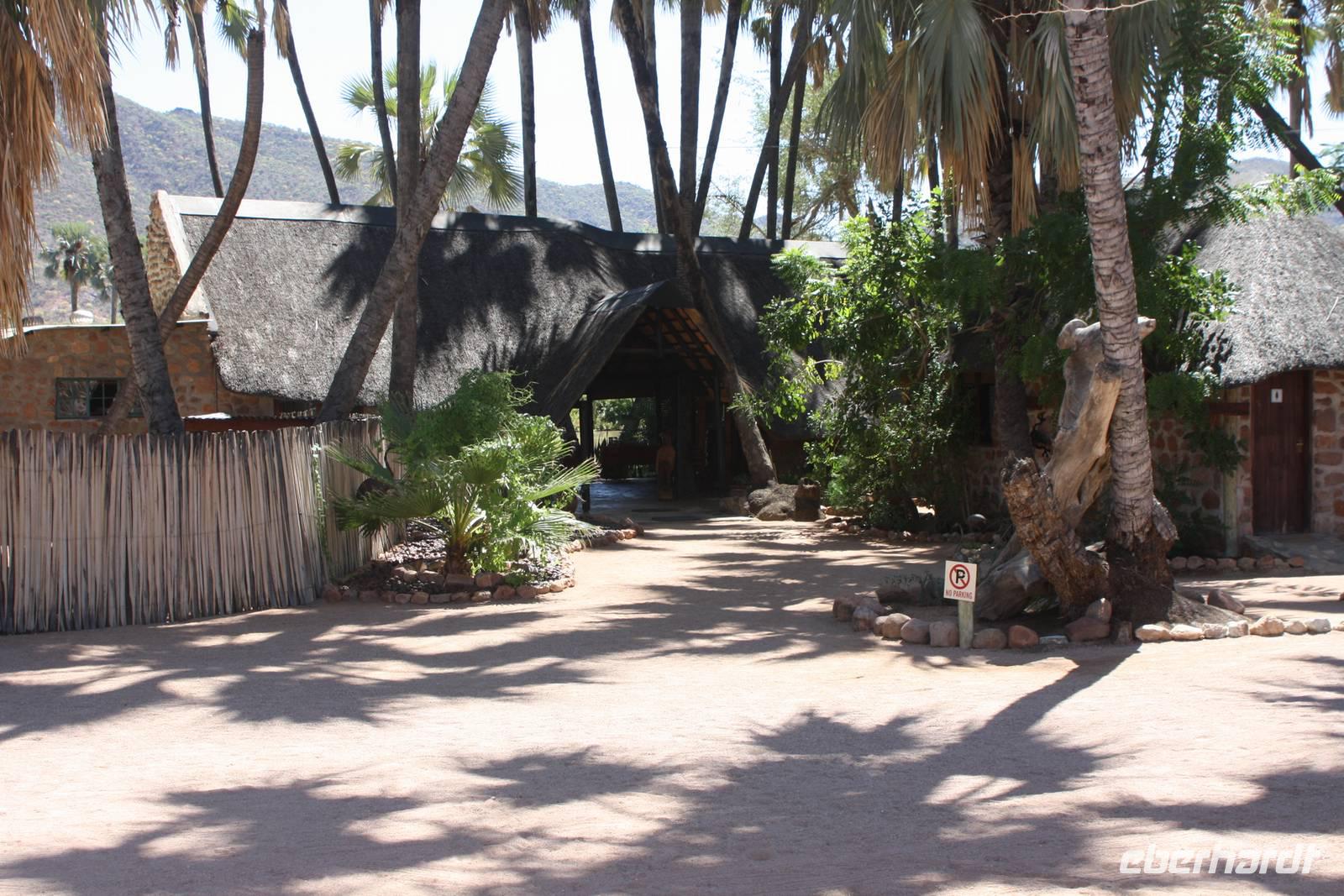 Jonas und ich beschließen, das unsere heutige Fahrt nach Opuwo nicht so zeitig beginnen muss. So haben wir vor bzw. nach dem Frühstück noch Zeit, uns die schöne Lodge im hellen anzuschauen oder nochmal in den schönen Pool zu steigen. Jedes Häusschen, in dem man hier übernachtet, je nach Hausart entweder eine oder zwei Familien, hat einen eigenen Vorgarten in dem Blumen wachsen und Gemüse angebaut wird. Dieses wird vor allem zur Selbstversorgung der Lodge genutzt. Um neun verlassen wir dann Khoriax auf Schotterpiste in Richtung Kamanjab. Hier machen wir Pause an einem Supermarkt und kaufen sowohl für den eigenen Bedarf als auch Gastgeschenke für die Himbas ein. Kurz müssen wir dann noch am Straßenrand warten, bis Ernst und Jonas Tankgeschäfte erledigt haben und wir beobachten derweil das afrikanische Leben am Straßenrand: sehr interessant: hier befindet sich der Friseur direkt gegenüber dem Schnellimbiss. Die Dame hier brät, scheinbar Kartoffeln in heißem Fett um es dann wahrscheinlich später zu verkaufen. Auch werde wir von einem Afrikaner angesprochen, der uns nett begrüßt und nach unserer Reiseroute fragt. Nachdem alle Geschäfte geregelt sind, geht die Fahrt weiter auf asphaltierter Straße immer westlich vorbei am Etosha-Nationalpark. Auch heute machen wir wieder Mittagspicknick. Dann erreichen wir Opuwo, die Hauptstadt des hiesigen Staates und oben auf dem Berg thront unsere Lodge. Vom Überlaufpool aus haben wir einen fantastischen Ausblick auf das Tal. Kellner servieren kalte Getränke. Unsere Zimmer haben jeder einen eigenen kleinen Balkon von dem man den herrlichen Sonnenuntergang aus beobachten kann. Was wollen wir eigentlich mehr?