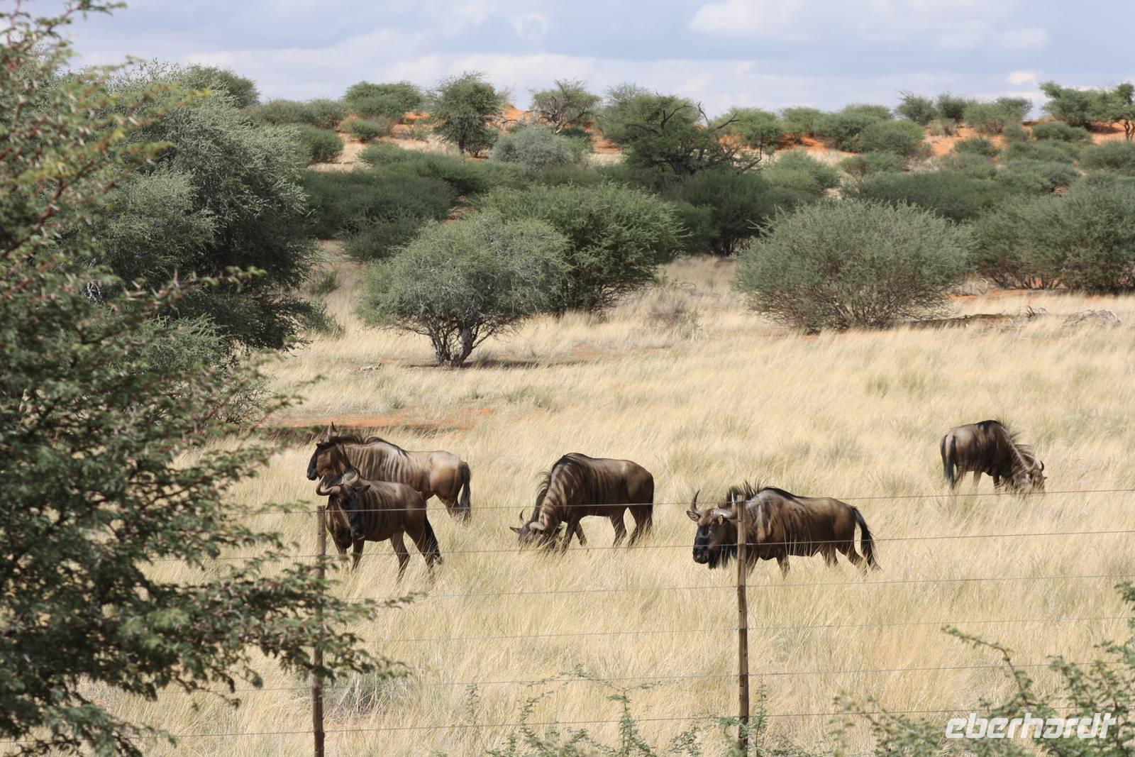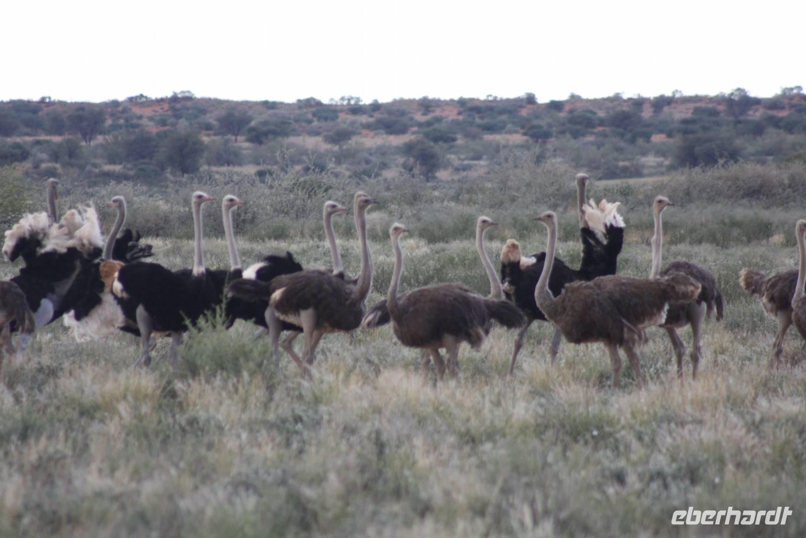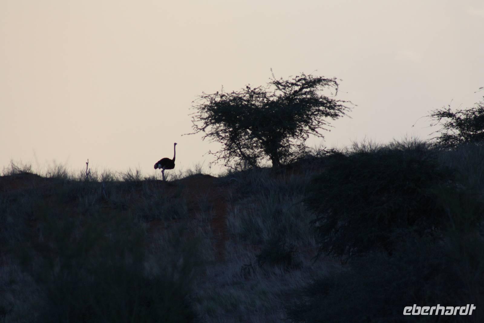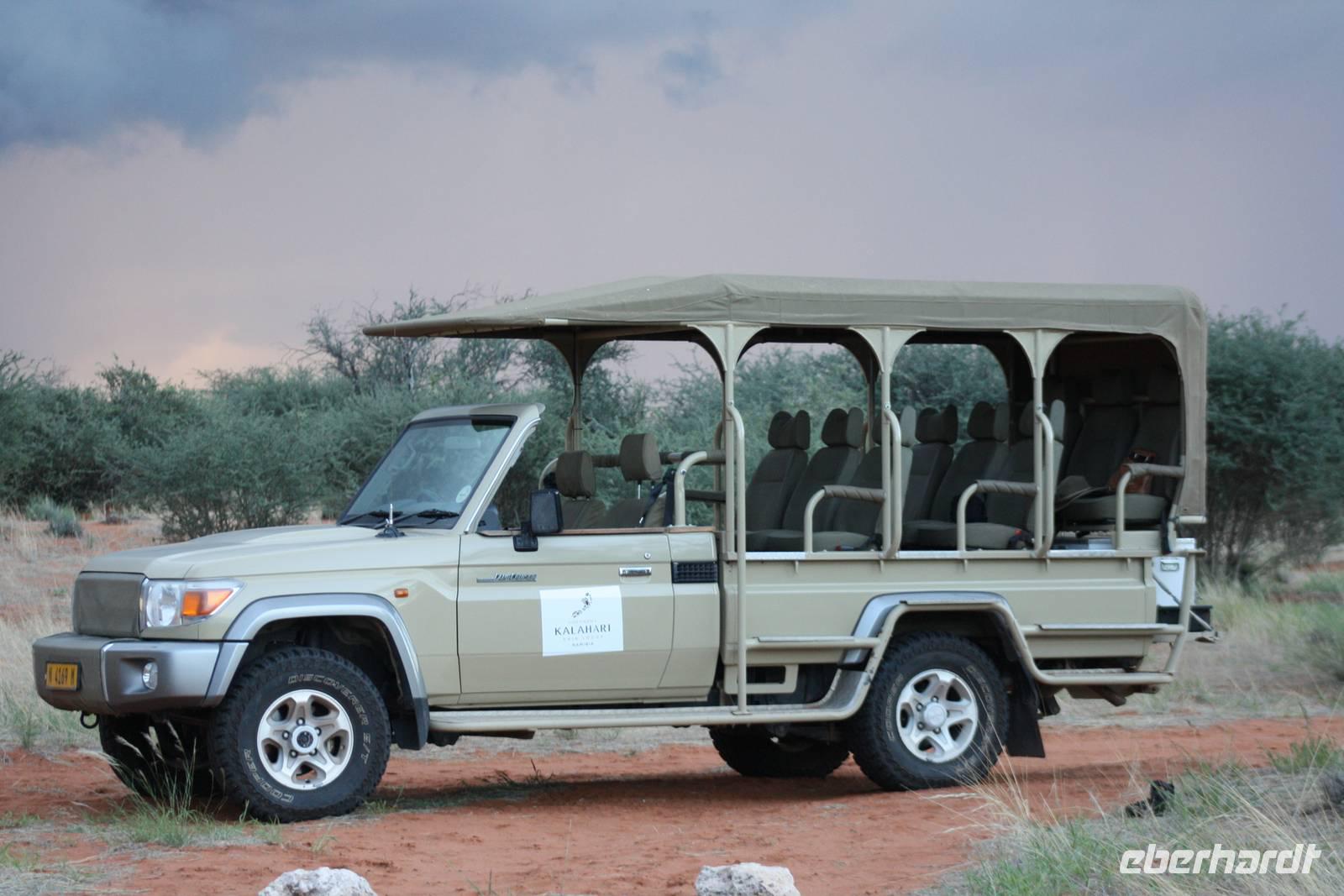 Angekommen in der Lodge erfrischen sich einige Gäste im kühlenden Pool bevor es weiter geht mit einer optionalen Pirschfahrt durch das Lodgegelände. Jimmy,unser Fahrer begrüßt uns und auch Ernst kommt mit. So sitzt nur unsere Gruppe in dem Jeep. Jimmy und Ernst ergänzen sich prima in ihren Ausführungen. Nur wenige Fahrtminuten von der Lodge entfernt begegnen uns die ersten Strauße und Gnus. Jimmy weiß ganz genau,wo er auf dem riesigen Geländer entlang fahren muss. Auch sehen wir immer wieder Gnus und Stauße aber auch Zebras kreuzen unseren Weg. Einen längeren Fotostopp legen wir an einem Baum ein, wo wir die Webervögel beobachten wie sie ihre riesigen Nester bauen. Langsam geht die Sonne unter und am Horizont sehen wir schon, wie es in der Ferne regnet. Der rote Sand der Kalahari, das Grün des Busches und die riesigen weißen Wolken erlauben uns das Zusehen an einem schönen Naturschauspiel. Es geht über die roten Dünen und ein kurzer Regenschauer erlaubt es Fräulein Gisberdt, sein gelbes Abendkleid anzuziehen;-). Einige Vogelarten sehen wir,bevor wir auf einer Düne halten und aus dem Jeep aussteigen. Jimmy führt uns zu einigen Straußeneiern, die wirklich sehr groß sind. Nach einer weiteren, kurzen Fahrt zu einer anderen Stelle auf der Düne halten wir erneut - diesmal zum Sundowner. Durch die Regenwolken zwar ohne sehbaren Sonnenuntergang aber wir haben trotzdem unseren Spaß bei Saft, Bier bzw. Gin Tonic. Ja, bei so manchem Glas möchte man bzw. frau schnell in Namibia eingebürgert werden, nicht Ulrike? Auf unserer Rückfahrt zur Lodge sehen wir noch einige Hasen und die vorderen Reihen im Jeep haben sogar Glück, einen Wolf zu entdecken. Als wir zur Lodge zurück kommen, erwartet uns bereits ein mehr als ausreichendes 4-Gang-Abendmenü mit Oryx Cordon Bleu und Apfelkuchen.Sehr schmackhaft und danach sind wir pappensatt. Da ist der erste Amarula der Reise in der Lodgebar eine wahre Wohltat.