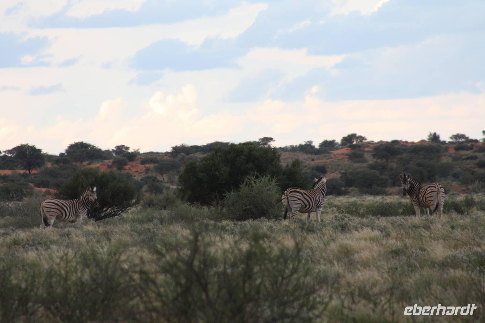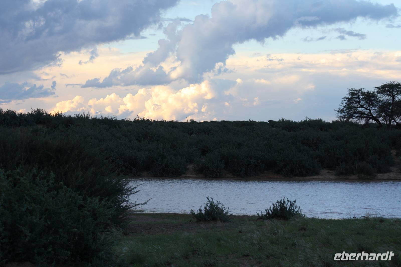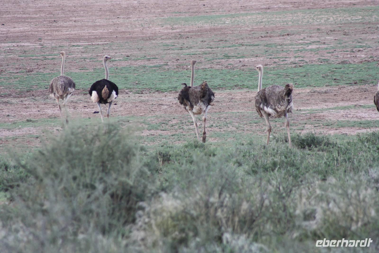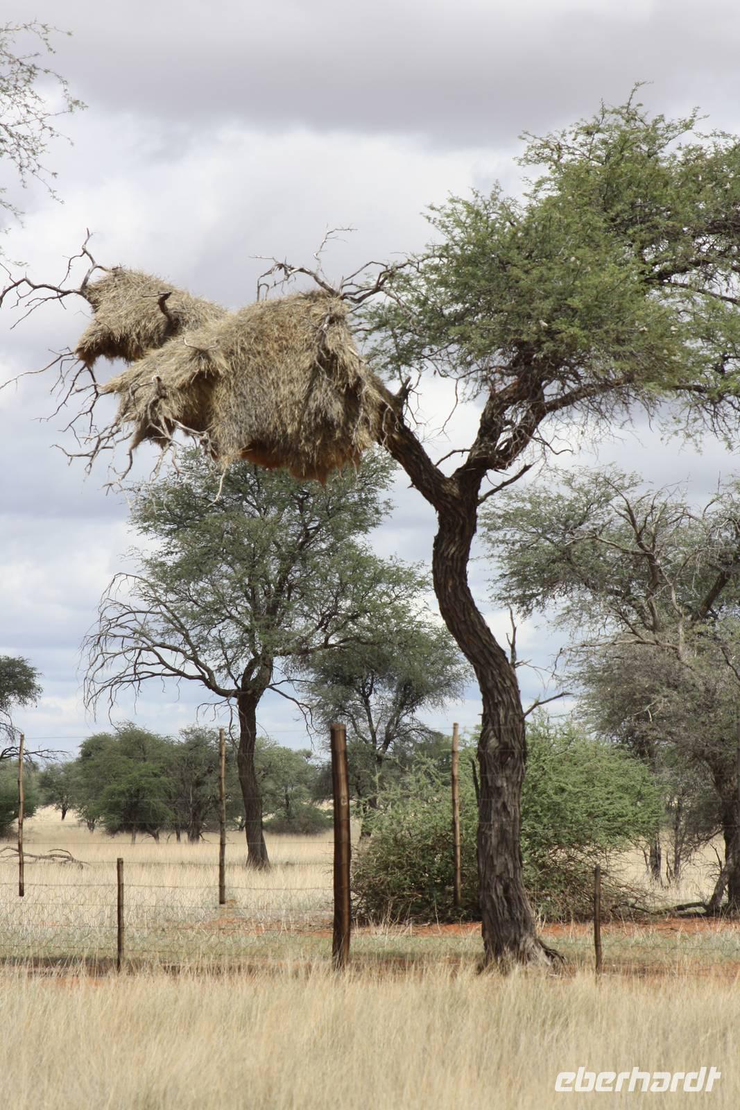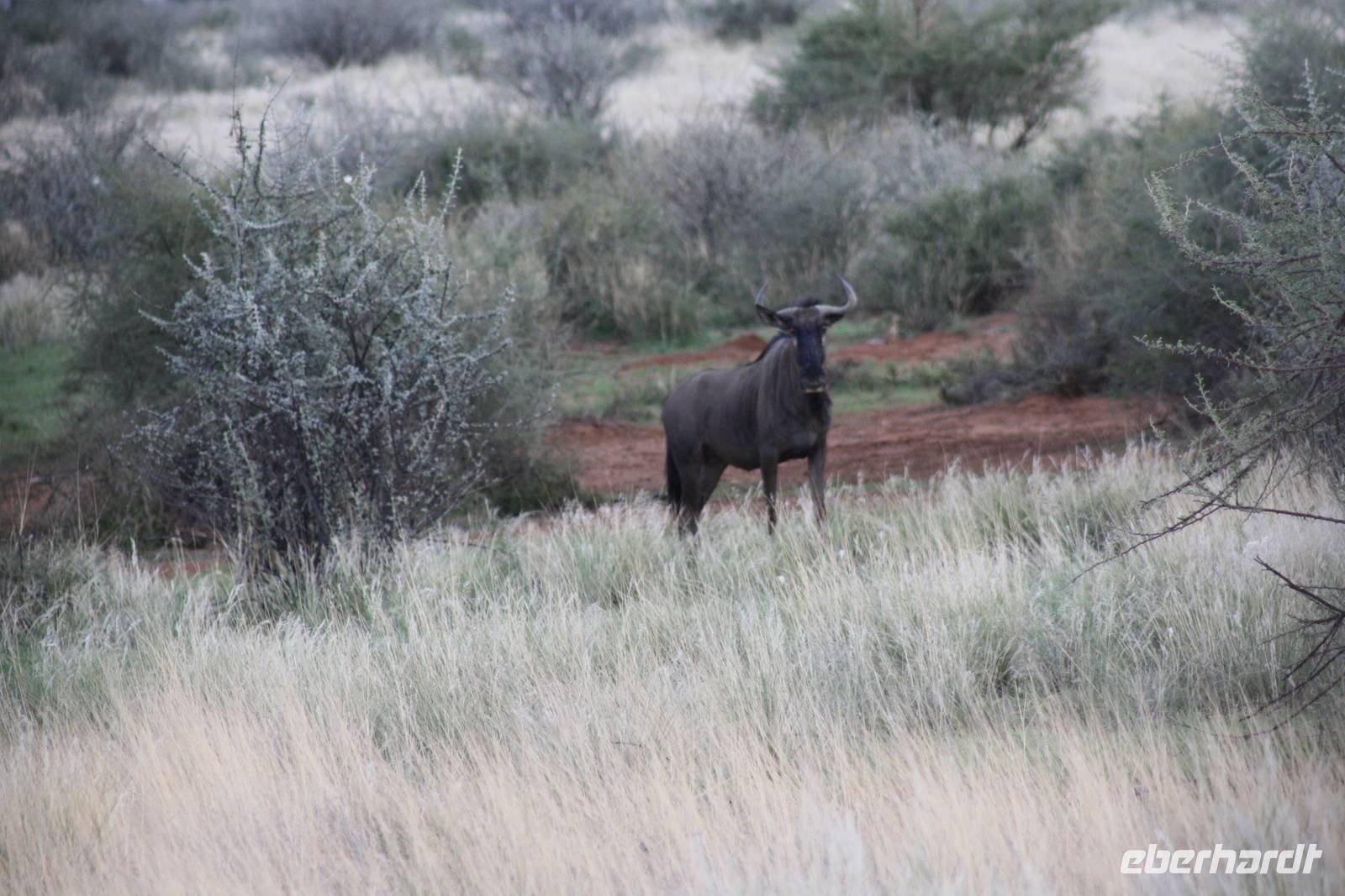 Angekommen in der Lodge erfrischen sich einige Gäste im kühlenden Pool bevor es weiter geht mit einer optionalen Pirschfahrt durch das Lodgegelände. Jimmy,unser Fahrer begrüßt uns und auch Ernst kommt mit. So sitzt nur unsere Gruppe in dem Jeep. Jimmy und Ernst ergänzen sich prima in ihren Ausführungen. Nur wenige Fahrtminuten von der Lodge entfernt begegnen uns die ersten Strauße und Gnus. Jimmy weiß ganz genau,wo er auf dem riesigen Geländer entlang fahren muss. Auch sehen wir immer wieder Gnus und Stauße aber auch Zebras kreuzen unseren Weg. Einen längeren Fotostopp legen wir an einem Baum ein, wo wir die Webervögel beobachten wie sie ihre riesigen Nester bauen. Langsam geht die Sonne unter und am Horizont sehen wir schon, wie es in der Ferne regnet. Der rote Sand der Kalahari, das Grün des Busches und die riesigen weißen Wolken erlauben uns das Zusehen an einem schönen Naturschauspiel. Es geht über die roten Dünen und ein kurzer Regenschauer erlaubt es Fräulein Gisberdt, sein gelbes Abendkleid anzuziehen;-). Einige Vogelarten sehen wir,bevor wir auf einer Düne halten und aus dem Jeep aussteigen. Jimmy führt uns zu einigen Straußeneiern, die wirklich sehr groß sind. Nach einer weiteren, kurzen Fahrt zu einer anderen Stelle auf der Düne halten wir erneut - diesmal zum Sundowner. Durch die Regenwolken zwar ohne sehbaren Sonnenuntergang aber wir haben trotzdem unseren Spaß bei Saft, Bier bzw. Gin Tonic. Ja, bei so manchem Glas möchte man bzw. frau schnell in Namibia eingebürgert werden, nicht Ulrike? Auf unserer Rückfahrt zur Lodge sehen wir noch einige Hasen und die vorderen Reihen im Jeep haben sogar Glück, einen Wolf zu entdecken. Als wir zur Lodge zurück kommen, erwartet uns bereits ein mehr als ausreichendes 4-Gang-Abendmenü mit Oryx Cordon Bleu und Apfelkuchen.Sehr schmackhaft und danach sind wir pappensatt. Da ist der erste Amarula der Reise in der Lodgebar eine wahre Wohltat.
