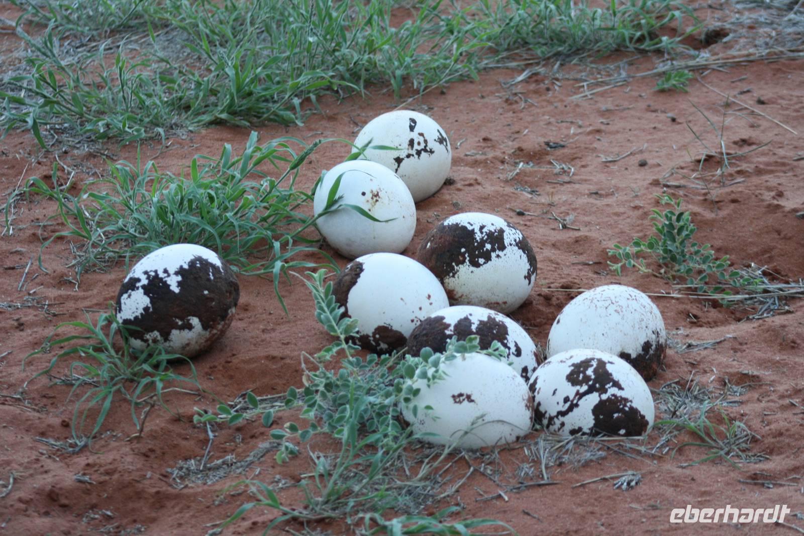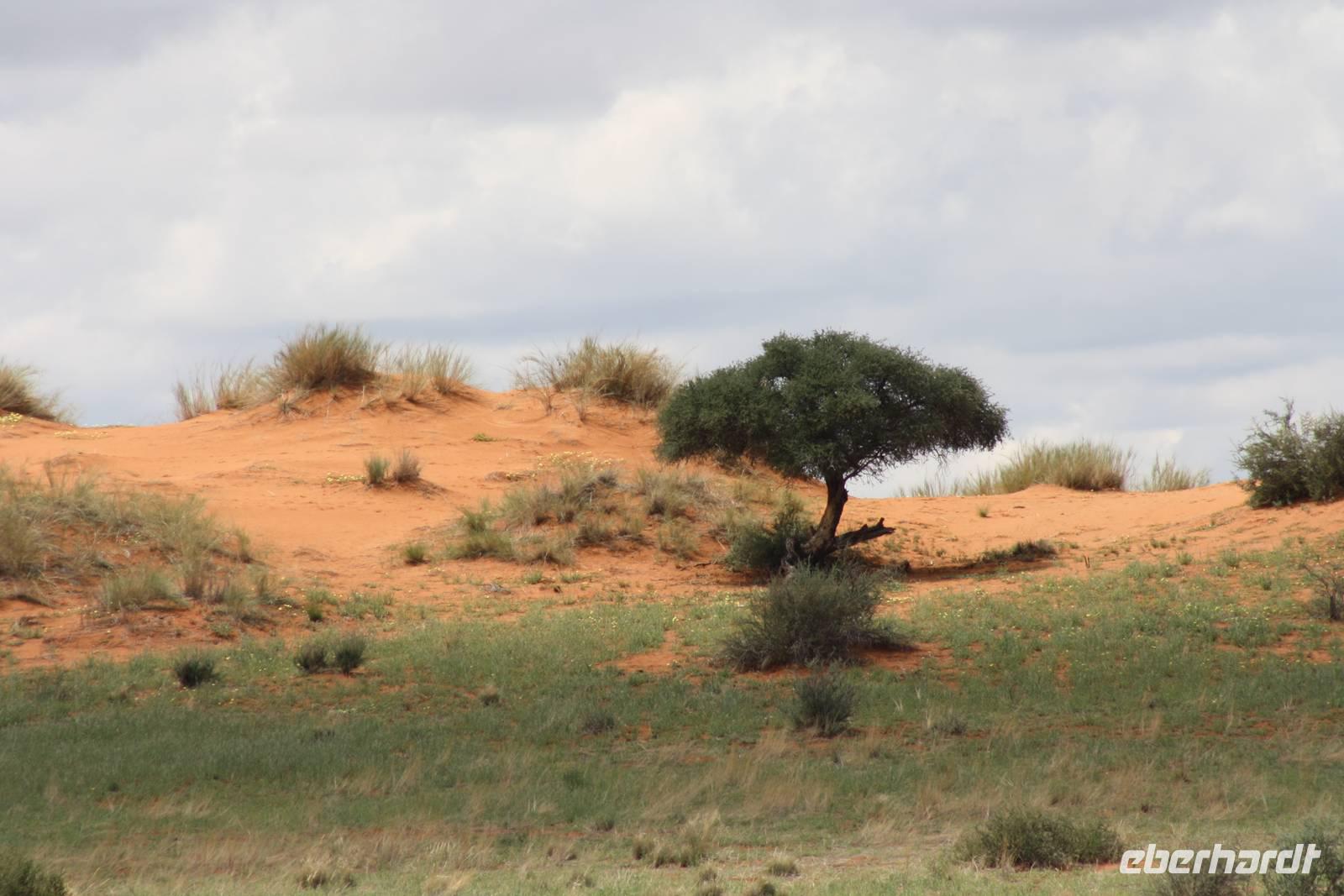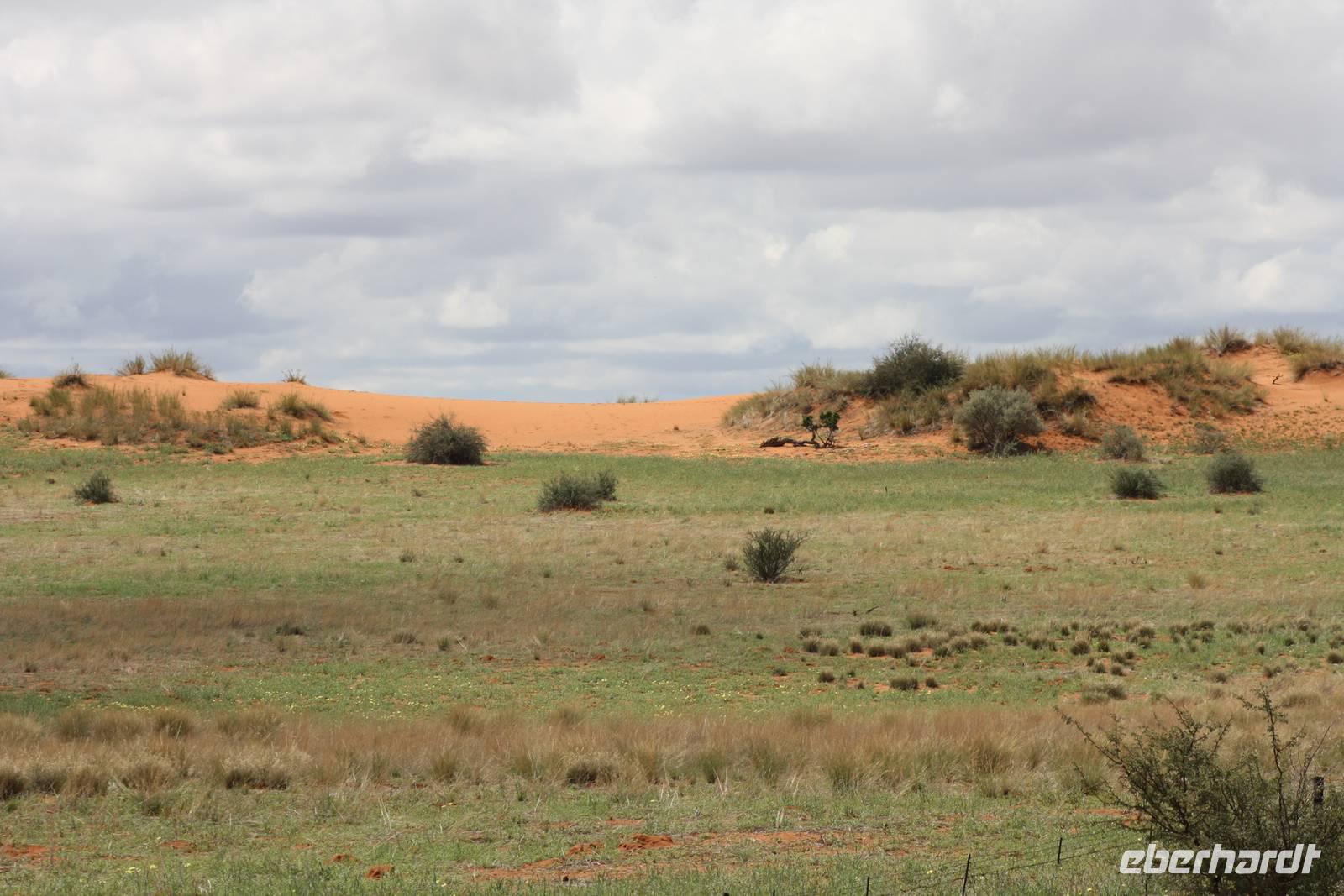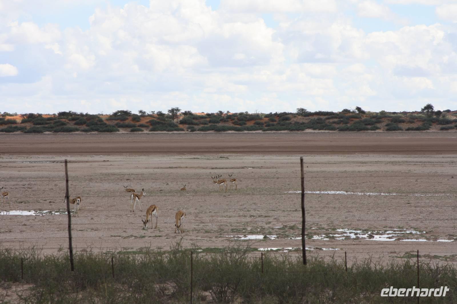 Angekommen in der Lodge erfrischen sich einige Gäste im kühlenden Pool bevor es weiter geht mit einer optionalen Pirschfahrt durch das Lodgegelände. Jimmy,unser Fahrer begrüßt uns und auch Ernst kommt mit. So sitzt nur unsere Gruppe in dem Jeep. Jimmy und Ernst ergänzen sich prima in ihren Ausführungen. Nur wenige Fahrtminuten von der Lodge entfernt begegnen uns die ersten Strauße und Gnus. Jimmy weiß ganz genau,wo er auf dem riesigen Geländer entlang fahren muss. Auch sehen wir immer wieder Gnus und Stauße aber auch Zebras kreuzen unseren Weg. Einen längeren Fotostopp legen wir an einem Baum ein, wo wir die Webervögel beobachten wie sie ihre riesigen Nester bauen. Langsam geht die Sonne unter und am Horizont sehen wir schon, wie es in der Ferne regnet. Der rote Sand der Kalahari, das Grün des Busches und die riesigen weißen Wolken erlauben uns das Zusehen an einem schönen Naturschauspiel. Es geht über die roten Dünen und ein kurzer Regenschauer erlaubt es Fräulein Gisberdt, sein gelbes Abendkleid anzuziehen;-). Einige Vogelarten sehen wir,bevor wir auf einer Düne halten und aus dem Jeep aussteigen. Jimmy führt uns zu einigen Straußeneiern, die wirklich sehr groß sind. Nach einer weiteren, kurzen Fahrt zu einer anderen Stelle auf der Düne halten wir erneut - diesmal zum Sundowner. Durch die Regenwolken zwar ohne sehbaren Sonnenuntergang aber wir haben trotzdem unseren Spaß bei Saft, Bier bzw. Gin Tonic. Ja, bei so manchem Glas möchte man bzw. frau schnell in Namibia eingebürgert werden, nicht Ulrike? Auf unserer Rückfahrt zur Lodge sehen wir noch einige Hasen und die vorderen Reihen im Jeep haben sogar Glück, einen Wolf zu entdecken. Als wir zur Lodge zurück kommen, erwartet uns bereits ein mehr als ausreichendes 4-Gang-Abendmenü mit Oryx Cordon Bleu und Apfelkuchen.Sehr schmackhaft und danach sind wir pappensatt. Da ist der erste Amarula der Reise in der Lodgebar eine wahre Wohltat.