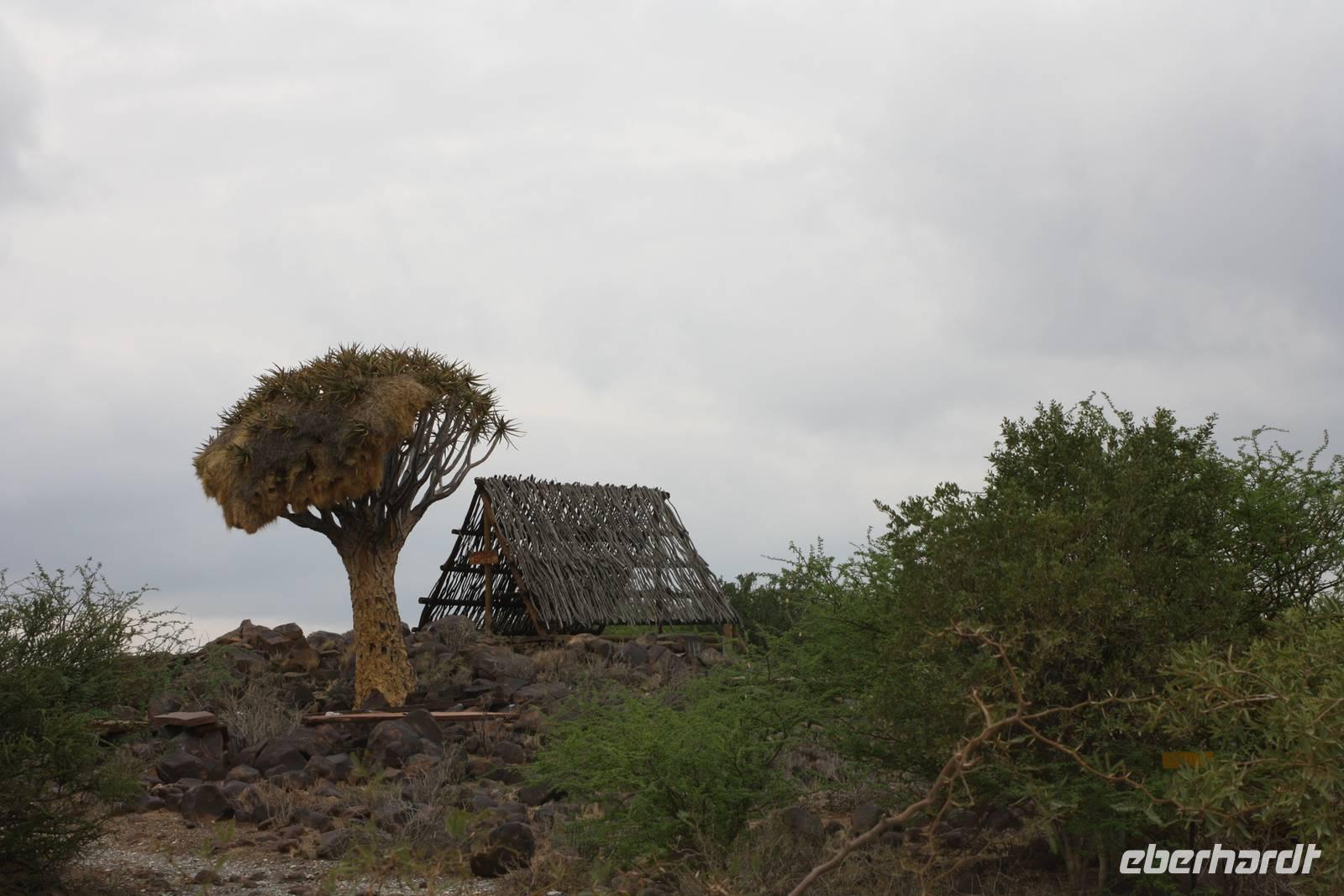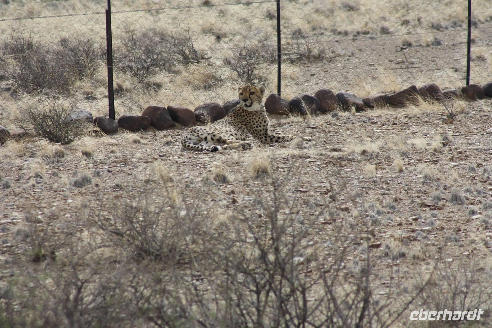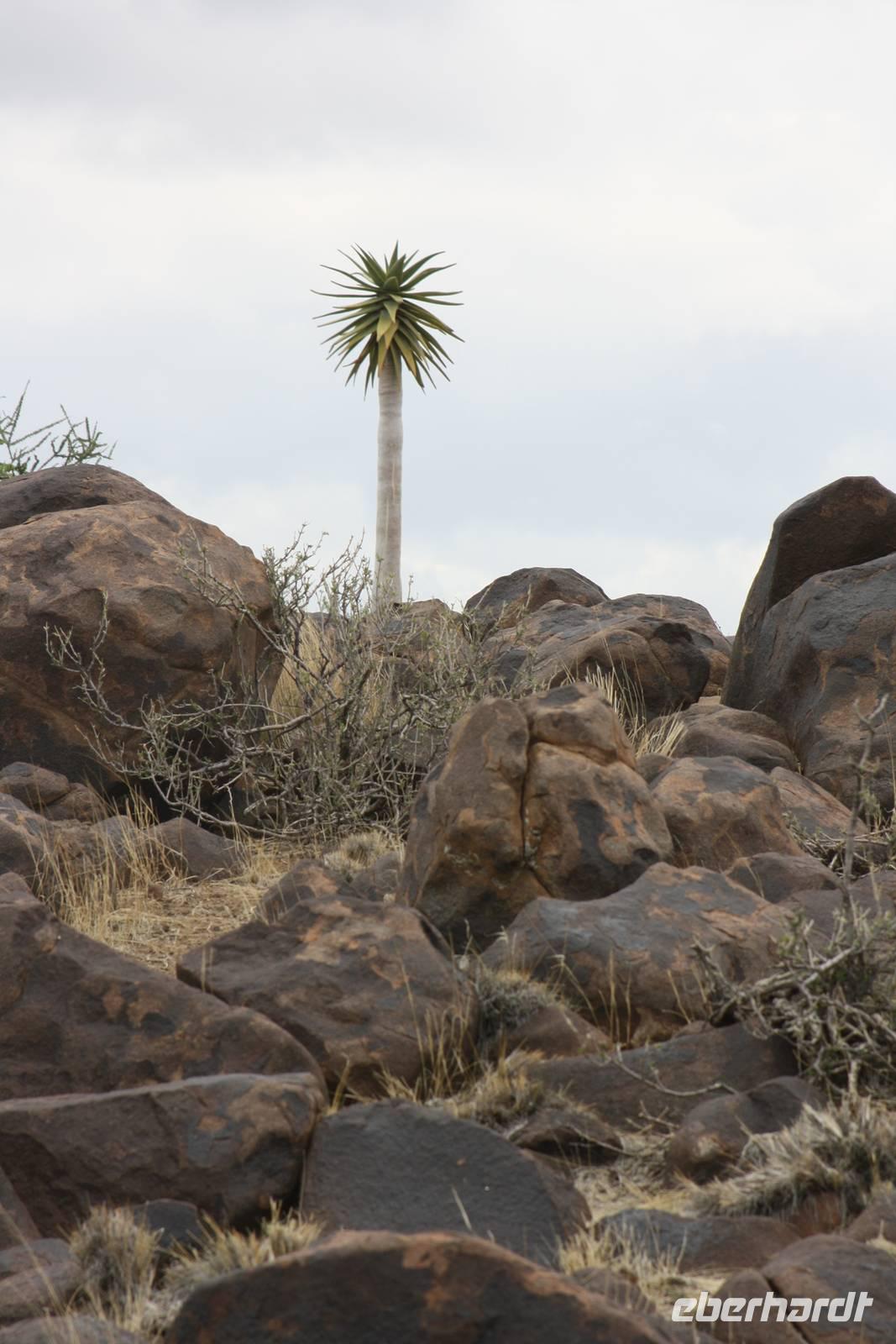 Ein neuer Tag in Afrika, der uns leider mit Regen begrüßt. Die Einheimischen freut es sehr, da sie diesen Regen schon sehr lange vermissen. Erstes Highlight des Tages: wir sehen zwei Eulen in den Blättern der Palmen ruhen. Sie sind ganz schön groß und nach Anmerkung des einen oder anderen Gastes haben sie in der vergangenen Nacht Radau gemacht. Nun sind sie ganz ruhig und lassen sich fotografieren. Nach dem Frühstück geht es weiter auf der B1 in Richtung Mariental. Ernst möchte mit uns zunächst zum Hardap-Stausee, dem zweitgrößten Namibias aber aus organisatorischen Gründen kommen wir nicht herein. Weiter gehts entlang der Dirtroad vorbei an Maisfeldern. Dann wird der Weg durch den Regen aber so sumpfig, das Jonas sich für die Rückfahrt entscheidet.Über die asphaltierte Straße erreichen wir nach rund anderthalb Stunden Mariental. Hier haben wir Zeit im Supermarkt für das Mittagspicknick einzukaufen und den Tank unseres Safaritrucks aufzufüllen. Es geht weiter Richtung Keetmanshop. Die unendliche Steppe begleitet uns links und rechts der Straße. Immer wieder mal kämpft sich die Sonne durch die regenverhangenen Wolken. Circa fünfzig Kilometer vor Keetmanshop kommen die ersten Köcherbäume in unser Blickfeld. Die Sonne hat ihren Kampf gewonnen und wir erreichen den Quiver Tree Forest. Auf dem Privatgelände spaziert meine Gruppe entlang der Köcherbäume während Ernst und ich das Mittagspicknick vorbereiten. Nach der Stärkung spazieren wir noch ein Stück entlang der Köcherbäume und Ernst erzählt uns interessante Details dazu. Danach hält er noch eine kleine Überraschung für uns bereit: der er die Chefin des privaten Farmgeländes kennt, dürfen wir in ein abgegrenztes Gehege fahren, in dem zwei Geparden leben. Obwohl wir zur Mittagszeit dort sind, haben wir das Glück, die zwei Katzen zu sehen, die sich in der prallen Sonne aalen. Ernst ist sogar so verrückt, rauszugehen und sich auf die Erde zu legen, um die Aufmerksamkeit der Katzen zu erregen. Vielen Dank nochmal dafür.Unser nächster Stopp ist am Spielplatz der Gigangen,dem Giants Playground. Verschiedenartigste Gesteinsformungen aus Magmagestein erwarten uns hier, und lassen sich auf unserem Rundgang fotografieren. Schließlich treten wir die Weiterfahrt Richtung Keetmanshop an. Während Ernst mal wieder im Supermarkt shoppt, sind wir an der Felsenkirche zum Fotografieren.Natürlich haben wir vorab auch das Kaiserliche Postamt in der Stadt auf Bild festgehalten. Unser Abend klingt in der Maritz-Lodge aus, die etwas außerhalb von Keetmanshop liegt.