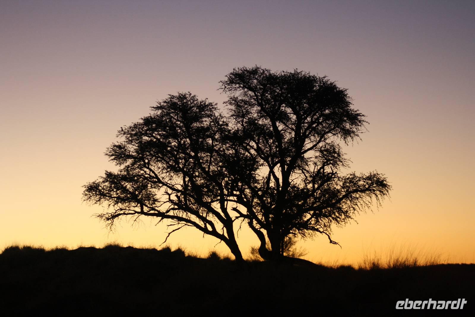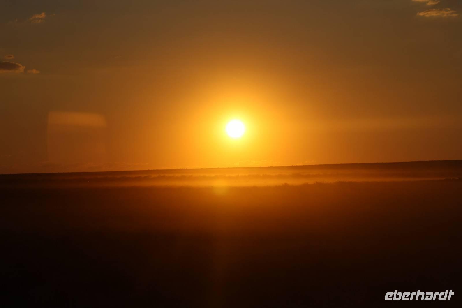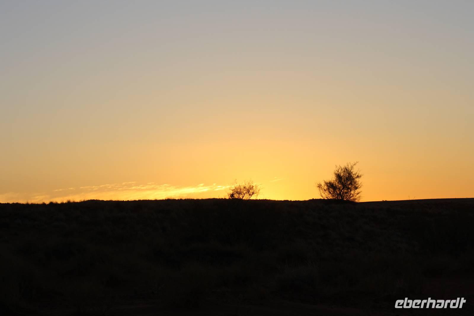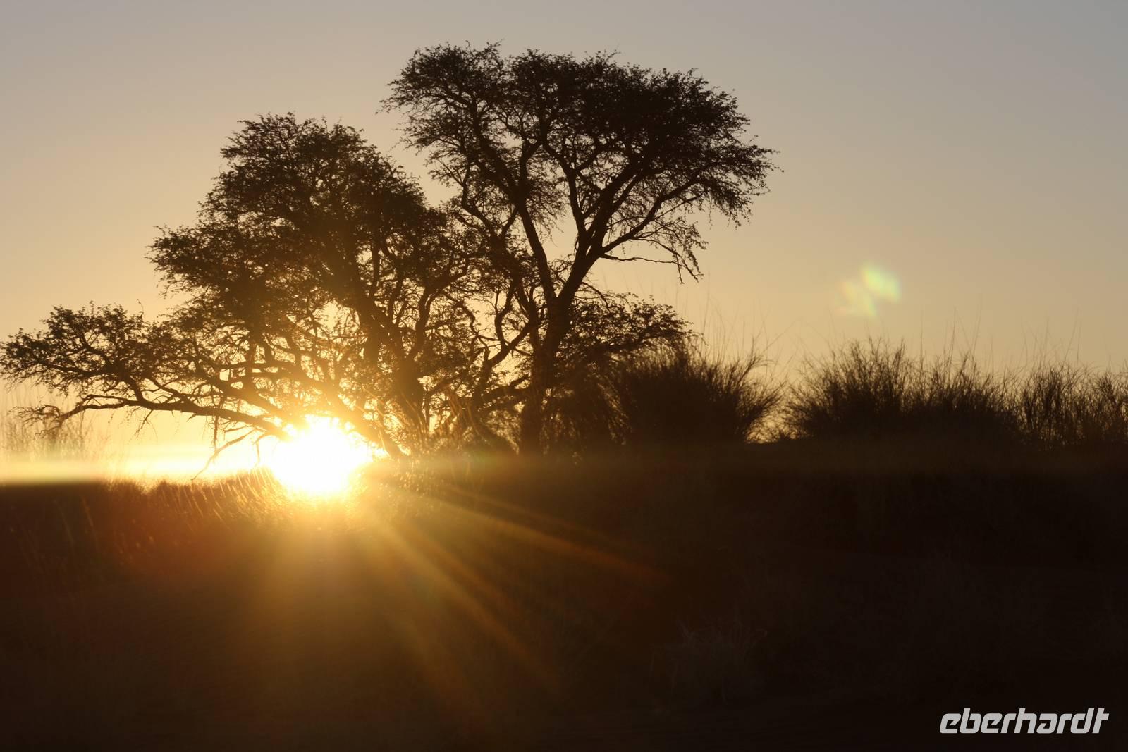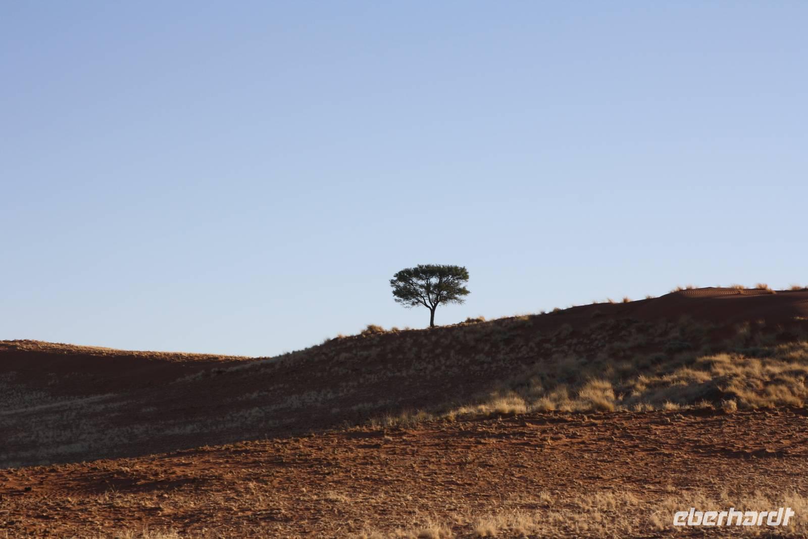 Ernst meint es heute nicht sehr gut mit uns, den wir treffen uns bereits um fünf Uhr morgens zum gemeinsamen Frühstück im Restaurant. Dann sattelt Jonas den Bus und wir fahren los, wieder durch den Namib-Naukluft-Nationalpark um heute die großen roten Dünen zu bewundern. Nach rund einer Stunde Fahrt erreichen wir den Eingang. Links und rechts erheben sich nun die roten wunderschönen Dünen. Die Sonne geht langsam auf und färbt den rötlichen Sand in ein wunderschönes organge. An der bekannten Dünne 45 halten wir für einen Fotostopp. Bereits mehrere Busse und Jeeps sind hier und so einigen wir uns drauf, das wir eine andere Düne besteigen, um den Massentourismus zu umgehen. Nach einiger Zeit hält Jonas auf einem Parkplatz an und wir steigen um in einen Jeep. Nach wiederum zehn Minuten Fahrt steigen wir aus und laufen in Richtung Düne Big Daddy. Schnell ziehen wir uns die Schuhe aus, da sich es so bequemer auf dem Sand laufen lässt. Nun erklimmen auch wir die Düne. Immer weiter hoch hinaus geht es. Um uns herum ein orangfarbenes Meer und zwischen unseren Zehen rieselt der Sand. Einfach magisch und einmalig. Von hier oben auf der Düne aus haben wir einen wunderbaren Blick auf das Deathvlei. Hier verweilen wir, setzen uns in den Sand, essen unsere Brote und genießen einfach die Ruhe und Zeit, die wir hier verbringen dürfen. Als es an der Zeit ist, zum Jeep zurück zu kehren, ¨surfen¨ wir im Sand den steilen Abhang hinab, was für ein Spaß. Unser Spaziergang durch das Deathvlei, eine Oase voll abgestorbener Bäume die trotzdem ein wunderschönes Fotomotiv abgeben, führt uns zum Jeepparkplatz zurück. Von hier aus fahren wir noch zum bekannten Soussesvlei um Fotos zu schießen zu können und dann geht es zurück zu Jonas. Wir halten nochmal an der Lodge am Eingang zum Nationalpark für einen kurzen Stopp und finden uns kurz darauf am Sesriem Canyon. Einige Gäste unternehmen hier den Abstieg in den Canyon, wir anderen warten oben im Bus. Sie erzählen uns später, das es schön und angenehm kühl war - es hat sich also wirklich gelohnt. Nach einer kurzen Tank- und Eispause, in der Miss Mövenpick die Gruppe gut unterhält;-) fahren wir zurück zu unserer Lodge. Hier kann jeder die Mittagspause nach eigenem Vergnügen verbringen: einige genießen das kühle Nass des Pools, andere schlafen oder sitzen beisammen auf der eigenen Terrasse und trinken Kaffee (sofern die Milch auch in den Kaffee möchte;-)). Am späteren Nachmittag treffen wir uns an der Rezeption zur gemeinsamen Sundowner-Tour, deren Schwerpunkt heute mehr auf Natur als auf Tiere liegt. Aber auch dieser Naturpark ist wunderschön und wir genießen die Eindrücke. Bei Gin Tonic und kleinen Snacks sehen wir dann den roten Feuerball am Horizont verschwinden.