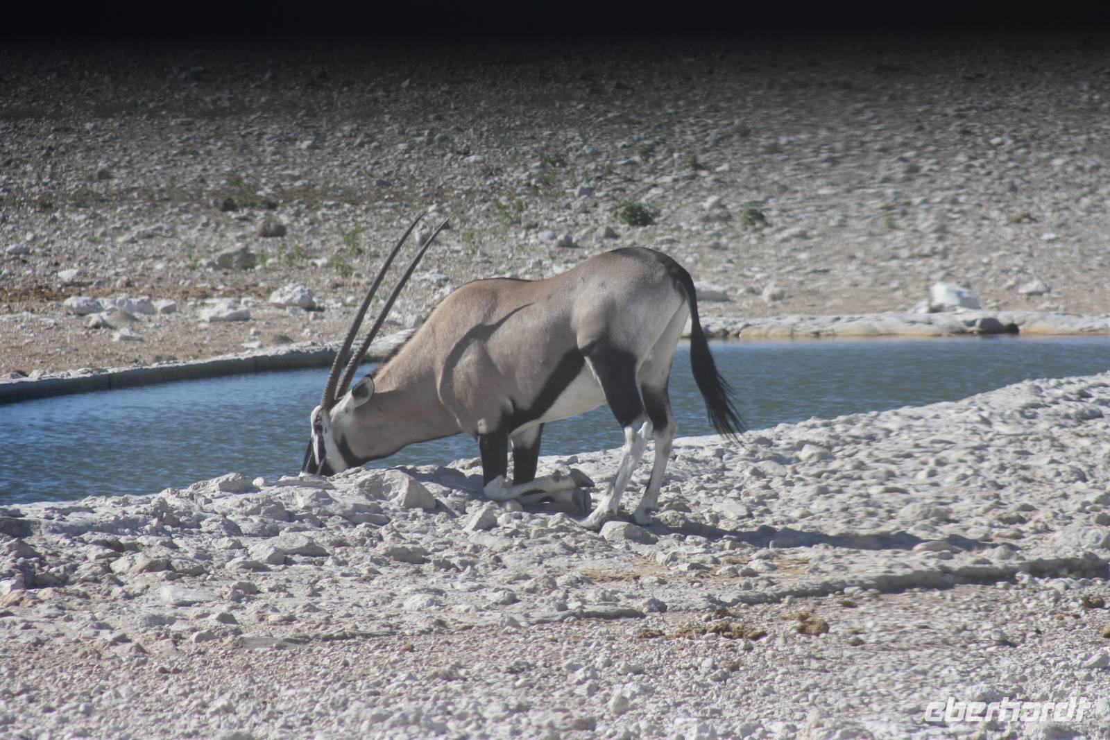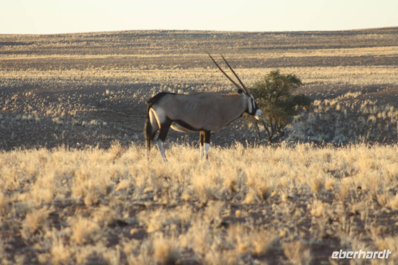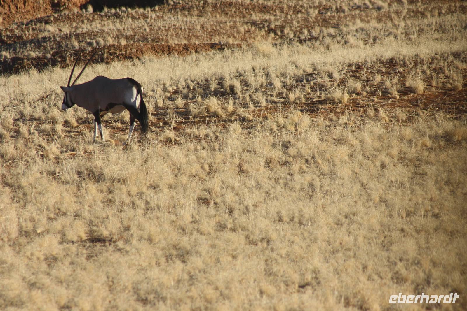 Wir fahren gemeinsam mit Jonas und Ernst um sechs Uhr morgens los an die Stelle, wo wir am Vorabend die Löwen gesehen haben und hoffen auf ein erneutes Wunder. Ja, das erleben wir auch. Aber nicht im Sinne von Löwen, sondern das selbst von dem Zebra nichts mehr da ist. Rein gar nix...nada, niente...wir können es gar nicht glauben. Also fahren wir zurück zur Lodge, um unsere Koffer zu verladen und um zu frühstücken. Danach geht es weiter Richtung Osten zu einem Fort. Unterwegs entdecken wir wieder verschiedene Raubvögel, Steinböcke, Oryxe und Gnus. Ein Bild, das langsam zur Gewohnheit wird. Wo bleibt der Leopard? Selbst nach unserem Mittagspicknick, als wir nochmal einige Wasserlöcher im Norden ansteuern, bekommen wir keine neuen Tiere vor die Fotoapperate. Allerdings freuen wir uns trotzdem über das was wir sehen. Ernst meint, für die Jahreszeit haben wir erschaunlich viele Tiere gesehen und darüber freuen wir uns auch so sehr. Am Abend erreichen wir schließlich die Uris Lodge auf einem alten Minengelände....unsere vorletzte Lodge auf dieser Reise.