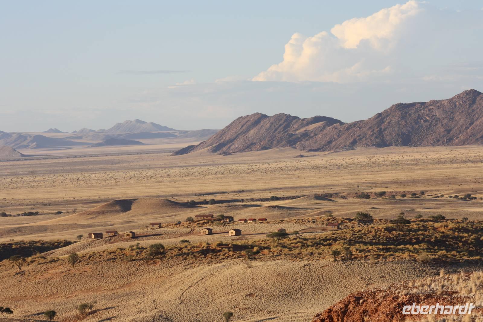 Heute liegt ein langer Fahrtag vor uns. Obwohl wir eine dreiviertel Stunde länger schlafen dürfen, ist die Abfahrt bereits eine viertel Stunde eher als in den letzten Tagen. Wie das funktioniert? Ganz einfach, in Namibia hat die zeitliche Winterzeit begonnen und so haben wir die Uhren eine Stunde zurück gestellt. Nichtsdestotrotz liegen heute rund 500 Fahrtkilometer vor uns. Gebannt sehen wir am Fenster die Weite an uns vorbei ziehen. Die Sonne drückt uns aber auch immer mehr ihre Hitze aufs Gemüt. Nachdem wir Lüderitz verlassen haben erreichen wir kurz vor Aus nochmal das Gebiet der Wild Horses und heute haben wir auch mehr Glück: wir sehen mehrere Wildpferde, die auf die Wasserstelle zugelaufen kommen um sich am Wasser zu stärken. Aber auch ein Oryx verspürt Durst bei der heutigen Hitze und so können wir ein wunderbares Tier-Stelldichein beobachten. Danach geht es weiter über das Betty Camp in Richtung Namib Naukluft Nationalpark. Trotz der Weite verändert sich die Landschaft trotdem immer wieder. Mal Gebirge, mal mehr Grün dann wieder endlose Wüste....und zwischendurch immer wieder Oryxe. Aber auch Schafe, die unser Farmerboy Ernst extra für uns zum Fotografieren in die Nähe des Busses treibt. Am Betty Camp legen wir eine Mittagspause ein, die wir wieder zum Picknicken nutzen. Auch den amerikanischen Fahrradfahrer, den wir unterwegs aufgenommen haben, nutzt die Gunst der Stunde hier und schlägt sein Zelt auf. Danach geht die lange Fahrt weiter. Die Naukluft-Berge erheben sich stolz und kündigen an, das unser Ziel endlich in greifbare Nähe kommt. Kurz vor Ankunft läuft uns noch ein Warzenschwein vor die Fotolinse und ein Gnu lässt sich ganz leicht direkt vor unserem Bus von uns fotografieren. Endlich erreichen wir die Namib Dessert Lodge. Im Hauptgebäude werden wir bereits mit einem Willkommensgruß erwarte. Die Zimmerschlüssel werden verteilt. Wir wohnen alle in Steinbungalows...immer zwei Familie zusammen. Jeder hat eine eigene Terrasse mit Blick auf die Berge. Wer möchte, kann sich jetzt noch in einem der zwei Pools erfrischen bevor wir uns zum köstlichen Abendessen auf der Terrasse wiedertreffen.