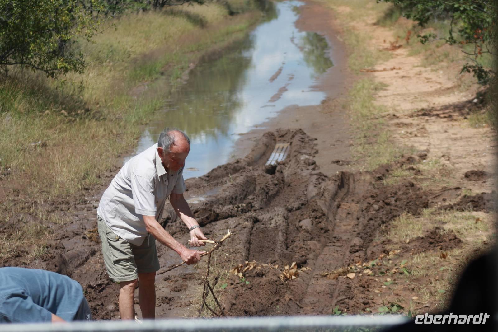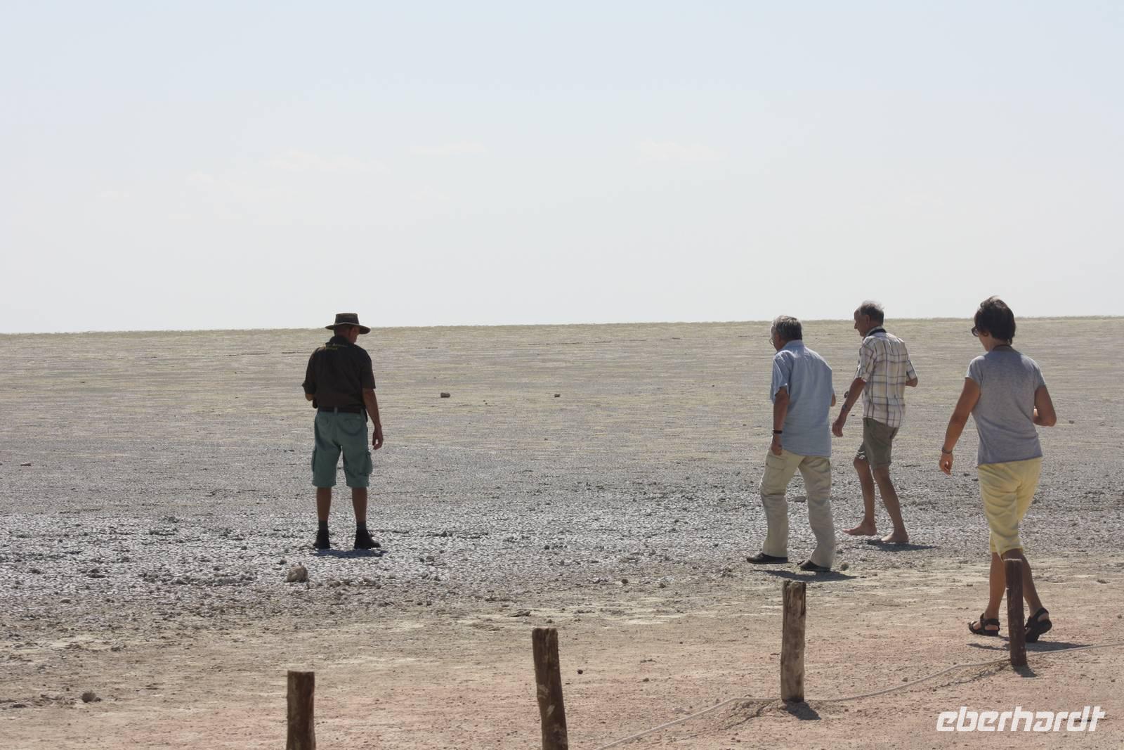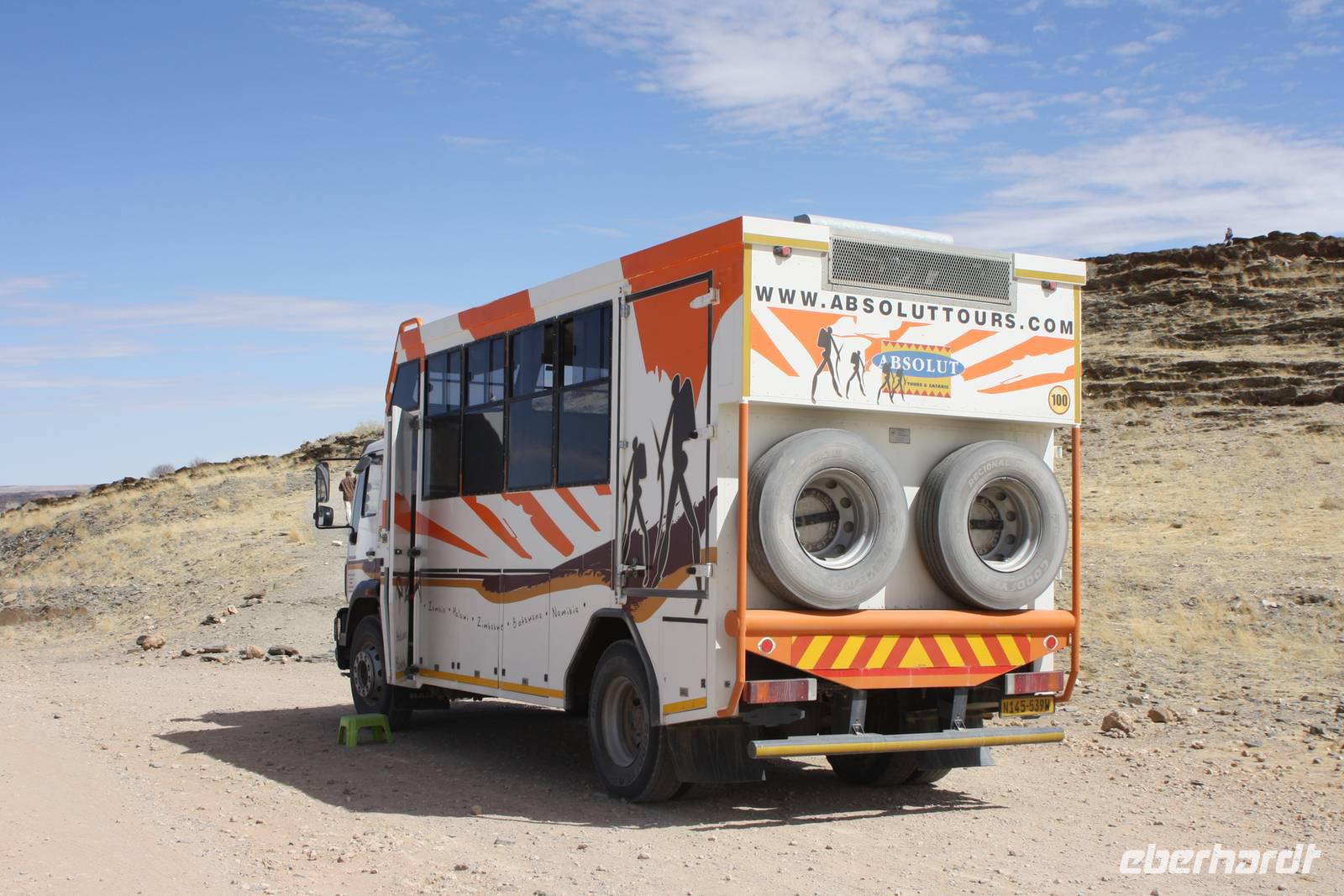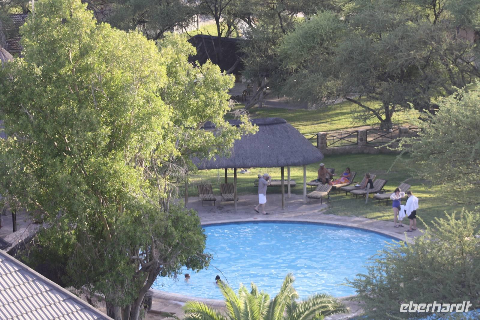 Auch heute liegen wieder einige Fahrkilometer vor uns. Uns geht wieder Richtung Süden. Demokratisch entscheiden wir mit der Gruppe, das wir jedoch die Abkürzung über den Etosha-Nationalpark nehmen und nicht darum herum fahren. So haben wir neben weniger Fahrtkilometer auch noch Chancen, endlich ein paar Tiere zu sehen. Wir erreichen das Anderson-Gate, das westliche Gate des Parkes und fahren die Hauptstrecke entlang in Richtung Okaukujeo. In einen Seitenarm der Straße sieht Ernst eine Bewegung und möchte dort auch reinfahren. Jonas überlegt kurz und biegt dann rechts ab. Keine fünfzehn Meter weiter sind wir festgefahren. Was für ein Spaß für die Männer. Jonas und Ernst bleiben ganz gelassen und ruhig. Während die beiden und drei weitere Männer buddeln und trockene Utensilien suchen, um den Bus aus dem festgefahrenen Schlamm wieder rauszufahren, passen wir Frauen darauf auf, das sich kein wildes Tier unserem Bus nähert. Und es dauert auch gar nicht lange, vielleicht fünfzehn Minuten und wir können stolz den Männern gratulieren, das sie den Bus wieder heraus manövriert haben. Kurze Zeit später erreichen wir das Wasserloch Olifants Rests. Während Jonas und Ernst unser Mittagspicknick vorbereiten, warten wir am Wasserloch auf Tiere - aber leider vergebens. Was solls? Wir haben ja noch ein paar Tage. Nachdem wir uns gestärkt haben, setzen wir unsere Fahrt in Richtung Osten fort - es sind ja heute doch noch ein paar Kilometer zu fahren. Und endlich sehen wir sie, die ersten Tiere: Gnus, Strauße, Oryx, Springböcke, Giraffen, Elefanten, Zebras, Perlhühner und Impalas. Für den ersten Tag doch eine gute Ausbeute, oder? Kurz vor um sechs erreichen wir das Okaukujeo Rest Camp, wo wir noch eine kurze Pause einlegen. Danach möchten wir den Park verlassen und stehen vor einem verschlossenen Tor. Sollen wir jetzt im Bus im Park übernachten? Nein, unser guter Ernst organisiert, dass das Tor nochmal für uns geöffnet wird. Somit erreichen wir alsbald unsere Etosha Safari Lodge, ein Upgrade der Agentur, da wir eigentlich im Etosha Safari Camp untergebracht werden sollen. Die Lodge thront weit über dem Camp auf einem Berg. Von der Restaurantterasse aus haben wir einen fantastischen Ausblick und jeder wohnt in seinem eigenen Chalet. Wir haben es wirklich gut.