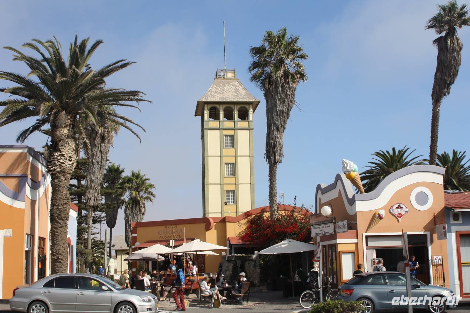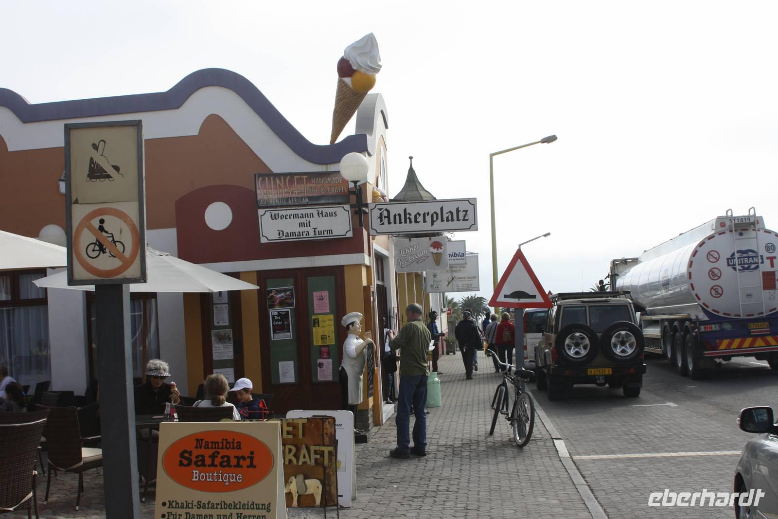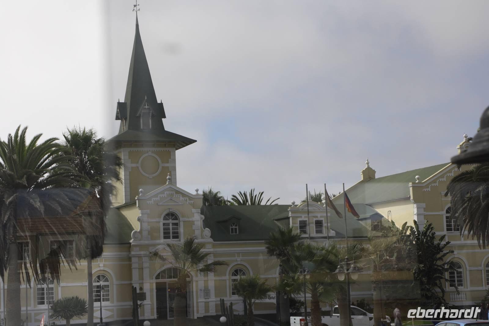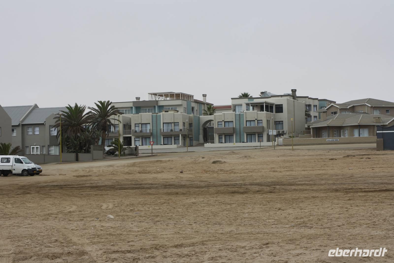 Eine weniger lange Fahrt liegt heute vor uns. Wir verlassen die Lodge in Richtung Norden. Unser Ziel heute ist die Stadt Swakopmund am Atlantik gelegen. Natürlich machen wir im Städtchen Solitaire Stopp, das in jedem Reiseführer angepriesen wird. Wir kaufen den bekannten Apfelkuchen für die Mittagspause und lassen unsere Karten mit dem Solitaire-Stempel vermerken. Dann geht die Fahrt weiter. Wir erreichen erneut den südlichen Wendekreis des Steinbocks. Hier lade ich meine Gäste auf ein Gläschen Amarula-Likör (nicht den Cream-Likör den es auch bei uns gibt, sondern wirklich klaren, drehhaften Likör) ein und wir erheben unsere Gläser auf das Bergfest. Die Weite zieht weiter an uns vorbei und ändert sich ständig wieder und sind ganz happy als wir endlich die Schotterpiste verlassen und Walvis Bay erreichen. In der Lagune bei den Pelikanen vertreten wir unsere Beine bei unserem Fotostopp, der auch gleichzeitig unsere Mittagspause ist. Nun kosten wir nun auch von dem bekannten Apfelkuchen. Unser Fazit ist jedoch, das er nicht so viel besser oder anders schmeckt als anderswo. Danach machen Ernst und Jonas mit uns eine kleine Rundfahrt durch den Ort, vorbei an den teuren Villen mit Blick aufs Meer, der Hauptverkehrsstraße und den Hafen. Keine halbe Stunde spätern nachdem wir Wavis Bay verlassen haben, erreichen wir Swakopmund. Bei einer kleinen Rundfahrt zeigt uns Ernst die schönen Häuser der Stadt, die Hauptverkehrsstraße, die Mole, das Woereman-Haus, die Swakopmunder Buchhandlung sowie die älteste Apotheke, das Denkmal für die gefallenen deutschen Soldaten im ersten und zweiten Weltkrieg sowie den alten Bahnhof und das bekannte Café Anton. Danach gehts weiter zu unserem 4-Sterne-Hotel, welches ca. 7 Kilometer außerhalb der Stadt direkt am Atlantik liegt. Wir spazieren am Nachmittag am Strand entlang und lassen uns den kräftigen Meereswind um die Nase wehen.