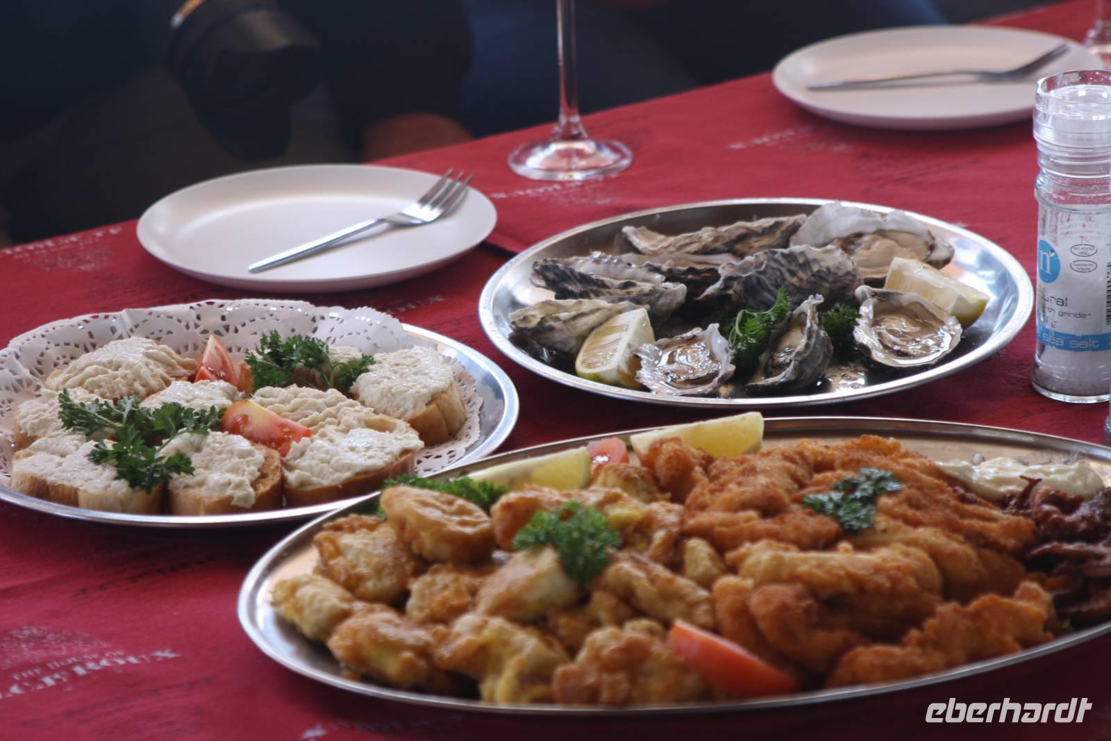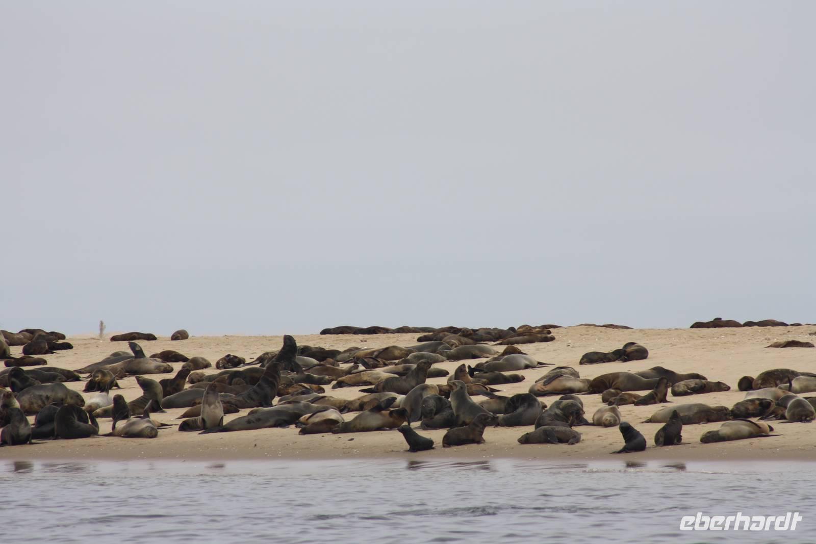 Die Mehrzahl meiner Gäste entscheidet sich für den fakultativen Ausflung in die Walvis Bay. Da das Meer am Morgen noch am ruhigsten ist, beginnt da auch der Ausflug. Jonas bringt uns zur Waterfront von Walvis Bay wo wir auf einen Katamaran umsteigen. Unser deutschsprachiger Guide Sandra, übrigens eine wunderbare und witzige Frau mit viel Unterhaltungspotential aus dem hohen Norden Deutschlands und Robbe Libby begrüßen uns an Bord als auch ein Komoran, der gemütlich über das Deck läuft. Wir laufen zunächst eine Landzunge an, auf der die Robben wohnhaft sind. Da viele Kanufahrer da sind und die Robben sehr gern mit den Kanufahrern spielen, können wir ein wunderbares Naturschauspiel beobachten. Auch an einem Kutter, der gerade Austern fängt, kommen wir vorbei. Danach wird erstmal Kaffee und Sherry gereicht...so als Beruhigung für die Ausfahrt auf das offenen Meer. Ein großer Robbenbulle hält am Ende der Landzunge ganz allein Ausschau nach einer Braut und dann sind wir schon da: auf dem Meer wo wir Delfine vermuten. Naja, ein wenig Glück haben wir: wir können sie aus der Ferne beobachten. Leider nicht nah dran aber immerhin. Nach zweieinhalb Stunde und vorbei an zwei Ölkuttern werden wir in den hinteren Teil des Katamarans gebeten. Die Crew reicht uns Sekt im Übermaß und Austern und Schnittchen und Schnitzel und und und....wer hier nicht satt wird, ist selber schuld. Und nachdem wir uns schon fühlen wie platzen, dann kommt auch noch kleines Gebäck auf den Tisch zum Dessert. Solch eine schöne, tierreiche und lustige Seefahrt habe ich persönlich bisher noch nicht erlebt. Tausend Dank an Sandra und Mike sowie ihrer gesamten Crew. Zurück an der Waterfront warten schon Jonas und Ernst auf uns um uns zurück nach Swakopmund zu bringen. Kurz vor der Stadt steige ich mit einem Reisegast aus um uns auf das Erlebnis Quadfahren in den Dünen einzulassen. Kurz die Regeln erklärt, Helm aufgesetzt und los geht der Sandgaudi. Der restliche Teil der Gruppe fährt entweder zum Hotel zurück oder steigt in der Stadt aus um sich diese noch ein wenig anzuschauen. Auch Hans und ich kehren nach unserer Quadstunde ins Stadtzentrum zurück. Wir spazieren entlang der Haupstraße, schauen uns das Hansa-Hotel an sowie noch einmal das Denkmal für die gefallenen Soldaten und auch am Café Anton kommen wir vorbei, wie auch an dem ein oder anderen Souvenirladen. Den Abend lassen wir gemeinsam im stadtbekannten Restaurant Kückis Pub bei Bier, Wein, Fleisch, Fisch, Rösti und Spätzle ausklingen.