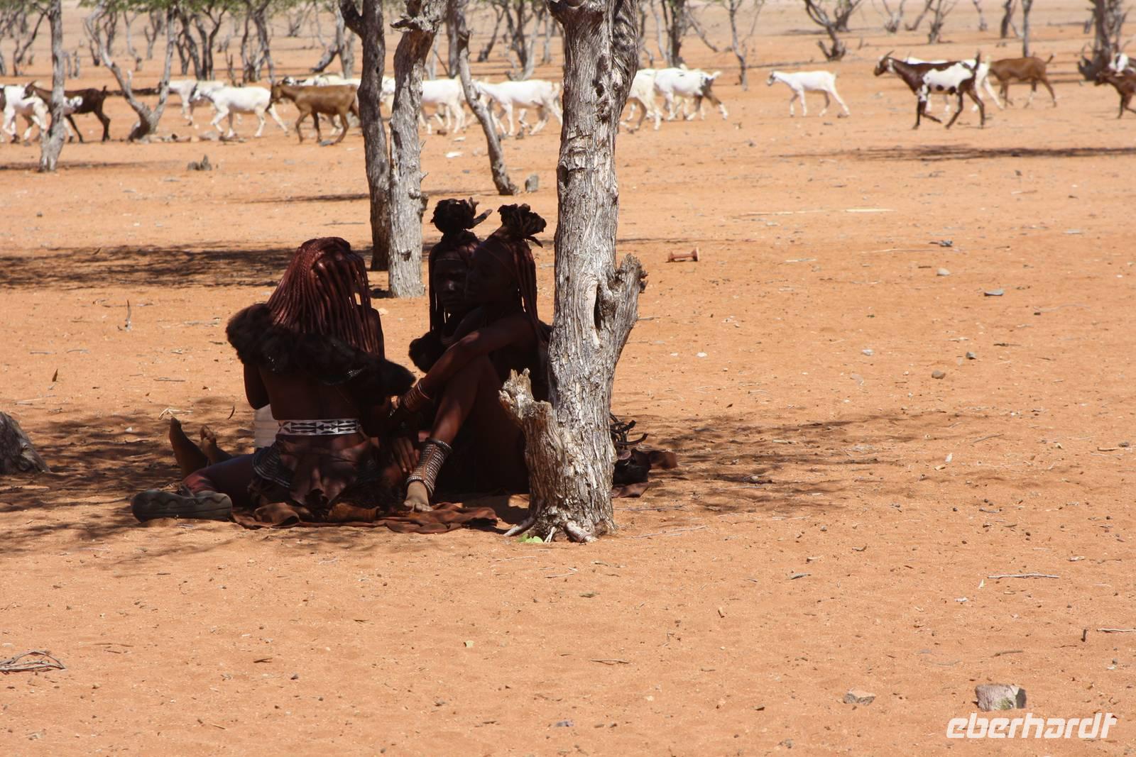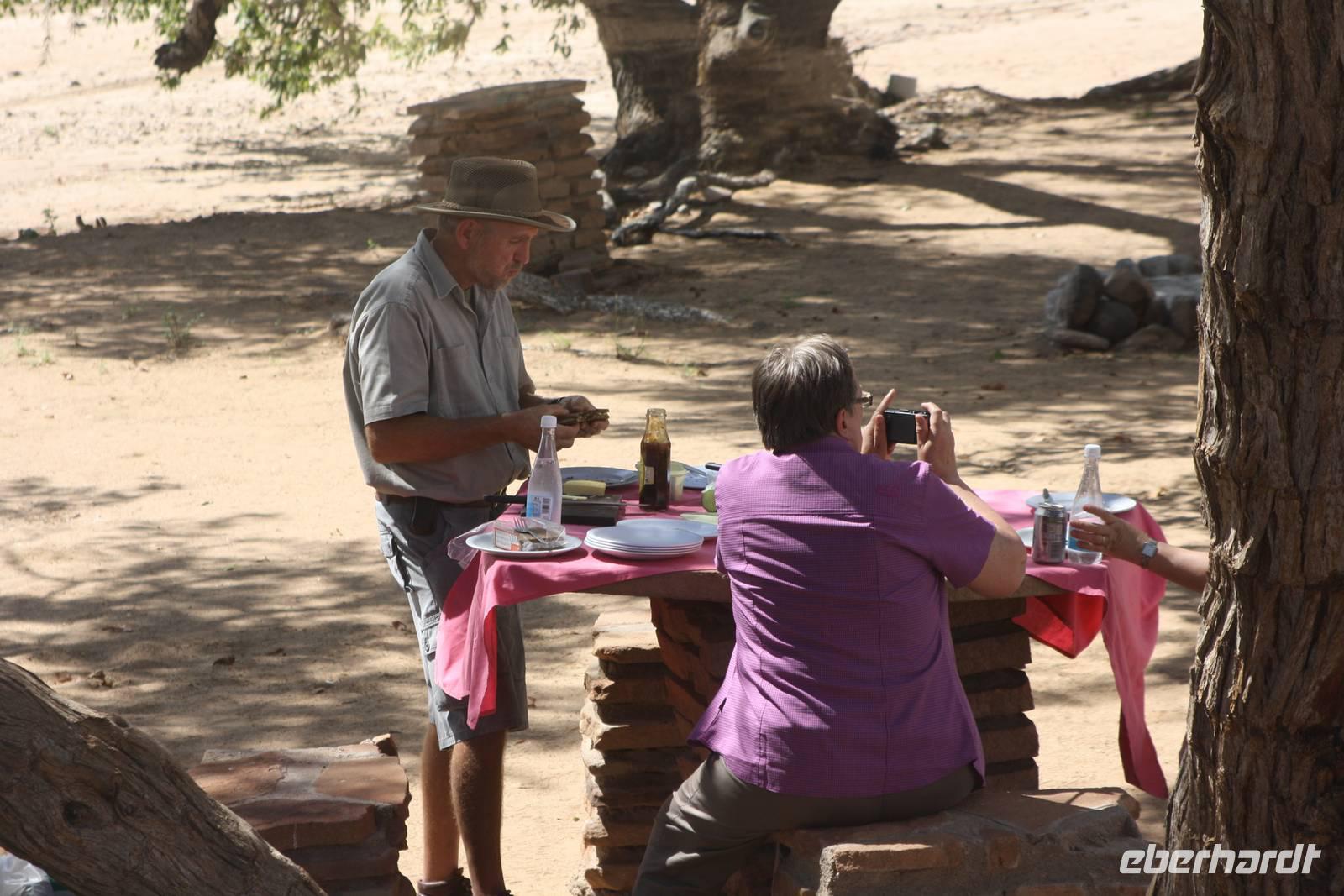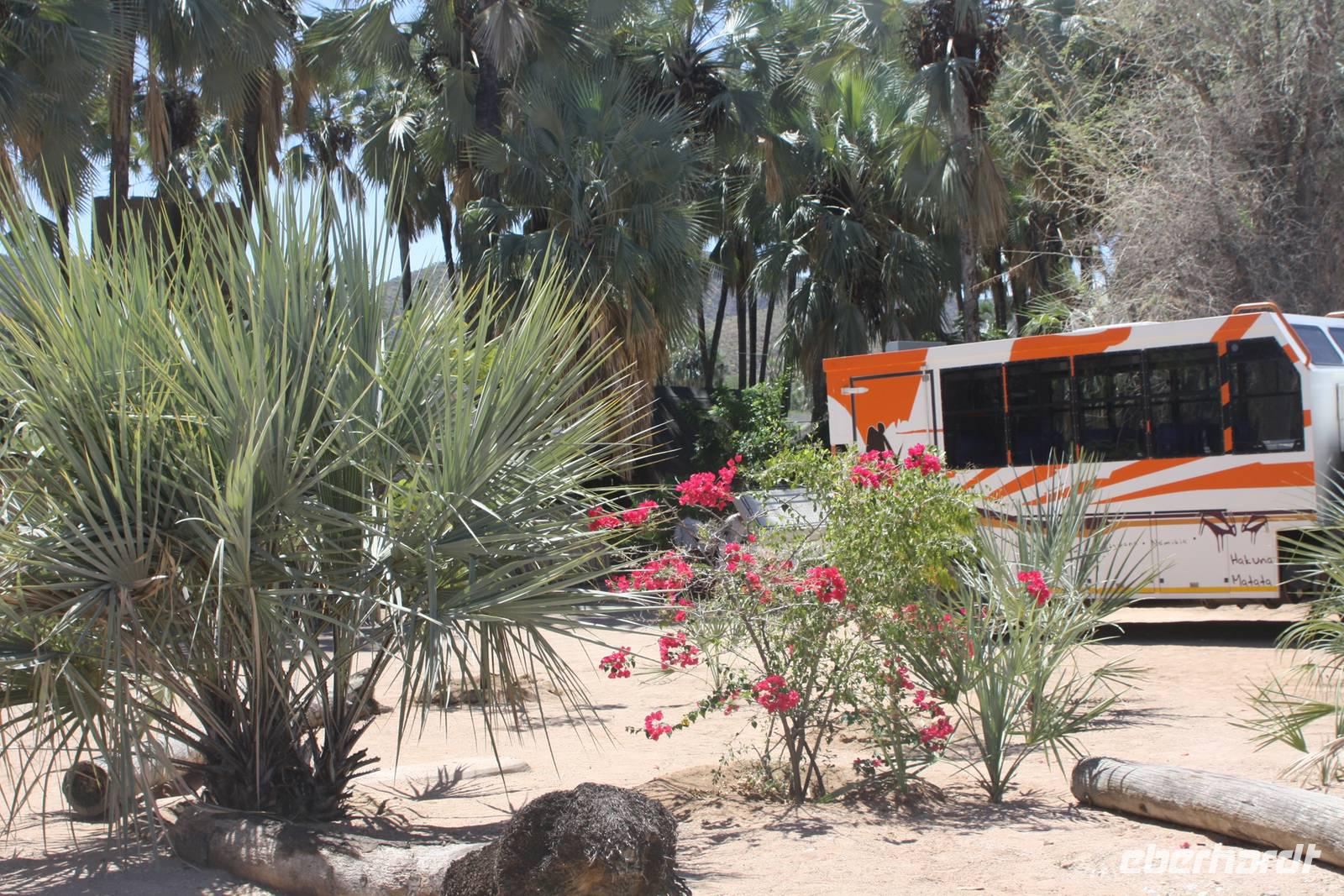 Another sunny day in Africa. Ganz zeitig geht es heute los. Das Frühstück verladen Ernst und Jonas als Lunchpakete im Bus und schon geht es los in Richtung Norden zur angolischen Grenze. Unterwegs rasten wir am Straßenrand, um unsere Lunchpakete zu verzehren. Nach rund vier Stunden Fahrt erreichen wir schließlich das Dörfchen Epupa, wo wir zunächst in der wunderschönen Gartenanlage einer Lodge eine Getränkepause einlegen. Danach wandern wir mit Wasserflaschen ausgestattet zu dem nahegelegenen Epupa-Wasserfällen. Bißchen über Stock und Fluss wandern und schon entdecken wir die Gicht. Fotos sind natürlich Pflicht. Und dann schauen wir uns auch die riesigen Baobabs an, mit Erklärungen von Ernst und Blick auf Angola. Als wir uns auf den Weg zurück zur Lodge gehen, treffen wir auf einen Ortsansässigen, der uns seinen wunderschönen Garten zeigt. Hier wächst unter anderem neben endemischen Pflanzen auch Mais und Zuckerrohr. Man mag es kaum glauben, wie schön dieser Garten in dieser sandigen Einöde ist. Unsere Mittagspause verleben wir in der Gartenanlage der Lodge bei Toast und Rock Shandy. Am Nachmittag besuchen wir ein natürliches Himba-Dorf. Leider sind der Häuptling und die Männer mitsamt dem Vieh nicht da. Da es länger nicht geregnet hat, sind sie von dannen gezogen. Nur der stellvertretender Häuptling, Frauen, Kinder und eine Krankenschwester sind da. Nachdem wir gefragt haben, ob unser Besuch erwünscht ist, dürfen wir überall und jeden fotografieren und unsere Fragen stellen. Jedoch erhalten wir nicht auf jede Frage. Die Situation für uns ist doch sehr komisch. Wir dürfen gegen Lebensmittel fotografieren. Die Antwortenauf die Fragen sind doch anders als erwartet, also eine komplett andere Kultur für die man auch viel Verständnis aufbringen muss, um diese Lebensweise zu verstehen. Die Häuser sind sehr einfach.Matten liegen aus, die Sachen hängen an der runden Wand und die Hühner laufen darin rum. Die sind ganz klein, die Hütten. Unverständlich, dass man dort überhaupt mit Kindern schlafen kann. Was mich persönlich auch verwundert: Kinder sind Statussymbole. Als wir ein junge Mädchen fragen, ob sie bereits ein Kind hat, verneint sie das verschämt. Wir fragen die Krankenschwester nach Verhütung aber die wir bei den Himbas nicht praktizieren, die Frau darf sich dem Mann nicht verweigern. Die Himbafrauen befürchten, später keine Kinder mehr zu bekommen, sofern sie jetzt verhüten. Nachdem wir unsere Gastgeschenke abgegeben haben, setzen wir unsere Rückfahrt in Richtung Lodge fort. Die Stimmung ist nach dem Himbabesuch doch sehr gedrückt und regt zum Nachdenken an.