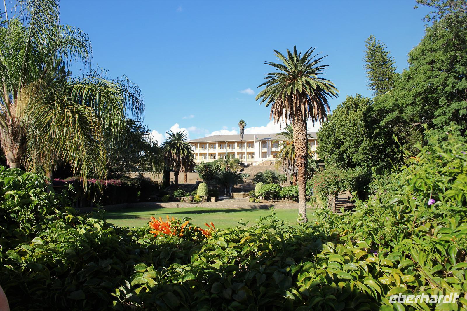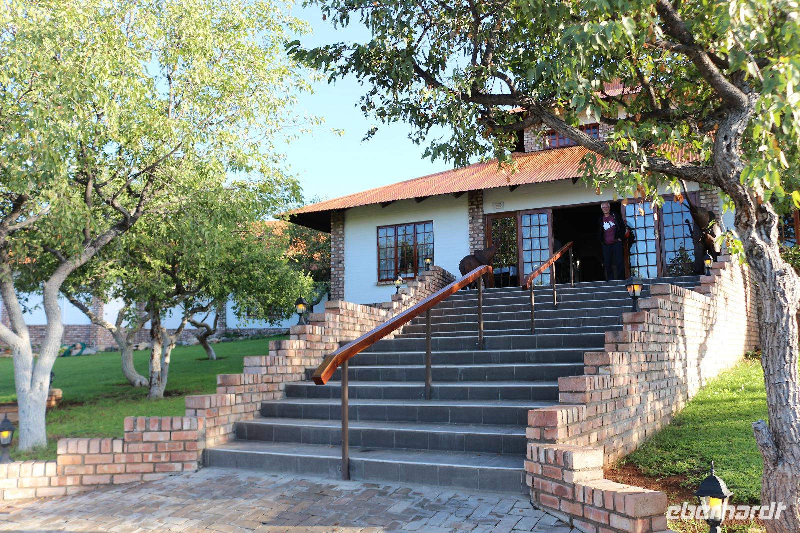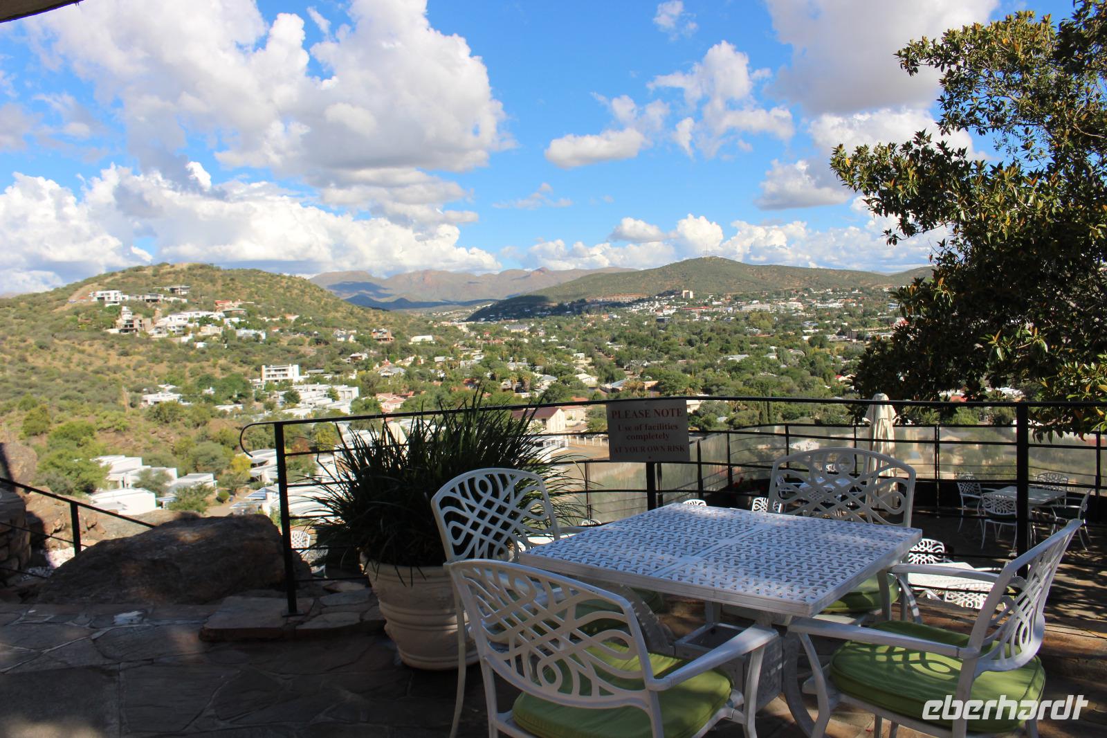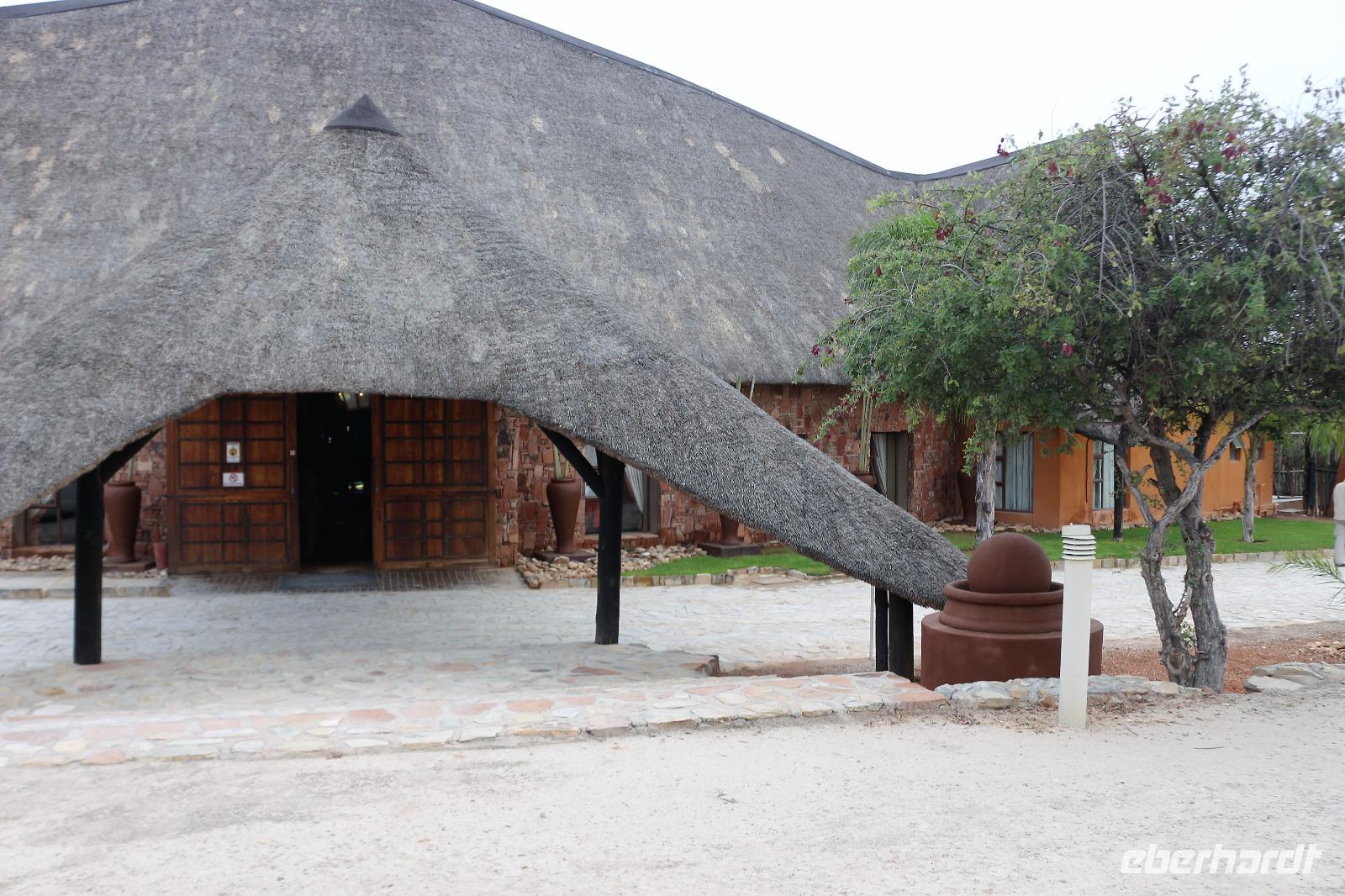 Hier angekommen erwarteten uns bereits angenehm sommerliche Temperaturen. Nachdem alle Einreiseformalitäten erledigt waren und wir unsere Koffer wieder erhalten hatten, nahm uns unser örtlicher Reiseleiter Henner in Empfang. Nun bestand die Möglichkeit, noch Geld in namibische Dollar zu tauschen, bevor wir den Flughafen verließen. Henner, welcher Busfahrer und Reiseleiter in einer Person war, brachte uns zunächst zu unserem ersten Hotel, dem Hotel Thule in Windhoek. Hier wurden wir mit Sekt oder Orangensaft begrüßt und konnten unsere großräumigen Zimmer beziehen.
