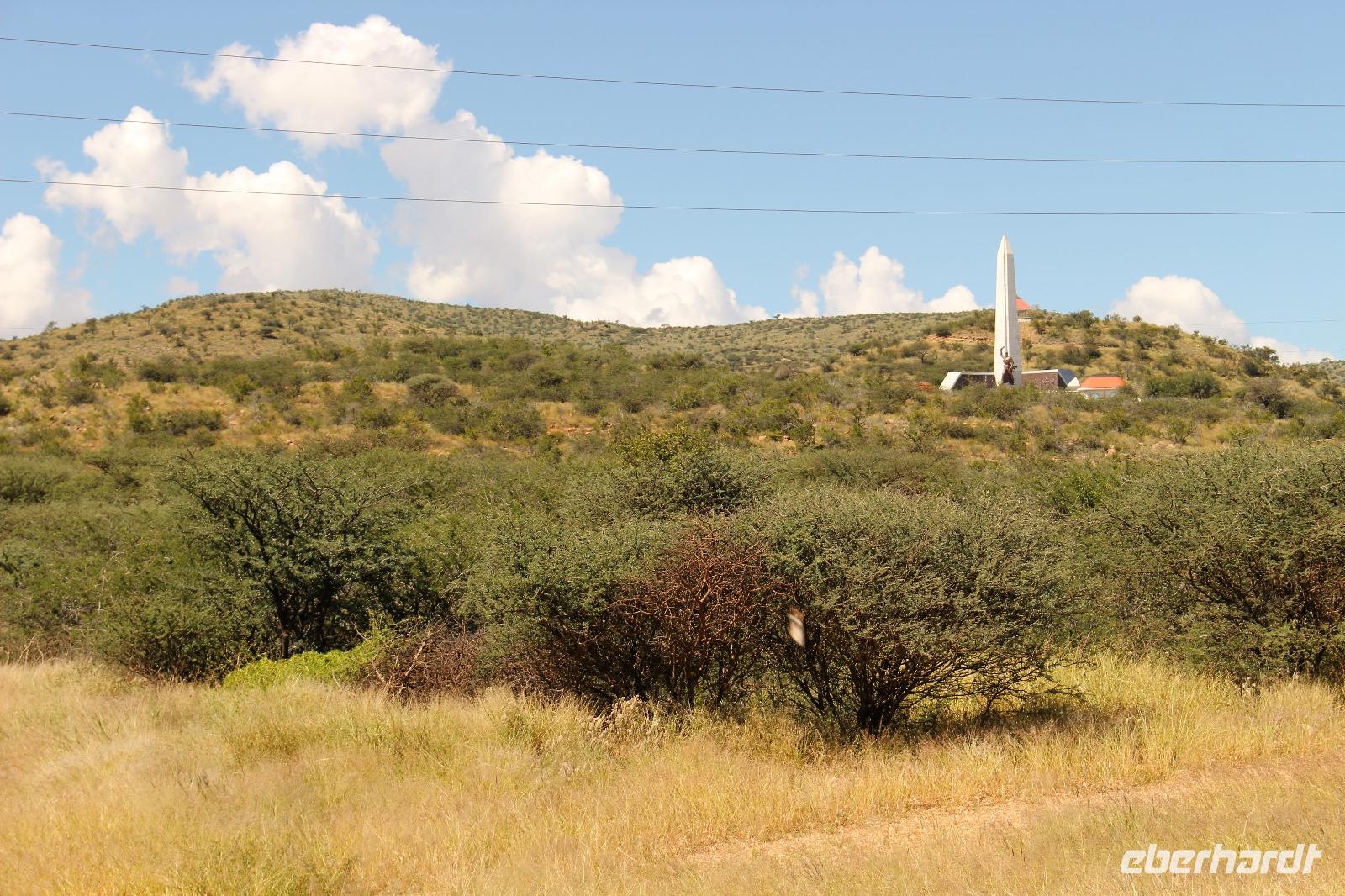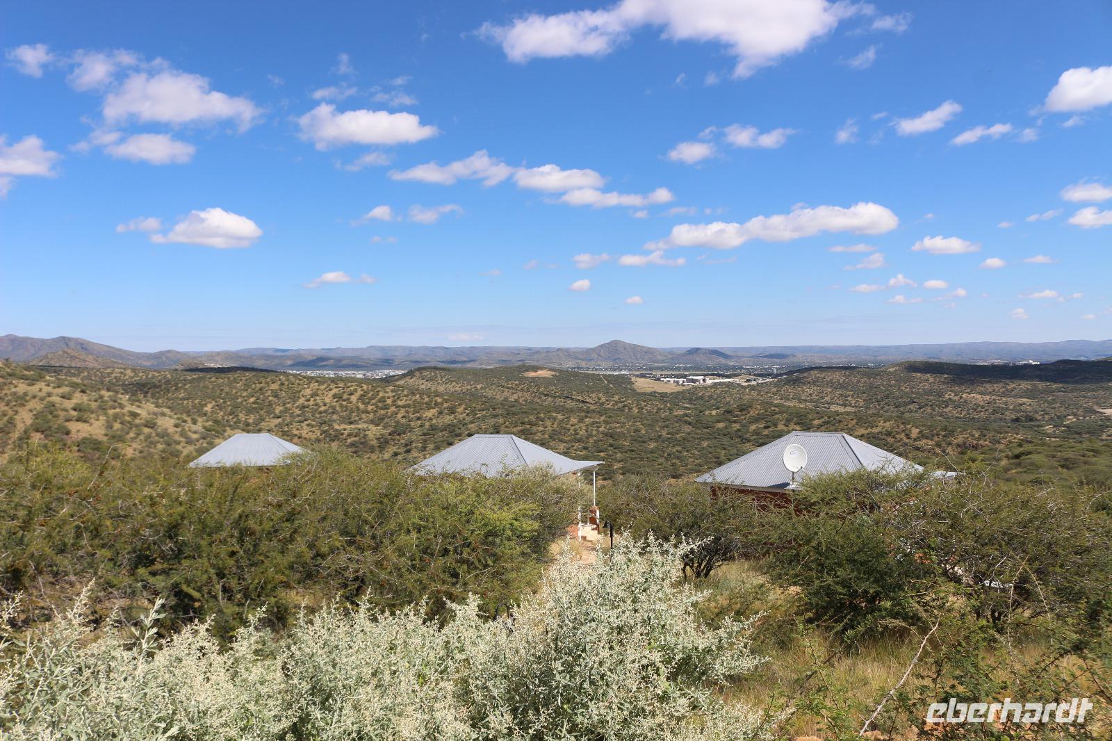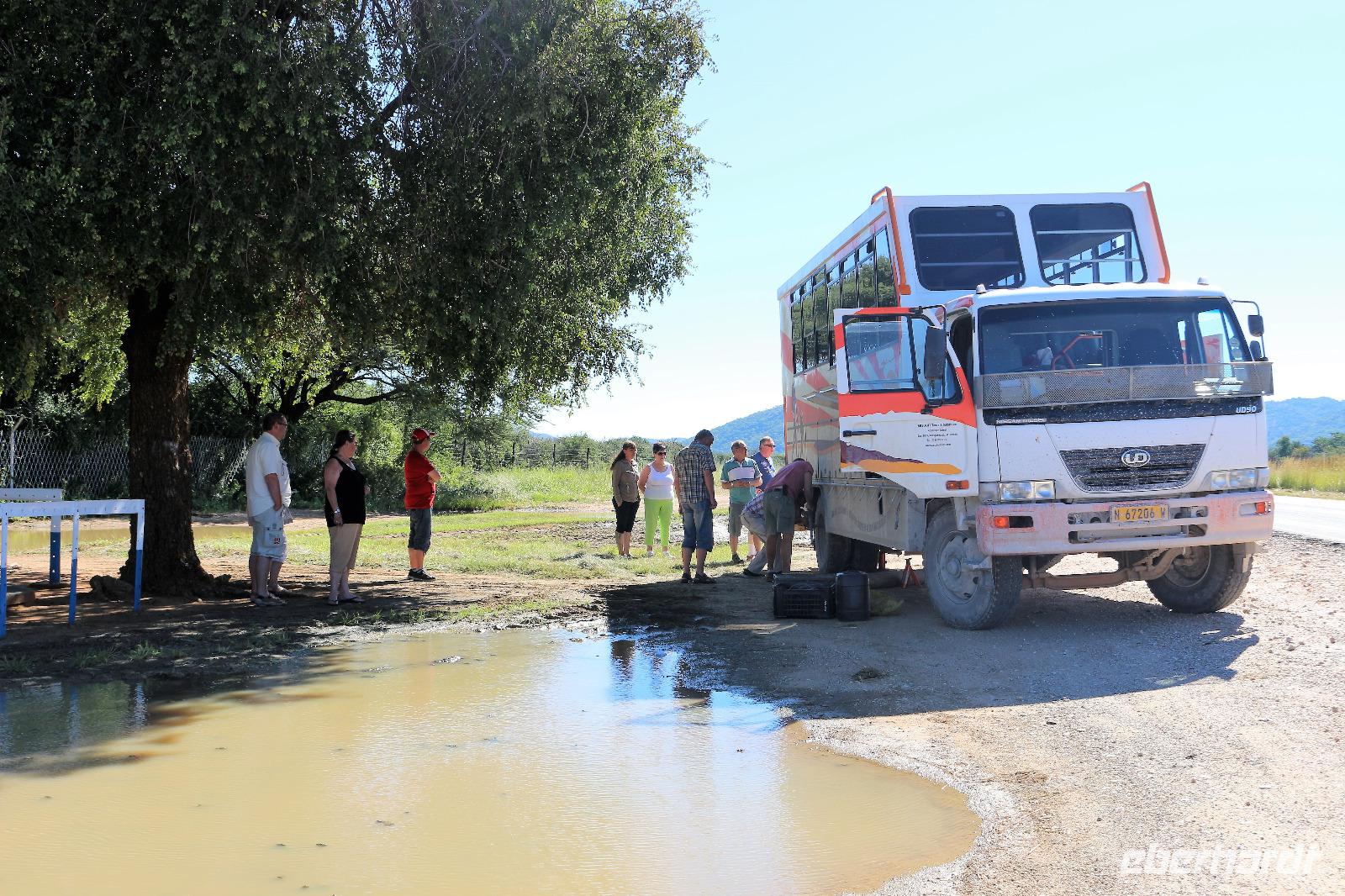Nach dem Frühstück verließen wir unsere schöne Lodge wieder und machten uns nun auf den Weg in Richtung Windhoek. Doch schon vor dem ersten größeren Ort Otavi mussten wir aufgrund einer Reifenpanne eine ungeplante Pause einlegen. Die vielen gefahrenen Kilometer auf den Schotterpisten waren nicht ganz folgenlos geblieben. Alle Männer waren sofort zur Stelle und halfen Henner beim Reifenwechsel, sodass dieser auch schnell geschafft war und wir unsere Fahrt fortsetzen konnten. Über Otavi und Otjiwarongo fuhren wir bis Okahantja, wo wir unsere Mittagspause machten. Ein hübsches Café lud zum Verweilen ein. Außerdem war auch der Holzschnitzermarkt eine besondere Attraktion. Hier konnte fleißig gehandelt und dabei das eine oder andere schöne Stück erstanden werden. Für wen das nichts war, bestand auch die Möglichkeit, die eine oder andere Kleinigkeit im Souvenirshop zu kaufen. Bevor wir die Stadt schließlich verließen, fuhren wir noch zum Soldatenfriedhof, auf dem viele bekannte Hererokrieger sowie auch einige Deutsche begraben liegen. Jedoch fotografierten wir diesen nur aus dem Bus heraus, da es hier in den letzten Wochen einige unschöne Vorfälle gegeben hatte. Schließlich setzten wir unsere Fahrt fort und erreichten wenig später das uns schon bekannte Windhoek. Somit waren wir wieder am Ausgangspunkt unserer wunderschönen Rundreise angekommen. Statt mitten in der Stadt zu übernachten fuhren wir heute an Windhoek vorbei ins Auersgebirge und bezogen die River Crossing Lodge. Hier hatten wir einen wunderschönen Blick auf die Stadt und ihre Umgebung. Mit einem gemeinsamen Abendessen und einem anschließenden „Springbock" ließen wir unsere Reise heute gemütlich ausklingen.