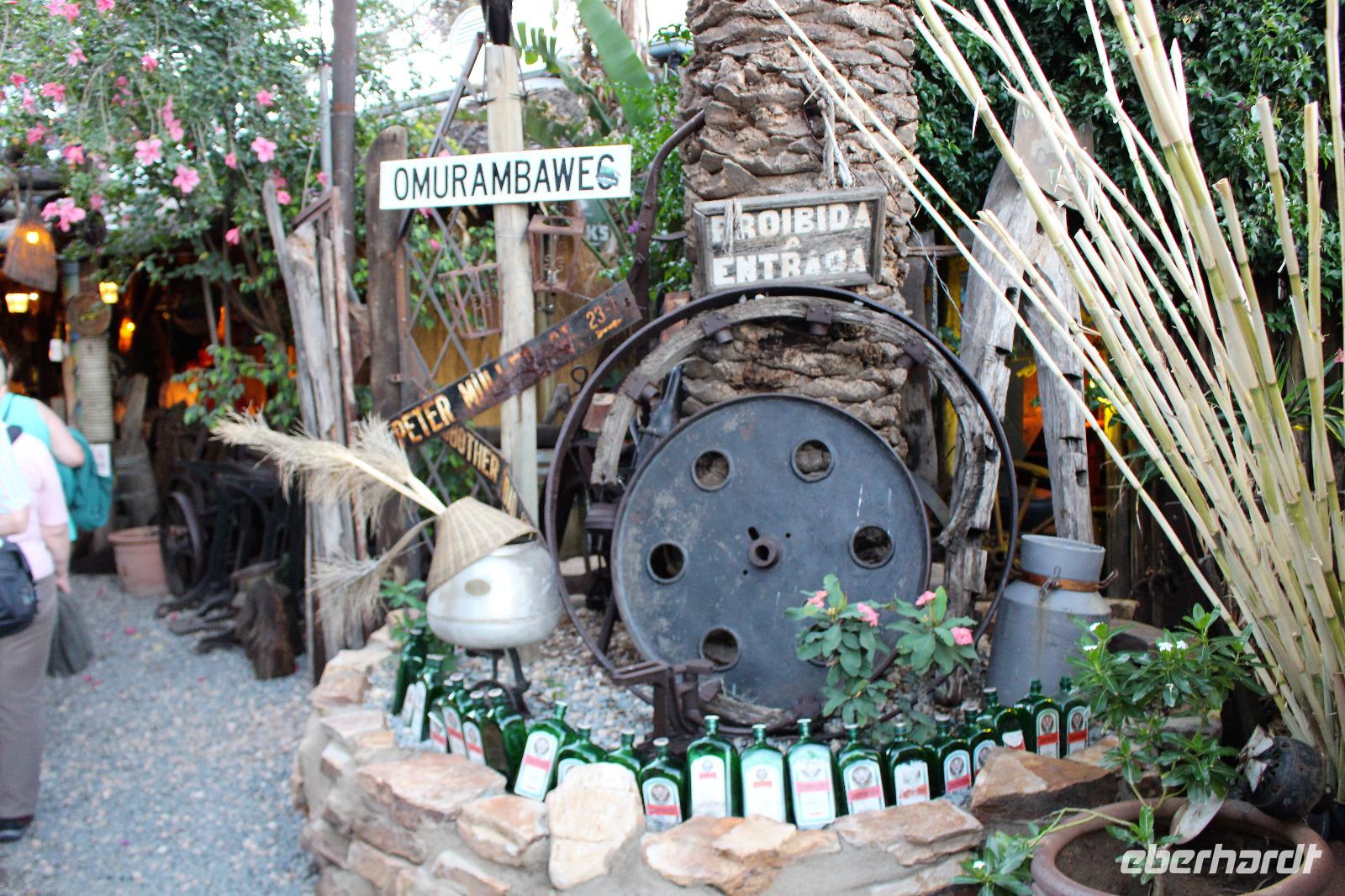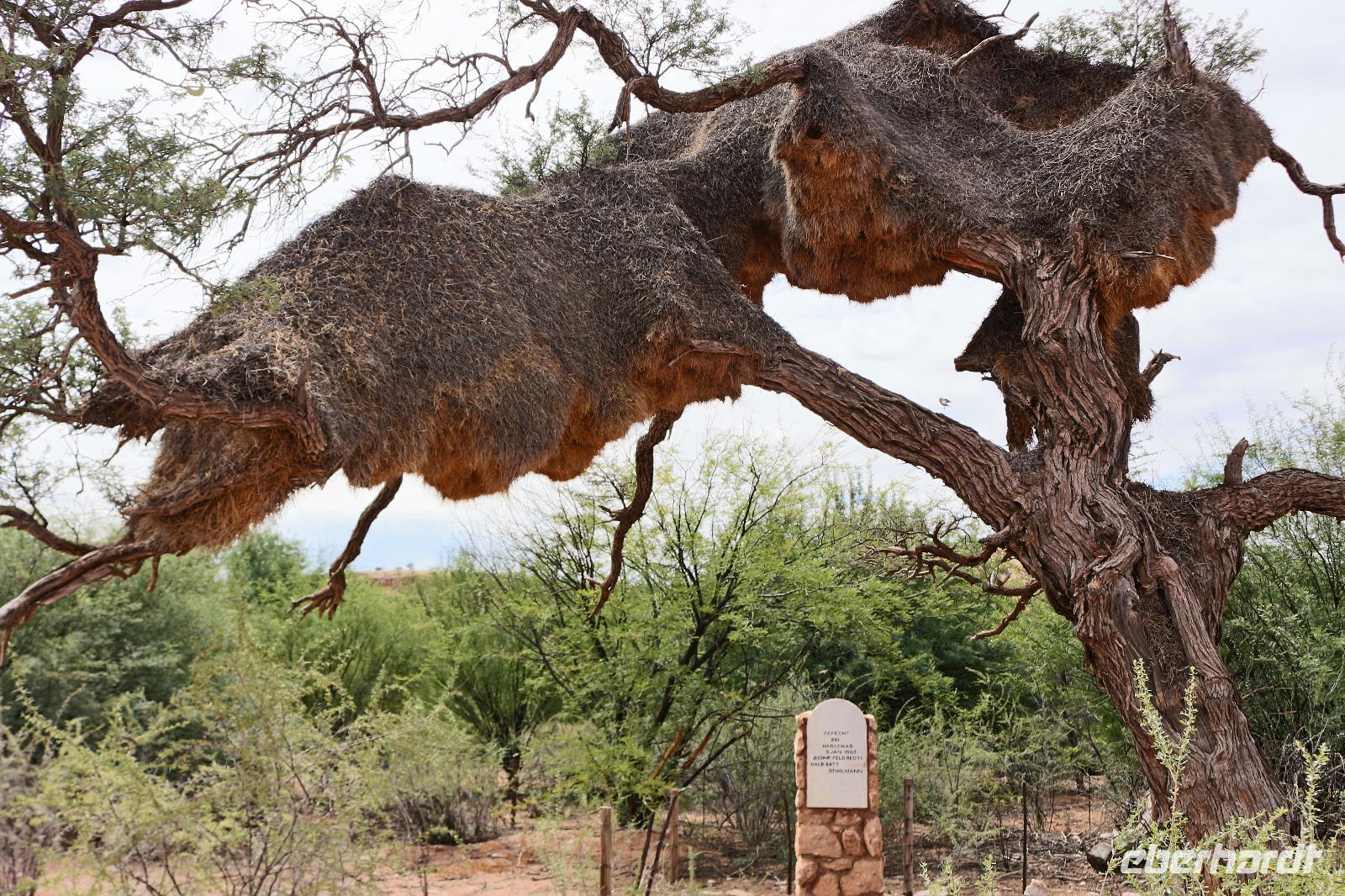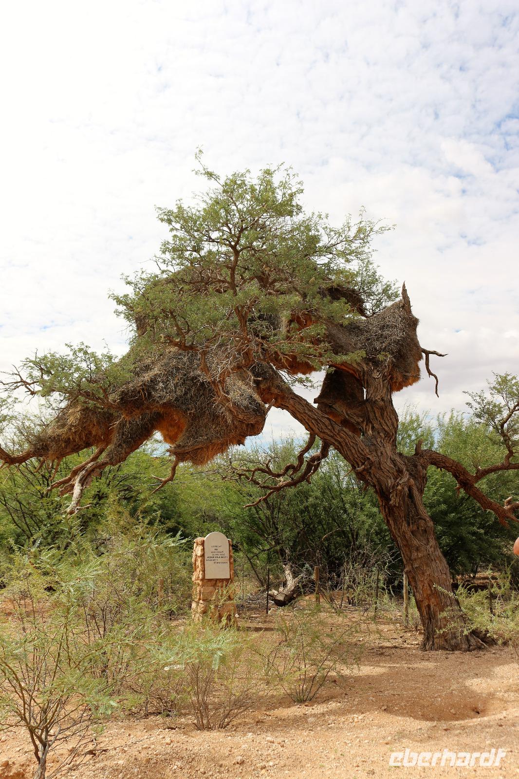 Nach dem Frühstück verließen wir unsere schöne Lodge wieder und machten uns nun auf den Weg in Richtung Windhoek. Doch schon vor dem ersten größeren Ort Otavi mussten wir aufgrund einer Reifenpanne eine ungeplante Pause einlegen. Die vielen gefahrenen Kilometer auf den Schotterpisten waren nicht ganz folgenlos geblieben. Alle Männer waren sofort zur Stelle und halfen Henner beim Reifenwechsel, sodass dieser auch schnell geschafft war und wir unsere Fahrt fortsetzen konnten. Über Otavi und Otjiwarongo fuhren wir bis Okahantja, wo wir unsere Mittagspause machten. Ein hübsches Café lud zum Verweilen ein. Außerdem war auch der Holzschnitzermarkt eine besondere Attraktion. Hier konnte fleißig gehandelt und dabei das eine oder andere schöne Stück erstanden werden. Für wen das nichts war, bestand auch die Möglichkeit, die eine oder andere Kleinigkeit im Souvenirshop zu kaufen. Bevor wir die Stadt schließlich verließen, fuhren wir noch zum Soldatenfriedhof, auf dem viele bekannte Hererokrieger sowie auch einige Deutsche begraben liegen. Jedoch fotografierten wir diesen nur aus dem Bus heraus, da es hier in den letzten Wochen einige unschöne Vorfälle gegeben hatte. Schließlich setzten wir unsere Fahrt fort und erreichten wenig später das uns schon bekannte Windhoek. Somit waren wir wieder am Ausgangspunkt unserer wunderschönen Rundreise angekommen. Statt mitten in der Stadt zu übernachten fuhren wir heute an Windhoek vorbei ins Auersgebirge und bezogen die River Crossing Lodge. Hier hatten wir einen wunderschönen Blick auf die Stadt und ihre Umgebung. Mit einem gemeinsamen Abendessen und einem anschließenden „Springbock" ließen wir unsere Reise heute gemütlich ausklingen.