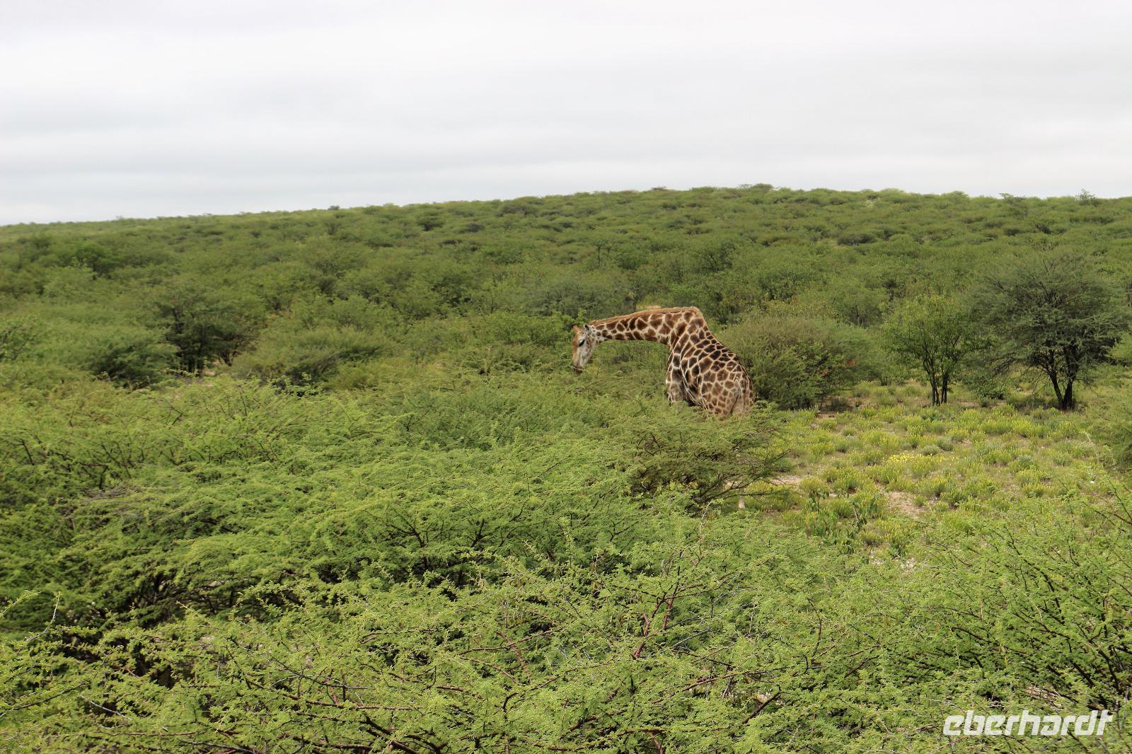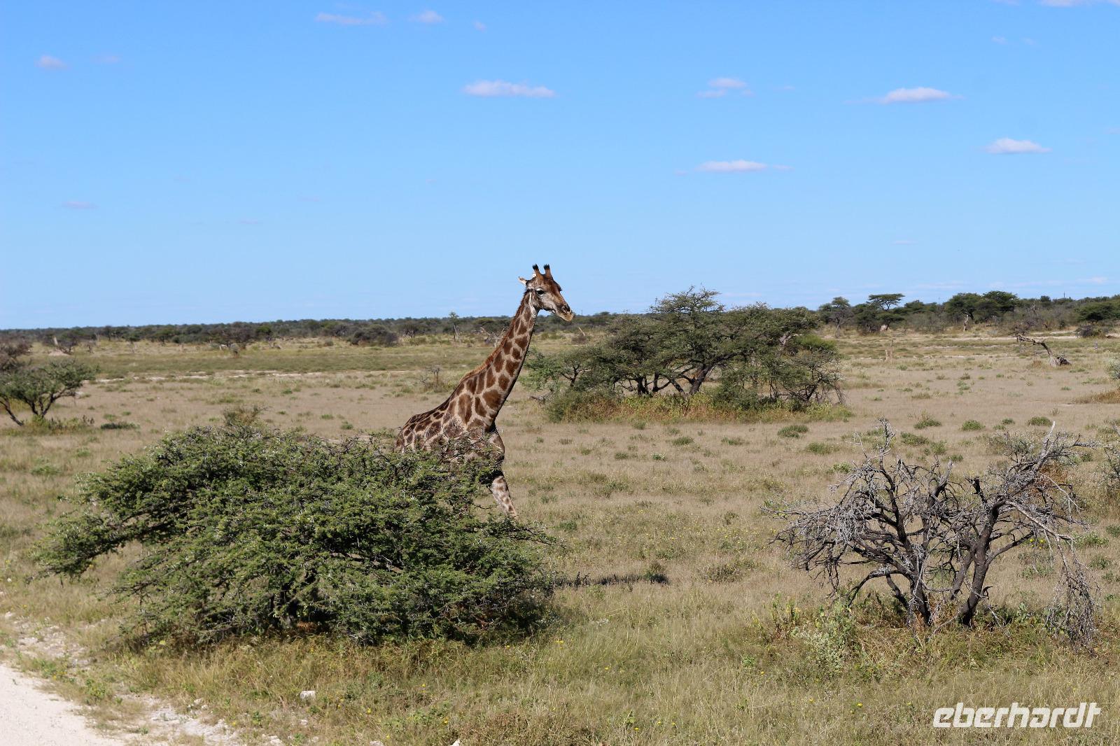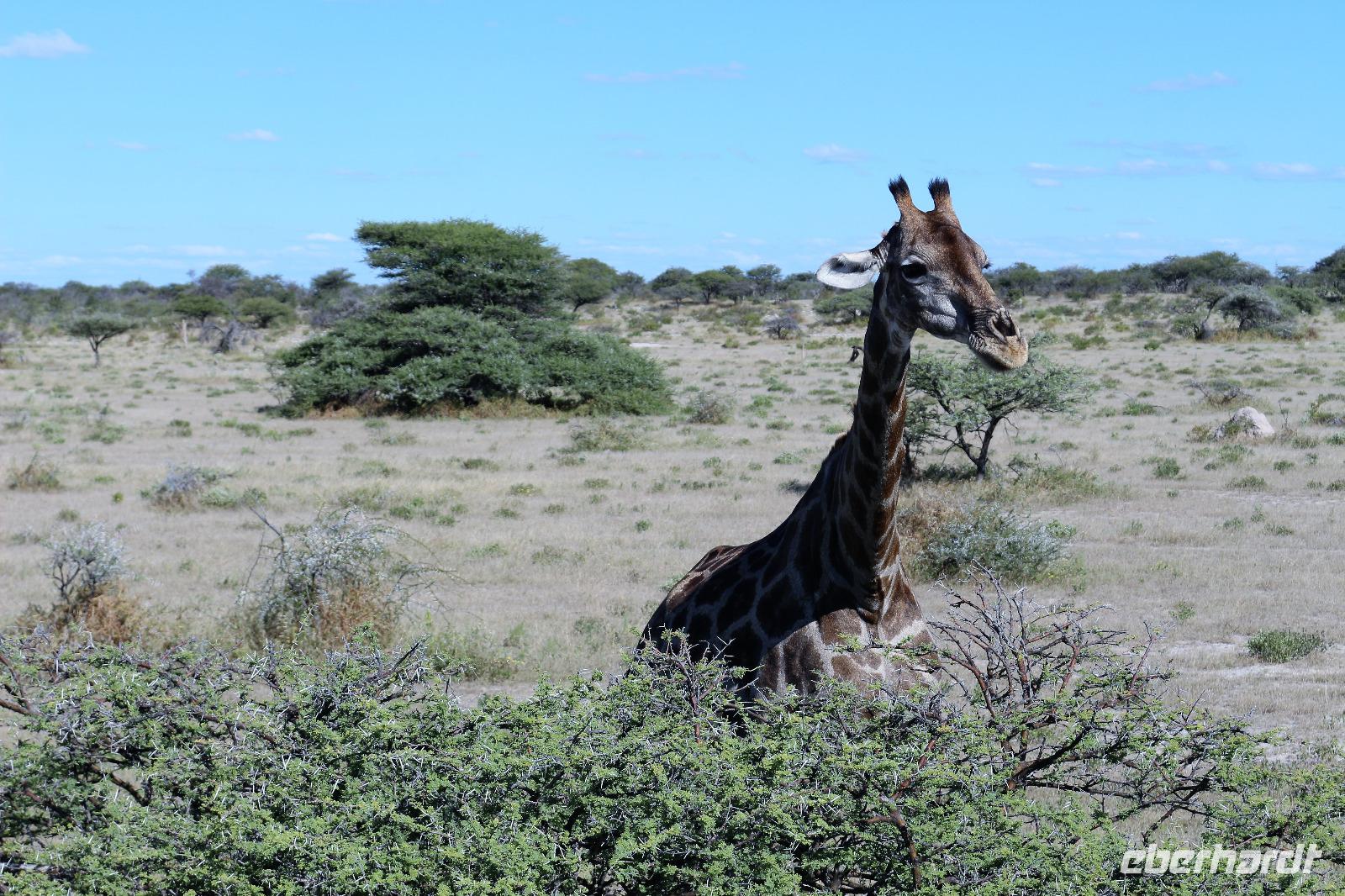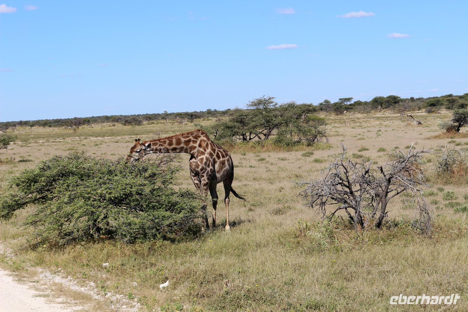 So erreichten wir wenige Minuten später Namutoni, wo wir ein kleines Mittagessen und etwas Kühles zu trinken genießen konnten. Auch die kleine und sehr hübsche Festung sowie ein hübsches Museum konnten wir besichtigen. Sehr schade ist jedoch, dass diese Festung immer mehr verfällt, weil diese nicht instand gehalten wird. Gut gestärkt setzten wir unsere Pirschfahrt schließlich fort. Doch auch hier machten uns die Elefanten wieder einen Strich durch die Rechnung, weil diese uns nicht den ursprünglich geplanten Weg passieren lassen wollten. So mussten wir umkehren und die Runde aus der anderen Richtung beginnen. Hier zeigte sich uns unmittelbar am Straßenrand eine Giraffe, welche wir aus nächster Nähe beim Fressen beobachten konnten. Nach vielen wunderschönen Erlebnissen verließen wir schließlich den Etosha Nationalpark, froh heute noch so viele Tiere gesehen zu haben. Ungewohnterweise ging es heute auf asphaltierter Straße weiter, doch der Zufahrtsweg zu unserer Lodge war schließlich wieder die uns gut bekannte Schotterpiste. Am späten Nachmittag erreichten wir die Uris Safari Lodge und bezogen die sehr schön eingerichteten Zimmer. Wir genossen das sehr schöne Flair der Anlage und der eine oder andere spazierte bis zu der kleinen und hübsch beleuchteten Kapelle, welche sich auf dem Gelände befand. Später genossen wir gemeinsam unser vorletztes namibisches Abendessen. Den sehr erfolgreichen Tag ließ ein Teil der Gruppe schließlich beim spannenden DFB-Pokal-Halbfinale ausklingen, als Borussia Dortmund gegen den FC Bayern München spielte.
