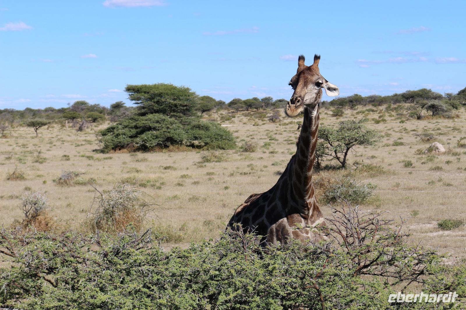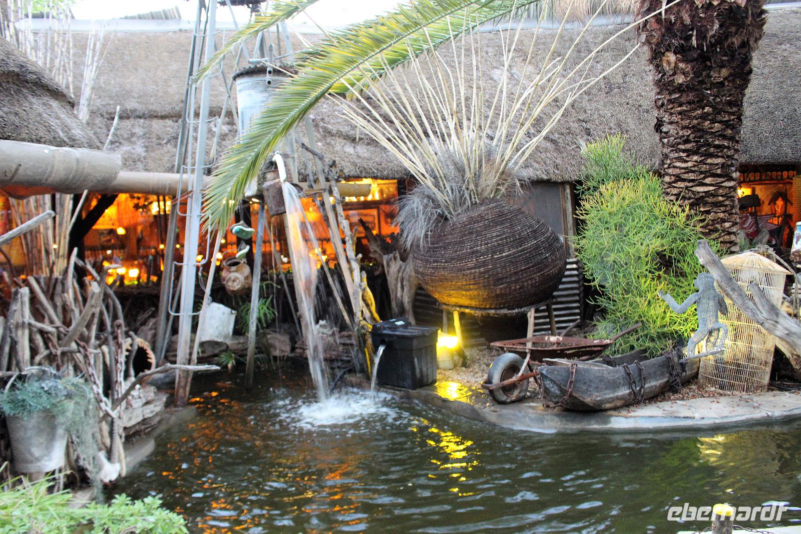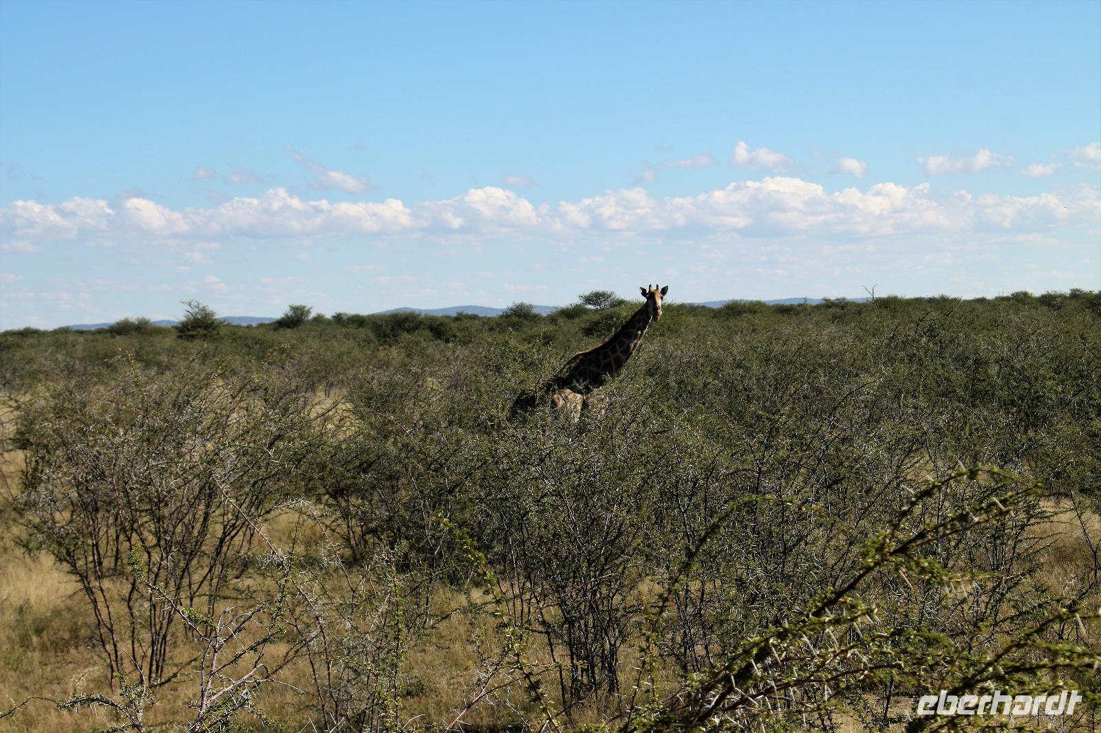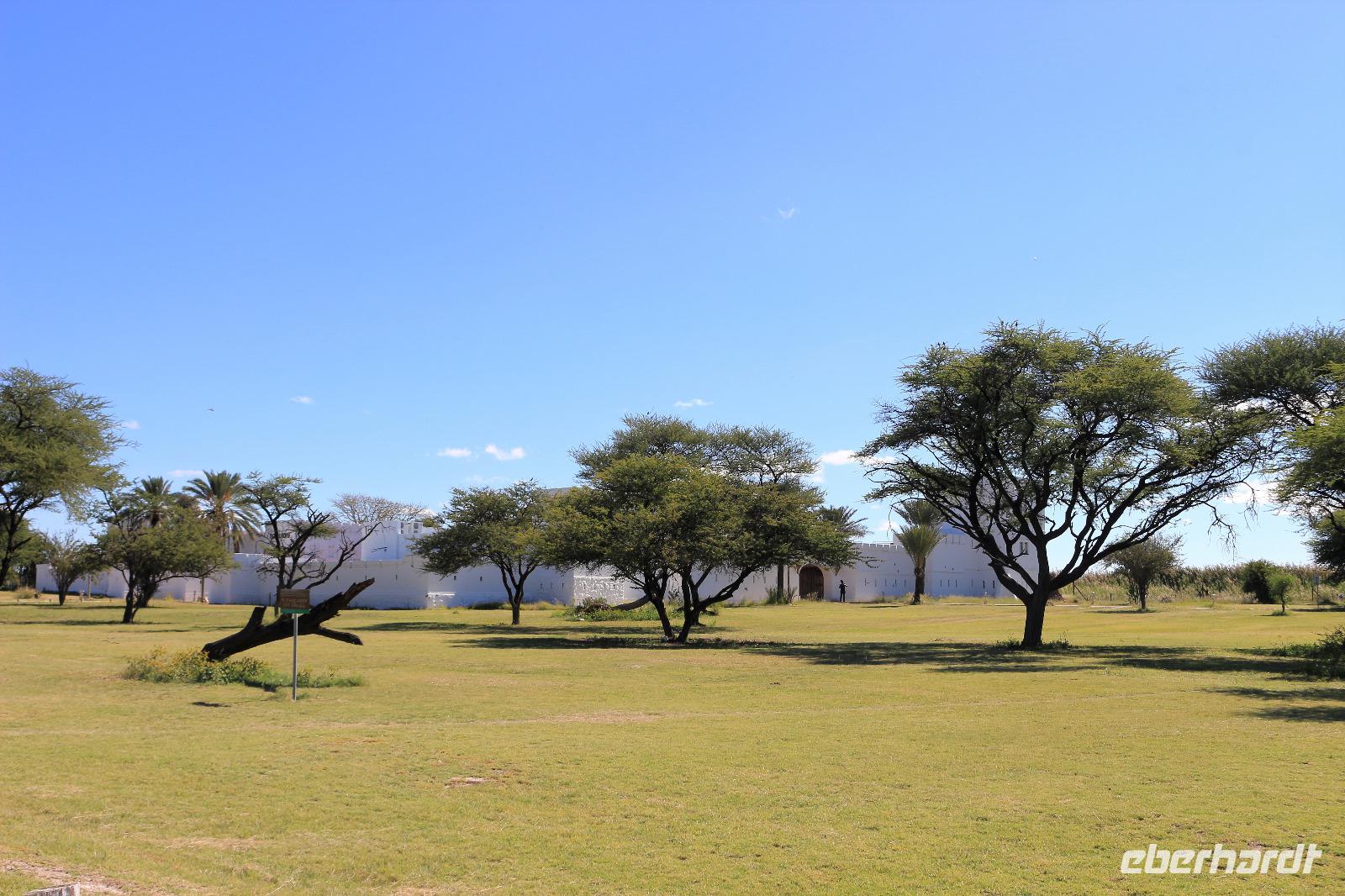 So erreichten wir wenige Minuten später Namutoni, wo wir ein kleines Mittagessen und etwas Kühles zu trinken genießen konnten. Auch die kleine und sehr hübsche Festung sowie ein hübsches Museum konnten wir besichtigen. Sehr schade ist jedoch, dass diese Festung immer mehr verfällt, weil diese nicht instand gehalten wird. Gut gestärkt setzten wir unsere Pirschfahrt schließlich fort. Doch auch hier machten uns die Elefanten wieder einen Strich durch die Rechnung, weil diese uns nicht den ursprünglich geplanten Weg passieren lassen wollten. So mussten wir umkehren und die Runde aus der anderen Richtung beginnen. Hier zeigte sich uns unmittelbar am Straßenrand eine Giraffe, welche wir aus nächster Nähe beim Fressen beobachten konnten. Nach vielen wunderschönen Erlebnissen verließen wir schließlich den Etosha Nationalpark, froh heute noch so viele Tiere gesehen zu haben. Ungewohnterweise ging es heute auf asphaltierter Straße weiter, doch der Zufahrtsweg zu unserer Lodge war schließlich wieder die uns gut bekannte Schotterpiste. Am späten Nachmittag erreichten wir die Uris Safari Lodge und bezogen die sehr schön eingerichteten Zimmer. Wir genossen das sehr schöne Flair der Anlage und der eine oder andere spazierte bis zu der kleinen und hübsch beleuchteten Kapelle, welche sich auf dem Gelände befand. Später genossen wir gemeinsam unser vorletztes namibisches Abendessen. Den sehr erfolgreichen Tag ließ ein Teil der Gruppe schließlich beim spannenden DFB-Pokal-Halbfinale ausklingen, als Borussia Dortmund gegen den FC Bayern München spielte.