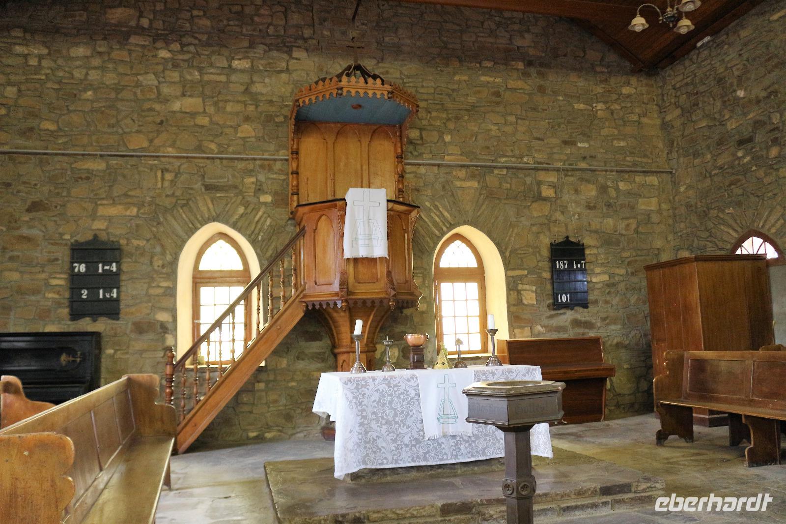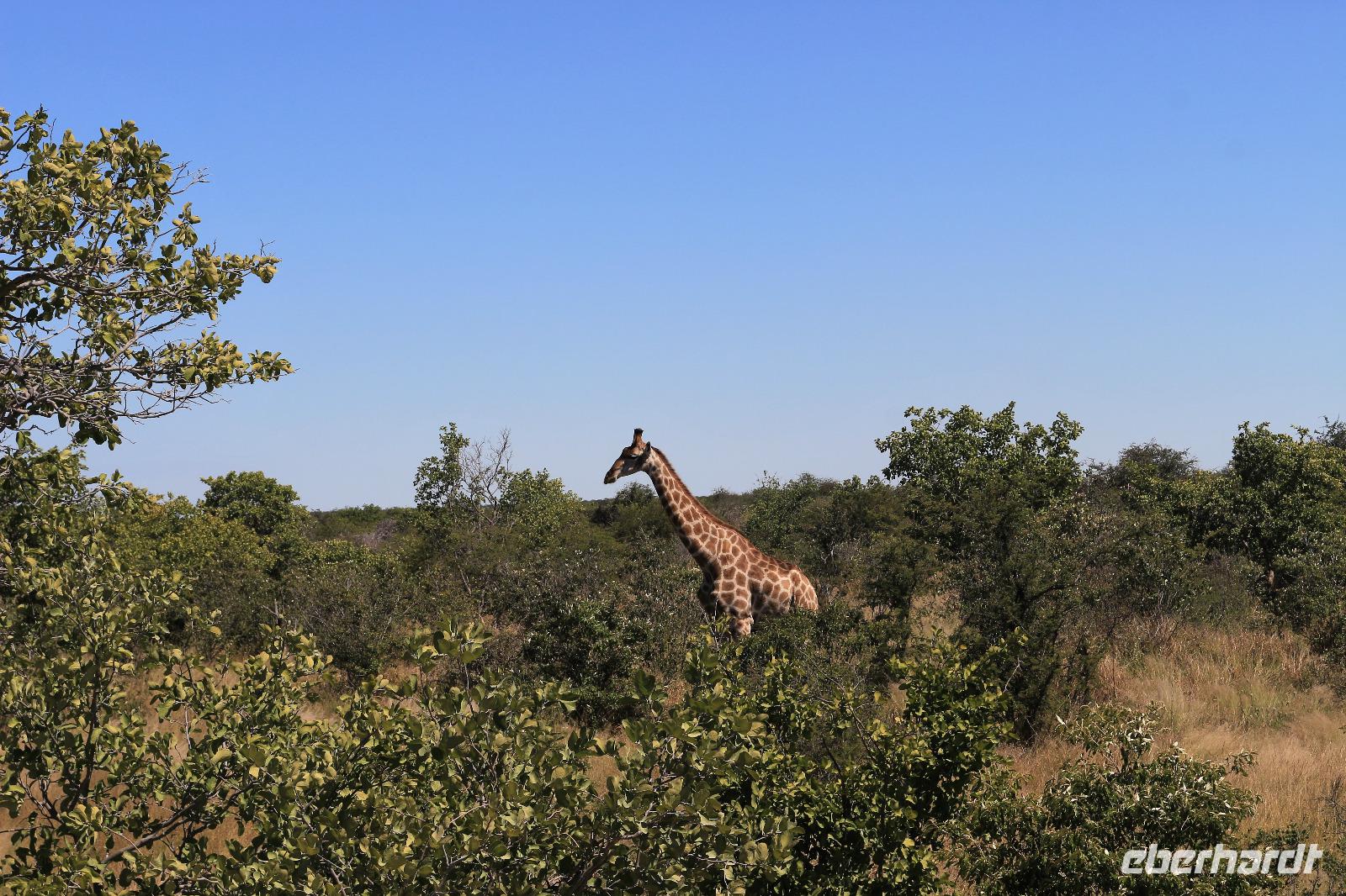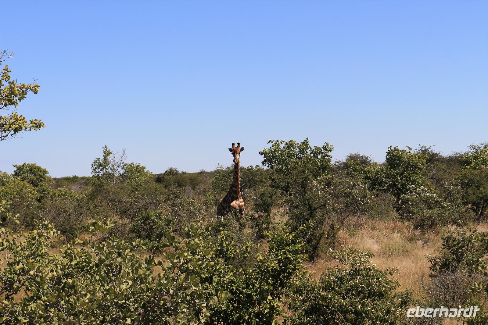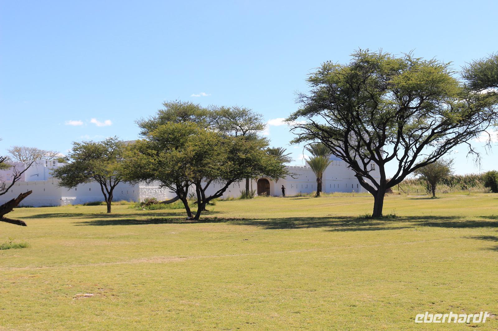 So erreichten wir wenige Minuten später Namutoni, wo wir ein kleines Mittagessen und etwas Kühles zu trinken genießen konnten. Auch die kleine und sehr hübsche Festung sowie ein hübsches Museum konnten wir besichtigen. Sehr schade ist jedoch, dass diese Festung immer mehr verfällt, weil diese nicht instand gehalten wird. Gut gestärkt setzten wir unsere Pirschfahrt schließlich fort. Doch auch hier machten uns die Elefanten wieder einen Strich durch die Rechnung, weil diese uns nicht den ursprünglich geplanten Weg passieren lassen wollten. So mussten wir umkehren und die Runde aus der anderen Richtung beginnen. Hier zeigte sich uns unmittelbar am Straßenrand eine Giraffe, welche wir aus nächster Nähe beim Fressen beobachten konnten. Nach vielen wunderschönen Erlebnissen verließen wir schließlich den Etosha Nationalpark, froh heute noch so viele Tiere gesehen zu haben. Ungewohnterweise ging es heute auf asphaltierter Straße weiter, doch der Zufahrtsweg zu unserer Lodge war schließlich wieder die uns gut bekannte Schotterpiste. Am späten Nachmittag erreichten wir die Uris Safari Lodge und bezogen die sehr schön eingerichteten Zimmer. Wir genossen das sehr schöne Flair der Anlage und der eine oder andere spazierte bis zu der kleinen und hübsch beleuchteten Kapelle, welche sich auf dem Gelände befand. Später genossen wir gemeinsam unser vorletztes namibisches Abendessen. Den sehr erfolgreichen Tag ließ ein Teil der Gruppe schließlich beim spannenden DFB-Pokal-Halbfinale ausklingen, als Borussia Dortmund gegen den FC Bayern München spielte.