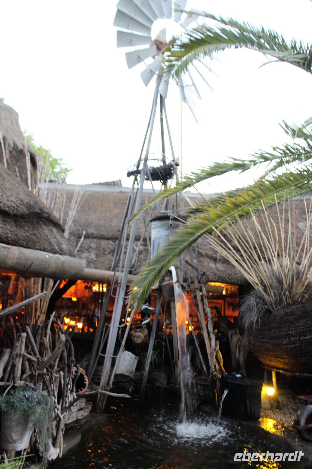 Die Mittagszeit verbrachten wir in Halali, dem neusten Rastlager in der Etoshapfanne. Ein Teil der Gruppe aß eine Kleinigkeit im örtlichen Restaurant, während die anderen bei einem Eis und Keksen zusammen saßen. Anschließend fuhren wir den Rhino Drive sowie den Elan Drive entlang, jedoch ohne Nashörner oder die Elanantilope zu sehen. Stattdessen zeigte sich uns ein gewaltiger Elefantenbulle, welcher sich aber leider hinter mehreren Bäumen versteckte. So fuhren wir weniger erfolgreich zurück nach Okaukuejo, wo wir unsere Zimmer in der Lodge bezogen. Am Abend genossen wir zunächst sehr schmackhaftes Hühnchen und Lamm vom Grill. Im Anschluss begaben wir uns schließlich alle gemeinsam zum beleuchteten Wasserloch, in der Hoffnung dort verschiedene Wildtiere vorzufinden. Außer Vögeln war jedoch nichts zu beobachten. Dies lag in der gerade ausklingenden sehr kräftigen Regenzeit begründet. Aufgrund dessen waren die Tiere nicht auf die Wasserlöcher angewiesen und suchten diese deshalb nur gelegentlich auf. Trotzdem genossen wir die wunderschöne Atmosphäre an diesem Ort und ließen den Tag sehr stimmungsvoll bei einem Amarula und dem einen oder anderen Bierchen ausklingen.