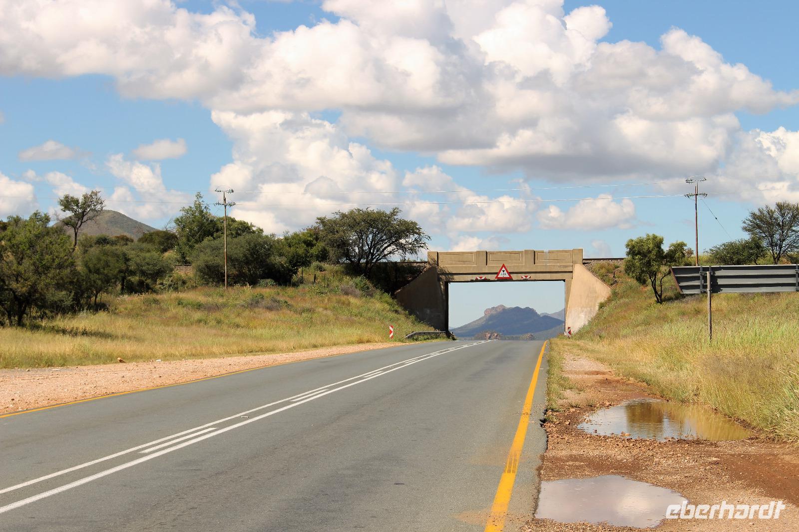 Der heutige Reisetag wies eine Besonderheit auf: es war der Geburtstag unseres Reiseleiters Henner. So überraschten wir ihn beim Frühstück mit einem Stück Geburtstagstorte sowie einem Ständchen durch das musikalisch begabte Servicepersonal der Lodge. Gut gestärkt trafen wir uns schließlich am Bus, um die schöne Lodge schon wieder zu verlassen. Aufgrund einer kleinen Programmänderung führte uns unsere Fahrt heute nicht wieder zurück auf die B1, sondern über etwas kleinere uns bergigere Wege. Unser erstes Ziel war Stampriet. Hier führte uns unser Reiseleiter überraschenderweise an eine andere sehr schöne Lodge, welche über eine eigene Landwirtschaft inklusive Schlachterei verfügt. Hier erhielten wir eine kurze und interessante Führung über das gesamte Gelände. Auf unserer Weiterfahrt verließen wir nun die geteerten Straßen und fuhren auf sogenannten „Peds" weiter. Hierbei boten sich uns fantastische Ausblicke auf die sagenhaften Felsformationen der Namib. Besonderes Highlight unserer Route war die Fahrt über die 111 Dünen, welche an eine kleine Achterbahnfahrt erinnern ließ. Dabei boten sich uns traumhafte Motive, die natürlich fotografiert werden wollten. Es zeigte sich uns sogar ein Exemplar der giftigen Kapkobra, jedoch war diese leider schon mehr tot als lebendig. Auf dem Weg zu unserer Picknickstation gab es schließlich einen plötzlichen Wetterumschwung. Es glich einem Wolkenbruch und innerhalb von Sekunden befanden wir uns in einem heftigen Unwetter. Trotz einer kurzen Unterbrechung wollte dieses uns noch nicht so ganz in Ruhe lassen, sodass wir unser Programm etwas anpassen mussten. So fand das Picknick ganz unkompliziert so gut wie möglich im Bus statt, während es draußen regnete und stürmte.