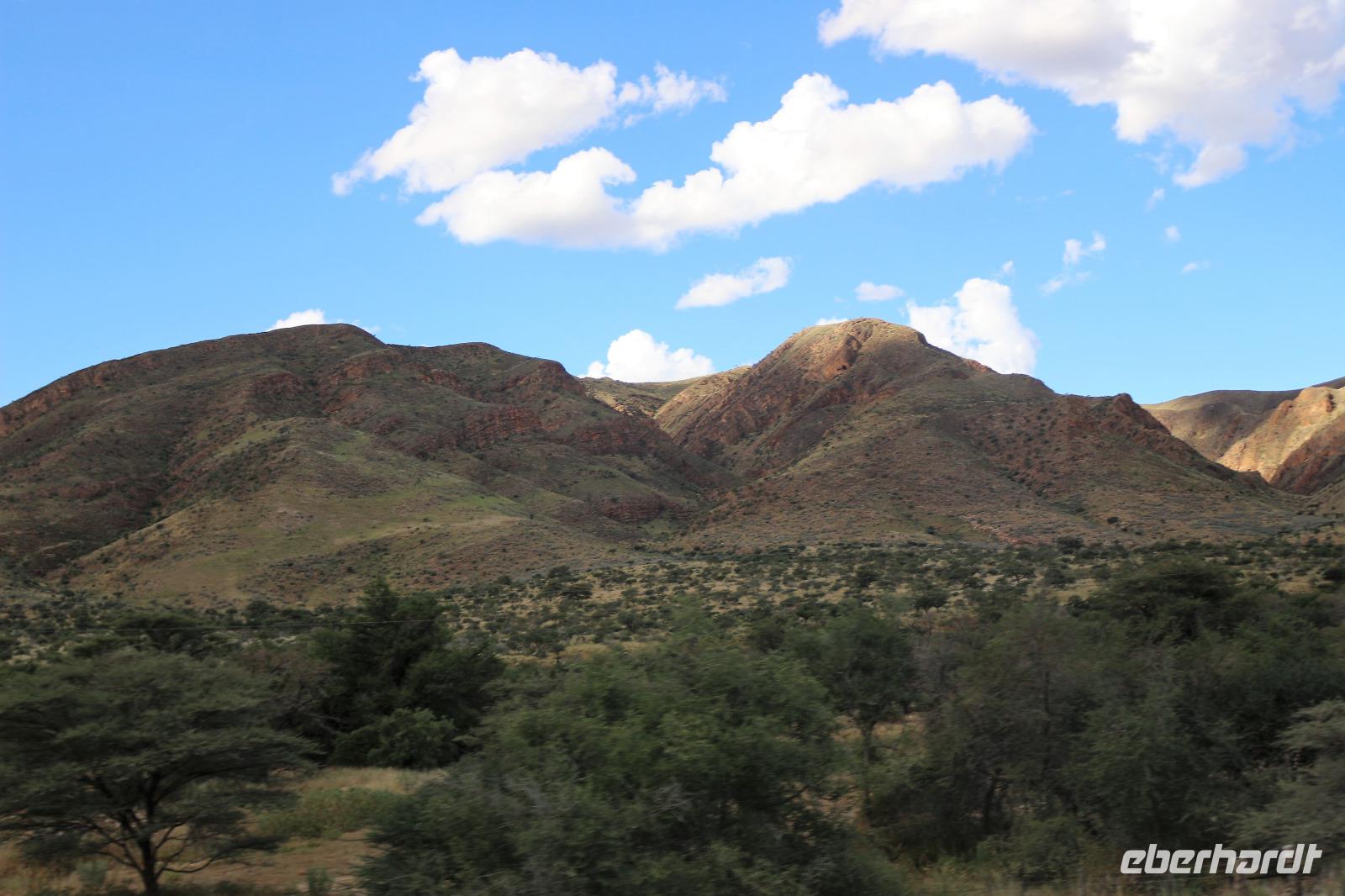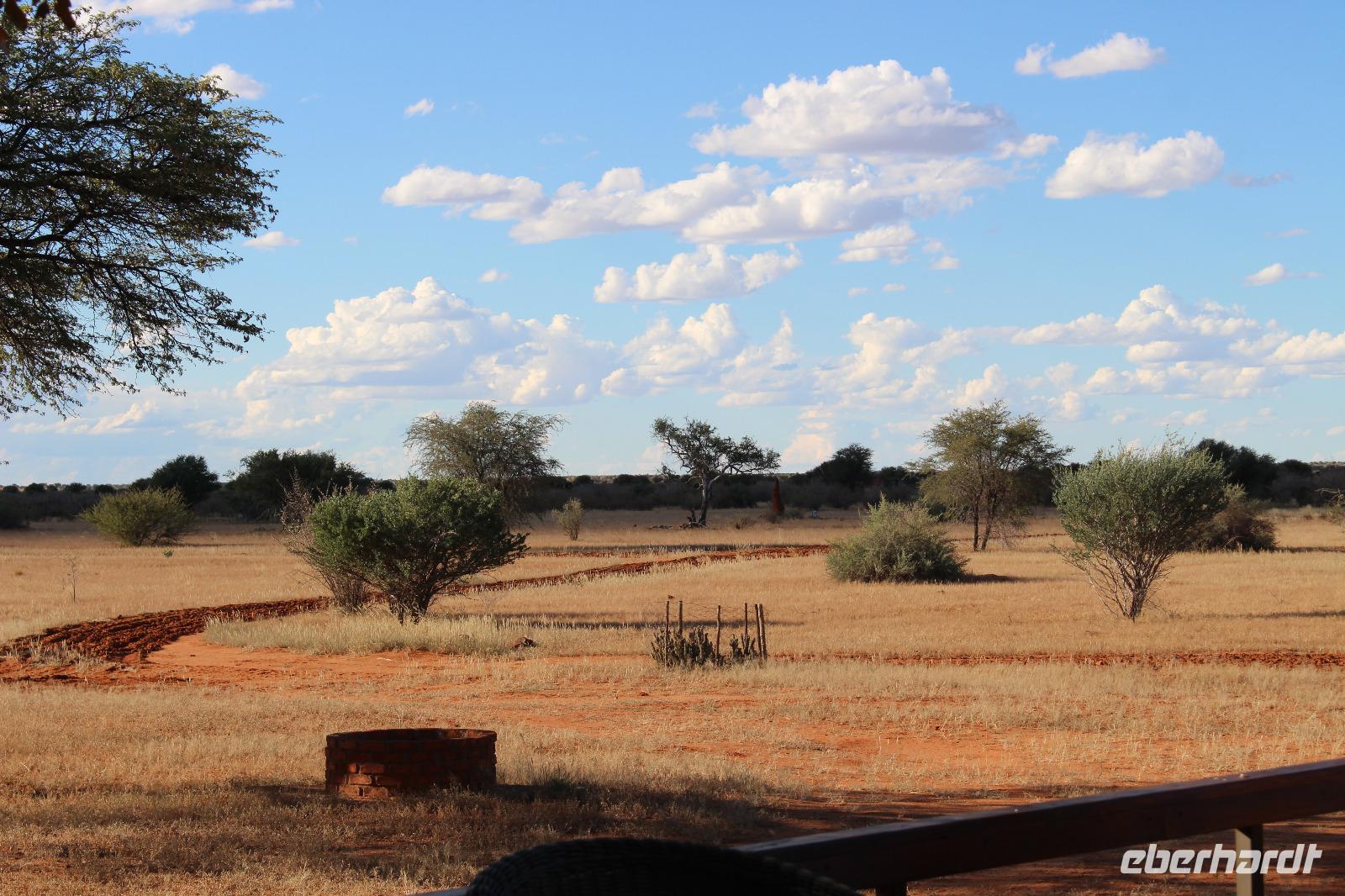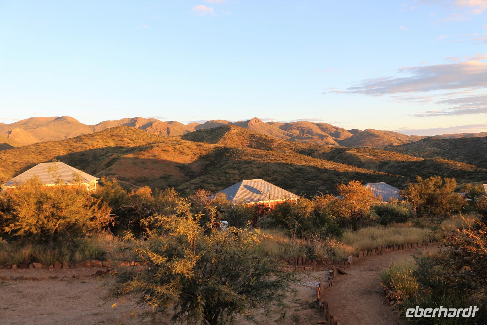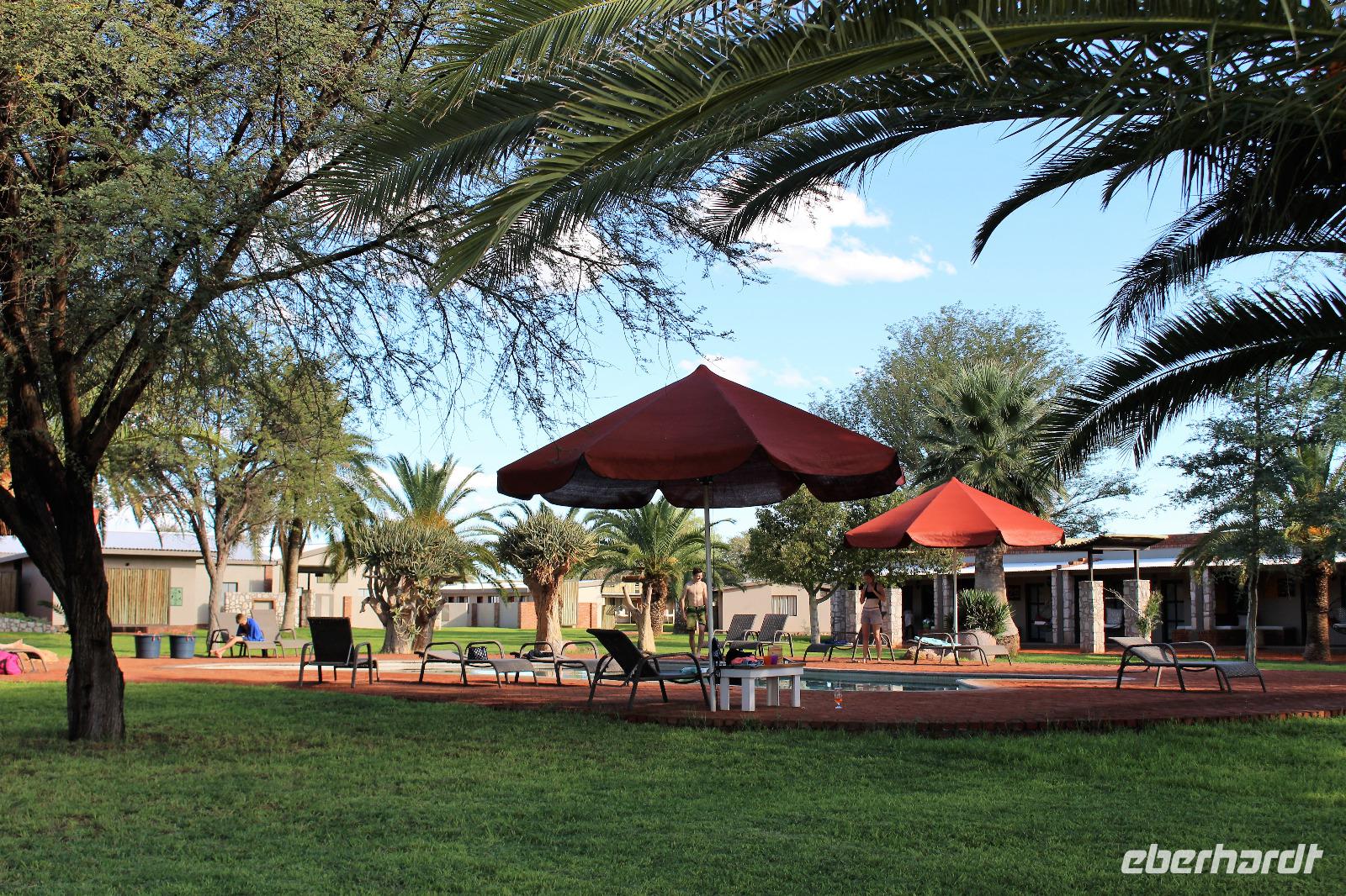 Nach einem reichhaltigen Frühstück bei bestem Ausblick über die Stadt Windhoek ging es auch schon wieder ans Kofferpacken und wir verließen unser schönes Hotel Thule. Zunächst schauten wir uns den Bahnhof der Stadt Windhoek an, welcher an unsere 60er/70er Jahre erinnerte. Hier erhielten wir auch einen ersten Einblick in die wirtschaftliche Situation des Landes, wobei uns der hohe Lebensstandard der Windhoeker überraschte. Bevor wir die Stadt verließen, besuchten wir noch einen Supermarkt, um ein paar Kleinigkeiten für die folgenden Tage zu besorgen. Anschließend ließen wir die namibische Hauptstadt hinter uns und fuhren in Richtung Süden und zunächst durch das Auersgebirge. Dies zeigte sich uns in aufgrund der reichlichen Regenfälle der vergangenen Wochen und Monate in einem satten Grün. Langsam veränderte sich die Landschaft: es wurde trockener und immer mehr konnte man den roten Sandboden unter den Büschen erkennen. So waren wir nun in der Kalahari angekommen. Uns zeigten sich nun hauptsächlich Dünen sowie Dornbüsche, aber auch das eine oder andere kleinere Tier. Am Nachmittag kamen wir bei wunderschönstem Sommerwetter in unserer Lodge an und bezogen unsere Zimmer. Anschließend war ausreichend Zeit, die wunderschöne Anlage zu erkunden oder diese bei einem Bad im Pool zu genießen.