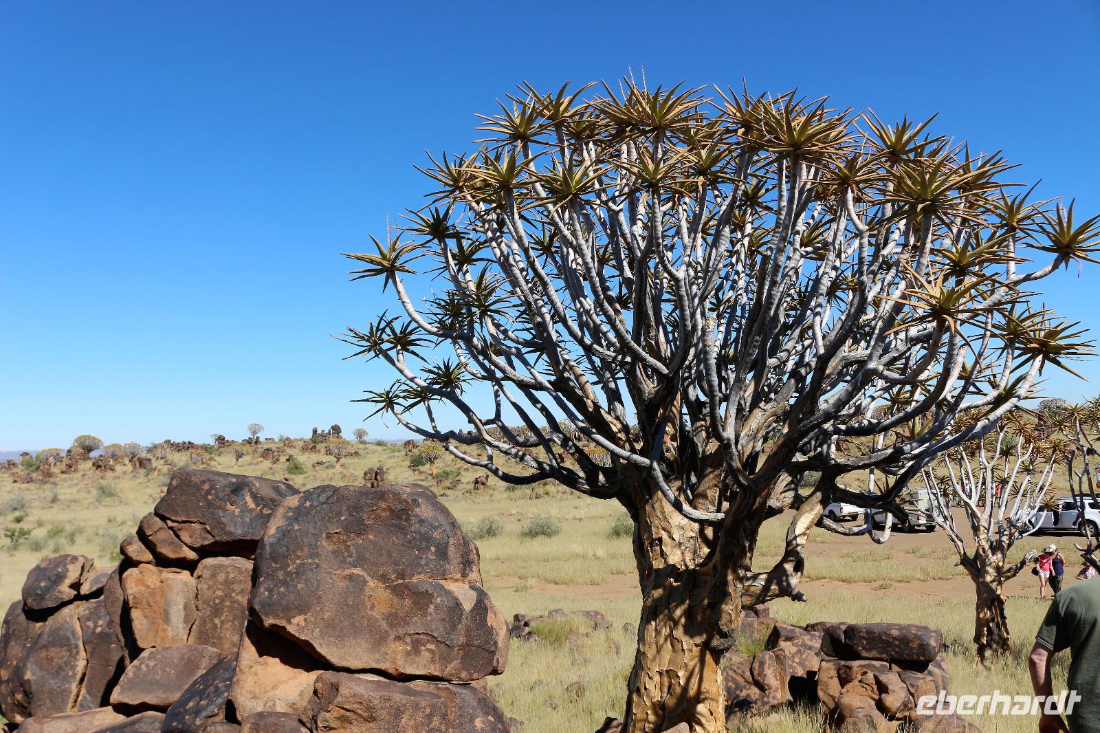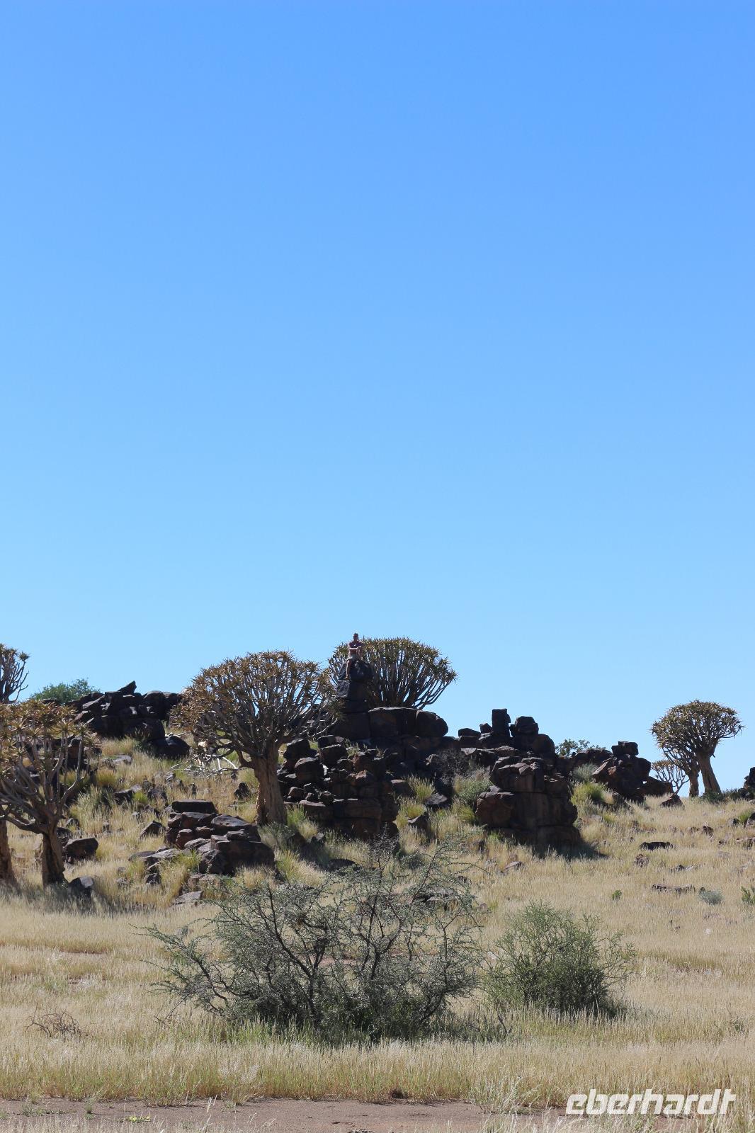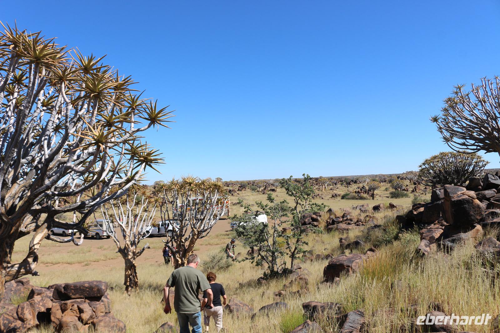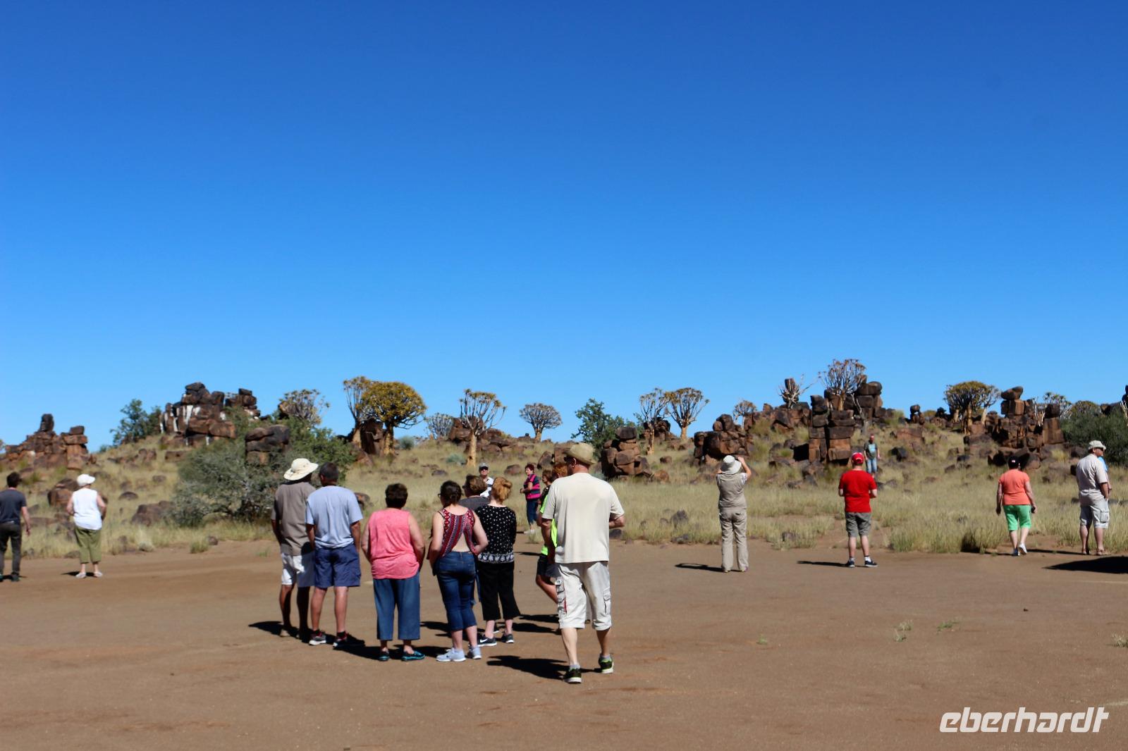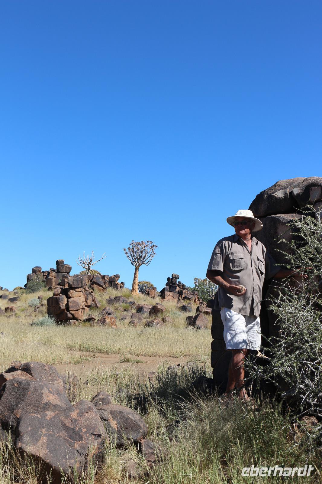 Nach dem Frühstück verließen wir Keetmanshoop zunächst wieder in die Richtung, aus der wir gestern gekommen waren. Wenig später kamen wir an der Farm an, auf der wir uns gestern schon den Köcherbaumwald sowie den Giants Playground hatten anschauen wollten, was das Wetter jedoch unmöglich gemacht hatte. Heute war vom gestrigen Unwetter jedoch nichts mehr zu spüren: Strahlend blauer Himmel und Sonnenschein erwarteten uns. Zunächst bekamen wir vom Farmeigentümer die auf seinem Gelände gefundenen Fossilien gezeigt und erläutert. Neben sich selbst (er bezeichnete sich aufgrund seines Alters selbst als Fossil) gab es Fossilien des längst ausgestorbenen Minosaurus, einer Dinosaurierart sowie von verschiedenen anderen Reptilien zu entdecken. Dabei fanden wir sogar ein neues Fossil, welches wir sogleich das „Eberhardt Fossil" nannten. Schließlich fuhren wir ein Stück weiter, wo uns der „Spielplatz der Riesen" sowie die bekannten Köcherbäume erwarteten. Zunächst erklärte uns der Farmeigentümer die gigantischen Steinformationen und musizierte sogar darauf. „Bruder Jakob" hatten wir schnell erkannt, bei dem darauf folgenden afrikanischen Lied musste er uns den Titel selbst verraten. Außerdem erzählte er uns viel Wissenswertes über die Köcherbäume, welche eine Aloe-Art sind. Wir fotografierten fleißig diese beeindruckende Landschaft sowie die darum lebende Tierwelt. Ein weiteres beliebtes Fotoobjekt war an dieser Stelle jedoch auch unser Reiseleiter Henner, zunächst hoch oben auf den Steinformationen, auf welche er hinauf geklettert war und später als Kletterwand für beeindruckende Käfer.