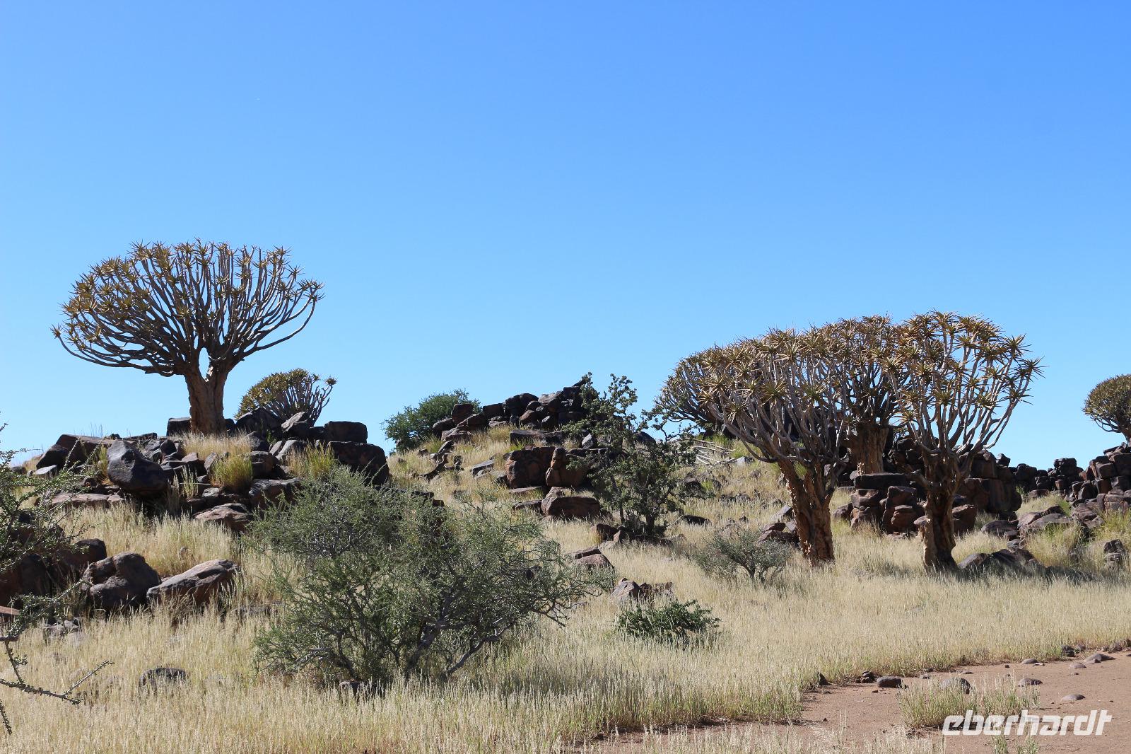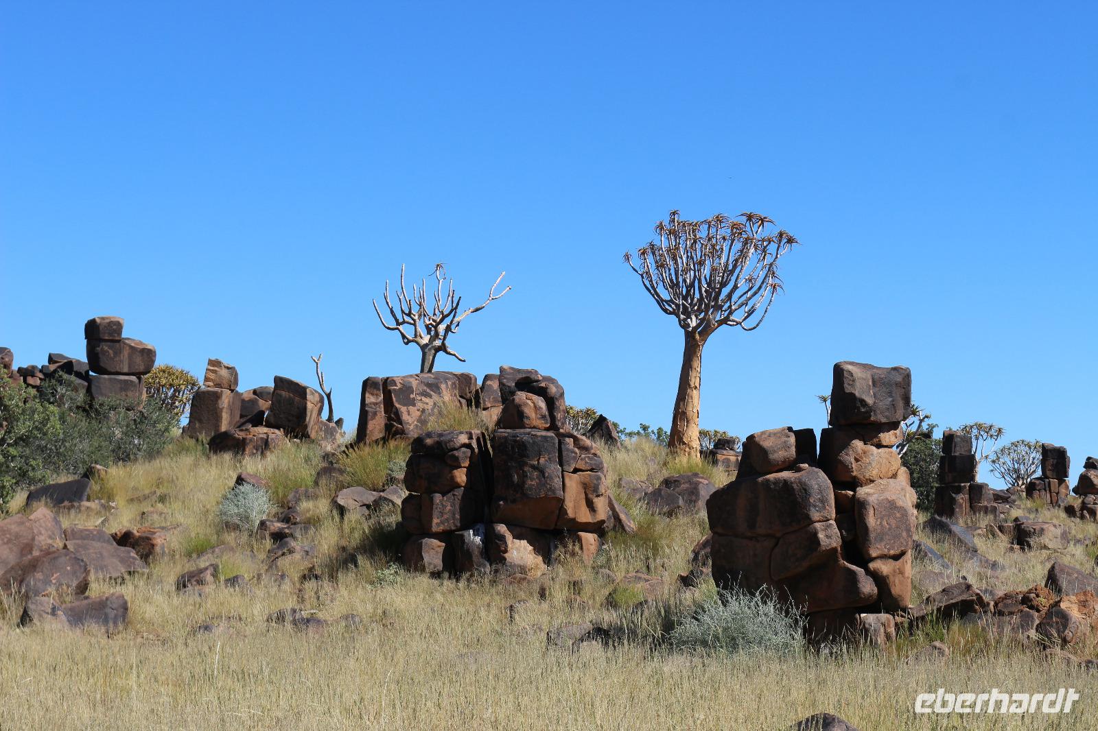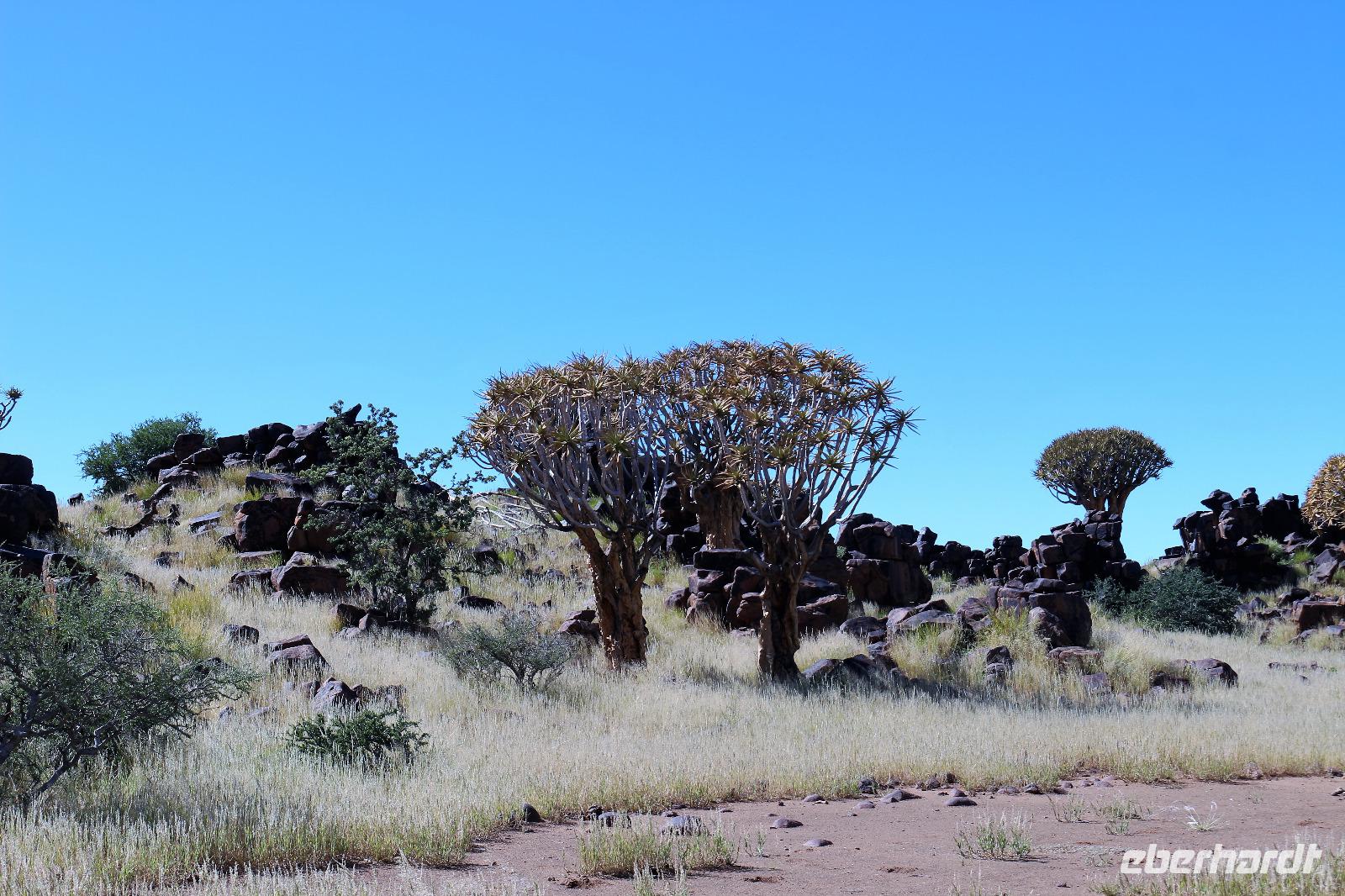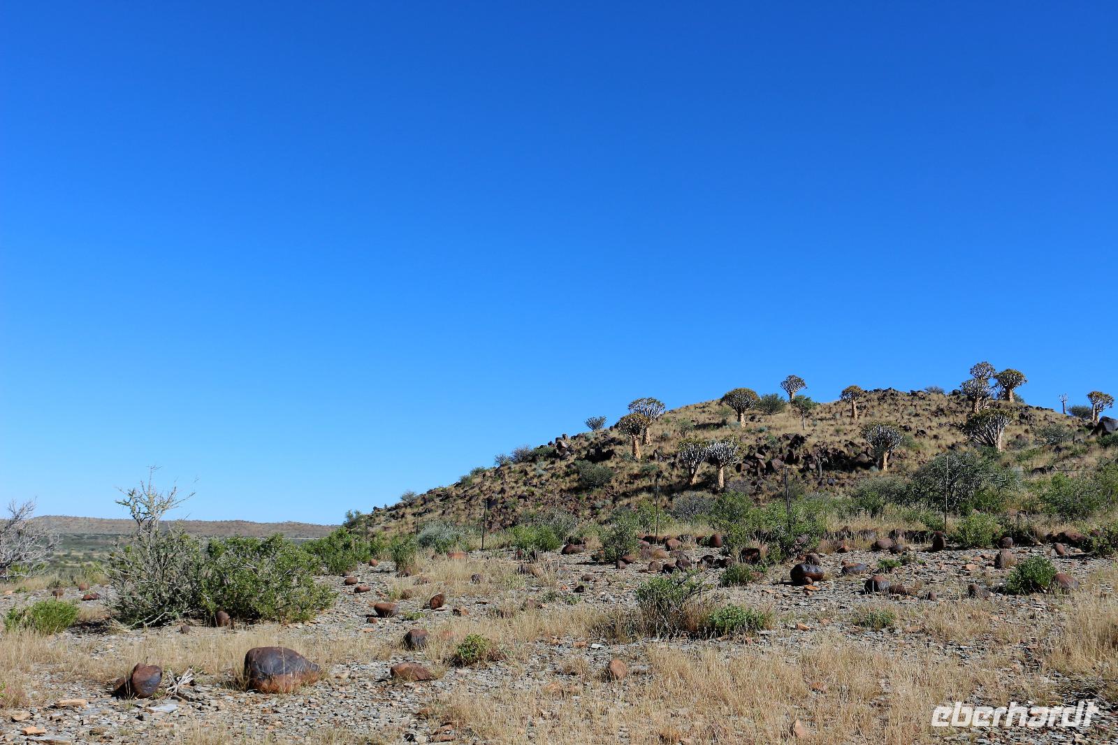 Nach dem Frühstück verließen wir Keetmanshoop zunächst wieder in die Richtung, aus der wir gestern gekommen waren. Wenig später kamen wir an der Farm an, auf der wir uns gestern schon den Köcherbaumwald sowie den Giants Playground hatten anschauen wollten, was das Wetter jedoch unmöglich gemacht hatte. Heute war vom gestrigen Unwetter jedoch nichts mehr zu spüren: Strahlend blauer Himmel und Sonnenschein erwarteten uns. Zunächst bekamen wir vom Farmeigentümer die auf seinem Gelände gefundenen Fossilien gezeigt und erläutert. Neben sich selbst (er bezeichnete sich aufgrund seines Alters selbst als Fossil) gab es Fossilien des längst ausgestorbenen Minosaurus, einer Dinosaurierart sowie von verschiedenen anderen Reptilien zu entdecken. Dabei fanden wir sogar ein neues Fossil, welches wir sogleich das „Eberhardt Fossil" nannten. Schließlich fuhren wir ein Stück weiter, wo uns der „Spielplatz der Riesen" sowie die bekannten Köcherbäume erwarteten. Zunächst erklärte uns der Farmeigentümer die gigantischen Steinformationen und musizierte sogar darauf. „Bruder Jakob" hatten wir schnell erkannt, bei dem darauf folgenden afrikanischen Lied musste er uns den Titel selbst verraten. Außerdem erzählte er uns viel Wissenswertes über die Köcherbäume, welche eine Aloe-Art sind. Wir fotografierten fleißig diese beeindruckende Landschaft sowie die darum lebende Tierwelt. Ein weiteres beliebtes Fotoobjekt war an dieser Stelle jedoch auch unser Reiseleiter Henner, zunächst hoch oben auf den Steinformationen, auf welche er hinauf geklettert war und später als Kletterwand für beeindruckende Käfer.