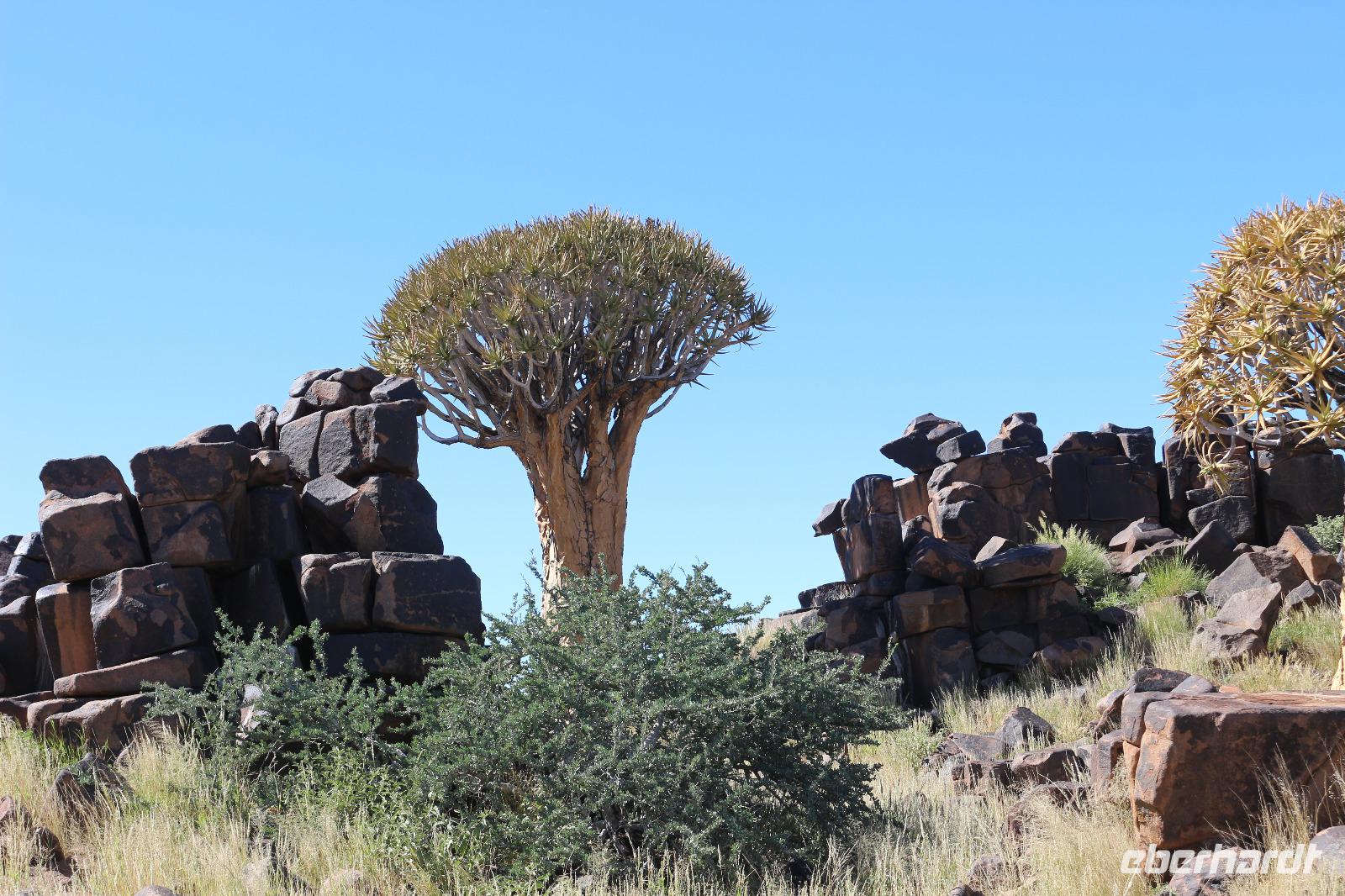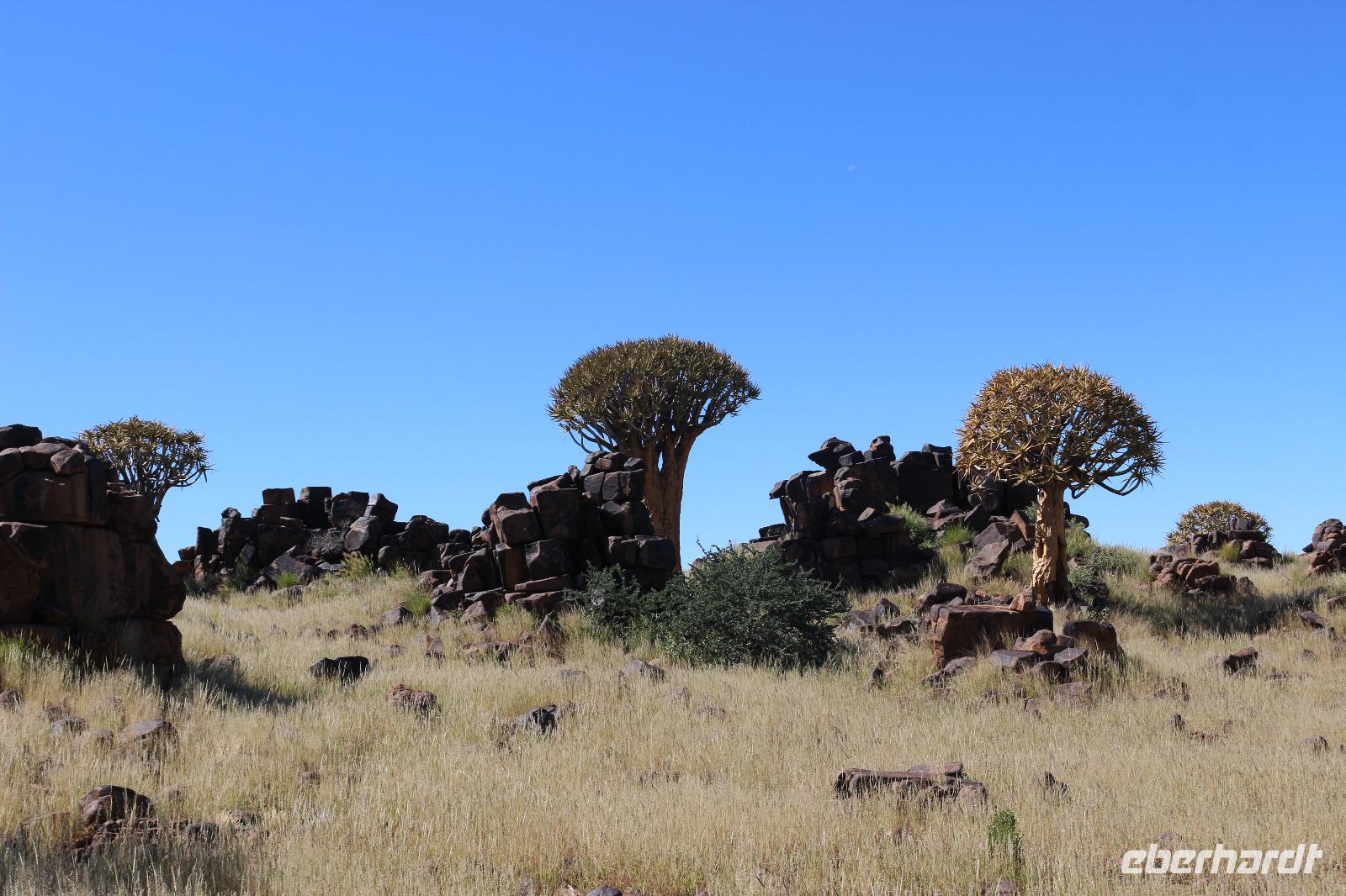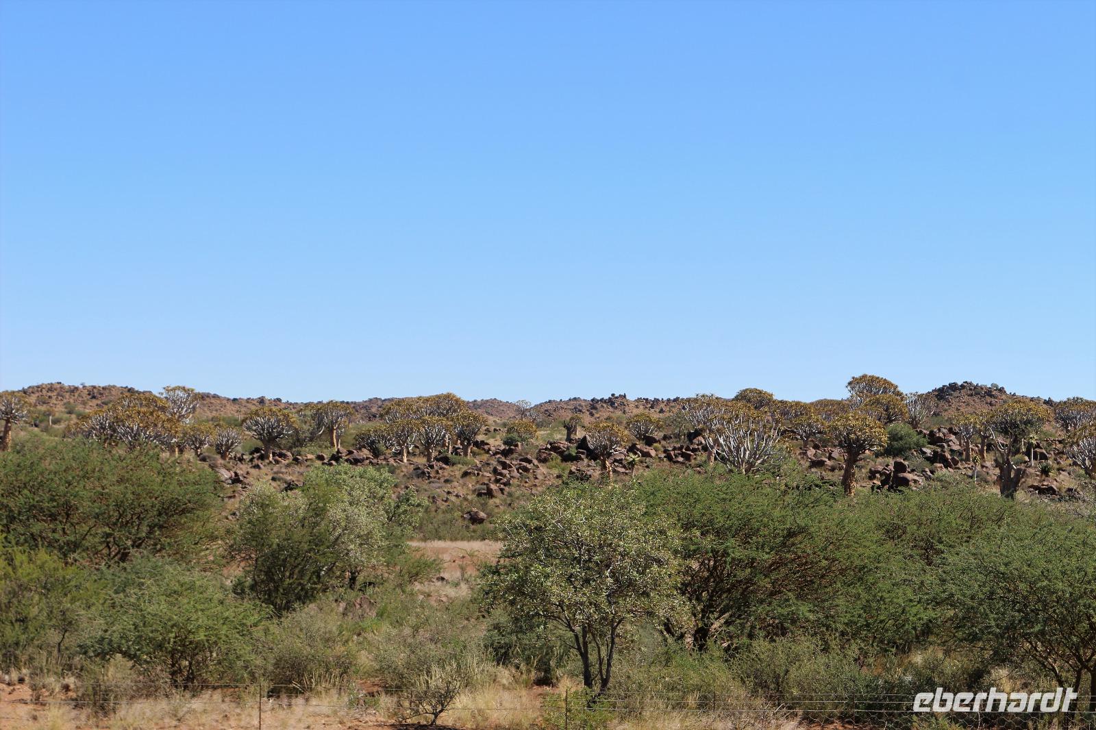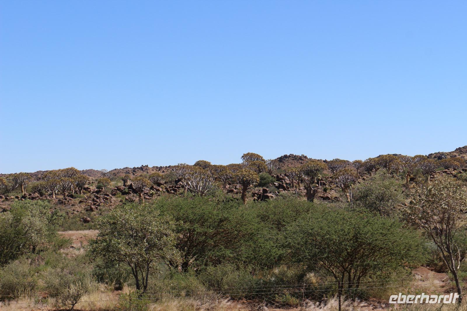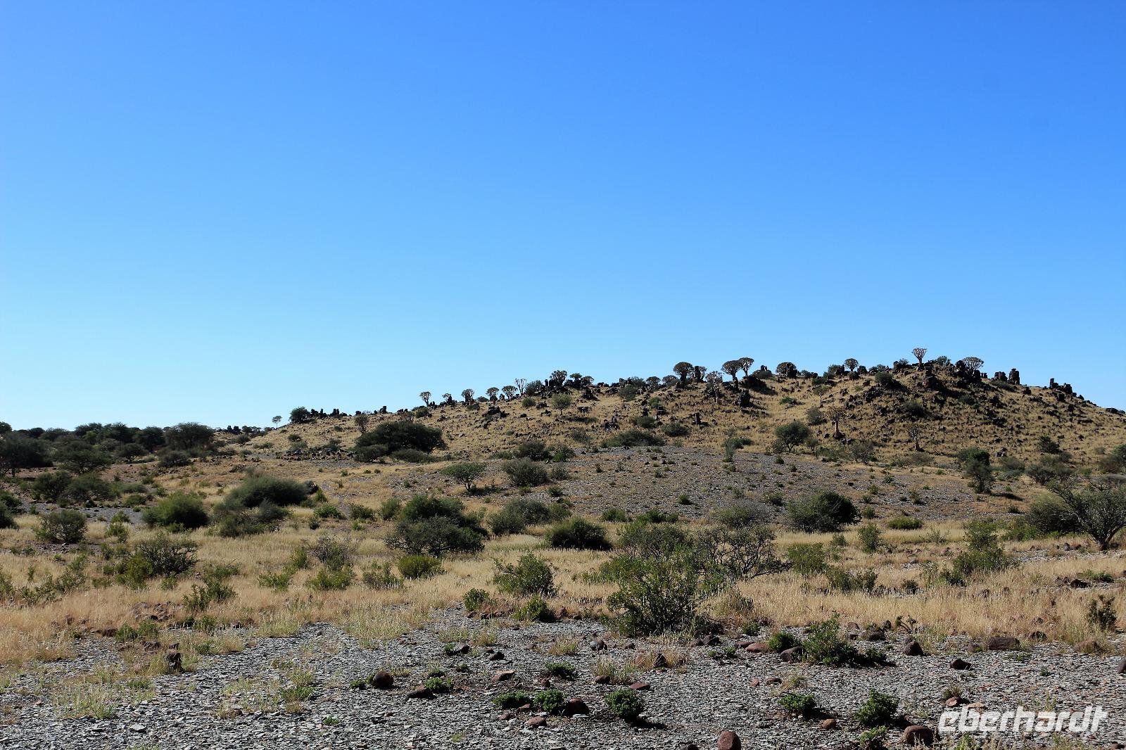 Nach dem Frühstück verließen wir Keetmanshoop zunächst wieder in die Richtung, aus der wir gestern gekommen waren. Wenig später kamen wir an der Farm an, auf der wir uns gestern schon den Köcherbaumwald sowie den Giants Playground hatten anschauen wollten, was das Wetter jedoch unmöglich gemacht hatte. Heute war vom gestrigen Unwetter jedoch nichts mehr zu spüren: Strahlend blauer Himmel und Sonnenschein erwarteten uns. Zunächst bekamen wir vom Farmeigentümer die auf seinem Gelände gefundenen Fossilien gezeigt und erläutert. Neben sich selbst (er bezeichnete sich aufgrund seines Alters selbst als Fossil) gab es Fossilien des längst ausgestorbenen Minosaurus, einer Dinosaurierart sowie von verschiedenen anderen Reptilien zu entdecken. Dabei fanden wir sogar ein neues Fossil, welches wir sogleich das „Eberhardt Fossil" nannten. Schließlich fuhren wir ein Stück weiter, wo uns der „Spielplatz der Riesen" sowie die bekannten Köcherbäume erwarteten. Zunächst erklärte uns der Farmeigentümer die gigantischen Steinformationen und musizierte sogar darauf. „Bruder Jakob" hatten wir schnell erkannt, bei dem darauf folgenden afrikanischen Lied musste er uns den Titel selbst verraten. Außerdem erzählte er uns viel Wissenswertes über die Köcherbäume, welche eine Aloe-Art sind. Wir fotografierten fleißig diese beeindruckende Landschaft sowie die darum lebende Tierwelt. Ein weiteres beliebtes Fotoobjekt war an dieser Stelle jedoch auch unser Reiseleiter Henner, zunächst hoch oben auf den Steinformationen, auf welche er hinauf geklettert war und später als Kletterwand für beeindruckende Käfer.