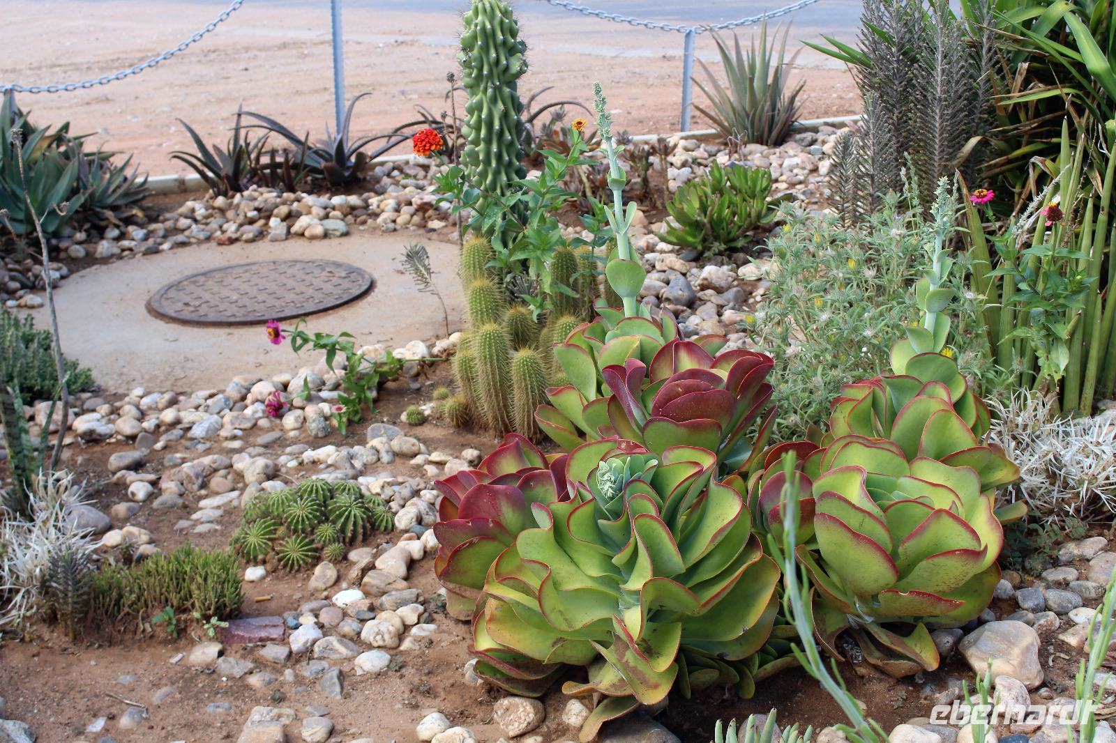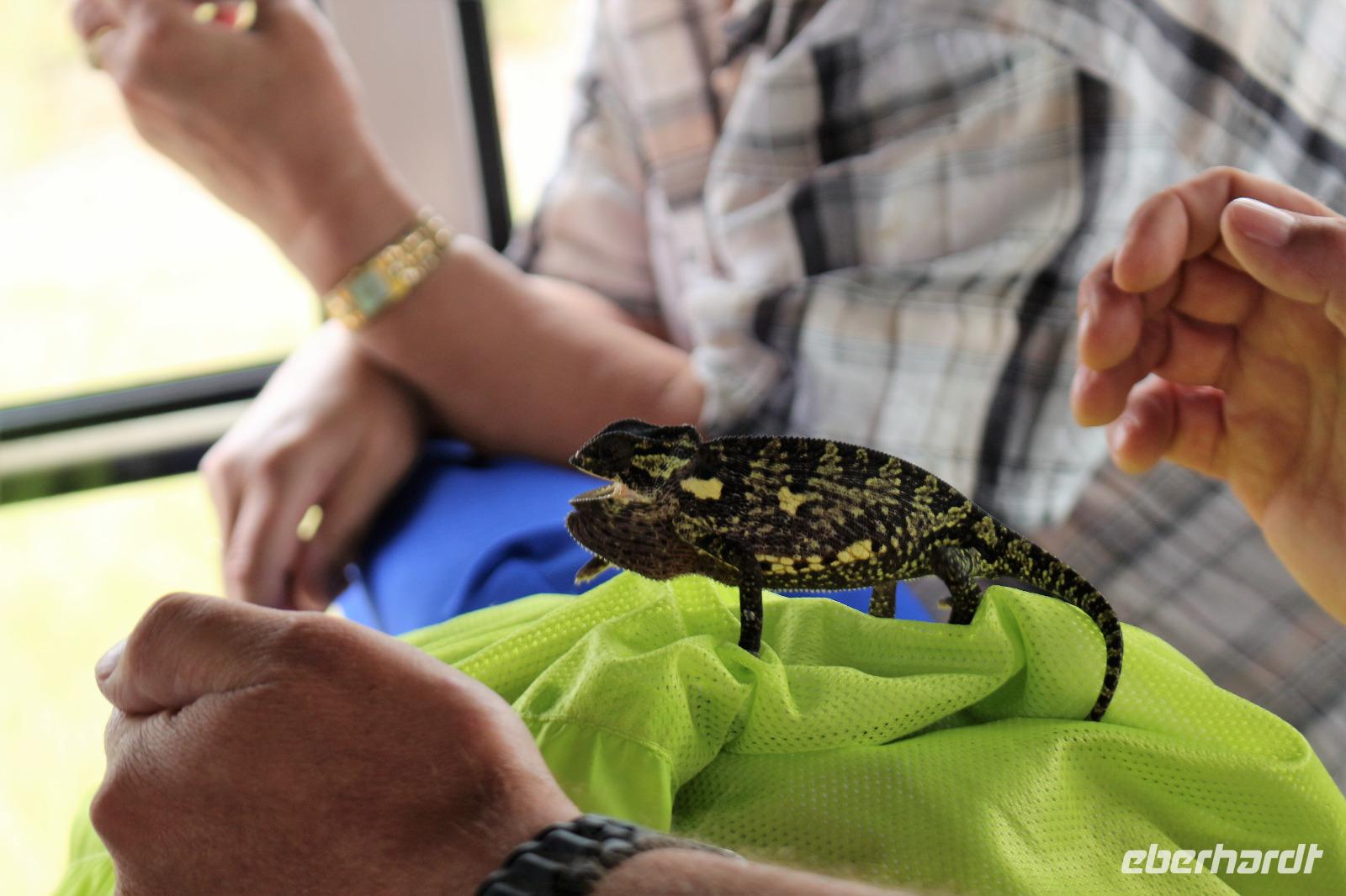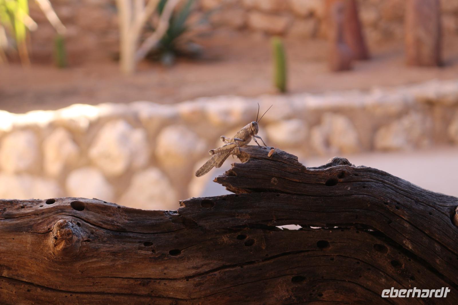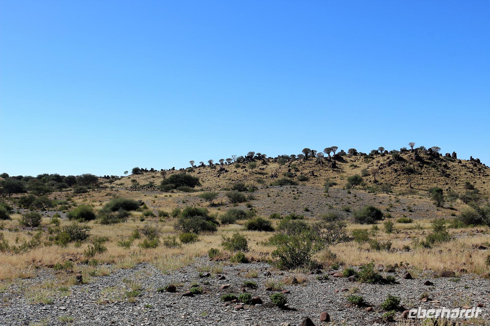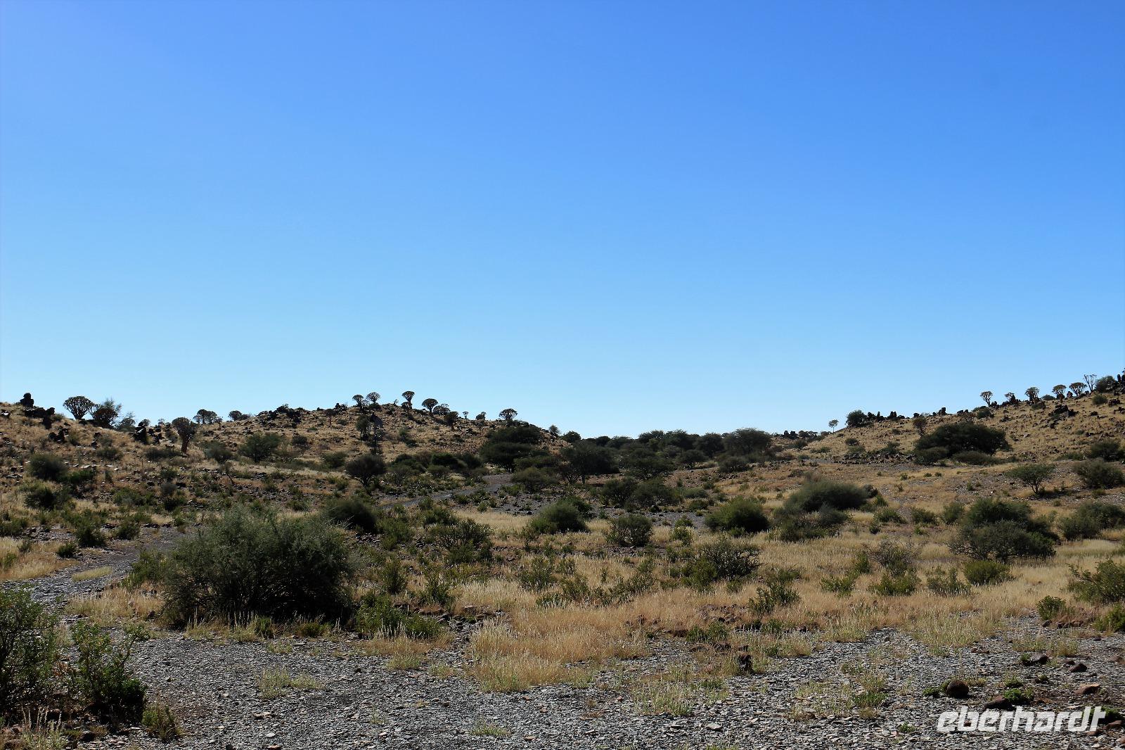 Nach dem Frühstück verließen wir Keetmanshoop zunächst wieder in die Richtung, aus der wir gestern gekommen waren. Wenig später kamen wir an der Farm an, auf der wir uns gestern schon den Köcherbaumwald sowie den Giants Playground hatten anschauen wollten, was das Wetter jedoch unmöglich gemacht hatte. Heute war vom gestrigen Unwetter jedoch nichts mehr zu spüren: Strahlend blauer Himmel und Sonnenschein erwarteten uns. Zunächst bekamen wir vom Farmeigentümer die auf seinem Gelände gefundenen Fossilien gezeigt und erläutert. Neben sich selbst (er bezeichnete sich aufgrund seines Alters selbst als Fossil) gab es Fossilien des längst ausgestorbenen Minosaurus, einer Dinosaurierart sowie von verschiedenen anderen Reptilien zu entdecken. Dabei fanden wir sogar ein neues Fossil, welches wir sogleich das „Eberhardt Fossil" nannten. Schließlich fuhren wir ein Stück weiter, wo uns der „Spielplatz der Riesen" sowie die bekannten Köcherbäume erwarteten. Zunächst erklärte uns der Farmeigentümer die gigantischen Steinformationen und musizierte sogar darauf. „Bruder Jakob" hatten wir schnell erkannt, bei dem darauf folgenden afrikanischen Lied musste er uns den Titel selbst verraten. Außerdem erzählte er uns viel Wissenswertes über die Köcherbäume, welche eine Aloe-Art sind. Wir fotografierten fleißig diese beeindruckende Landschaft sowie die darum lebende Tierwelt. Ein weiteres beliebtes Fotoobjekt war an dieser Stelle jedoch auch unser Reiseleiter Henner, zunächst hoch oben auf den Steinformationen, auf welche er hinauf geklettert war und später als Kletterwand für beeindruckende Käfer.