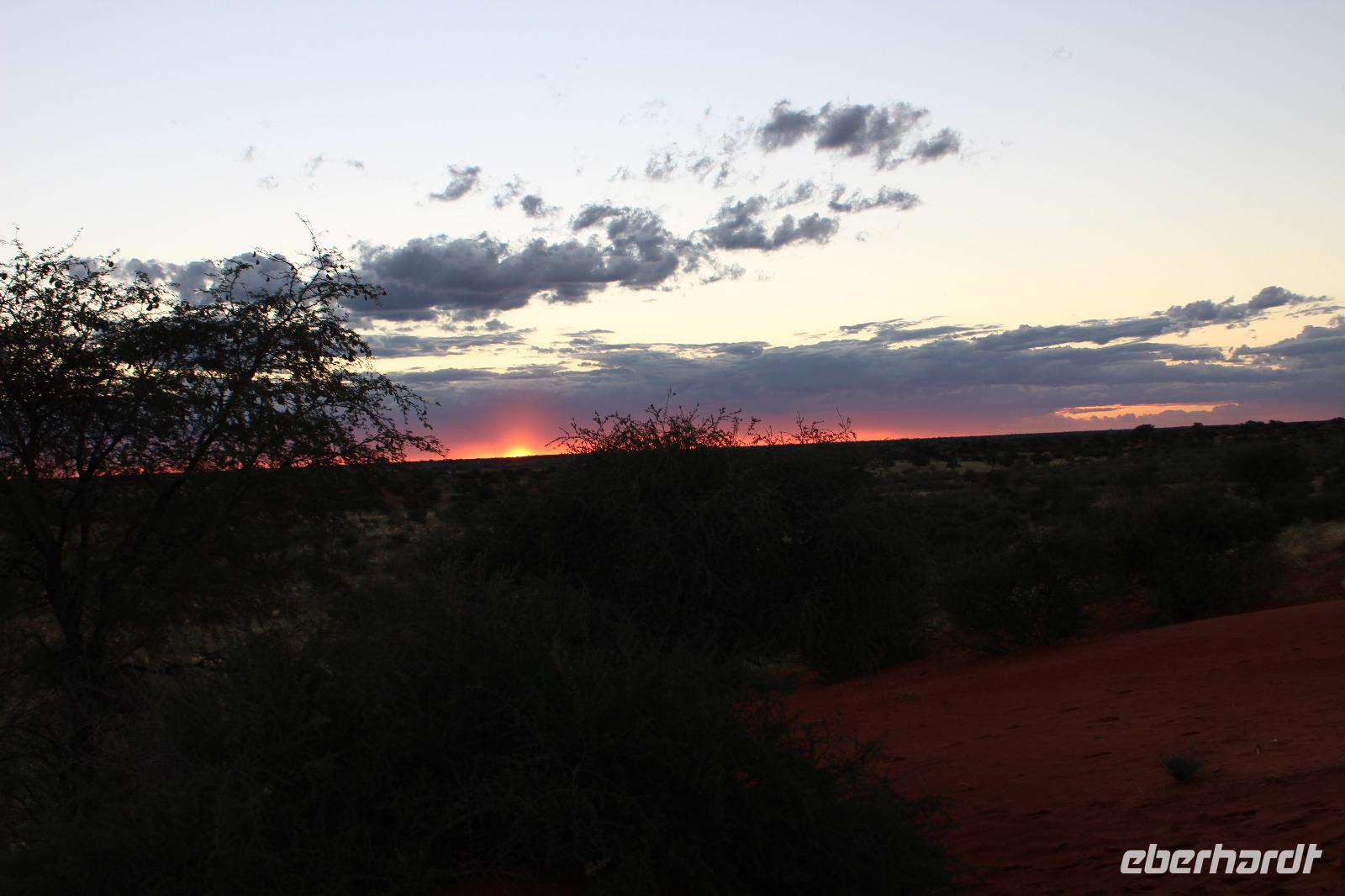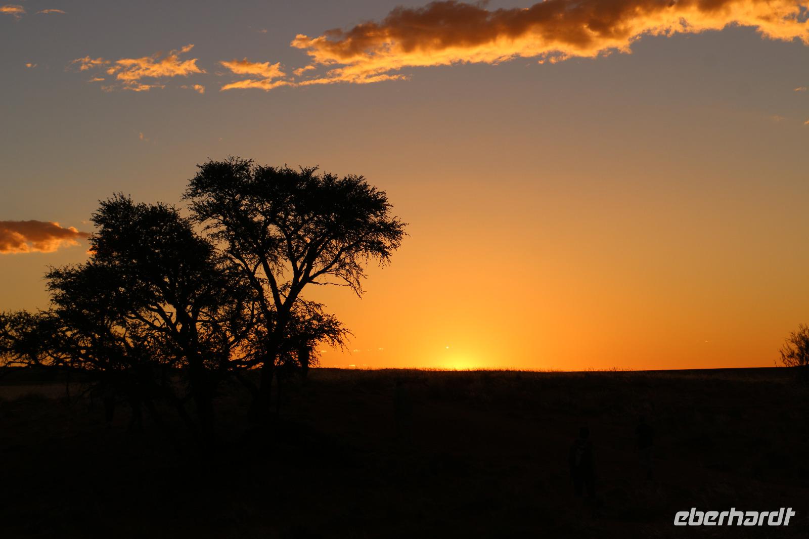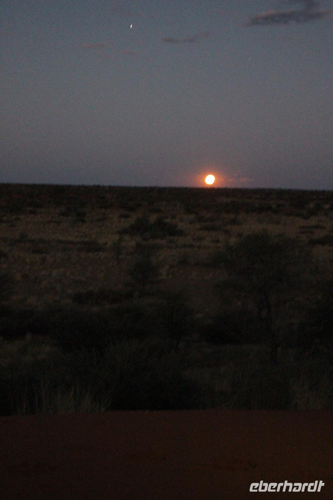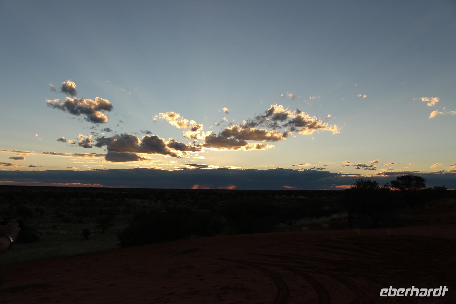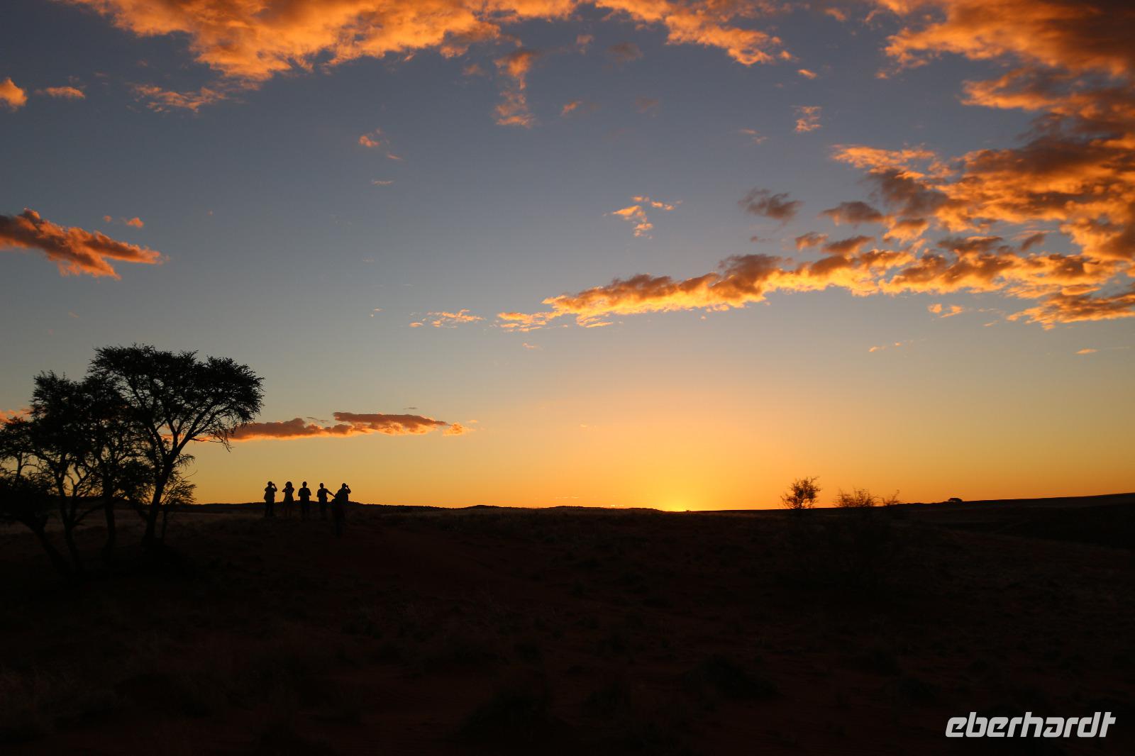 Einige Zeit später traf sich ein Großteil der Gruppe, um gemeinsam eine erste Sundownerfahrt zu erleben. Hierfür standen uns zwei Jeeps mit jeweils einem Guide zur Verfügung. Zunächst begaben wir uns auf eine Pirschfahrt, bei welcher wir äußerst erfolgreich waren. So hatten wir schon am dritten Reisetag die Möglichkeit, Giraffen, Zebras, Springböcke, Antilopen, Strauße und vieles mehr zu fotografieren. Dazu erklärten uns die Guides einiges über diese Tiere sowie über ausgewählte Pflanzen. Da sich die Sonne bereits immer mehr dem Horizont näherte, fuhren wir schließlich auf die Dünen hinauf, um den Sonnenaufgang zu beobachten. Dazu öffnete auch die „Kalahari-Bar", welche von unseren Guides betrieben wurde und uns mit leckeren Getränken wie Wein, Bier und Gin Tonic versorgten. Obwohl der Sonnenuntergang aufgrund der tief hängenden Wolken nur teilweise sichtbar war, ergab dies ganz tolle und interessante Fotos. Als wir gerade aufbrechen wollten, bot sich uns noch ein traumhafter Mondaufgang. Schließlich kamen wir nach ein paar spannenden und erlebnisreichen Stunden wieder an unserer Lodge an, wo wir uns wenig später zum Abendessen trafen. Hier ließen wir uns unter anderem ein Springbock-Steak schmecken und genossen die schöne Atmosphäre. Zum krönenden Abschluss des Abends präsentierte uns das Servicepersonal einige afrikanische Lieder mit den dazu passenden Tänzen. Wir waren begeistert von diesem Temperament und der wunderschönen Einlage. Anschließend ließen wir den Abend gemütlich ausklingen, etwa beim Fußballschauen, am Lagerfeuer oder auf der Terrasse des Restaurants.