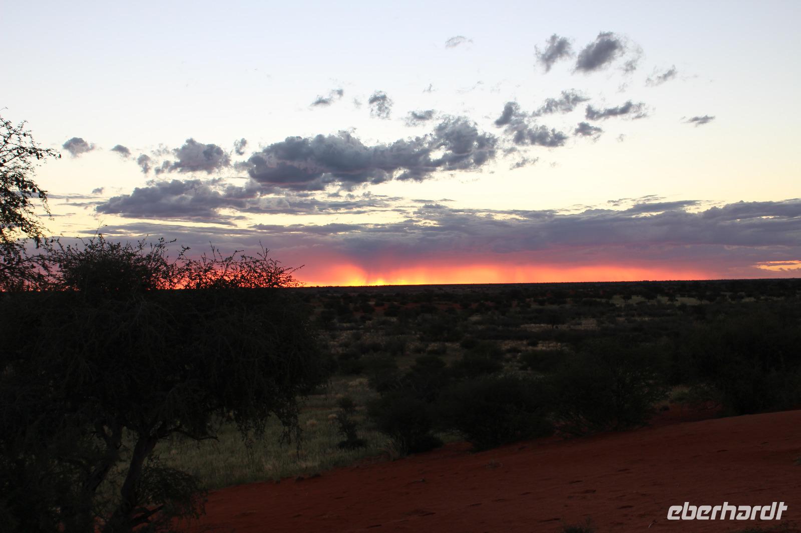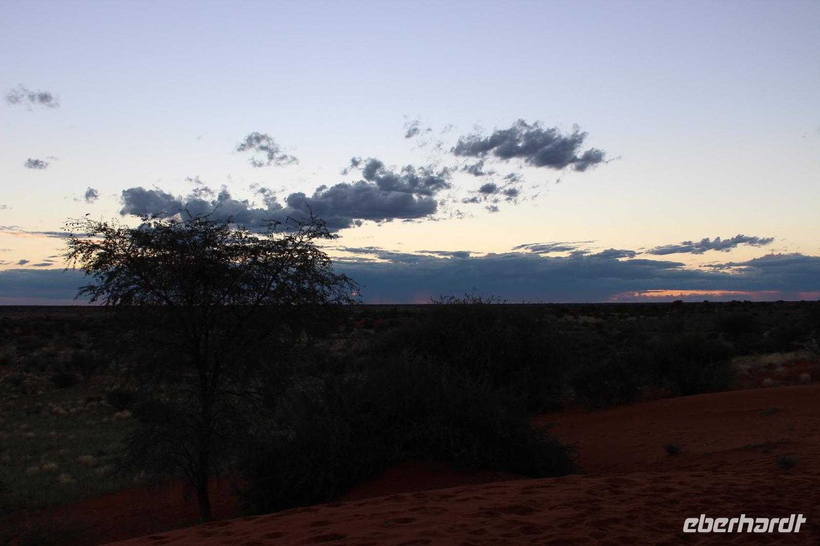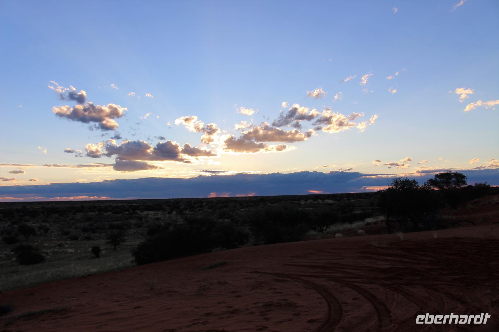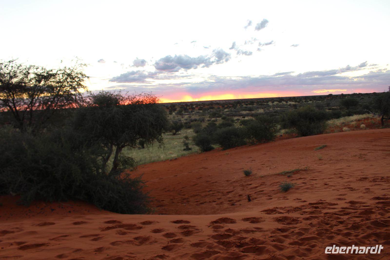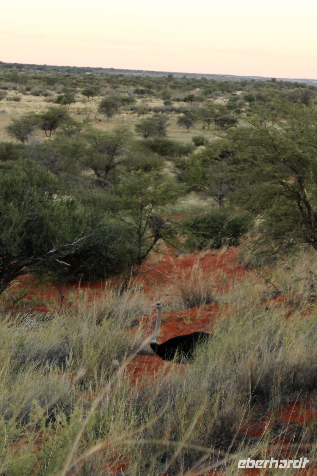 Einige Zeit später traf sich ein Großteil der Gruppe, um gemeinsam eine erste Sundownerfahrt zu erleben. Hierfür standen uns zwei Jeeps mit jeweils einem Guide zur Verfügung. Zunächst begaben wir uns auf eine Pirschfahrt, bei welcher wir äußerst erfolgreich waren. So hatten wir schon am dritten Reisetag die Möglichkeit, Giraffen, Zebras, Springböcke, Antilopen, Strauße und vieles mehr zu fotografieren. Dazu erklärten uns die Guides einiges über diese Tiere sowie über ausgewählte Pflanzen. Da sich die Sonne bereits immer mehr dem Horizont näherte, fuhren wir schließlich auf die Dünen hinauf, um den Sonnenaufgang zu beobachten. Dazu öffnete auch die „Kalahari-Bar", welche von unseren Guides betrieben wurde und uns mit leckeren Getränken wie Wein, Bier und Gin Tonic versorgten. Obwohl der Sonnenuntergang aufgrund der tief hängenden Wolken nur teilweise sichtbar war, ergab dies ganz tolle und interessante Fotos. Als wir gerade aufbrechen wollten, bot sich uns noch ein traumhafter Mondaufgang. Schließlich kamen wir nach ein paar spannenden und erlebnisreichen Stunden wieder an unserer Lodge an, wo wir uns wenig später zum Abendessen trafen. Hier ließen wir uns unter anderem ein Springbock-Steak schmecken und genossen die schöne Atmosphäre. Zum krönenden Abschluss des Abends präsentierte uns das Servicepersonal einige afrikanische Lieder mit den dazu passenden Tänzen. Wir waren begeistert von diesem Temperament und der wunderschönen Einlage. Anschließend ließen wir den Abend gemütlich ausklingen, etwa beim Fußballschauen, am Lagerfeuer oder auf der Terrasse des Restaurants.